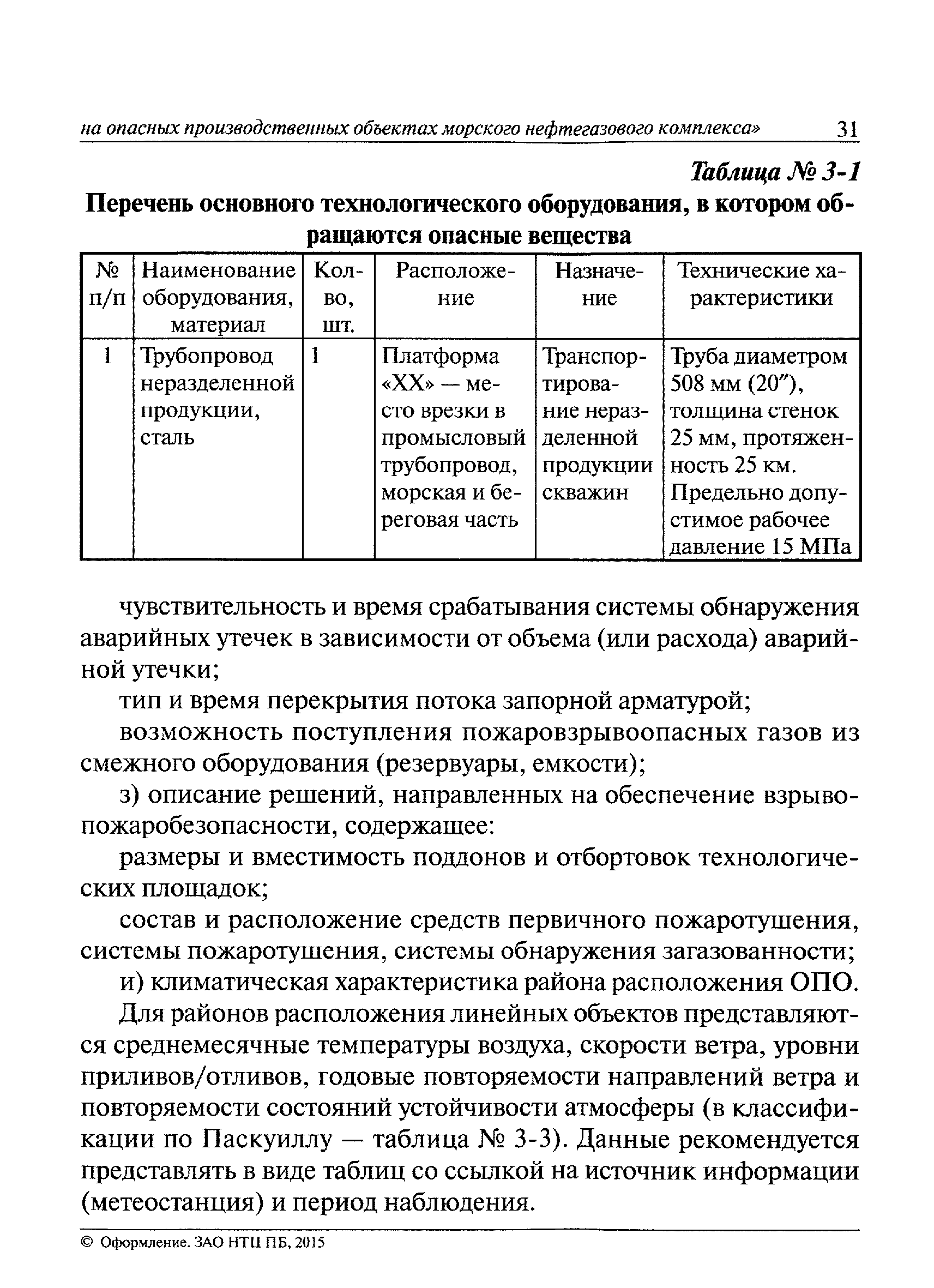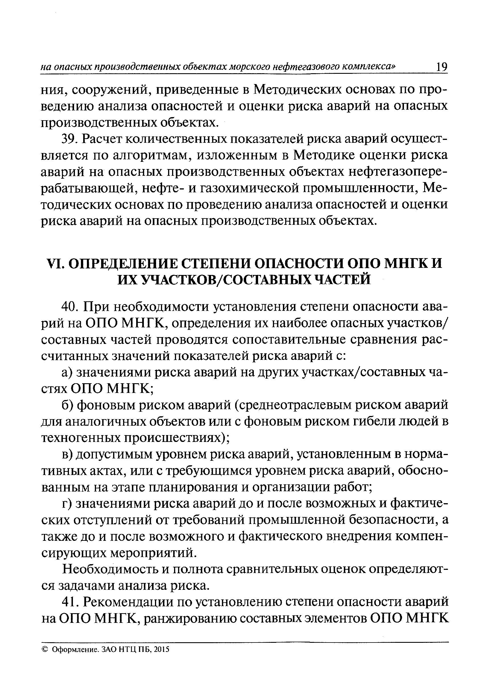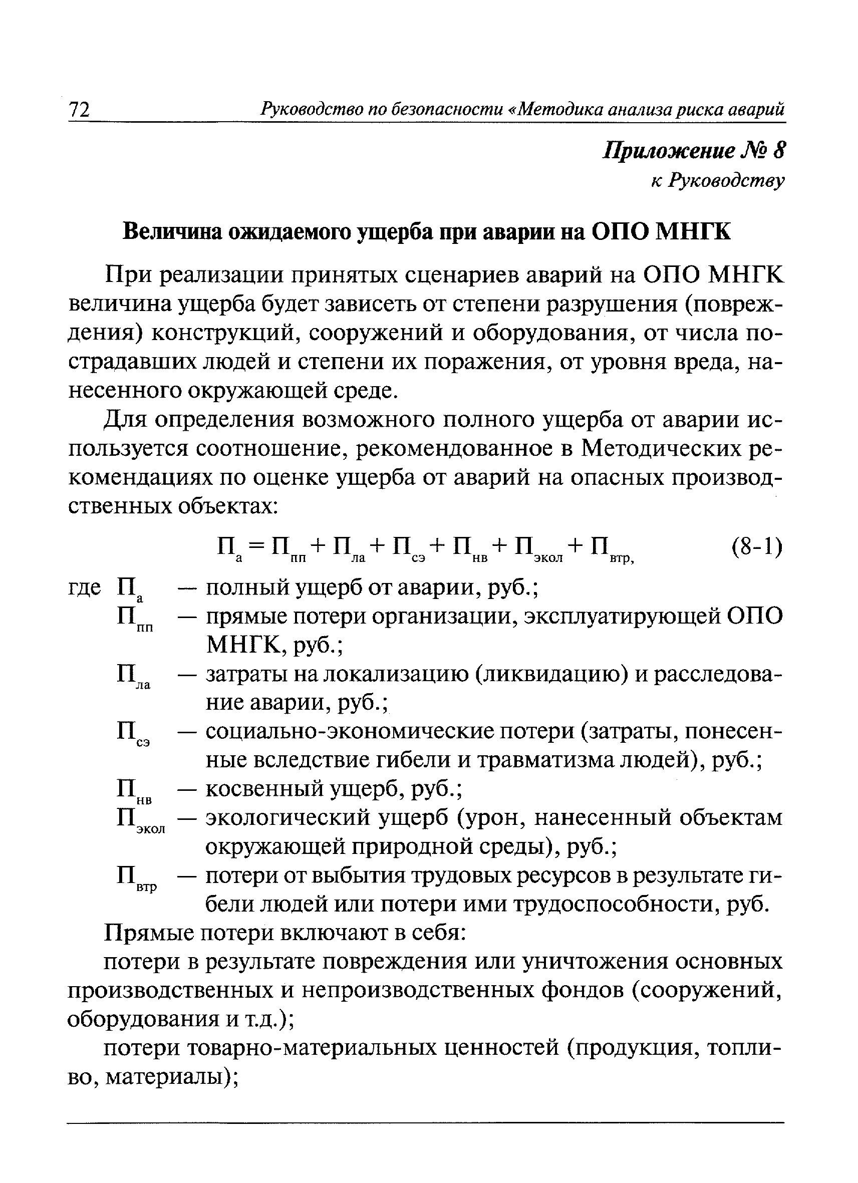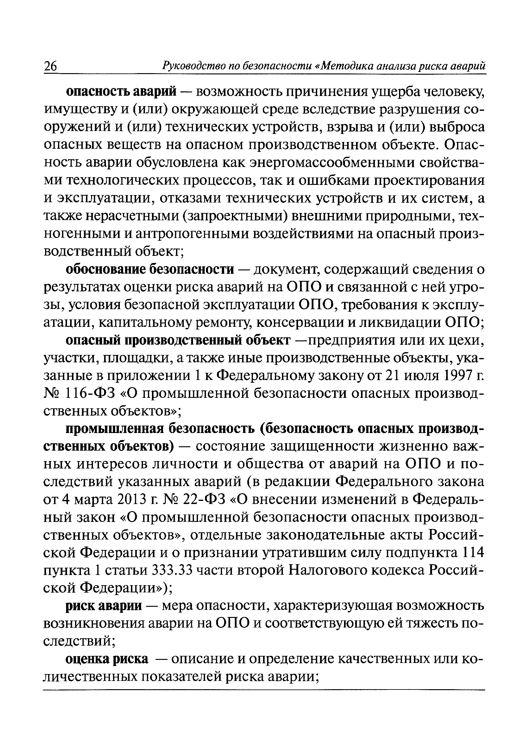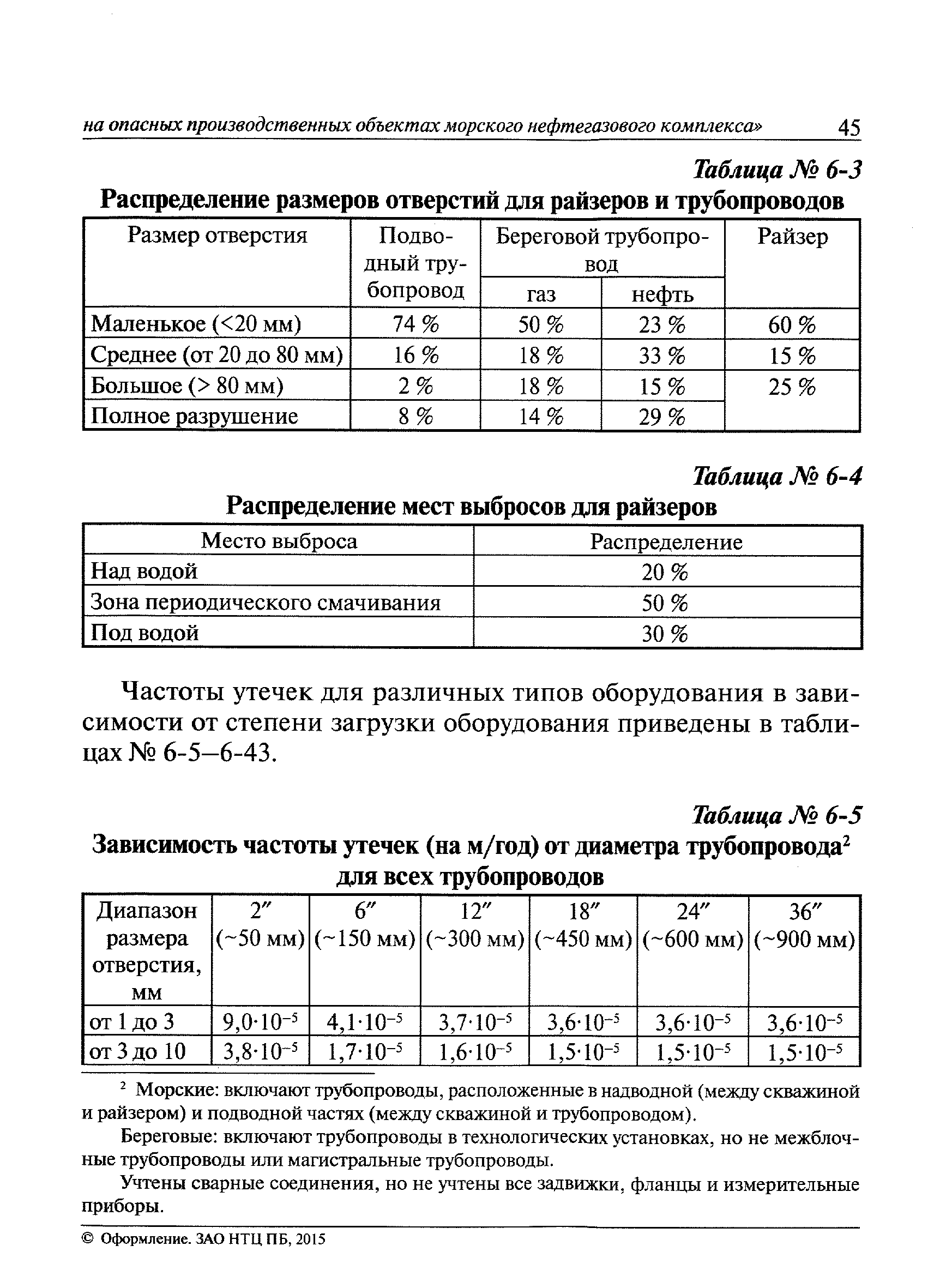 | Оглавление: | I. Общие положения II. Общие рекомендации по оценке риска аварий на ОНО МНГК III. Планирование и организация работ IV. Идентификация опасностей аварий V. Количественная оценка риска аварий VI. Определение степени опасности ОНО МНГК и их участков/составных частей VII. Рекомендации по снижению риска аварий на ОНО МНГК Приложение № 1. Список сокращений Приложение № 2. Термины и определения Приложение № 3. Типовой перечень исходной информации, применяемой для оценки риска аварий Приложение № 4. Рекомендуемые зоны/составные части в зависимости от размещения участков морских трубопроводов Приложение № 5. Рекомендации по выщелению типовых сценариев аварий (на примере морских платформ и ПБУ) Приложение № 6. Частоты аварийной разгерметизации и утечек из типового оборудования на ОНО МИГК Приложение № 7. Рекомендуемый порядок расчета истечения взрывопожароопасных жидкостей из морских трубопроводов Приложение № 8. Величина ожидаемого ущерба при аварии на ОПО МНГК Приложение № 9. Распространение загрязняющих веществ Приложение № 10. Показатели риска аварий Приложение № 11. Методика расчета интенсивности истечения при фонтанировании скважин Приложение № 12. Нормативные правовые и правовые акты для оценки возможных последствий аварий |