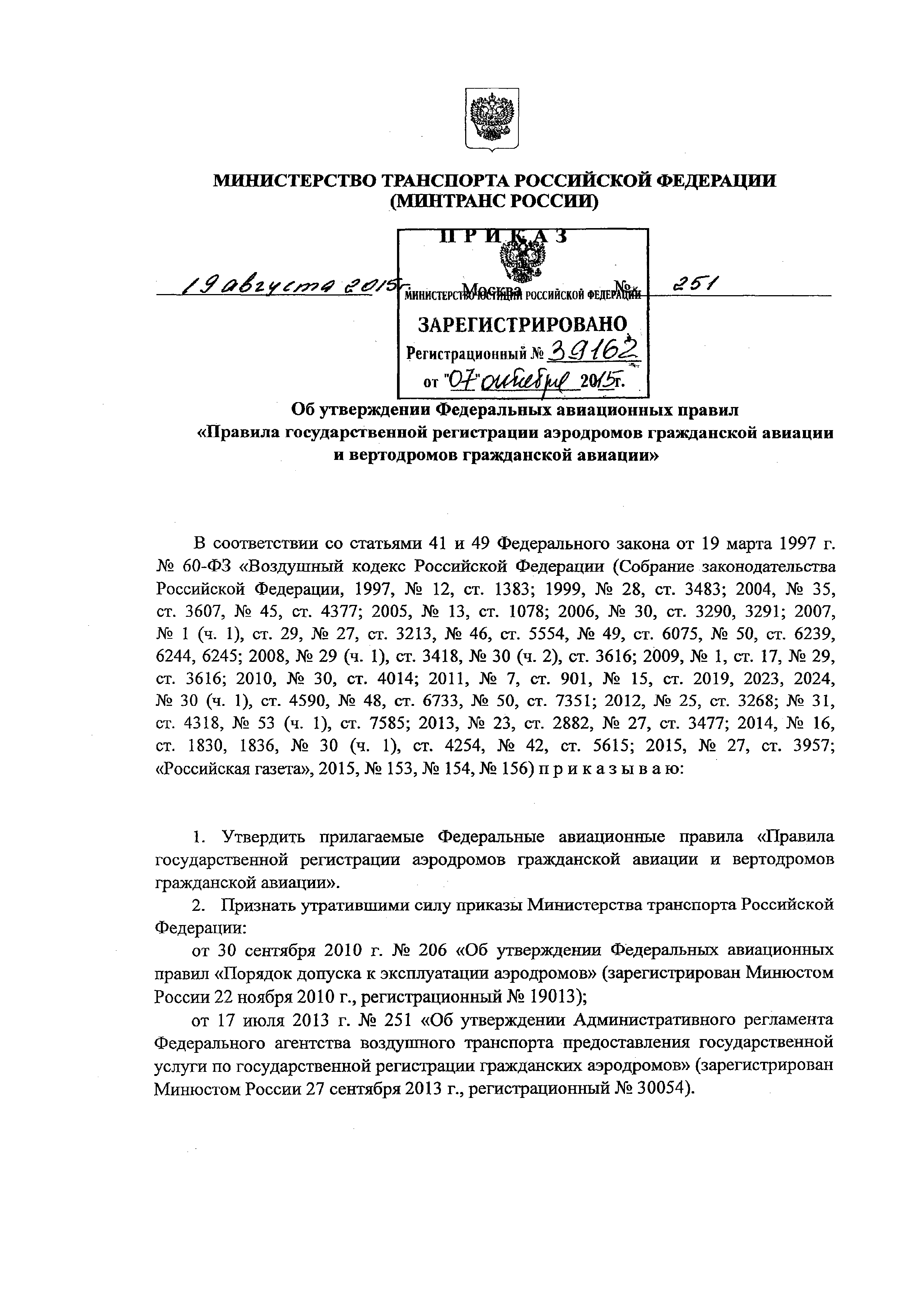 | Утверждён: | 19.08.2015 Министерство транспорта Российской Федерации (Russian Federation Ministry of Transportation 251)