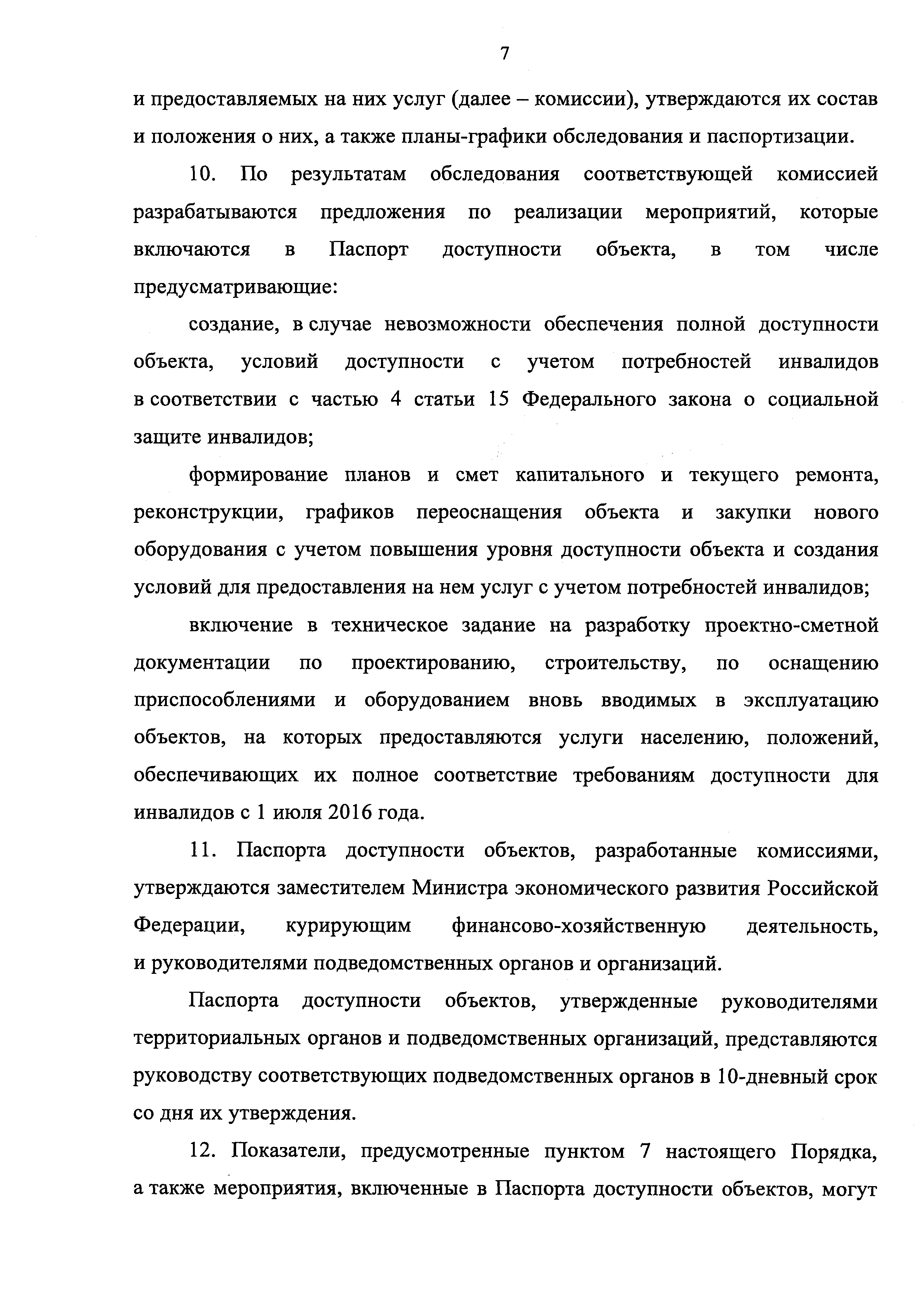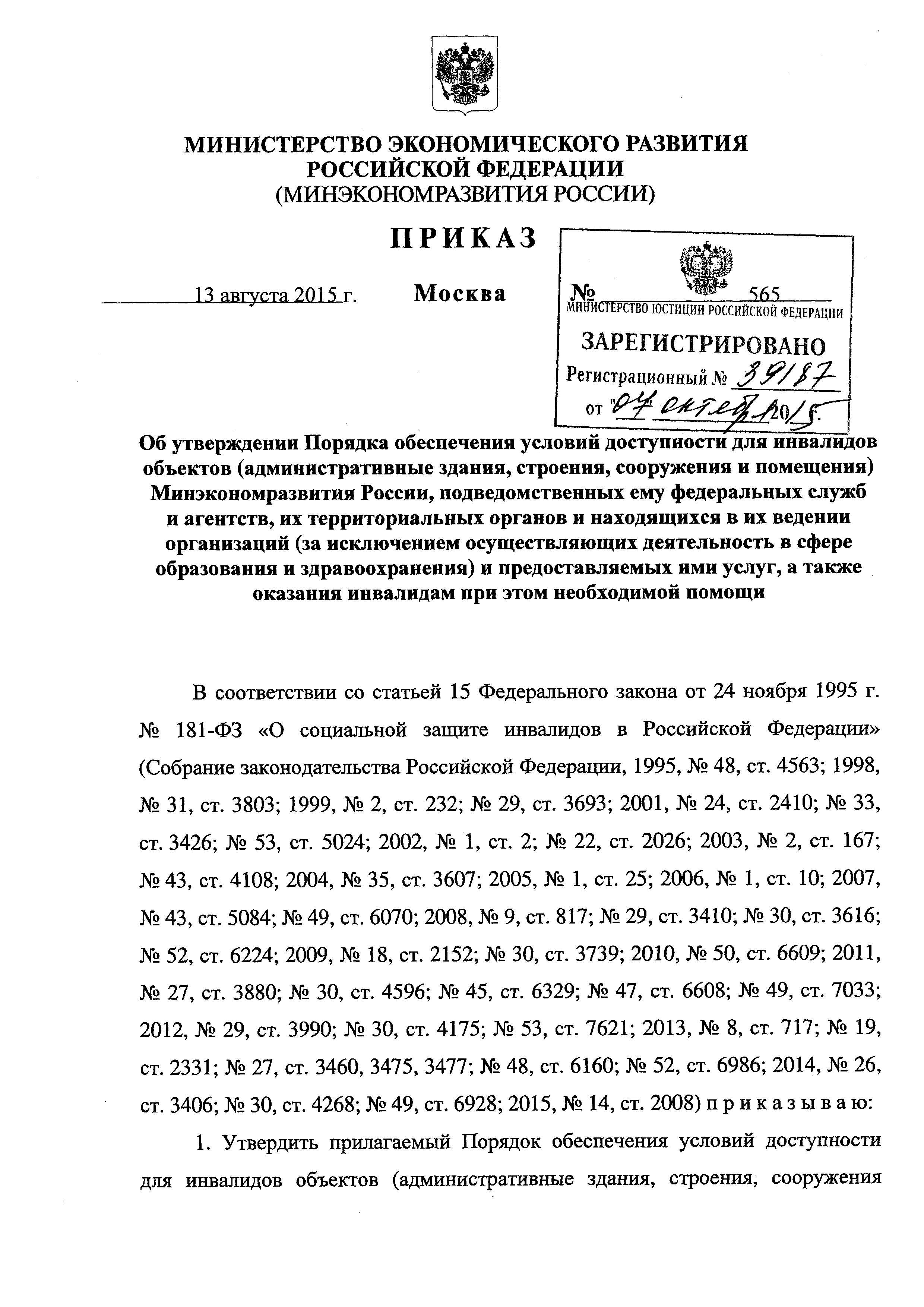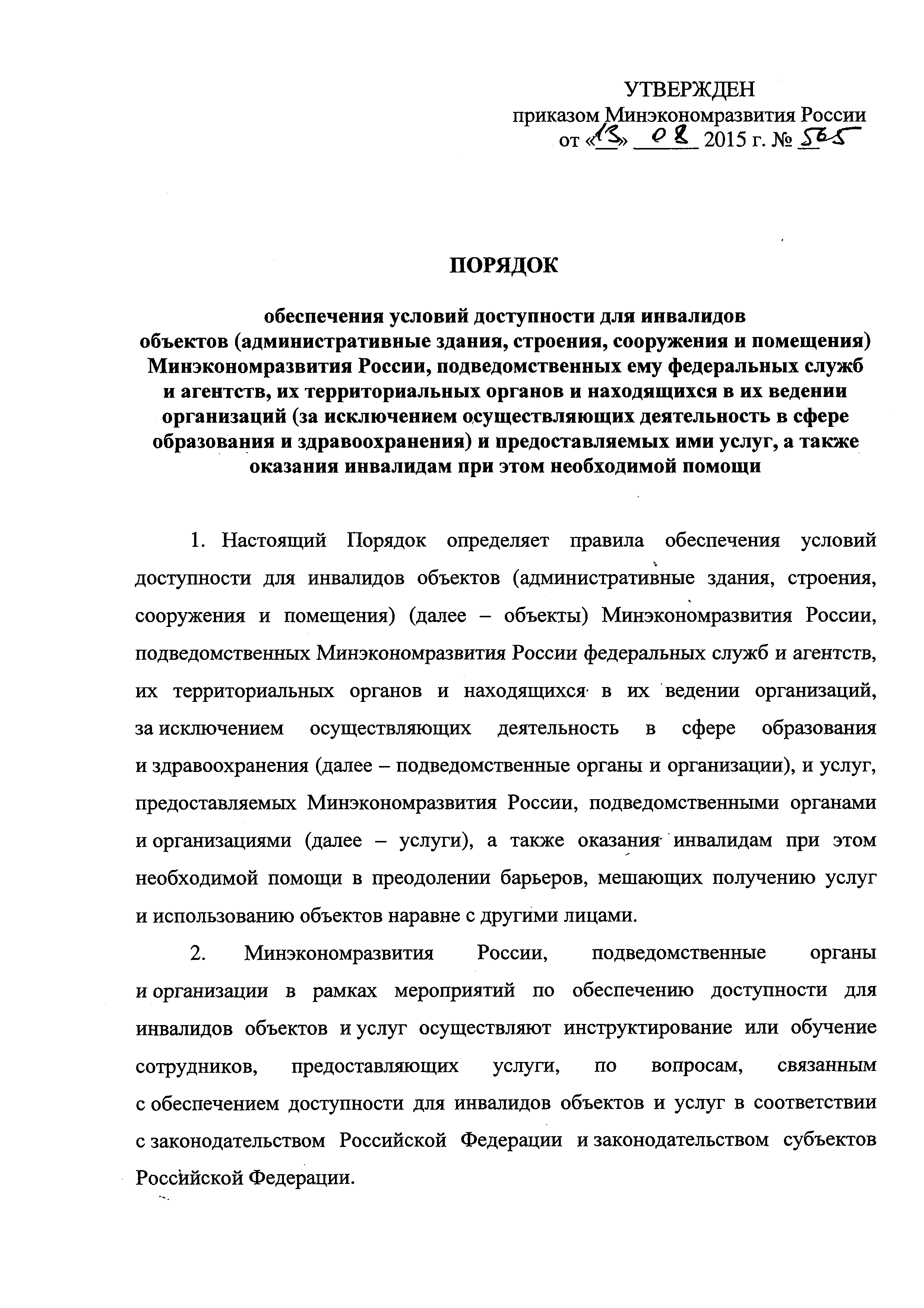 Порядок обеспечения условий доступности для инвалидов объектов (административные здания, строения, сооружения и помещения) Минэкономразвития России, подведомственных ему федеральных служб и агентств, их территориальных органов и находящихся в их ведении организаций (за исключением осуществляющих деятельность и сфере образования и здравоохранения) и предоставляемых ими услуг, а также оказания инвалидам при этом необходимой помощи| Статус: | действует | | Название рус.: | Порядок обеспечения условий доступности для инвалидов объектов (административные здания, строения, сооружения и помещения) Минэкономразвития России, подведомственных ему федеральных служб и агентств, их территориальных органов и находящихся в их ведении организаций (за исключением осуществляющих деятельность и сфере образования и здравоохранения) и предоставляемых ими услуг, а также оказания инвалидам при этом необходимой помощи | | Дата добавления в базу: | 12.02.2016 | | Дата актуализации: | 01.01.2021 | | Дата введения: | 01.01.2016 | | Область применения: | Порядок определяет правила обеспечения условий доступности для инвалидов объектов (административные здания, строения, сооружения и помещения) Минэкономразвития России, подведомственных Минэкономразвития России федеральных служб и агентств, их территориальных органов и находящихся в их ведении организаций, за исключением осуществляющих деятельность и сфере образования и здравоохранения, и услуг, предоставляемых Минэкономразвития России, подведомственными органами и организациями, а также оказания инвалидам при этом необходимой помощи в преодолении барьеров, мешающих получению услуг и использованию объектов наравне с другими лицами | | Утверждён: | 13.08.2015 Министерство экономического развития РФ (565)