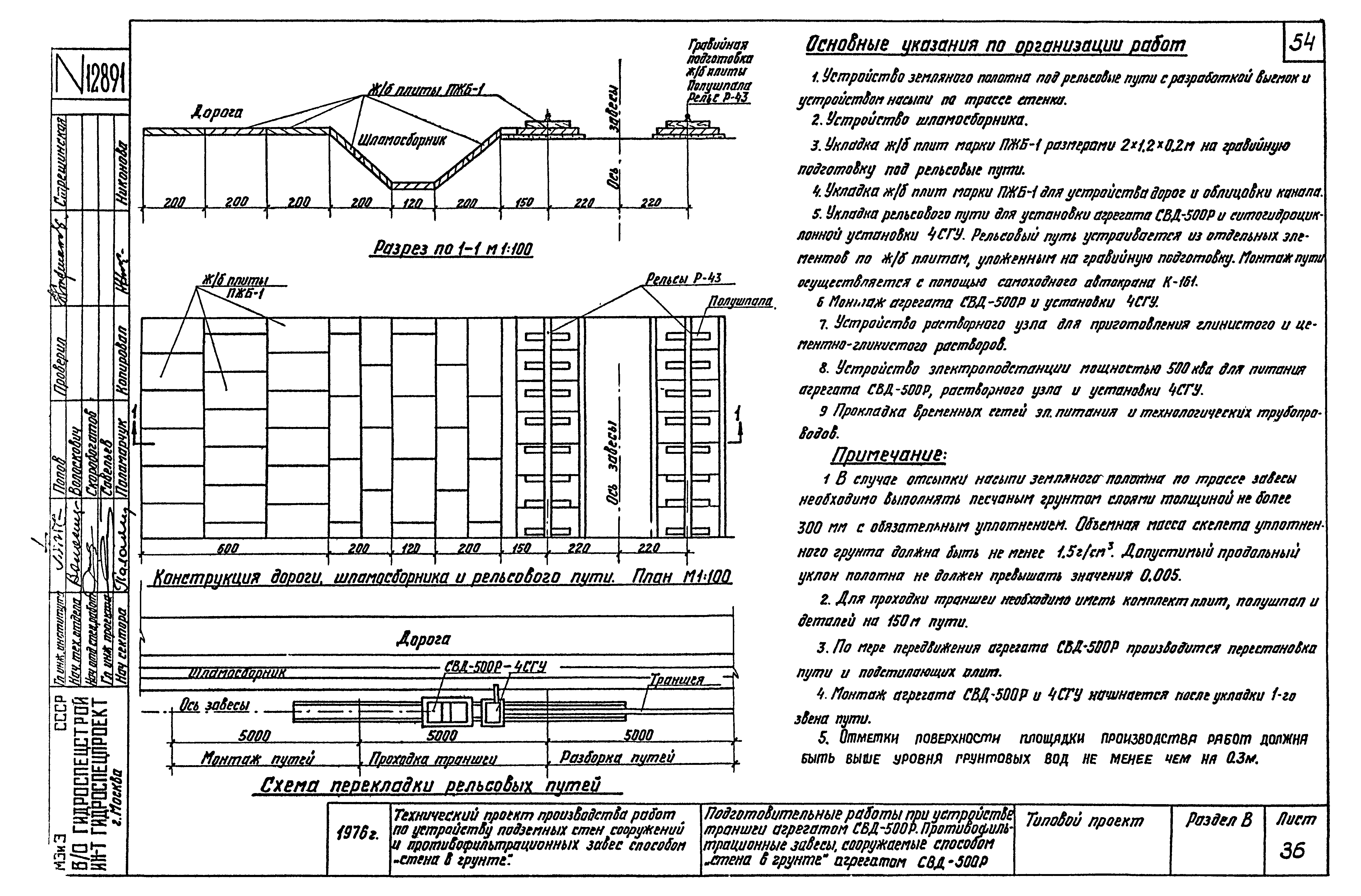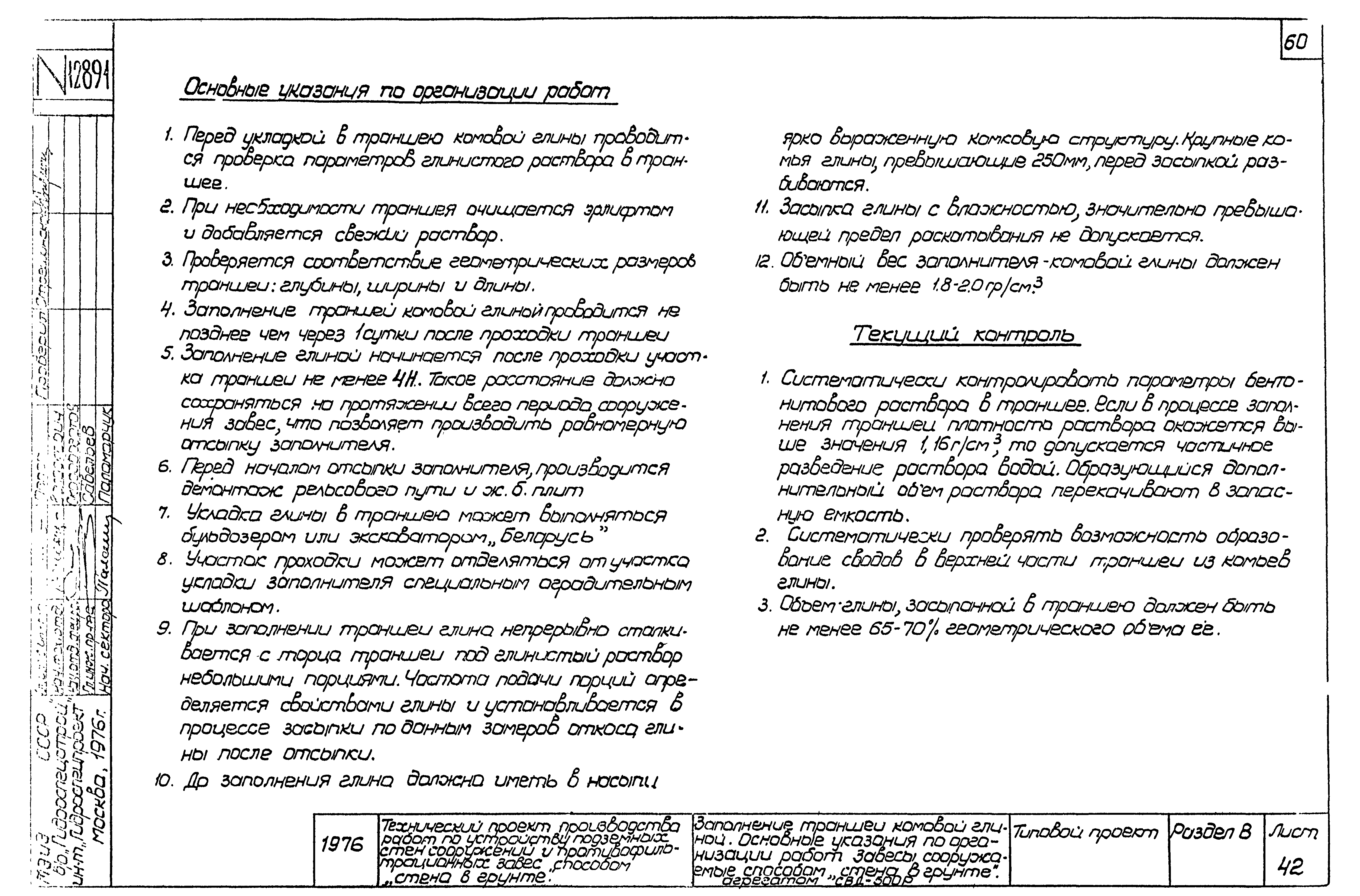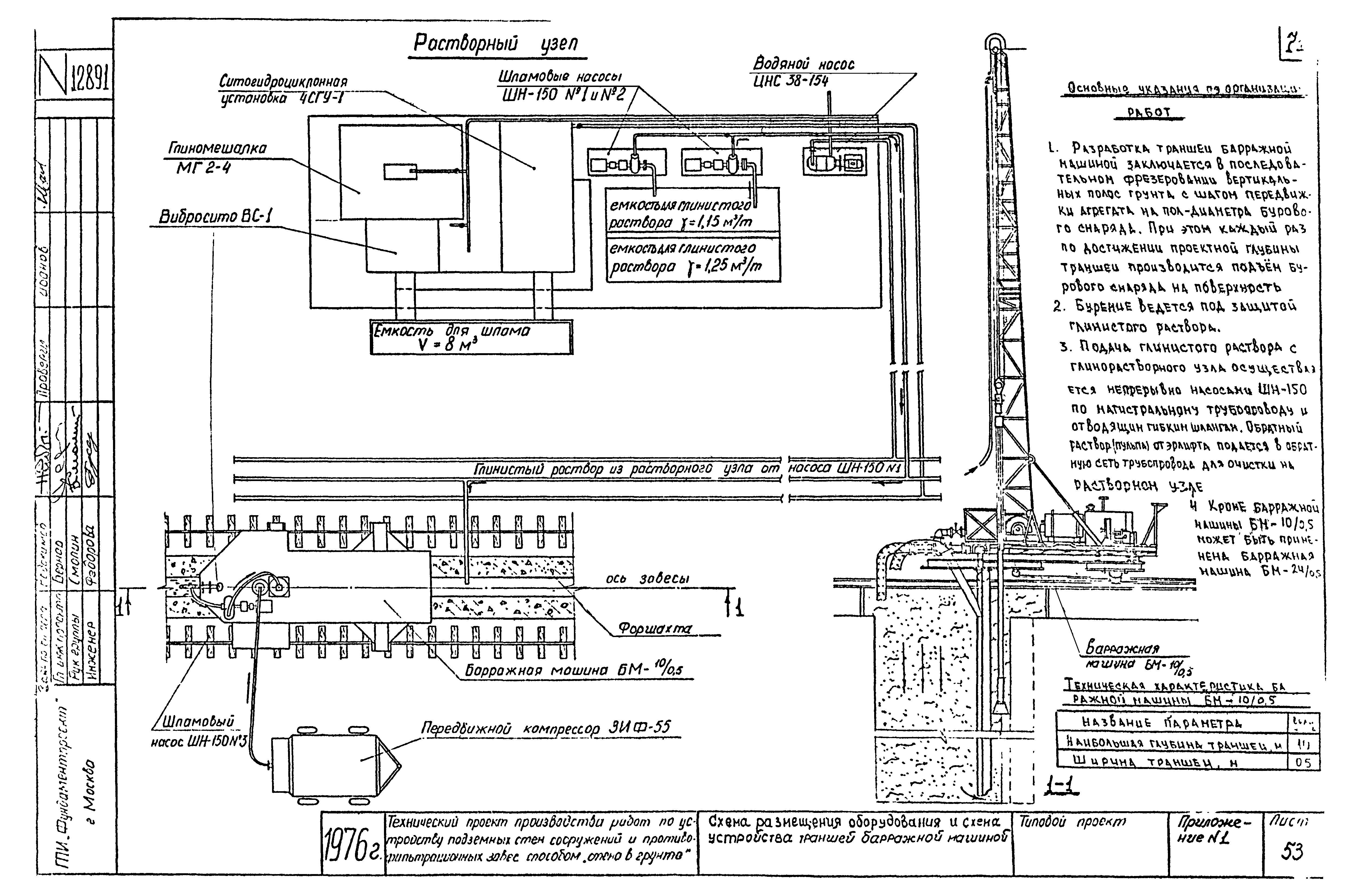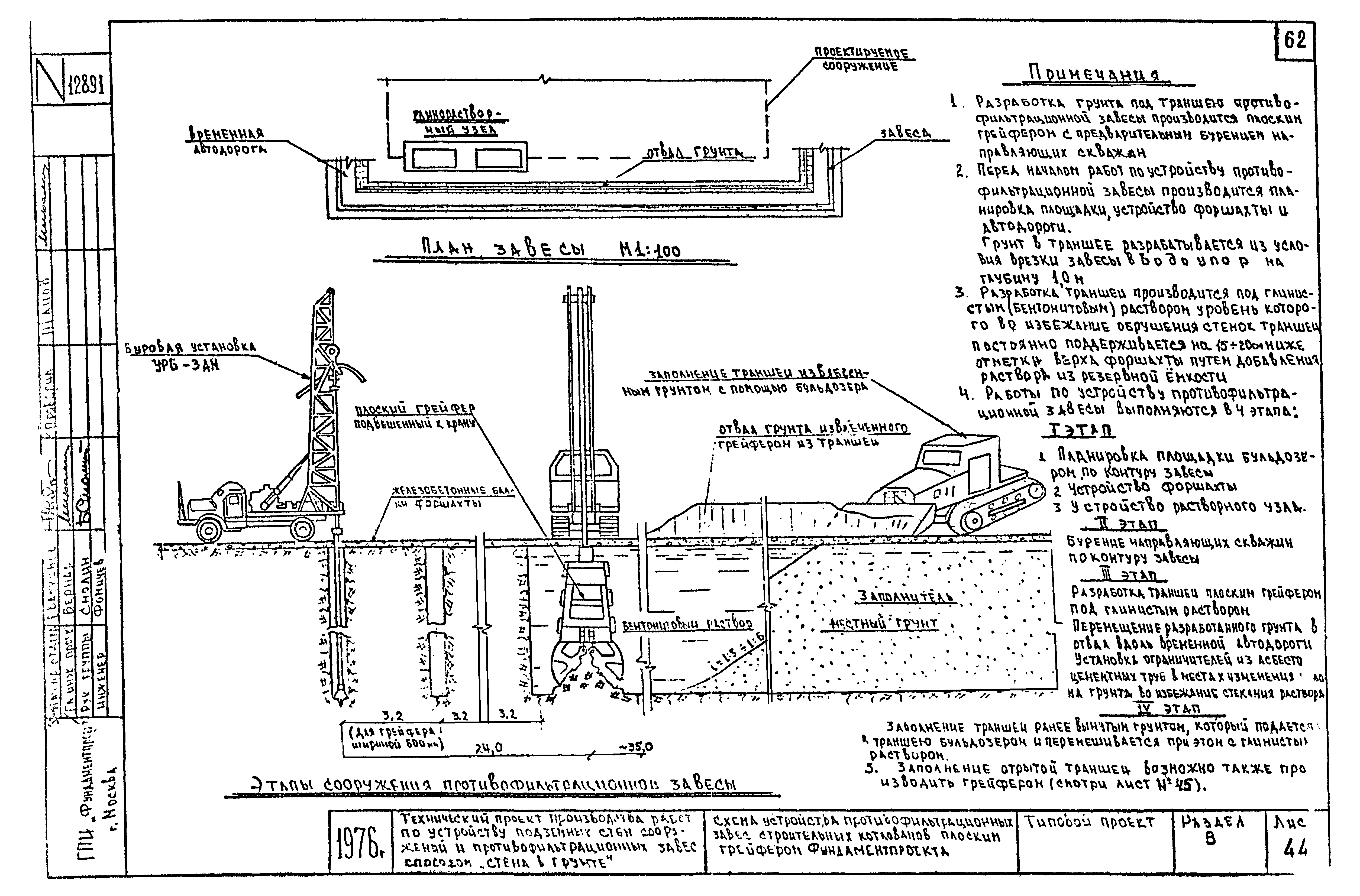 | Оглавление: | Титульный лист Раздел А. Пояснительная записка Раздел Б. Схемы устройства подземных стен сооружений способом "стена в грунте" Раздел В. Схема устройства противофильтрационных завес сооружаемых способом "стена в грунте" Приложение 1. Схема размещения оборудования и схема устройства траншеи барражной машиной Приложение 2. Схема размещения механизмов и оборудования при устройстве траншей гидротраншеекопателем ВНИИГС Приложение 3. Схема устройства траншей гидротраншеекопателем ВНИИГС Приложение 4. Задание на разработку темы |