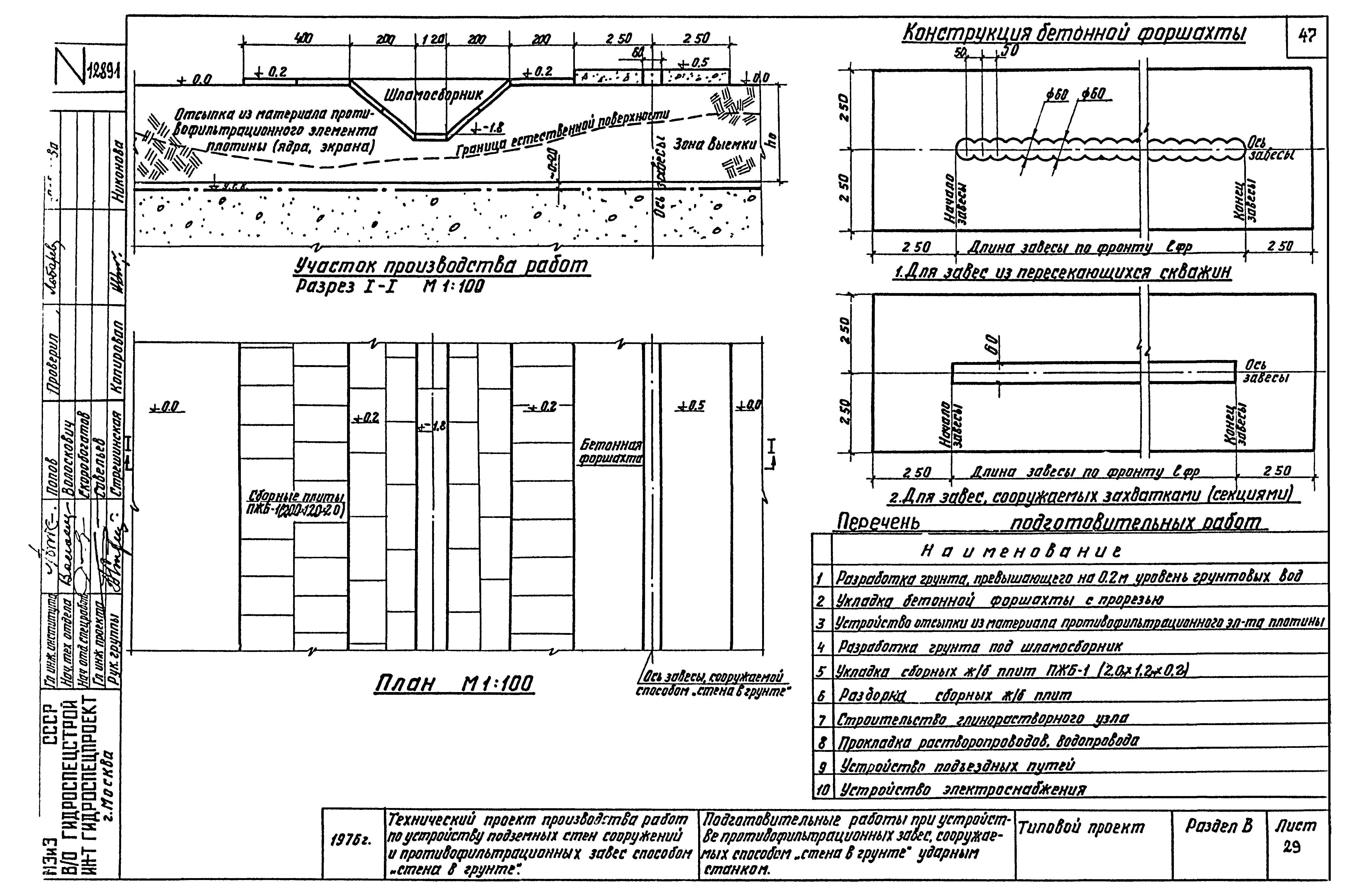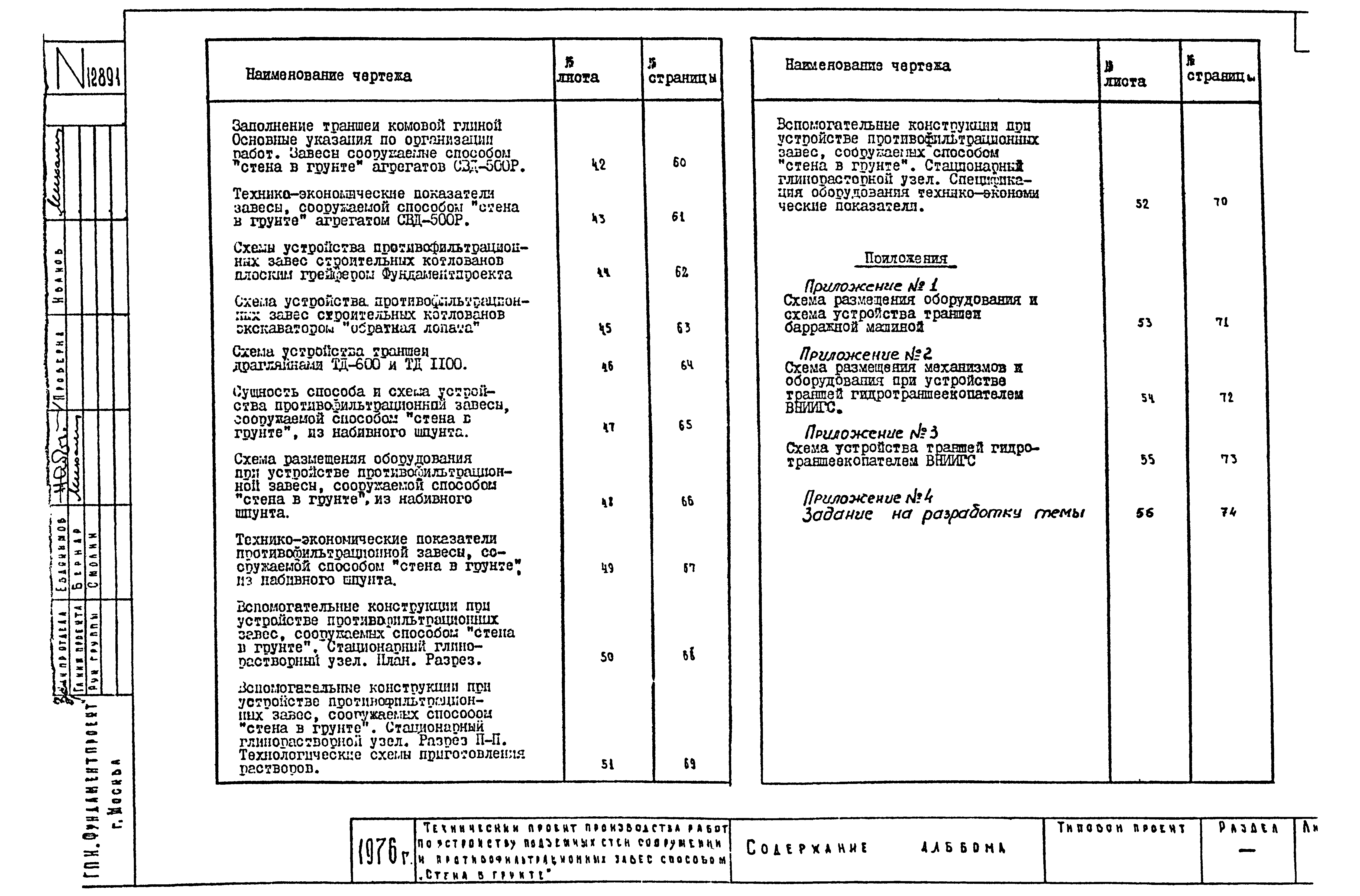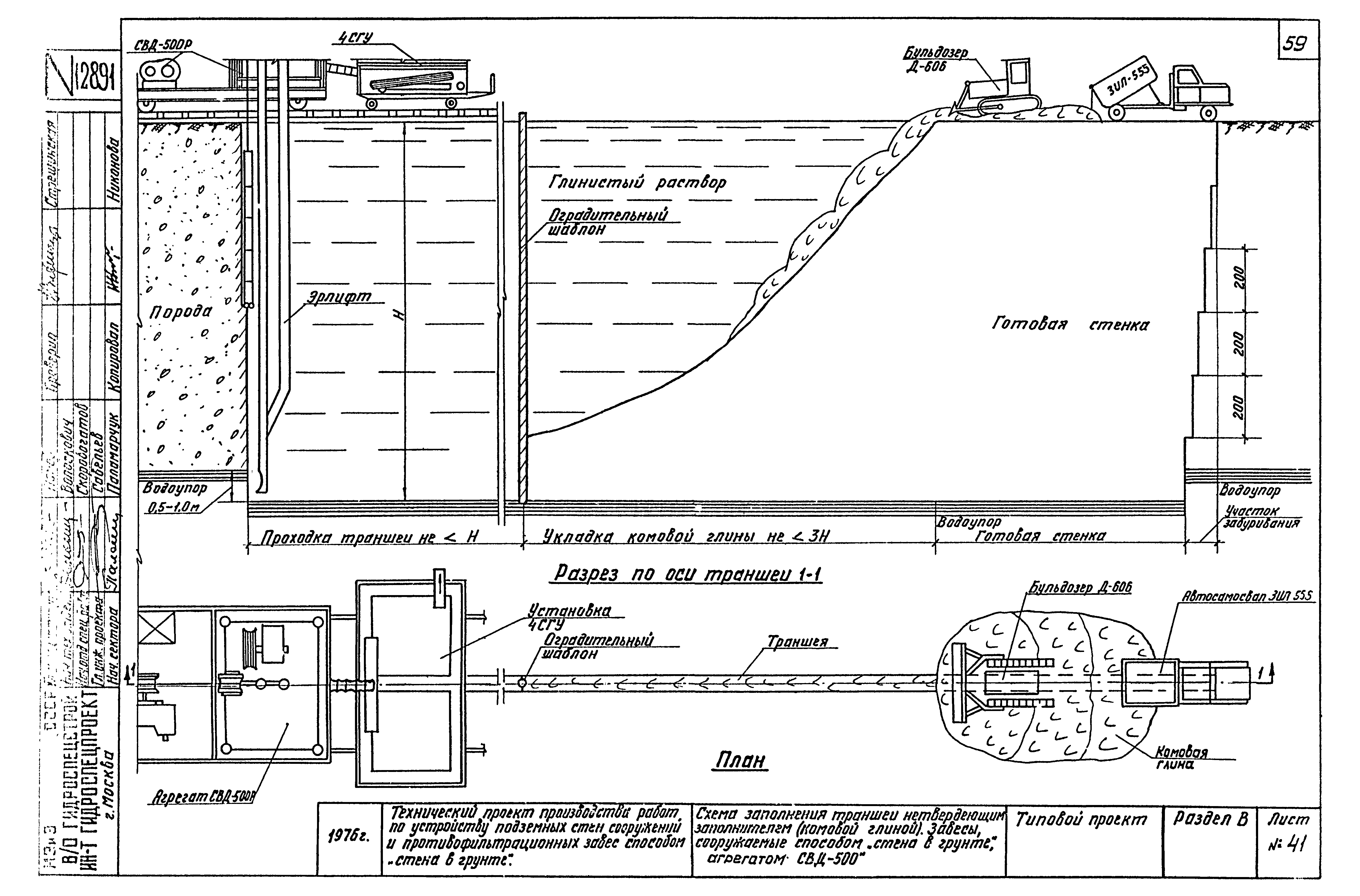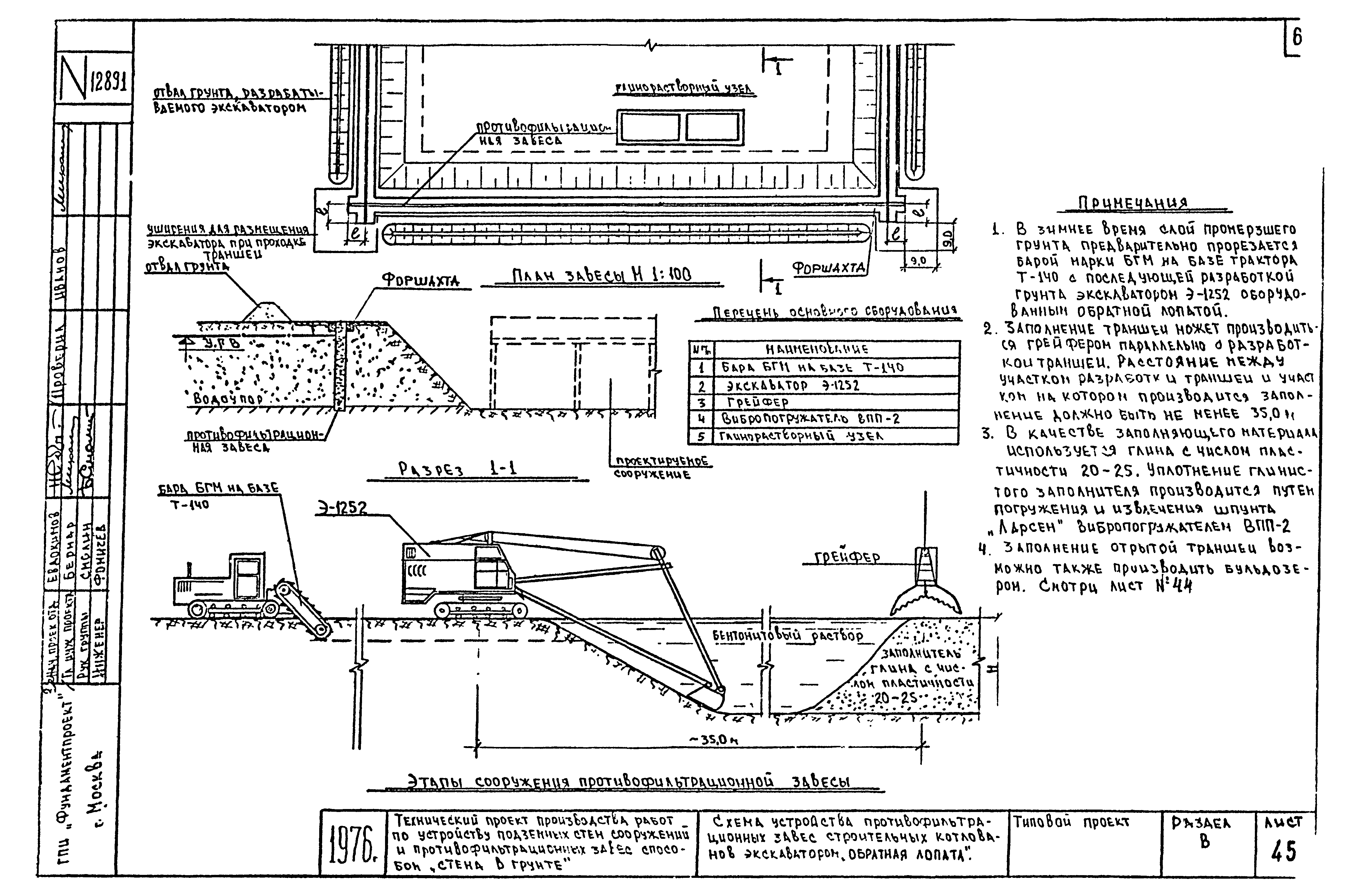 | Оглавление: | Титульный лист Раздел А. Пояснительная записка Раздел Б. Схемы устройства подземных стен сооружений способом "стена в грунте" Раздел В. Схема устройства противофильтрационных завес сооружаемых способом "стена в грунте" Приложение 1. Схема размещения оборудования и схема устройства траншеи барражной машиной Приложение 2. Схема размещения механизмов и оборудования при устройстве траншей гидротраншеекопателем ВНИИГС Приложение 3. Схема устройства траншей гидротраншеекопателем ВНИИГС Приложение 4. Задание на разработку темы |