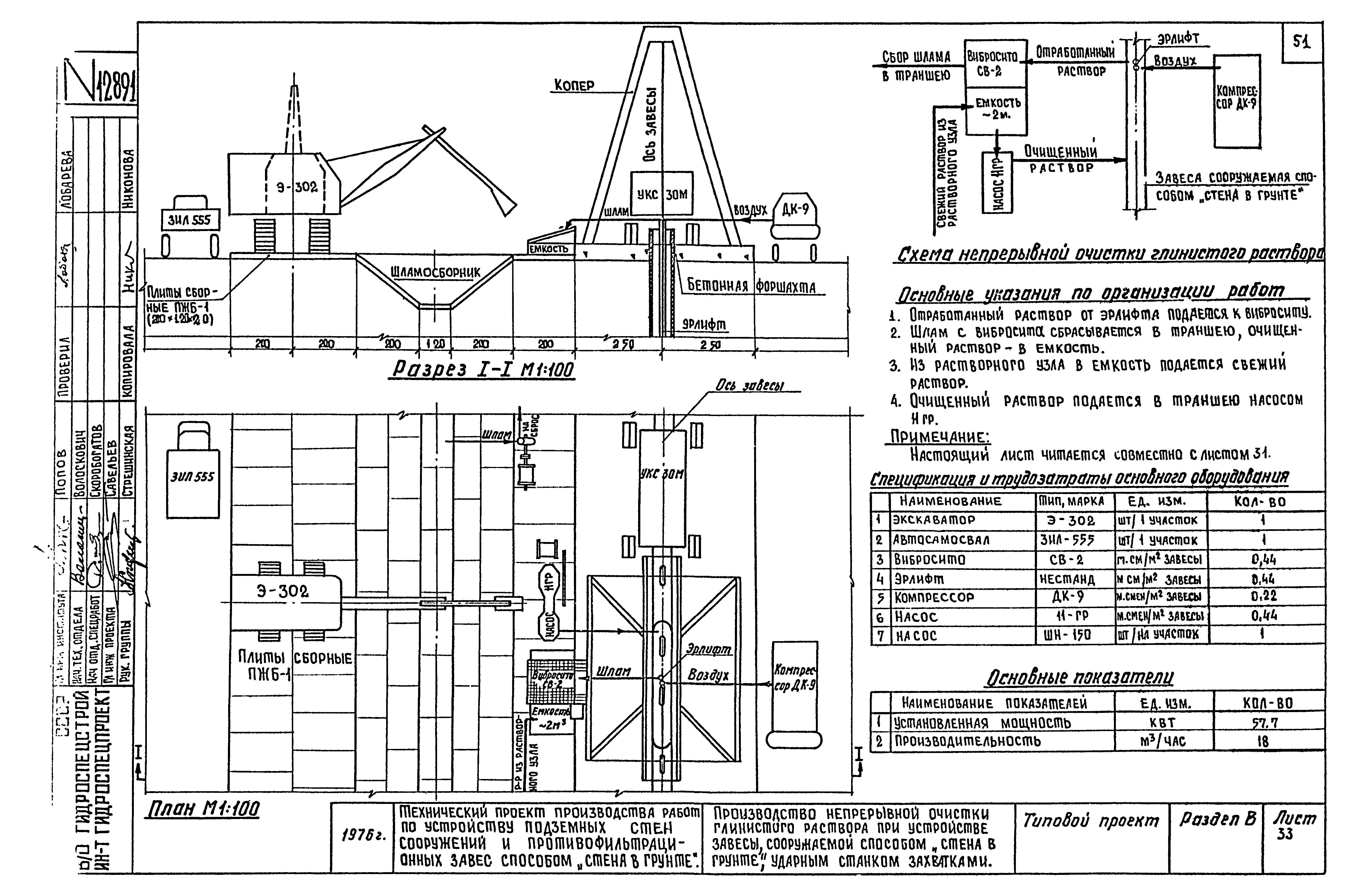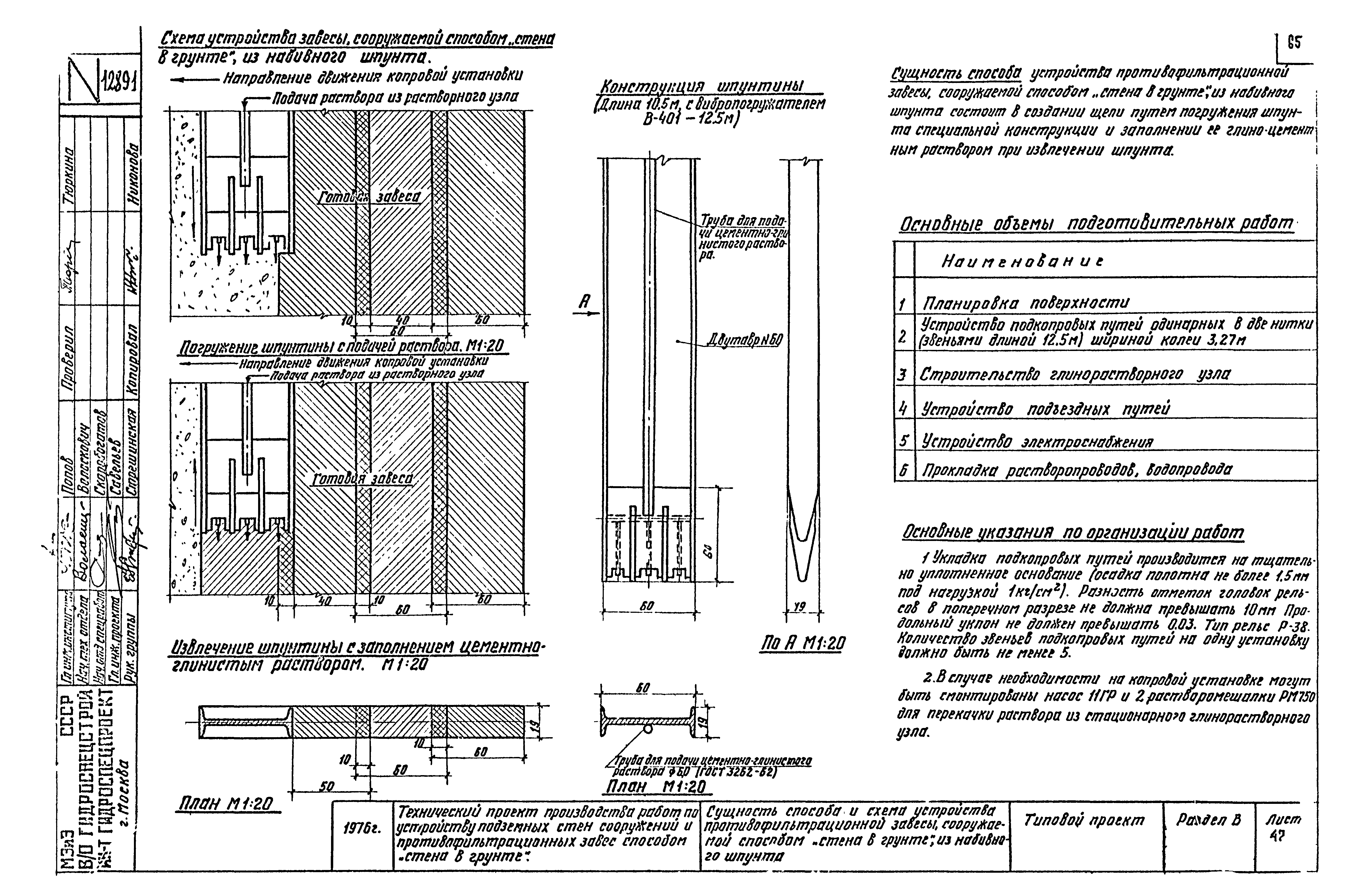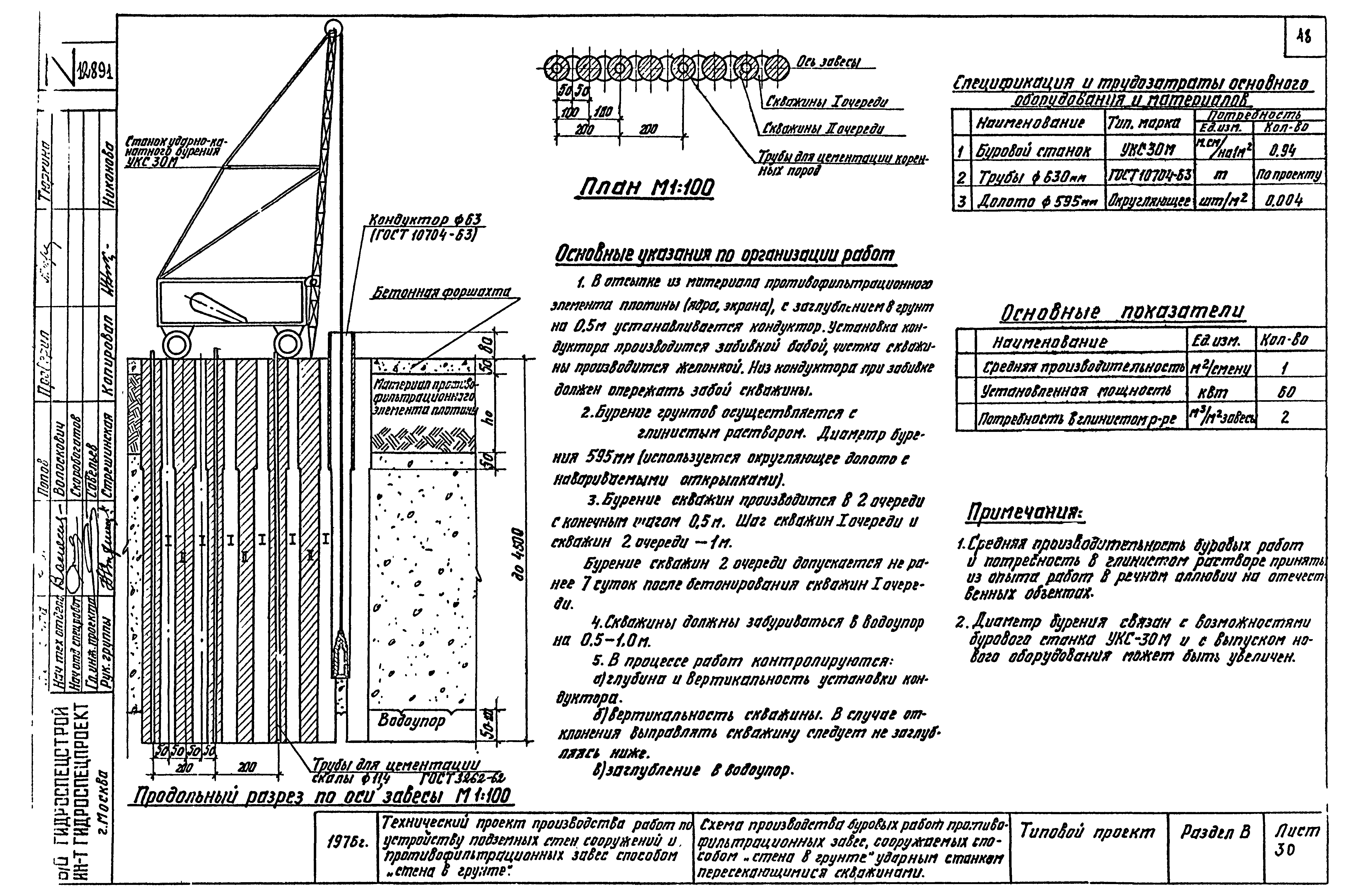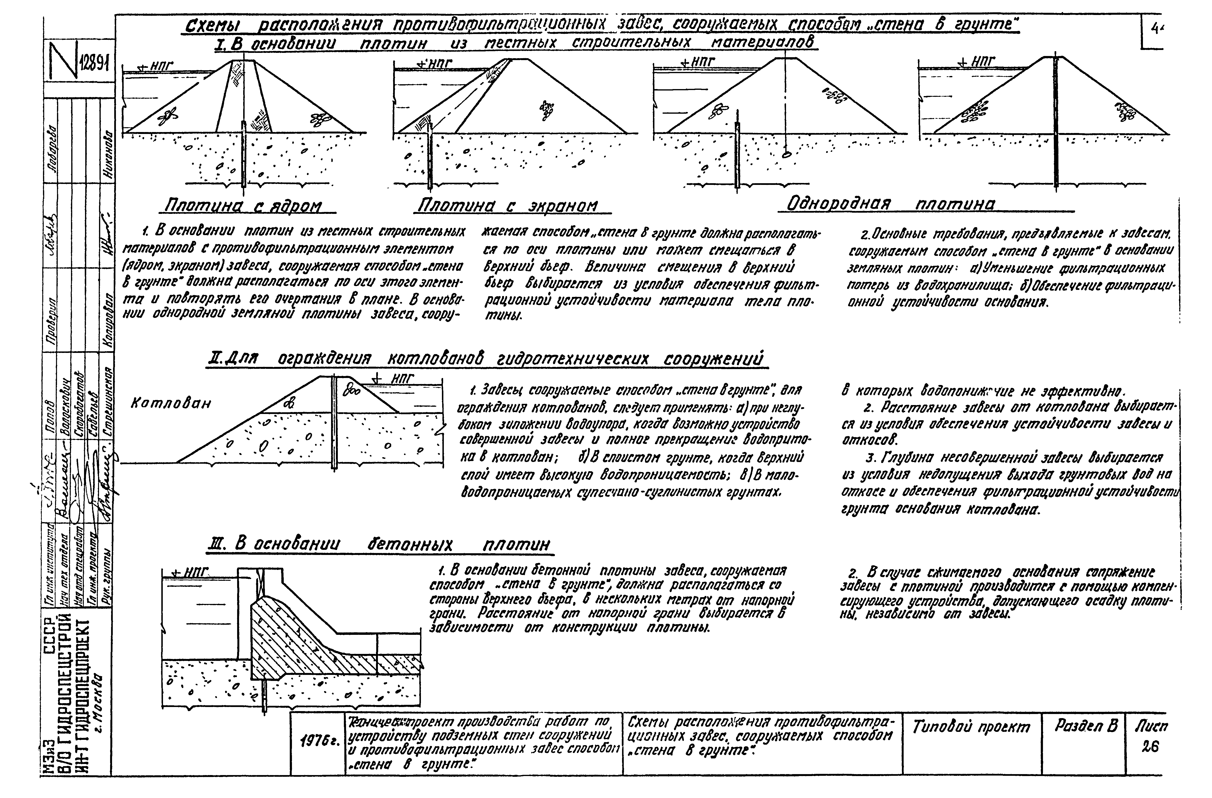 | Оглавление: | Титульный лист Раздел А. Пояснительная записка Раздел Б. Схемы устройства подземных стен сооружений способом "стена в грунте" Раздел В. Схема устройства противофильтрационных завес сооружаемых способом "стена в грунте" Приложение 1. Схема размещения оборудования и схема устройства траншеи барражной машиной Приложение 2. Схема размещения механизмов и оборудования при устройстве траншей гидротраншеекопателем ВНИИГС Приложение 3. Схема устройства траншей гидротраншеекопателем ВНИИГС Приложение 4. Задание на разработку темы |