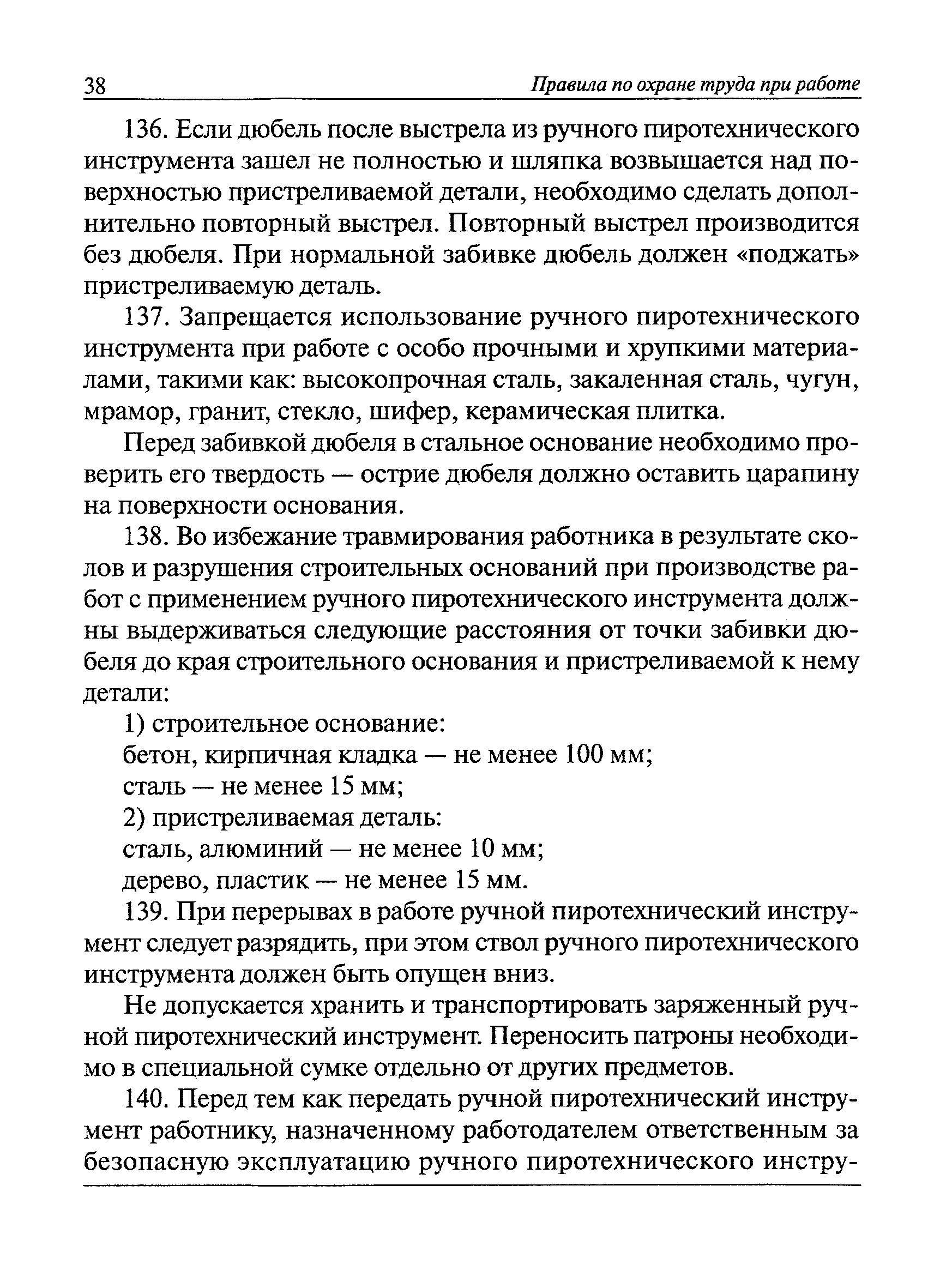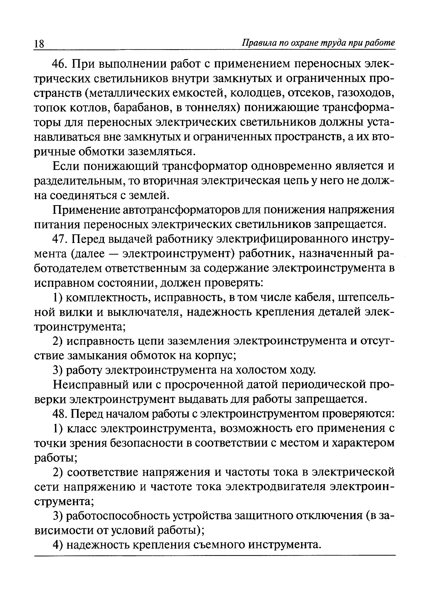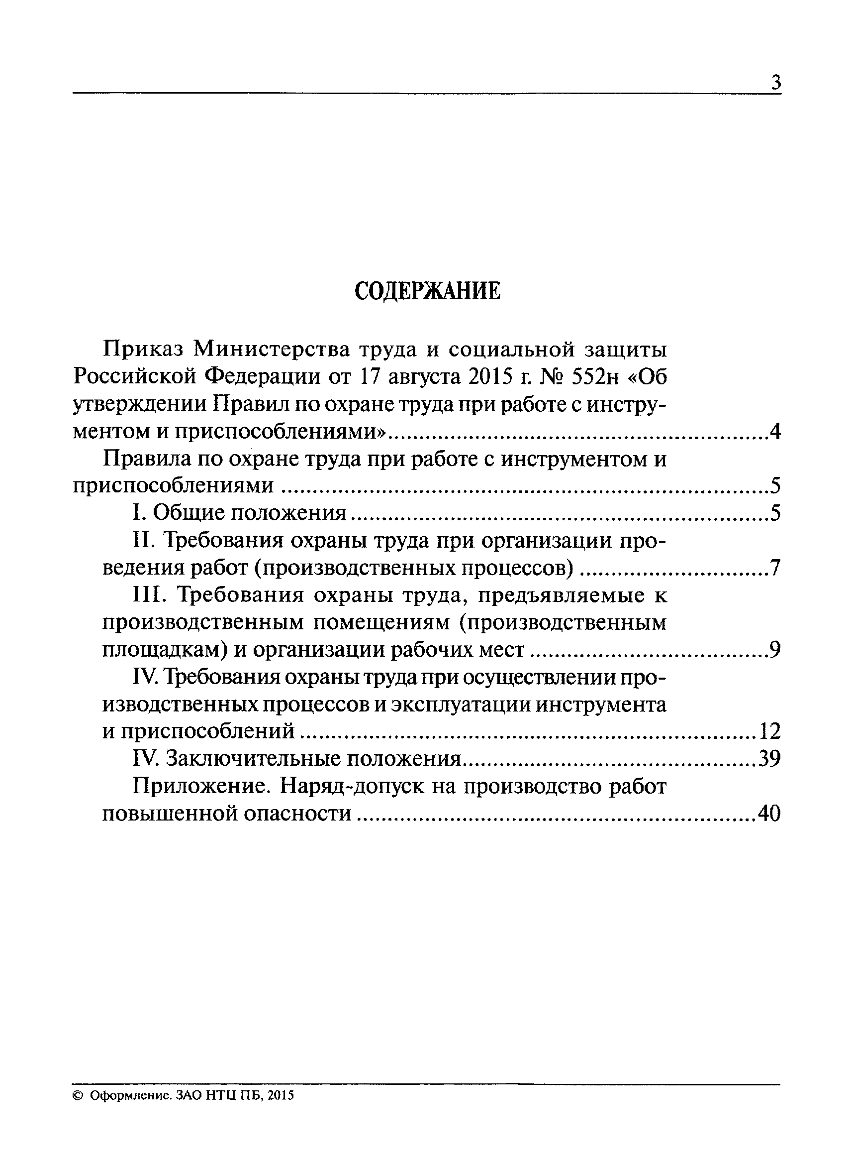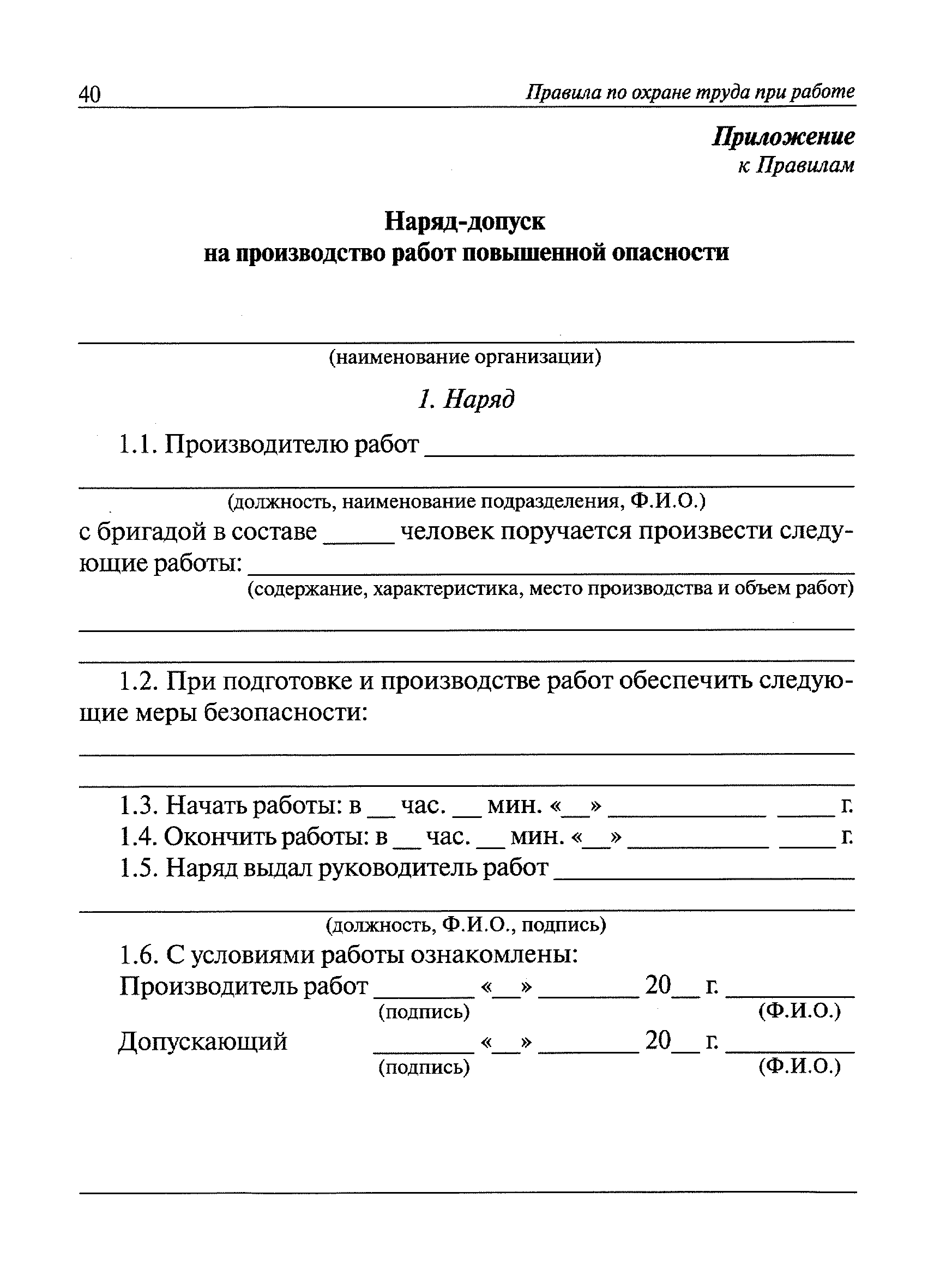 | Оглавление: | I. Общие положения II. Требования охраны труда при организации проведения работ (производственных процессов) III. Требования охраны труда, предъявляемые к производственным помещениям (производственным площадкам) и организации рабочих мест IV. Требования охраны туда при осуществлении производственных процессов и эксплуатации инструмента и приспособлений V. Заключительные положения Приложение. Наряд-допуск на производство работ повышенной опасности |