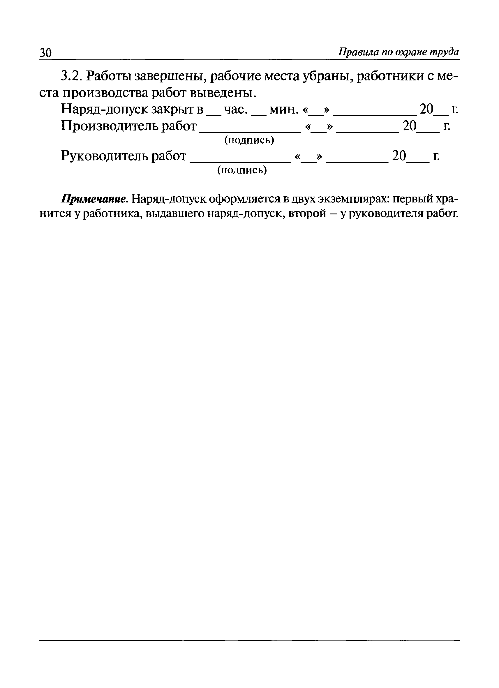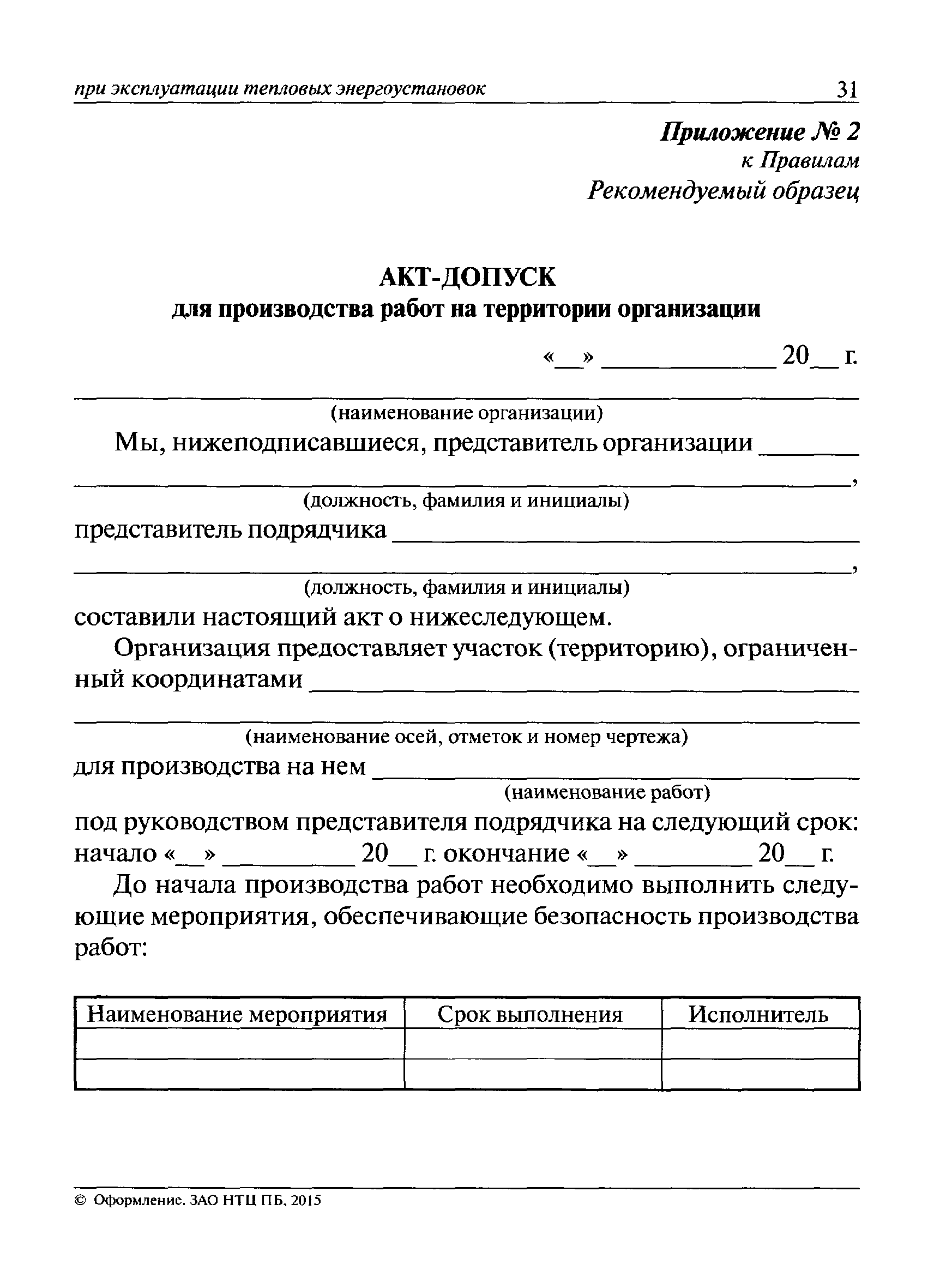 | Оглавление: | I. Общие положения II. Требования охраны труда при организации проведения работ (производственных процессов) III. Требования охраны труда, предъявляемые к производственным помещениям (производственным площадкам) и организации рабочих мест IV. Требования охраны труда при осуществлении производственных процессов и эксплуатации тепловых электроустановок V. Заключительные положения Приложение 1. Наряд-допуск на производство работ повышенной опасности Приложение 2. Акт-допуск для производства работ на территории организации |