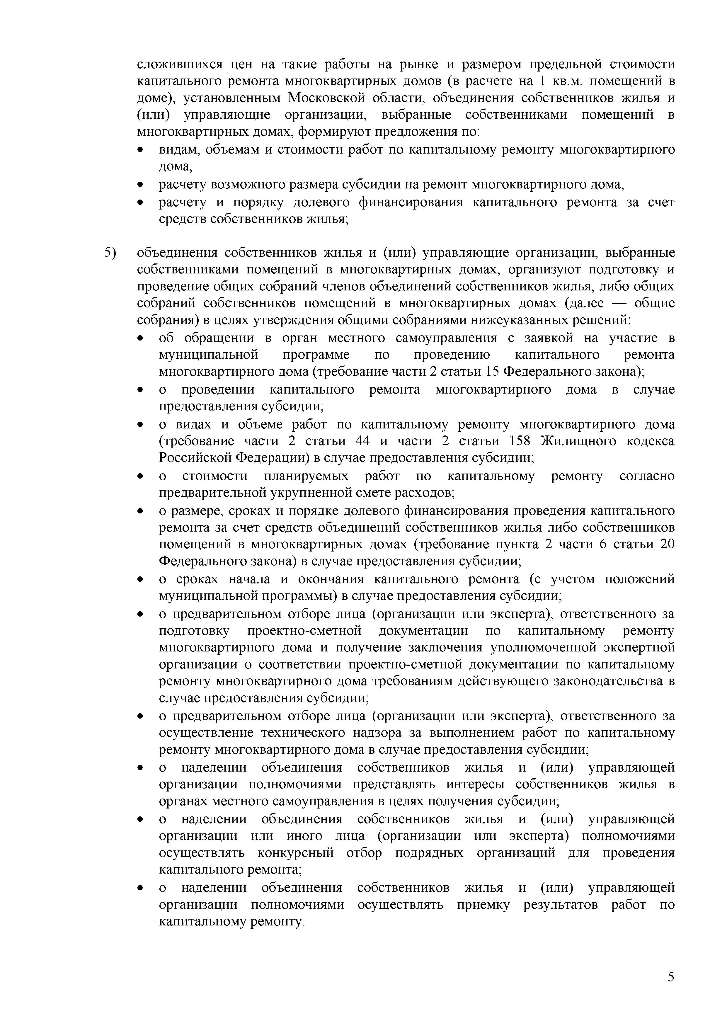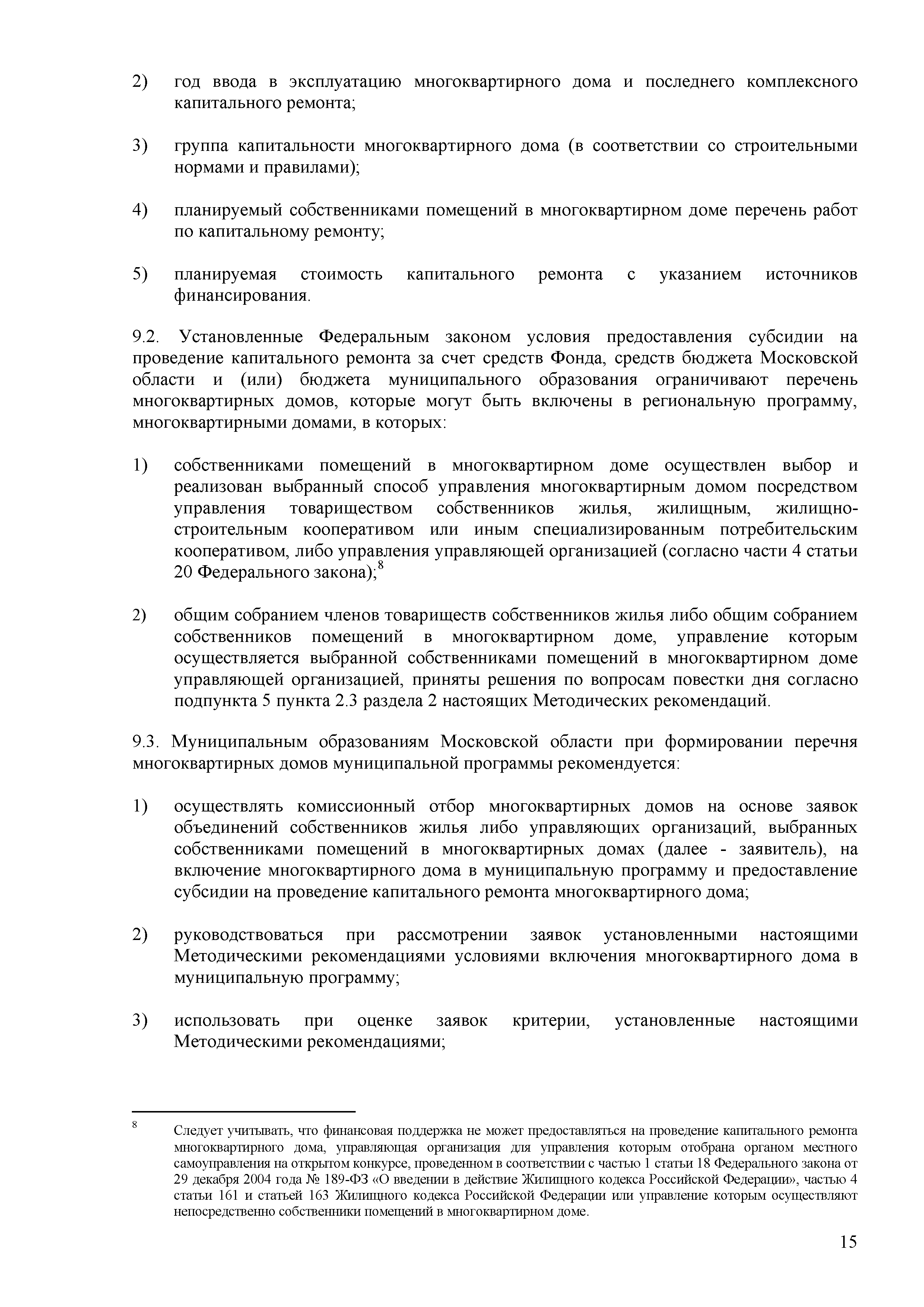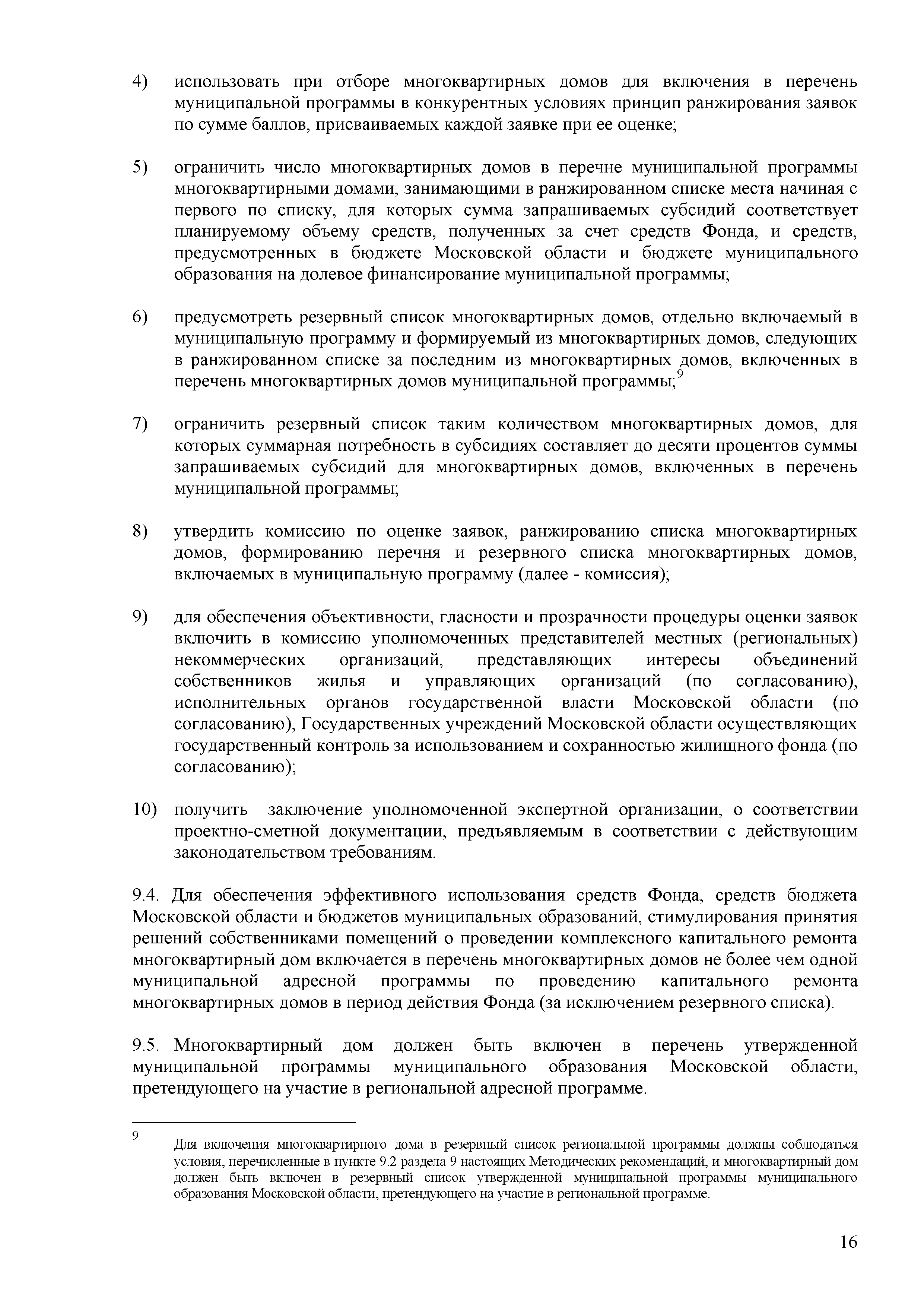 Методические рекомендации по подготовке муниципальных адресных программ по проведению капитального ремонта многоквартирных домов на территории муниципальных образований Московской области с использованием средств, предоставляемых в соответствии с Федеральным законом от 21.07.2007 г. № 185-ФЗ "О Фонде содействия реформированию жилищно-коммунального хозяйства"| Статус: | действует | | Название рус.: | Методические рекомендации по подготовке муниципальных адресных программ по проведению капитального ремонта многоквартирных домов на территории муниципальных образований Московской области с использованием средств, предоставляемых в соответствии с Федеральным законом от 21.07.2007 г. № 185-ФЗ "О Фонде содействия реформированию жилищно-коммунального хозяйства" | | Дата добавления в базу: | 12.02.2016 | | Дата актуализации: | 01.01.2021 | | Область применения: | Методические рекомендации разработаны в целях методического обеспечения подготовки муниципальными образованиями адресных программ по проведению капитального ремонта многоквартирных домов на территории муниципальных образований Московской области с использованием средств предоставляемых в соответствии с Федеральным законом от 21.07.2007 № 185-ФЗ "О Фонде содействия реформированию жилищно-коммунального хозяйства" | | Оглавление: | 1 Общие положения 2 Этапы разработки муниципальной программы 3 Цели муниципальной программы 4 Условия предоставления субсидии 5 Виды капитального ремонта общего имущества многоквартирных домов 6 Источники и объемы финансирования муниципальной адресной программы. Методика расчета размера субсидии 7 Порядок подачи обращений на включение многоквартирного дома в муниципальную программу и перечень документов, прилагаемых к этому обращению 8 Порядок подачи обращения муниципального образования на участие в региональной адресной программе и перечень документов, прилагаемых к этому обращению 9 Порядок включения многоквартирных домов в адресную программу муниципального образования по проведению капитального ремонта многоквартирных домов 10 Критерии оценки заявок для включения многоквартирных домов в муниципальную программу 11 Перечень требований к разработке дефектных ведомостей и смет на капитальный ремонт многоквартирных домом в Московской области Приложение 1. Акт о техническом состоянии общего имущества многоквартирного дома Приложение 2. Дефектная ведомость капитального ремонта многоквартирного дома Приложение 3. Протокол общего собрания собственников Приложение 4. Форма представления результатов расчета размера участия в финансировании капитального ремонта собственников помещений Приложение 5. Подвиды и перечень работ | | Утверждён: | Министерство жилищно-коммунального хозяйства Московской области