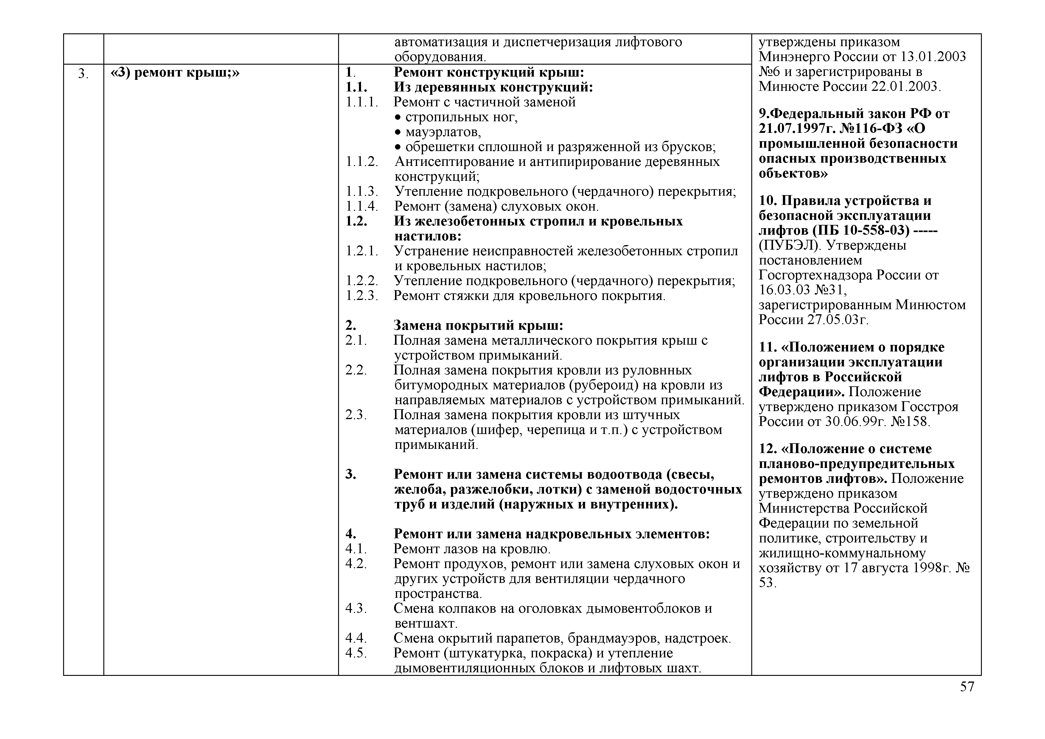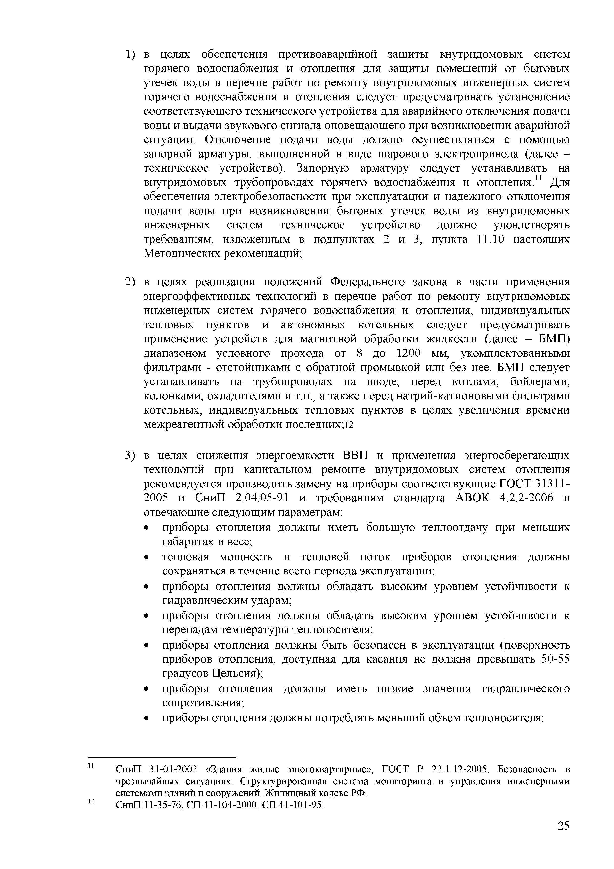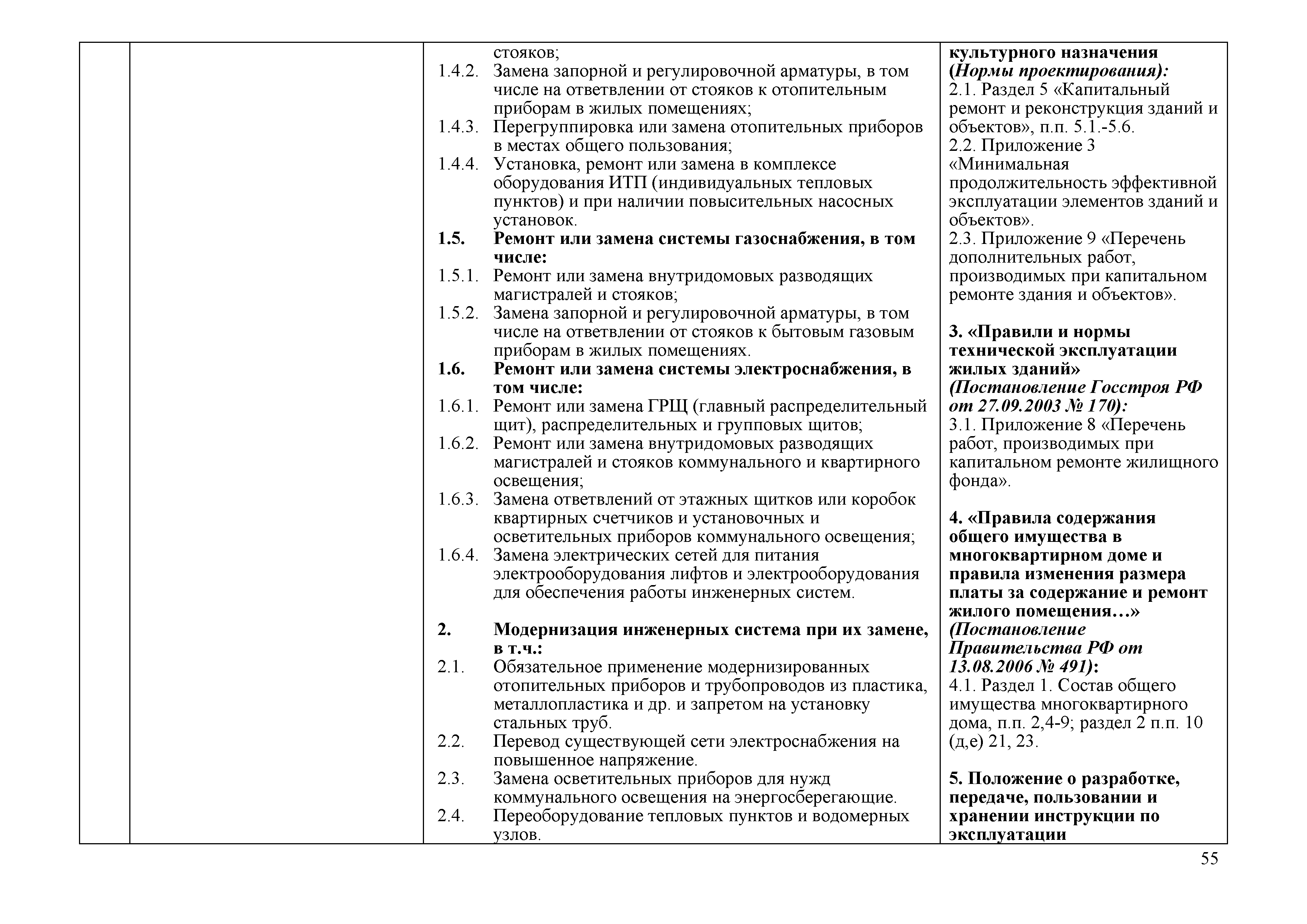 | | Нормативные ссылки: |   ВСН 42-85(р) «Правила приемки в эксплуатацию законченных капитальным ремонтом жилых зданий»  ВСН 53-86(р) «Правила оценки физического износа жилых зданий»  ВСН 57-88(р) «Положение по техническому обследованию жилых зданий»  ВСН 58-88(р) «Положение об организации и проведении реконструкции, ремонта и технического обслуживания зданий, объектов коммунального и социально-культурного назначения. Нормы проектирования»  ВСН 61-89(р) «Реконструкция и капитальный ремонт жилых домов. Нормы проектирования»  Федеральный закон 116-ФЗ «О промышленной безопасности опасных производственных объектов» ГЭСНр 2001 «Государственные элементные сметные нормы на ремонтно-строительные работы»  МДС 13-1.99 «Инструкция о составе, порядке разработки, согласования и утверждения проектно-сметной документации на капитальный ремонт жилых зданий»  Федеральный закон 28-ФЗ «Об энергосбережении»  МДС 81-25.2001 «Методические указания по определению величины сметной прибыли в строительстве» ГСНр 81-05-01-2001 «Сборник сметных норм и затрат на строительство временных зданий и сооружений при производстве ремонтно-строительных работ» ГСНр 81-05-02-2001 «Сборник сметных норм дополнительных затрат при производстве ремонтно-строительных работ в зимнее время»  ПБ 10-558-03 «Правила устройства и безопасной эксплуатации лифтов»  СНиП 31-01-2003 «Здания жилые многоквартирные»  СНиП 23-02-2003 «Тепловая защита зданий»  СНиП 41-03-2003 «Тепловая изоляция оборудования и трубопроводов»  СНиП 41-01-2003 «Отопление, вентиляция и кондиционирование»  МДС 81-33.2004 «Методические указания по определению величины накладных расходов в строительстве»  МДС 81-38.2004 «Указания по применению федеральных единичных расценок на ремонтно-строительные работы (ФЕРр-2001)»  МДС 81-35.2004 «Методика определения стоимости строительной продукции на территории Российской Федерации»  СП 31-107-2004 «Архитектурно-планировочные решения многоквартирных жилых зданий»  Федеральный закон 189-ФЗ «О введении в действие Жилищного кодекса Российской Федерации»  Федеральный закон 185-ФЗ «О Фонде содействия реформированию жилищно-коммунального хозяйства» Кодекс «Жилищный кодекс Российской Федерации»  ГОСТ Р 22.1.12-2005 «Безопасность в чрезвычайных ситуациях. Структурированная система мониторинга и управления инженерными системами зданий и сооружений. Общие требования» «Правила пользования жилыми помещениями»  ГОСТ 31311-2005 «Приборы отопительные. Общие технические условия»  МДС 13-21.2007 «Положение о признании помещения жилым помещением, жилого помещения непригодным для проживания, многоквартирного дома аварийным и подлежащим сносу или реконструкции, садового дома жилым домом и жилого дома садовым домом» «Правила содержания общего имущества в многоквартирном доме и Правила изменения размера платы за содержание жилого помещения в случае оказания услуг и выполнения работ по управлению, содержанию и ремонту общего имущества в многоквартирном доме ненадлежащего качества и (или) с перерывами, превышающими установленную продолжительность» «Положение о разработке, передаче, пользовании и хранении инструкции по эксплуатации многоквартирного дома»  ГОСТ Р 52749-2007 «Швы монтажные оконные с паропроницаемыми саморасширяющимися лентами. Технические условия»  «Положение о составе разделов проектной документации и требованиях к их содержани