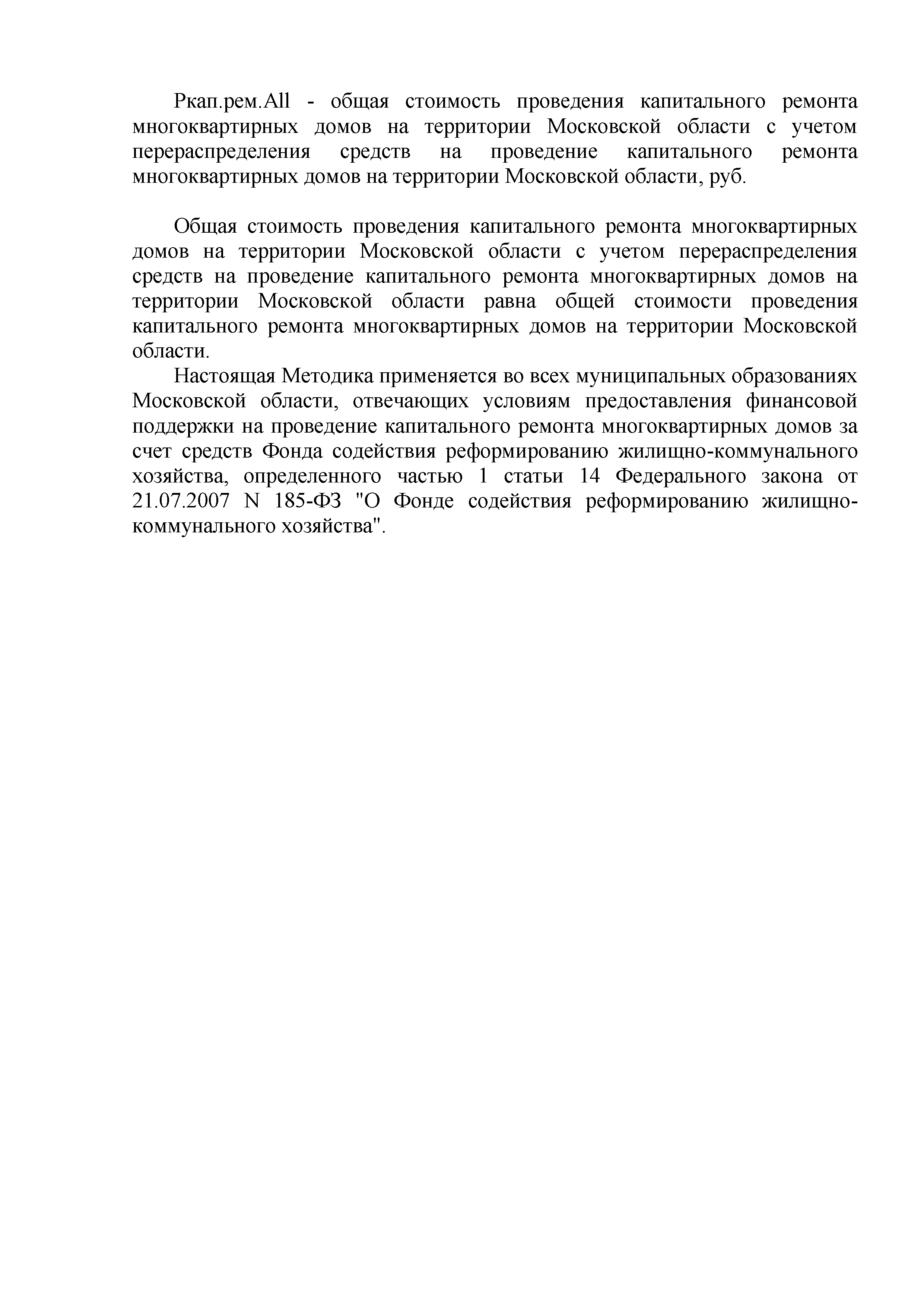 | Область применения: | Методика применяется во всех муниципальных образованиях Московской области, отвечающих условиям предоставления финансовой поддержки на проведение капитального ремонта многоквартирных домов за счет средств Фонда содействия реформированию жилищно-коммунального хозяйства |