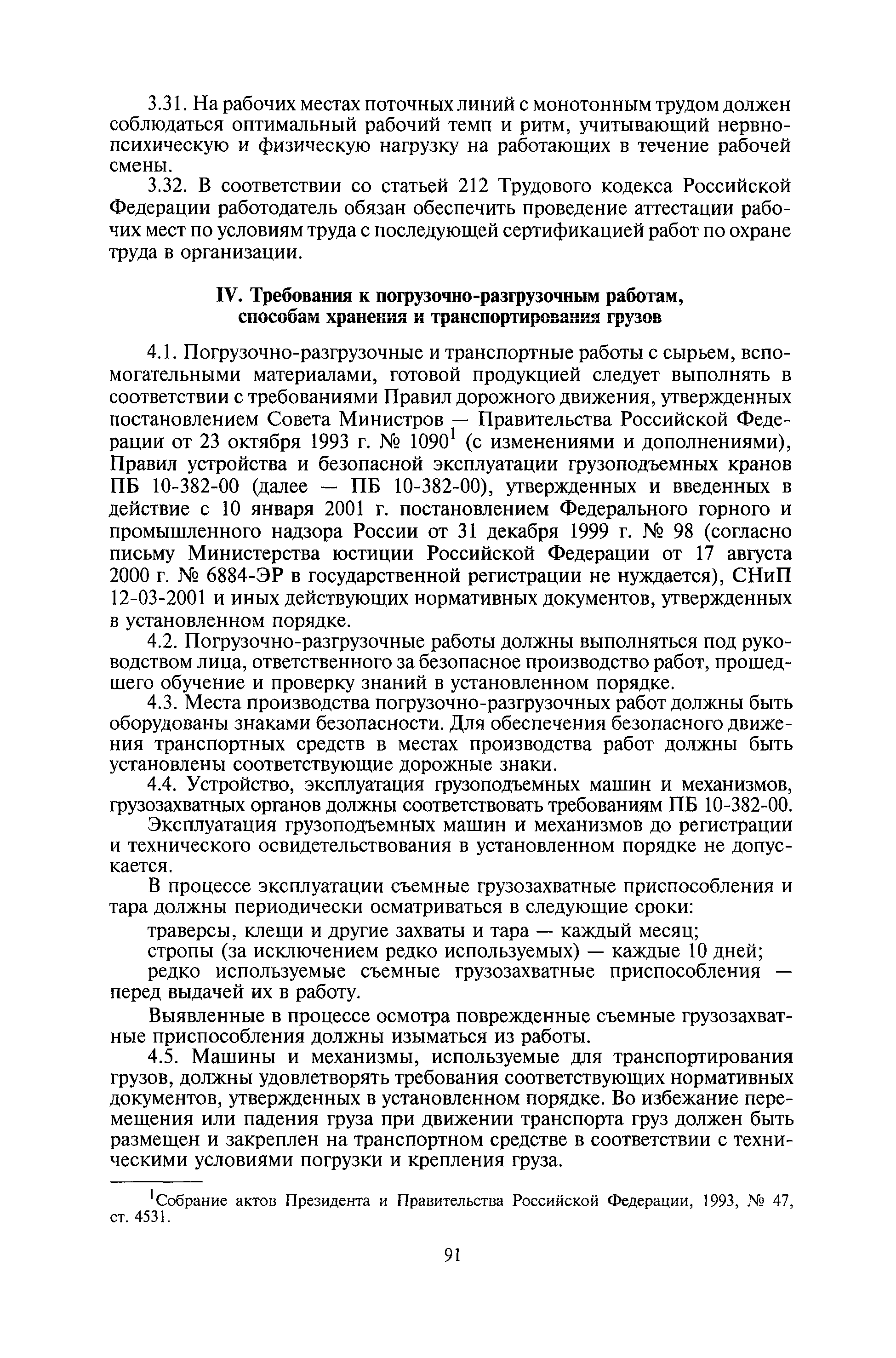| Оглавление: | I Общие требования II Требования к организации производственных (технологических) процессов III Требования к производственному оборудованию, его размещению и организации рабочих мест IV Требования к погрузочно-разгрузочным работам, способам хранения и транспортирования грузов Приложение 1. Нормы предельно допустимых нагрузок для женщин при подъеме и перемещении тяжестей вручную Приложение 2. Нормы предельно допустимых нагрузок для лиц моложе восемнадцати лет при подъеме и перемещении тяжестей вручную Приложение 3. Наряд-допуск на производство работ в местах действия опасных или вредных факторов |