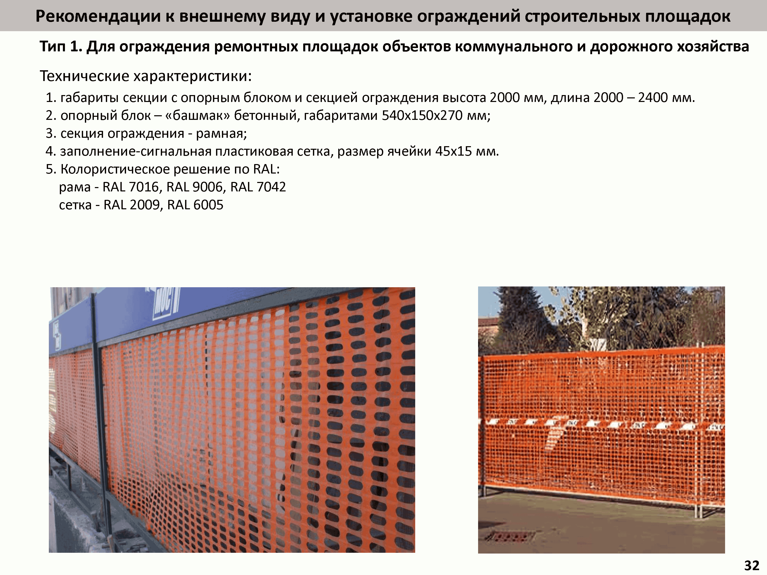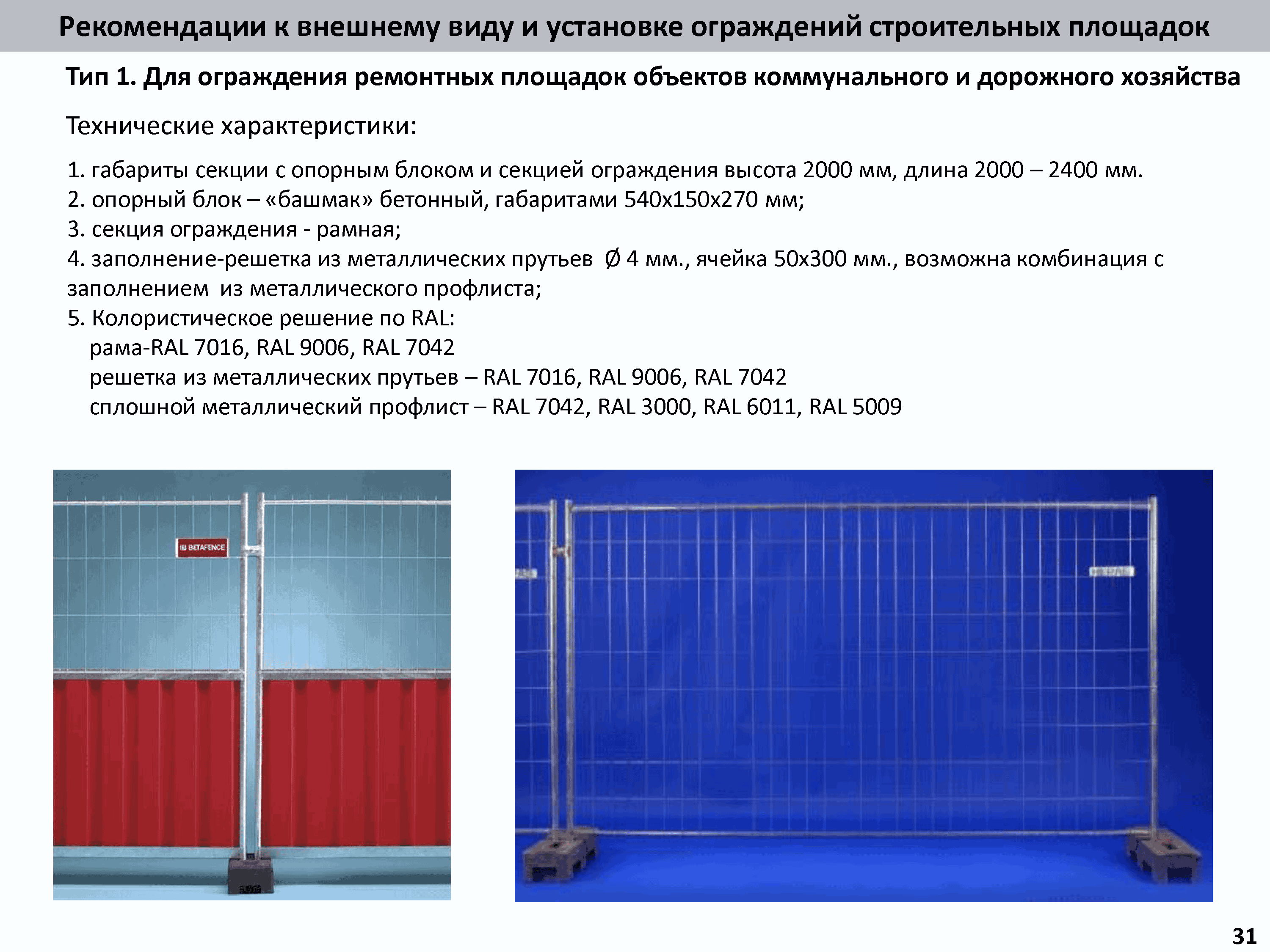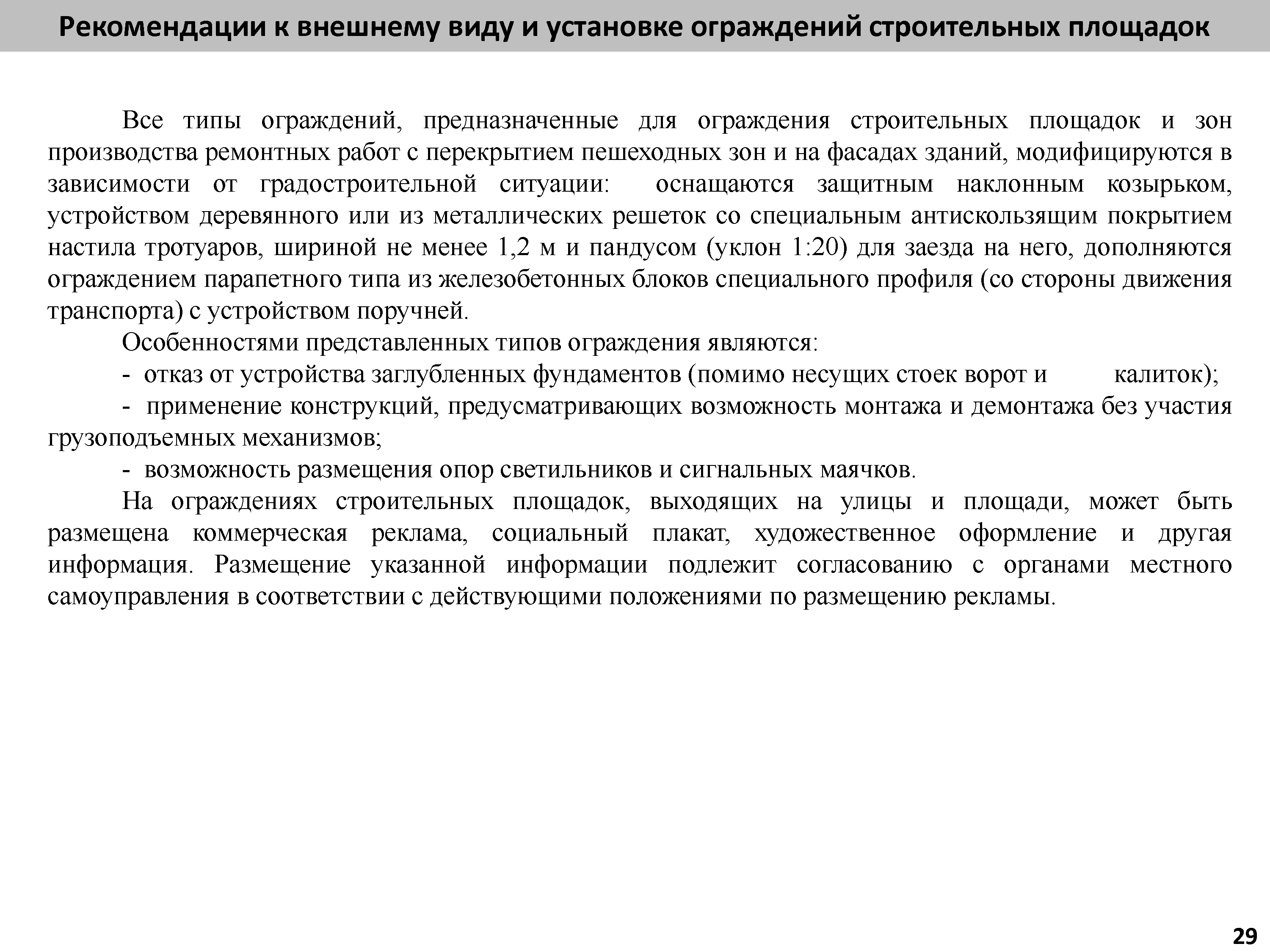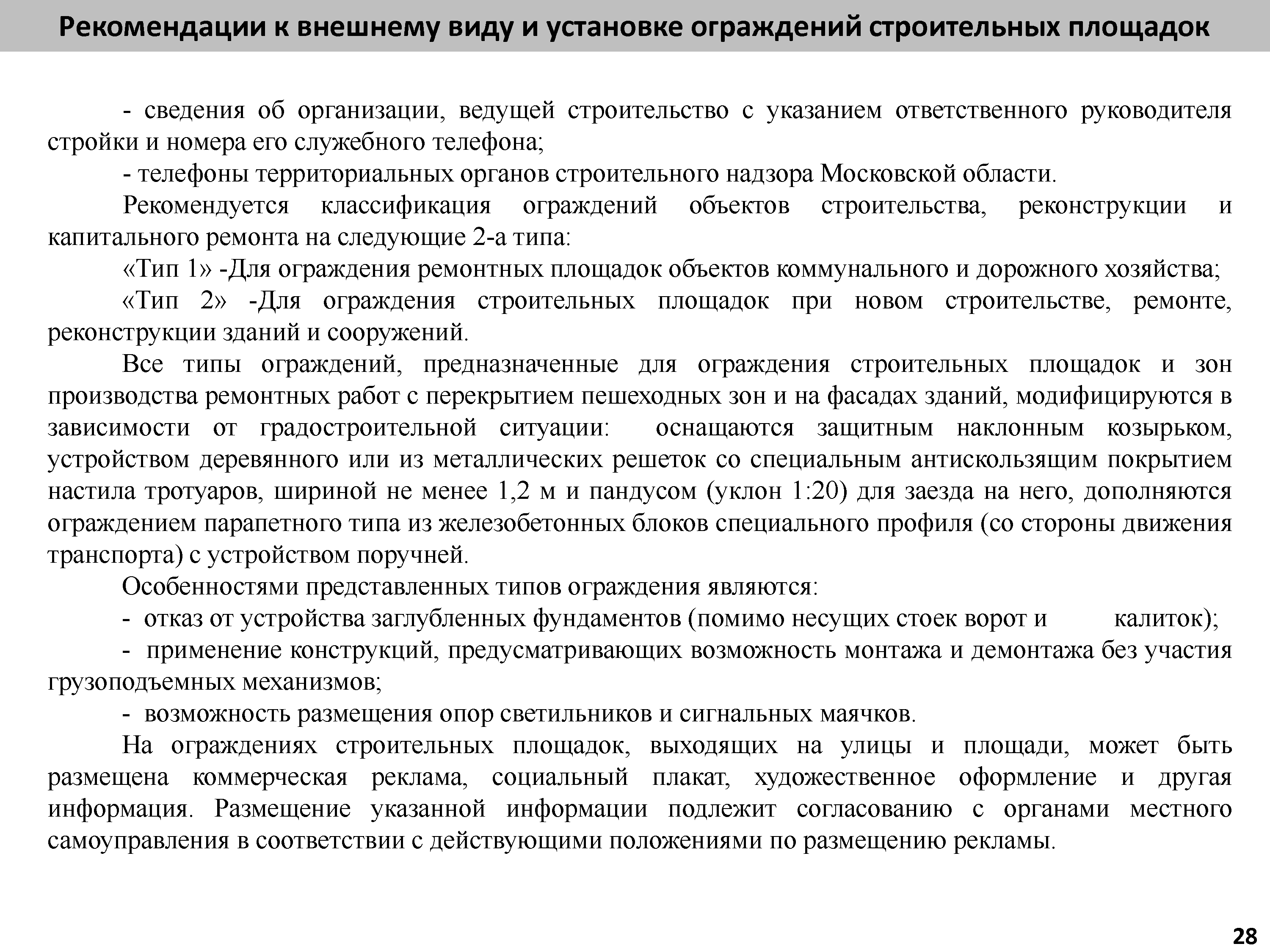 | Оглавление: | Раздел 1. Рекомендации к внешнему виду и установке ограждений территорий и объектов 1 Вводная часть 2 Общие рекомендации 3 Основные характеристики требований к внешнему виду оргаждений 4 Рекомендации по эксплуатации и содержанпию ограждений Раздел 2. Рекомендации к внешнему виду и установке ограждений строительных площадок 1 Вводная часть 2 Общие рекомендации Тип 1. Для ограждения ремонтных площадок объектов коммунального и дорожного хозяйства Тип 2. Для ограждения строительных площадок при новом строительстве, ремонте, реконструкции зданий и сооружений |