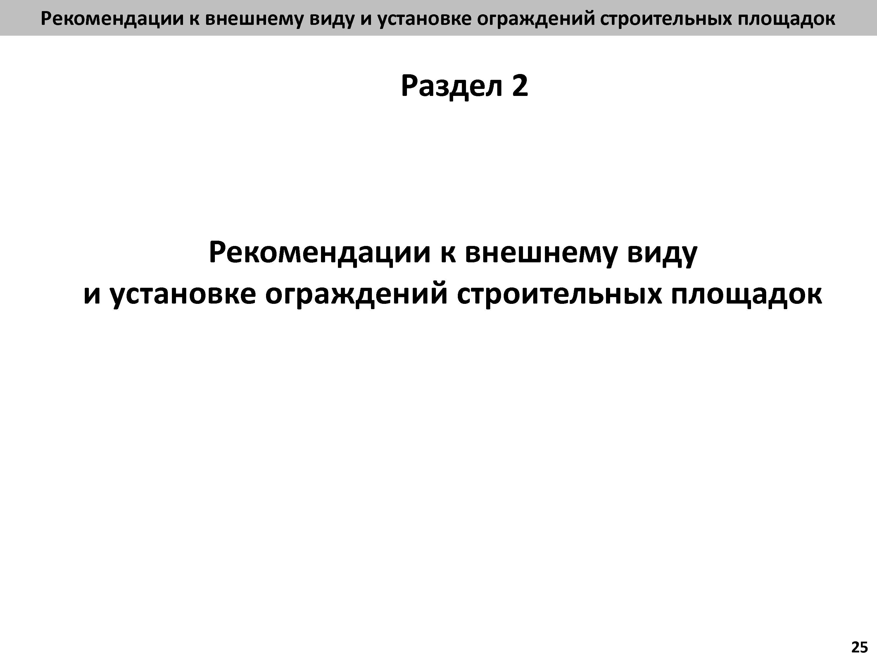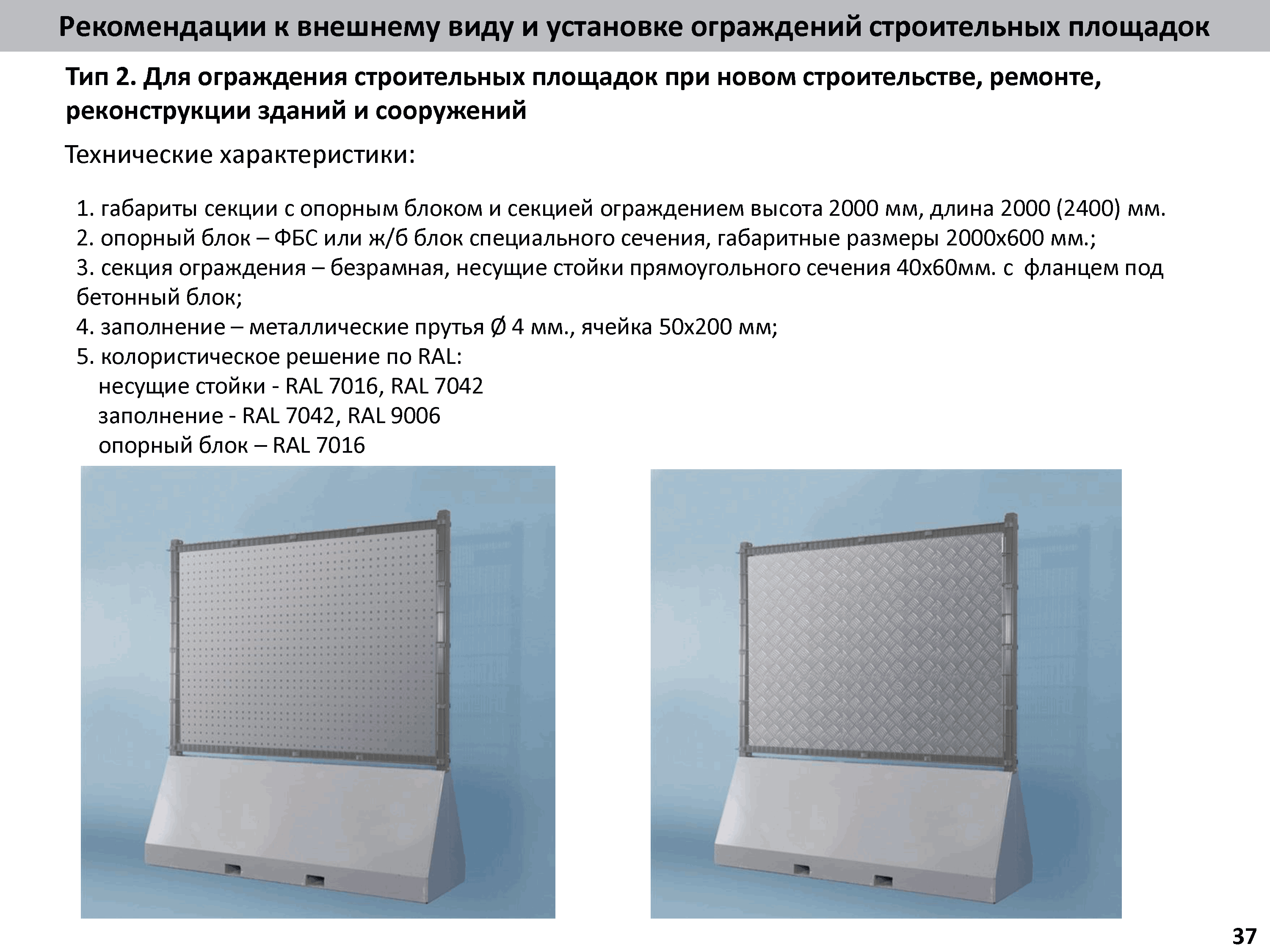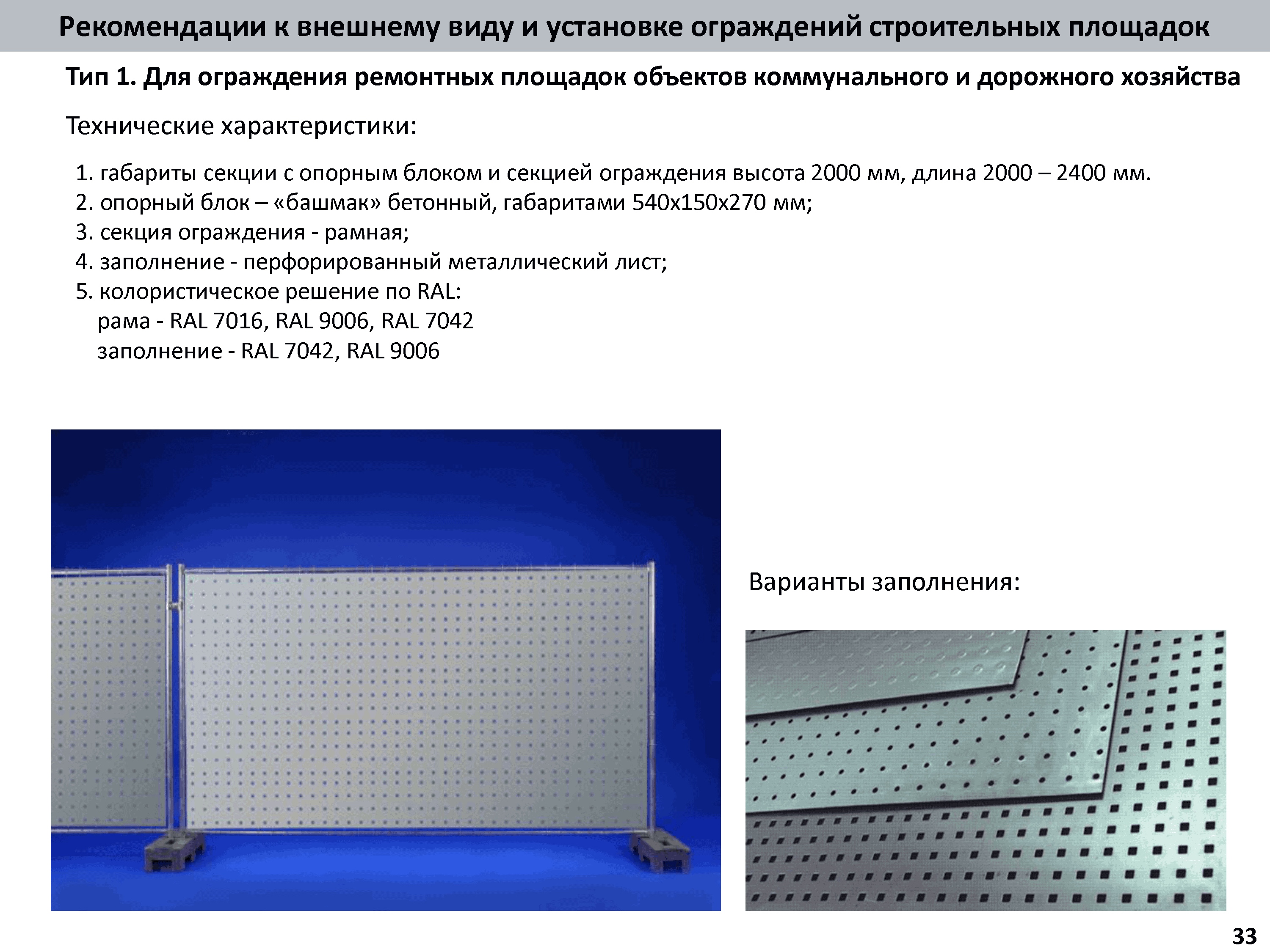 | Оглавление: | Раздел 1. Рекомендации к внешнему виду и установке ограждений территорий и объектов 1 Вводная часть 2 Общие рекомендации 3 Основные характеристики требований к внешнему виду оргаждений 4 Рекомендации по эксплуатации и содержанпию ограждений Раздел 2. Рекомендации к внешнему виду и установке ограждений строительных площадок 1 Вводная часть 2 Общие рекомендации Тип 1. Для ограждения ремонтных площадок объектов коммунального и дорожного хозяйства Тип 2. Для ограждения строительных площадок при новом строительстве, ремонте, реконструкции зданий и сооружений |
