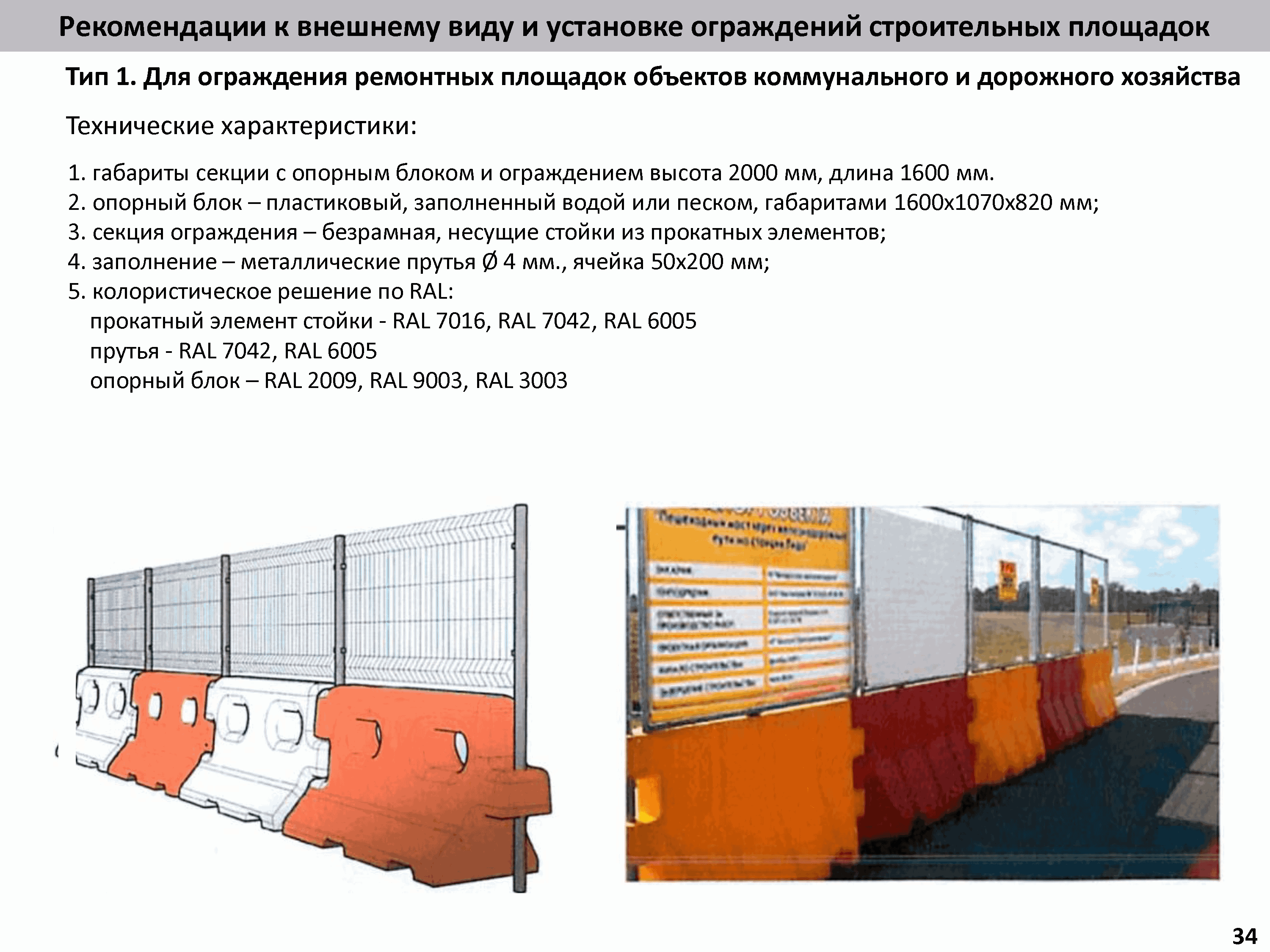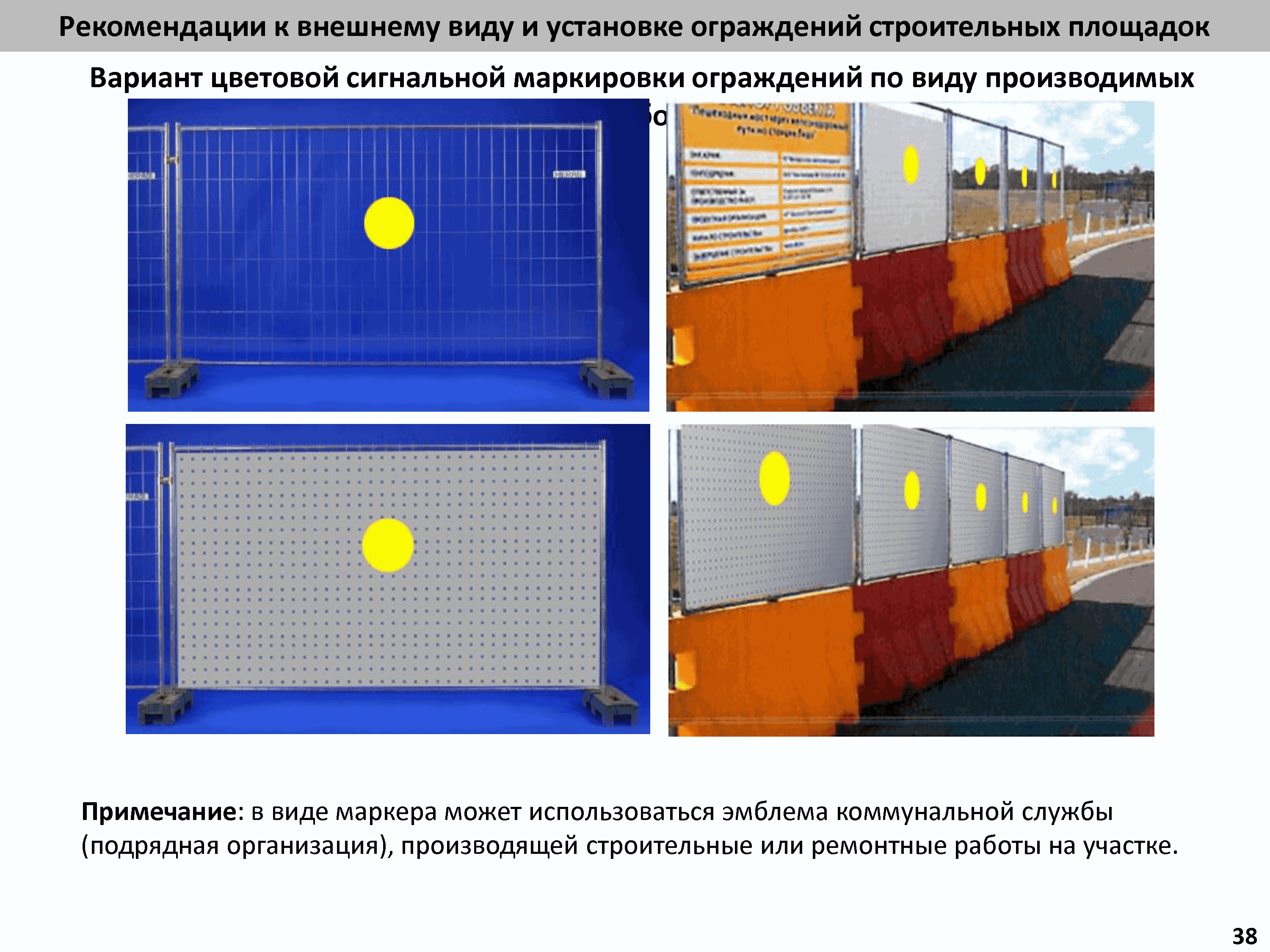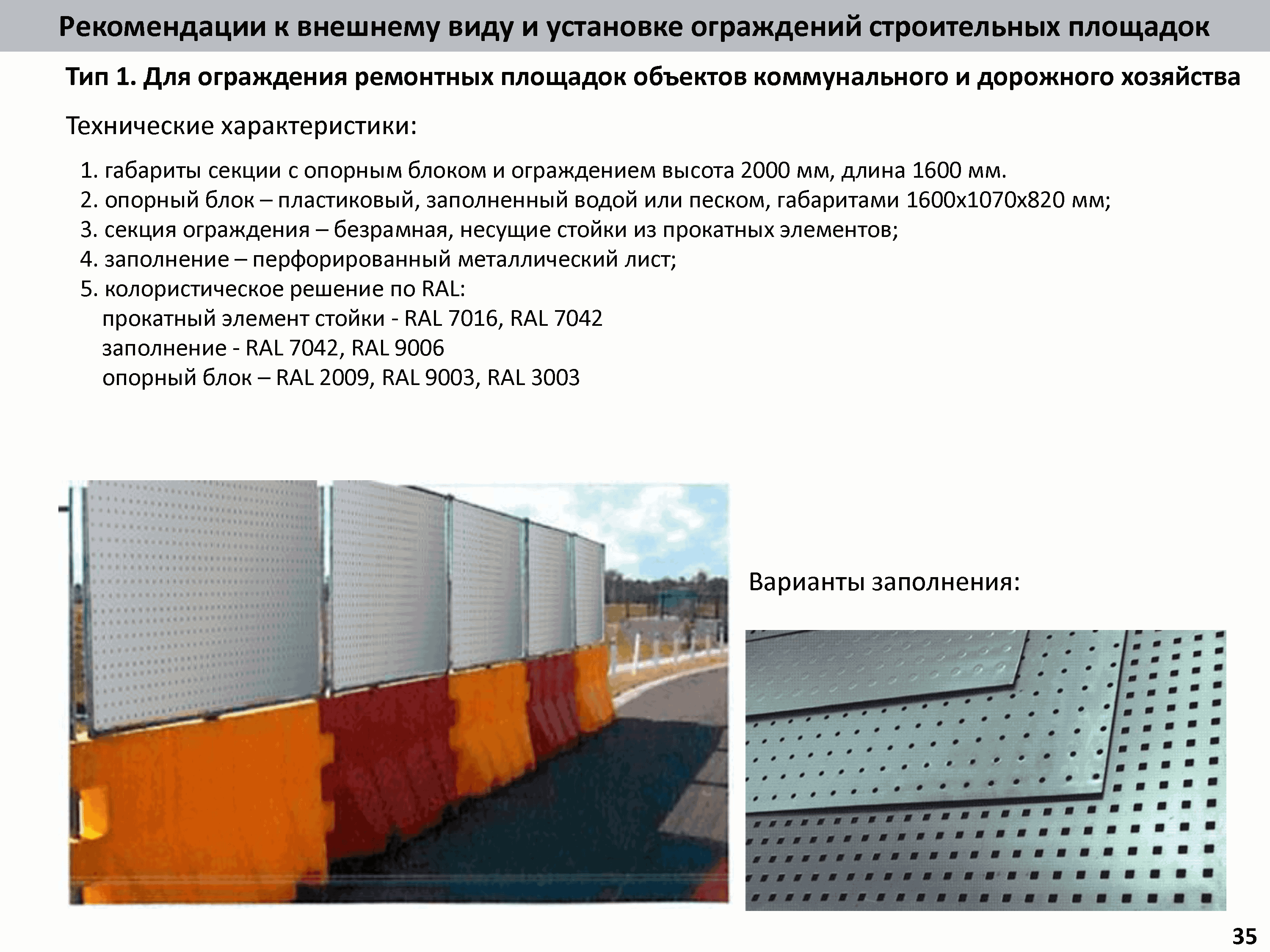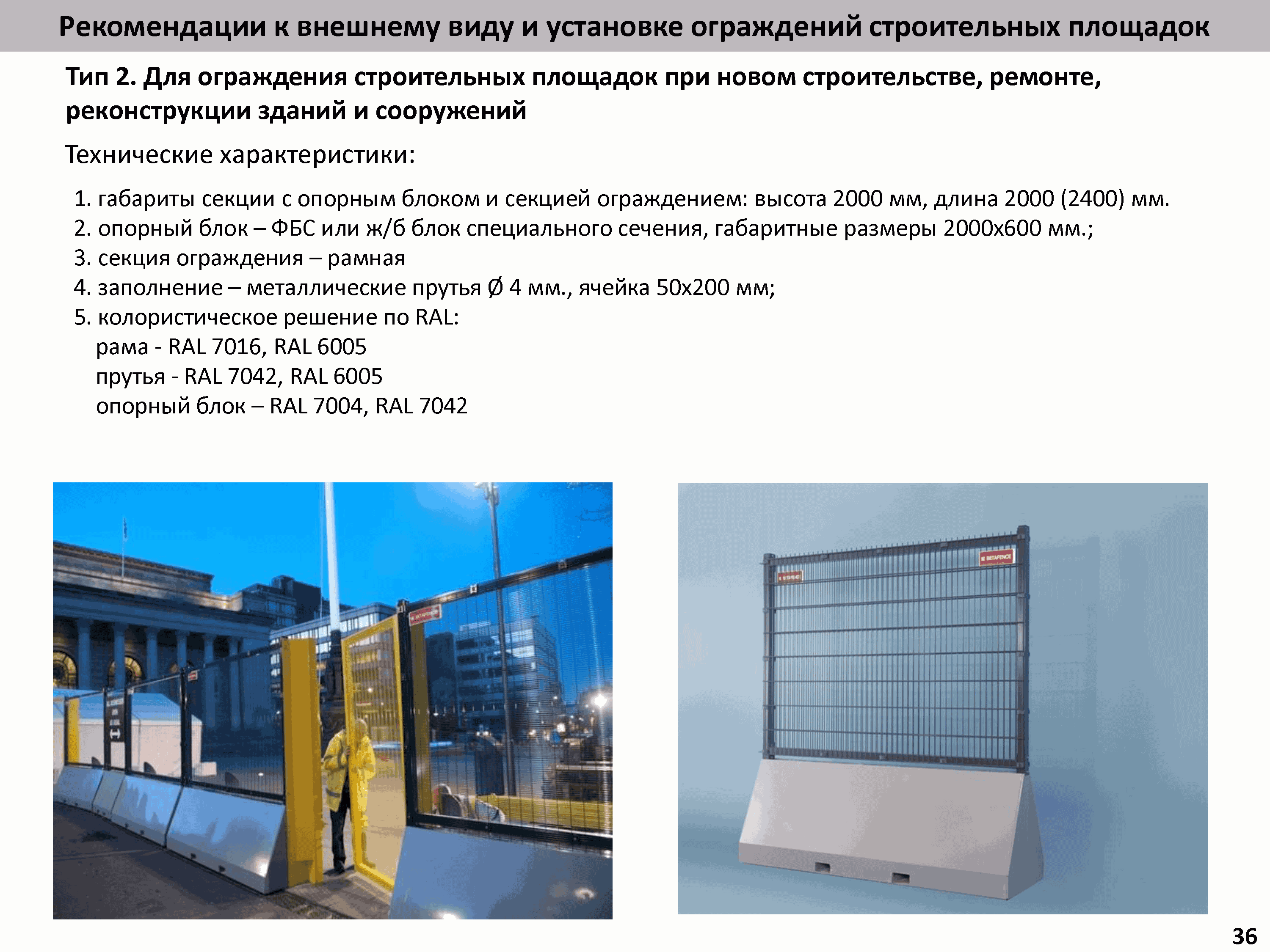| Оглавление: | Раздел 1. Рекомендации к внешнему виду и установке ограждений территорий и объектов 1 Вводная часть 2 Общие рекомендации 3 Основные характеристики требований к внешнему виду оргаждений 4 Рекомендации по эксплуатации и содержанпию ограждений Раздел 2. Рекомендации к внешнему виду и установке ограждений строительных площадок 1 Вводная часть 2 Общие рекомендации Тип 1. Для ограждения ремонтных площадок объектов коммунального и дорожного хозяйства Тип 2. Для ограждения строительных площадок при новом строительстве, ремонте, реконструкции зданий и сооружений |