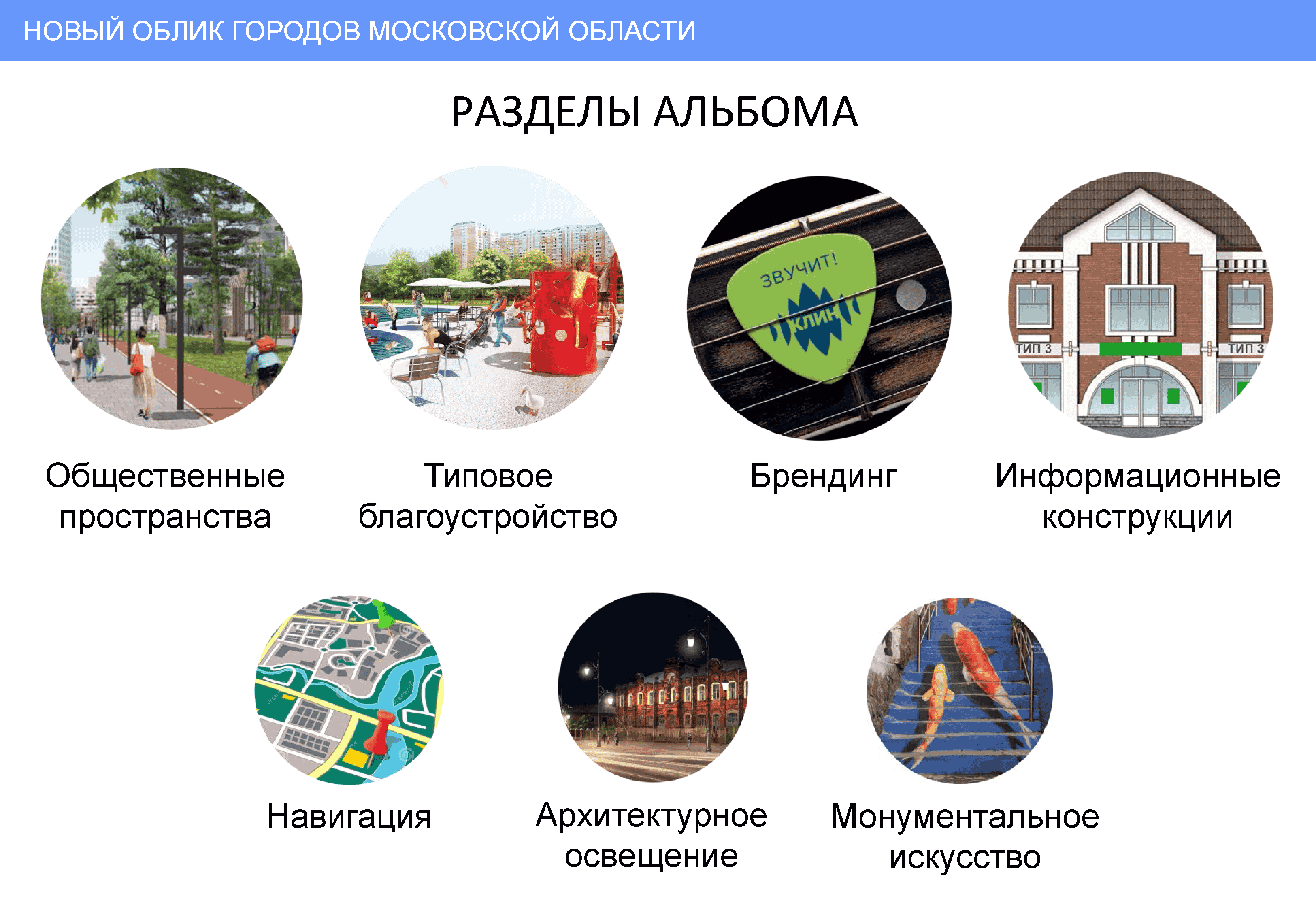 | Оглавление: | Общественные пространства Типовое благоустройство Брендинг Информационные конструкции Навигация Архитектурное освещение Монументальное искусство Примеры проектов из альбомов нового облика в реализации |