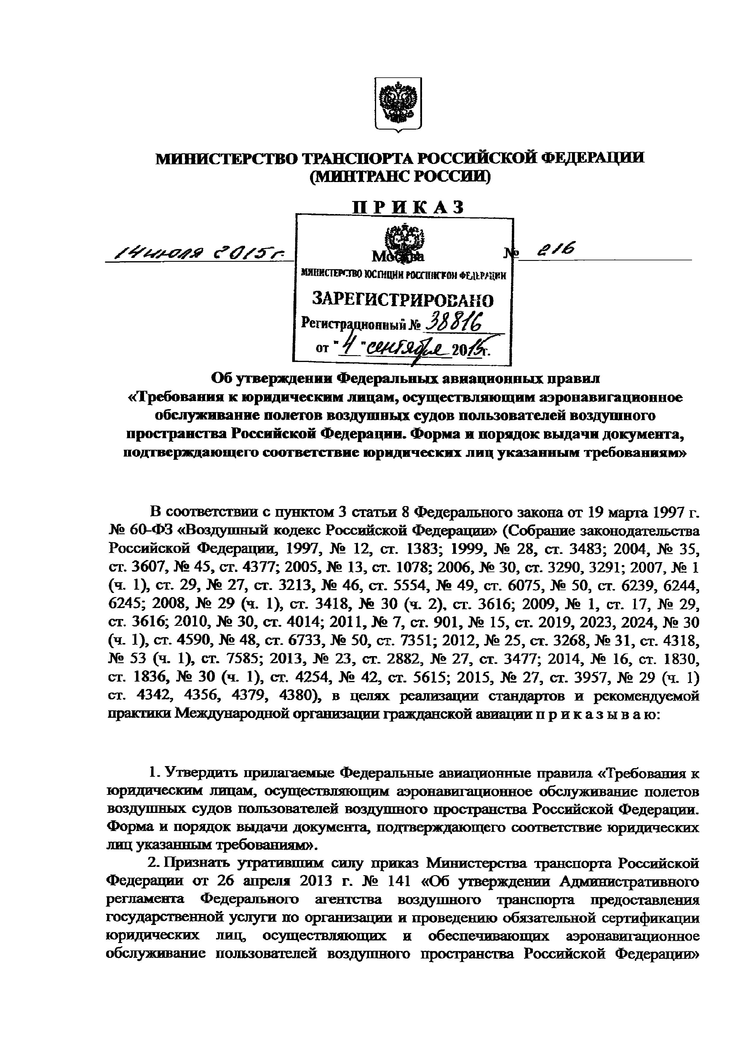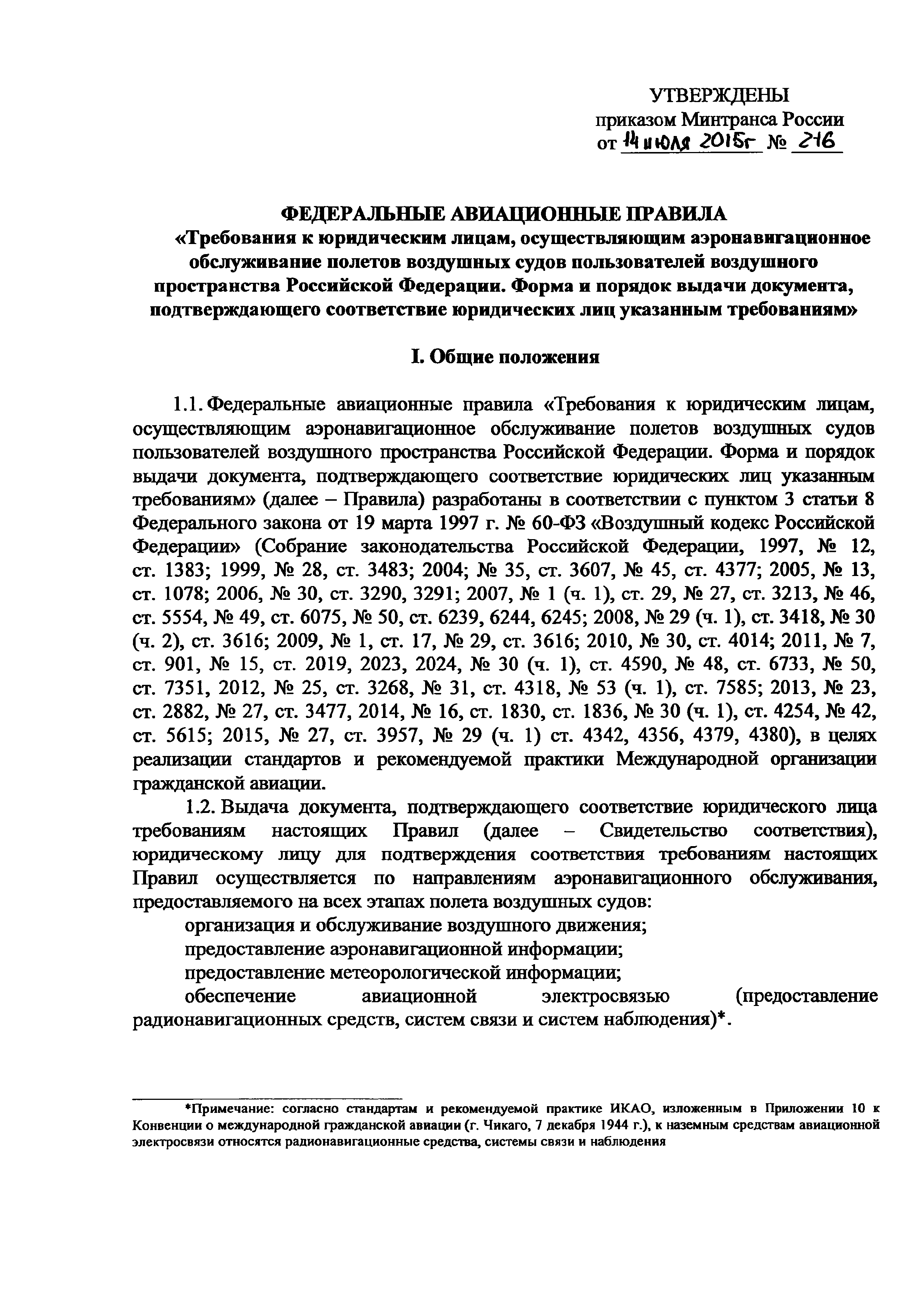 | Область применения: | Федеральные авиационные правила разработаны в соответствии с пунктом 3 статьи 8 Федерального закона от 19.03.1997 г. № 60-ФЗ "Воздушный кодекс Российской Федерации", в целях реализации стандартов и рекомендуемой практики Международной организации гражданской авиации |