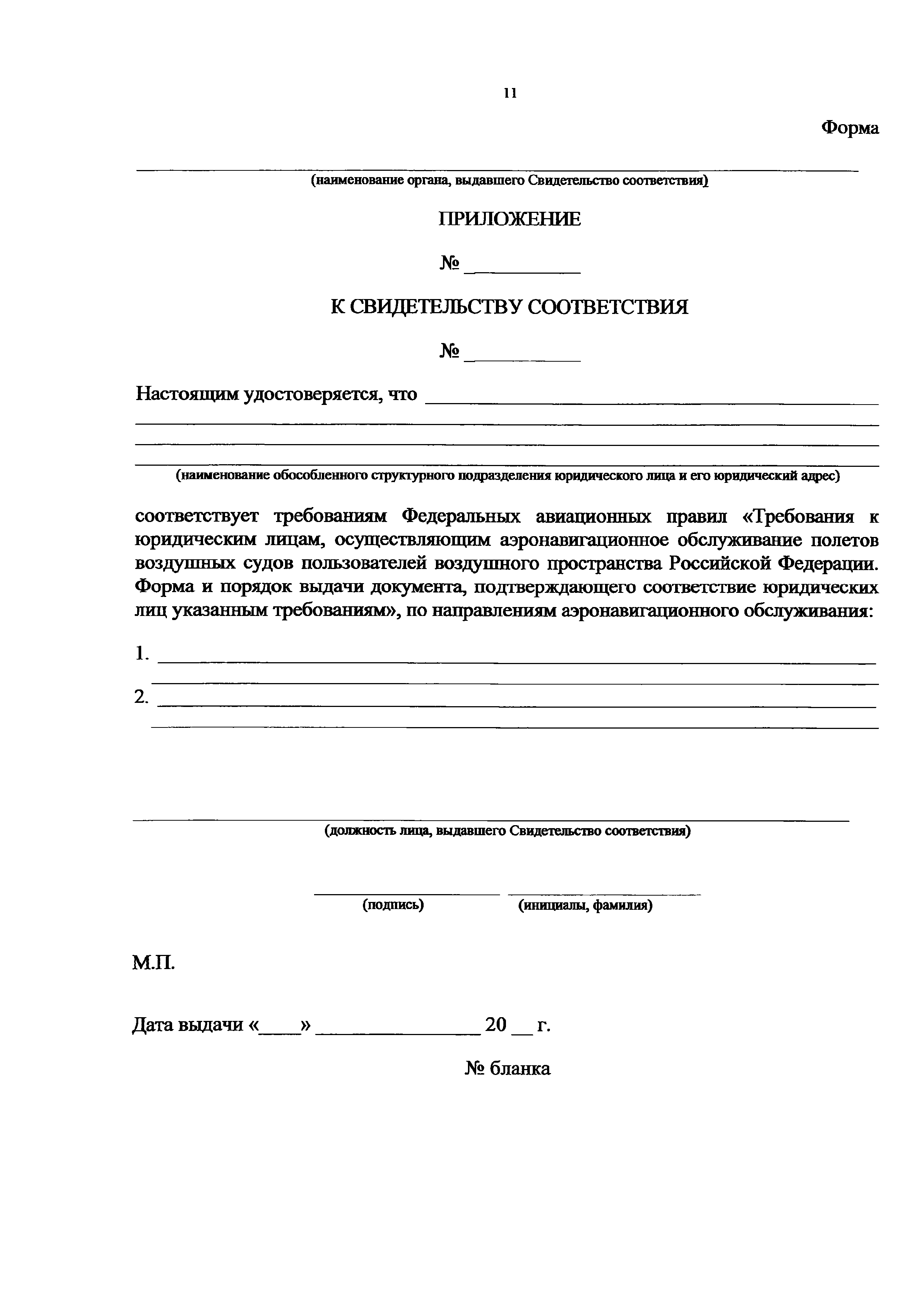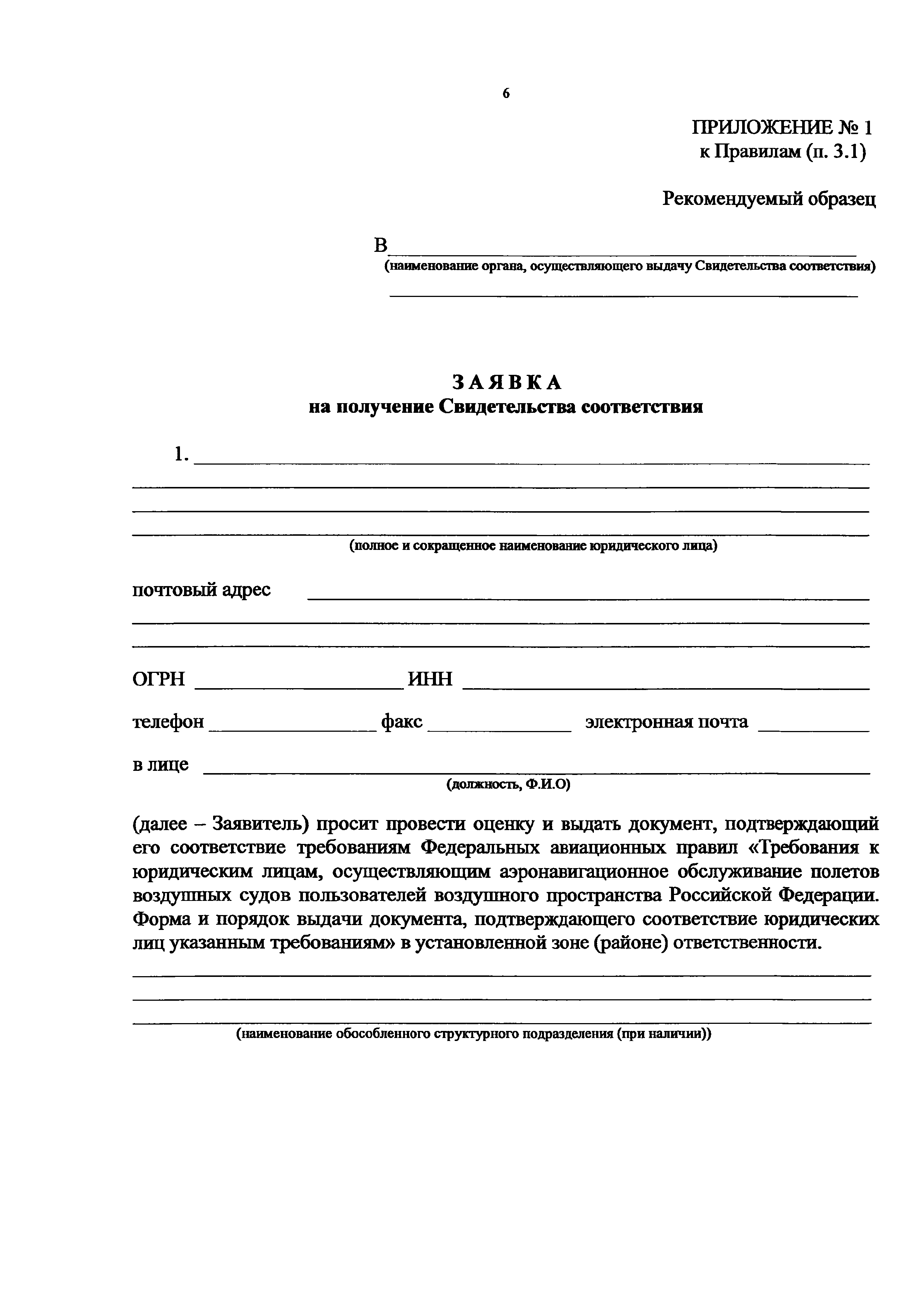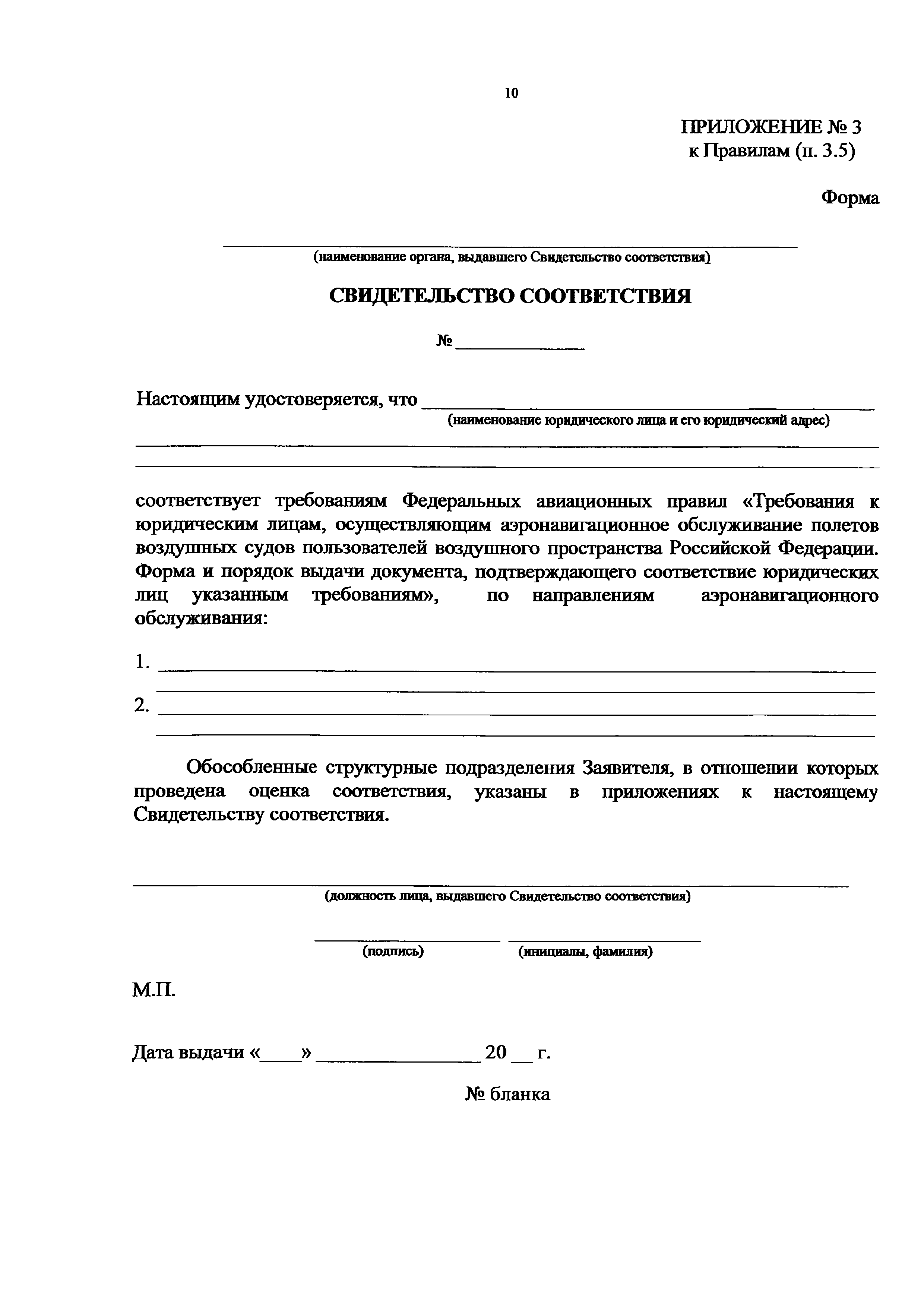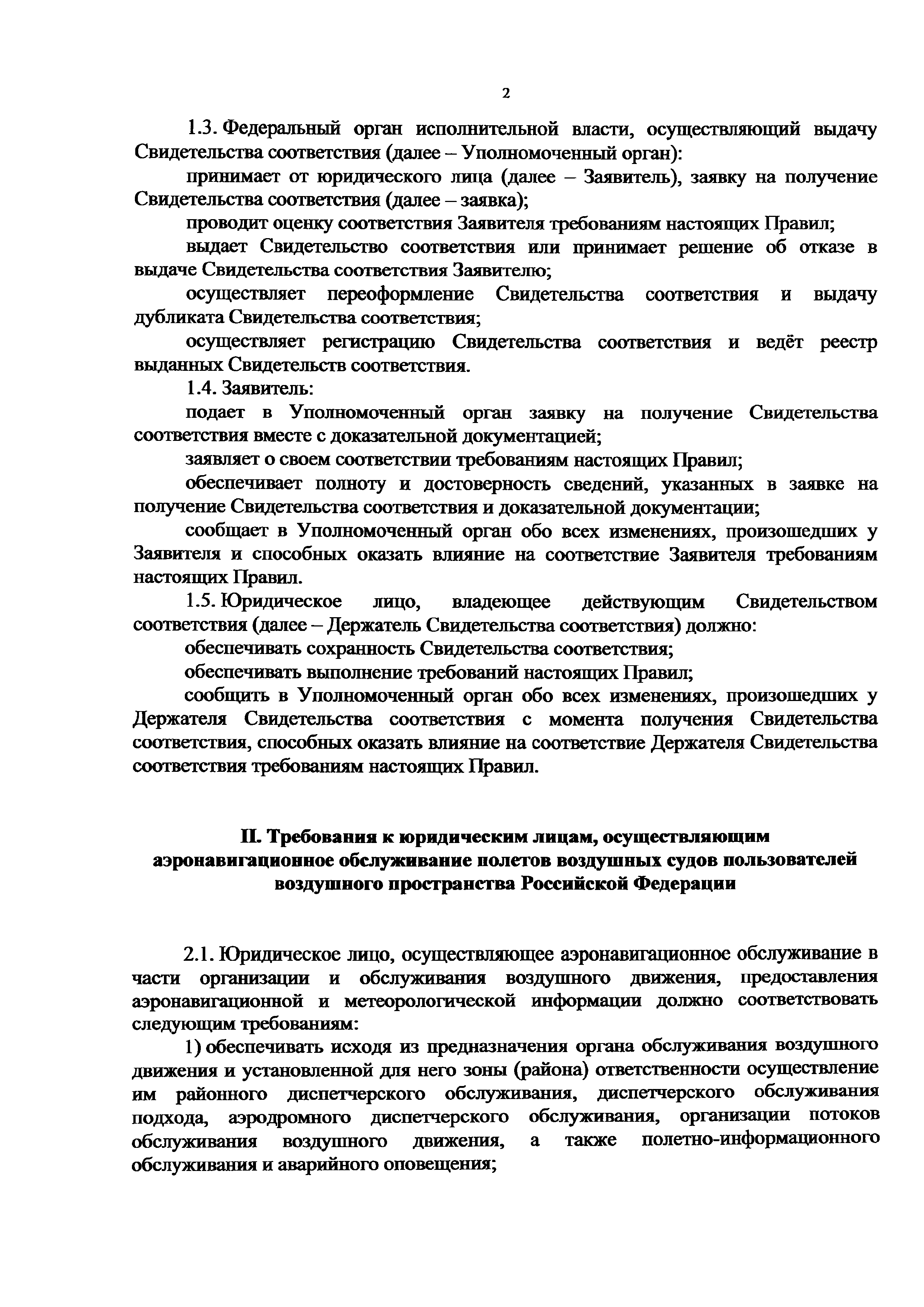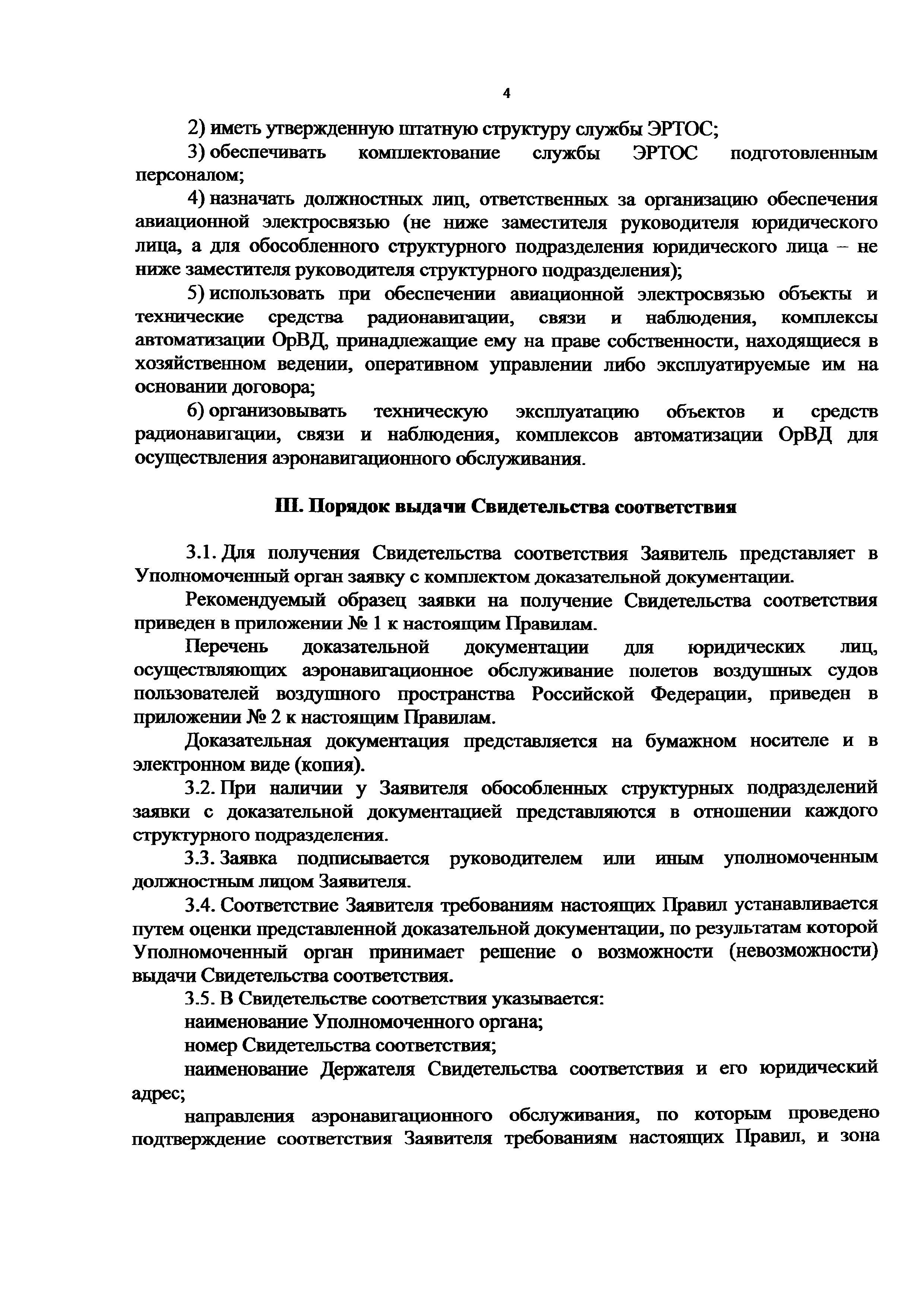 | Оглавление: | I. Общие положения II. Требования к юридическим лицам и их обособленным подразделениям, осуществляющим аэронавигационное обслуживание полетов воздушных судов пользователей воздушного пространства Российской Федерации III. Порядок выдачи Свидетельства соответствия Приложение № 1 Приложение № 2 Приложение № 3 |