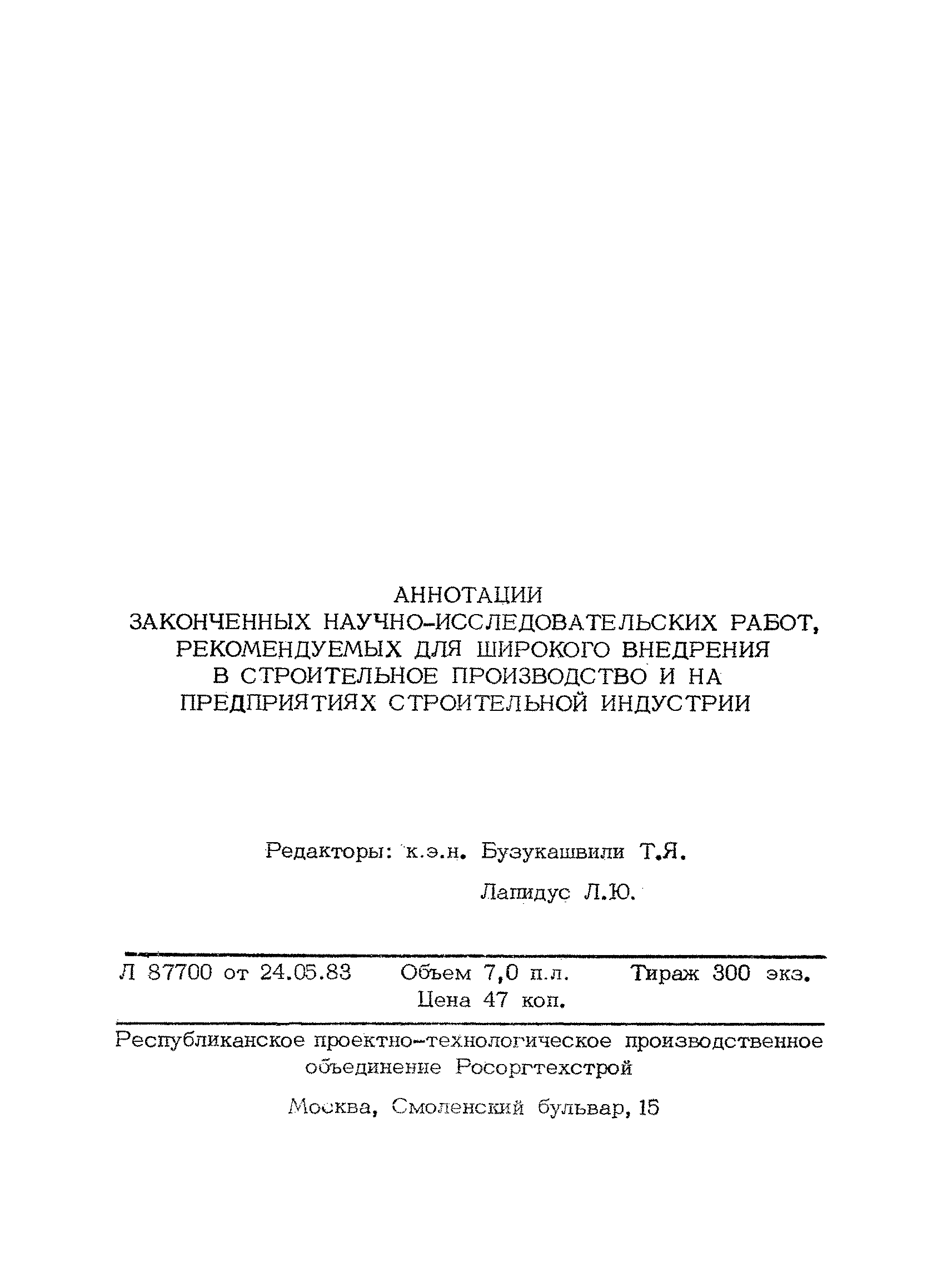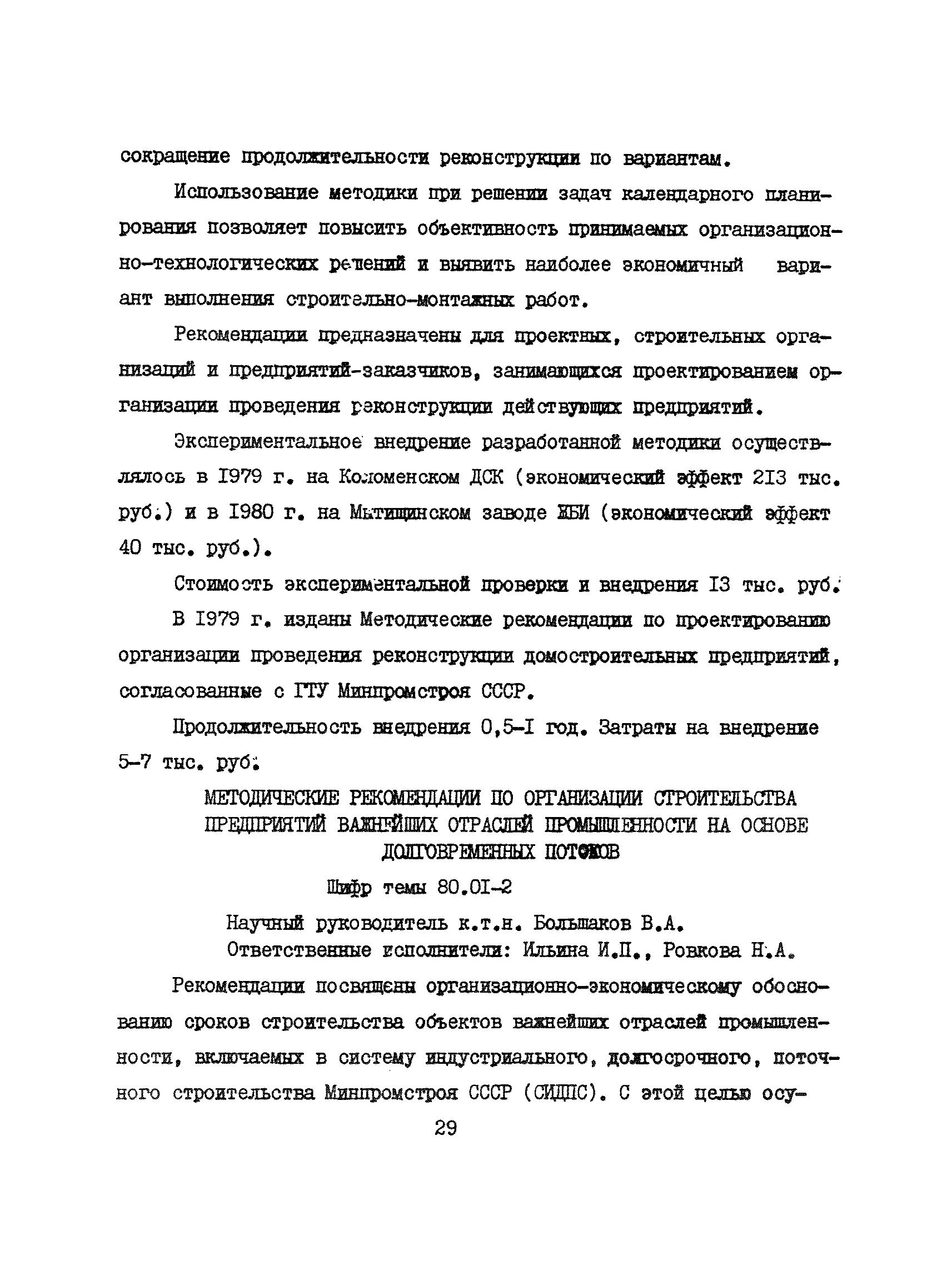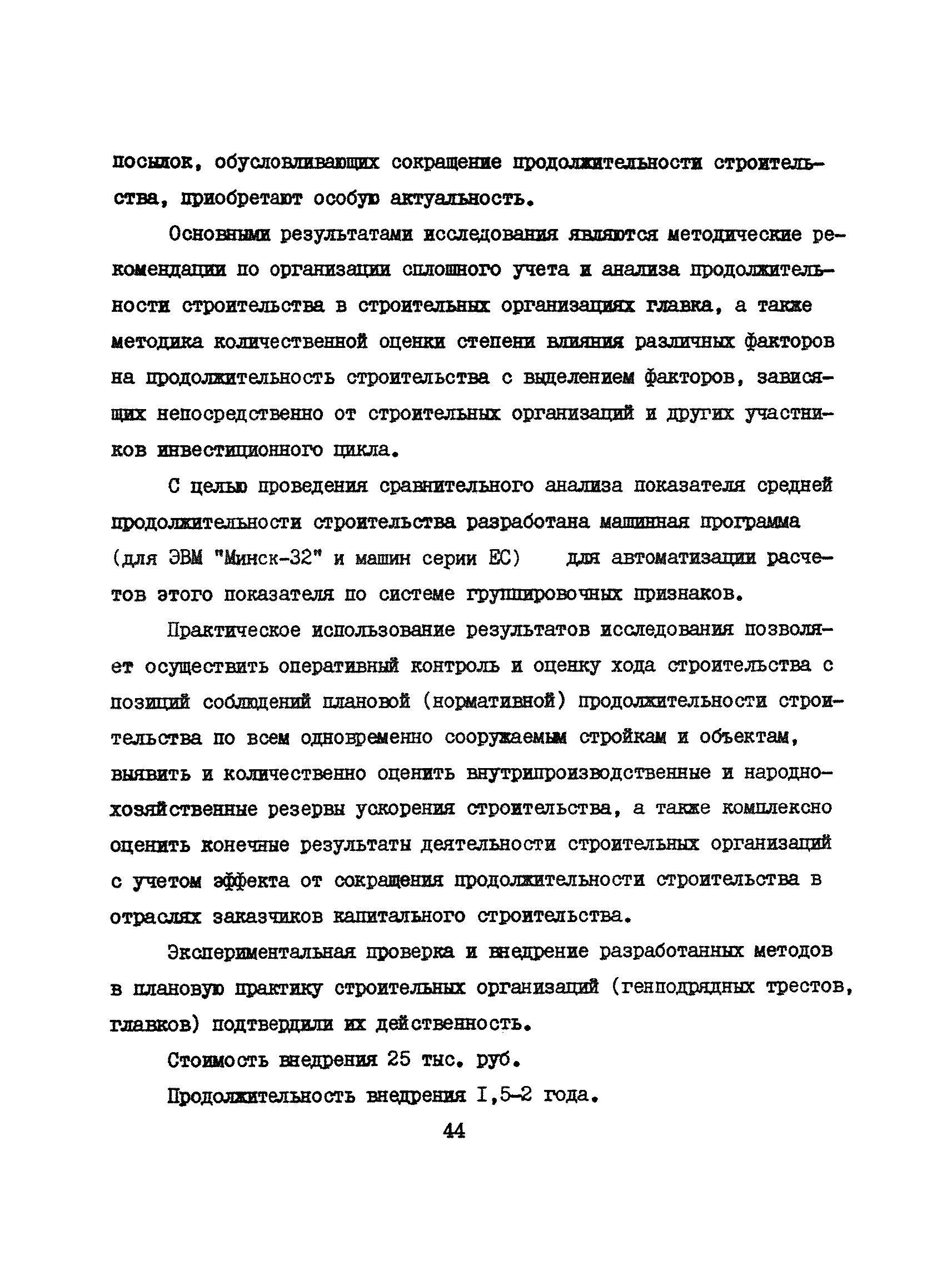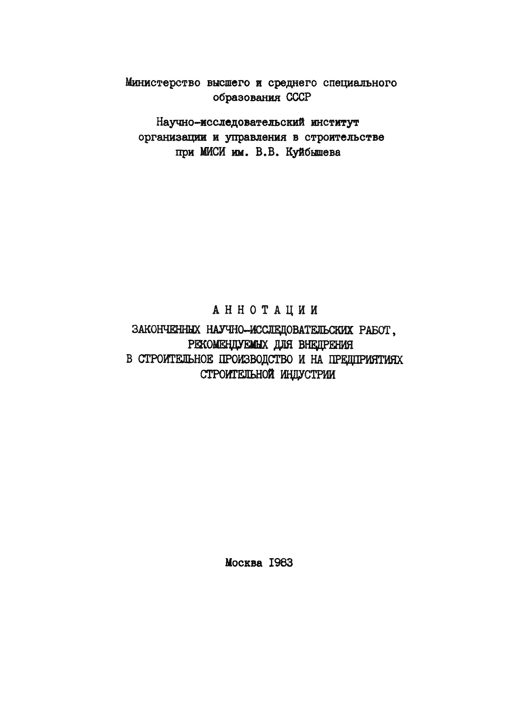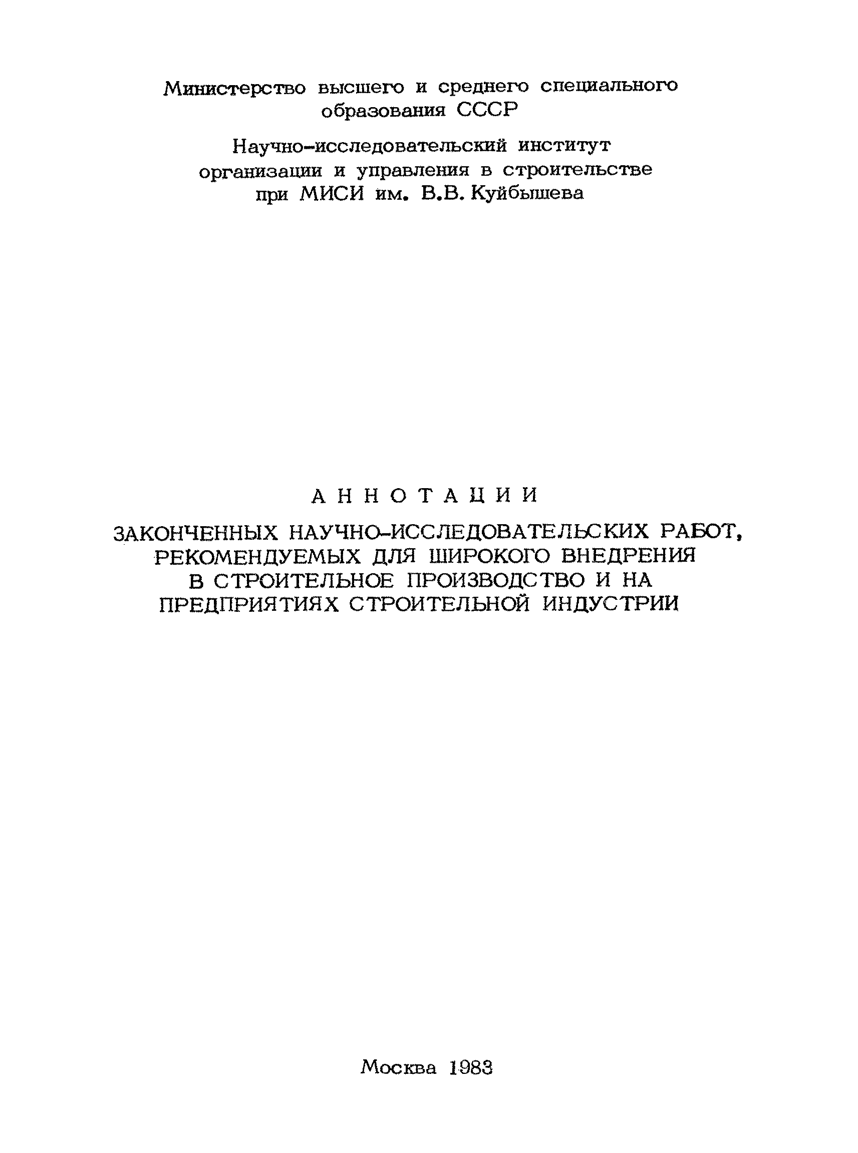 Аннотации законченных научно-исследовательских работ, рекомендуемых для широкого внедрения в строительное производство и на предприятиях строительной индустрии| Статус: | справочные материалы, мп, тпр | | Название рус.: | Аннотации законченных научно-исследовательских работ, рекомендуемых для широкого внедрения в строительное производство и на предприятиях строительной индустрии | | Дата добавления в базу: | 12.02.2016 | | Дата актуализации: | 01.01.2021 | | Область применения: | Аннотации предназначены для инженерно-технических работников строительных министерств и ведомств, строительно-монтажных организаций, оргтехстроев и предприятий строительной индустрии. | | Оглавление: | I. Управление строительными организациями и предприятиями производственной базы строительства II. Совершенствование организации строительного производства III. Планирование и анализ производственно-хозяйственной и финансовой деятельности в строительных организациях и на предприятиях производственной базы строительства IV. Совершенствование качества строительства и строительных конструкций и деталей V. определение потребности и планирование комплектных поставок строительных деталей и конструкций VI. Социальные факторы повышения эффективности деятельности строительных и обслуживающих строительство организаций и предприятий производственной базы | | Разработан: | МИСИ им. В.В. Куйбышева