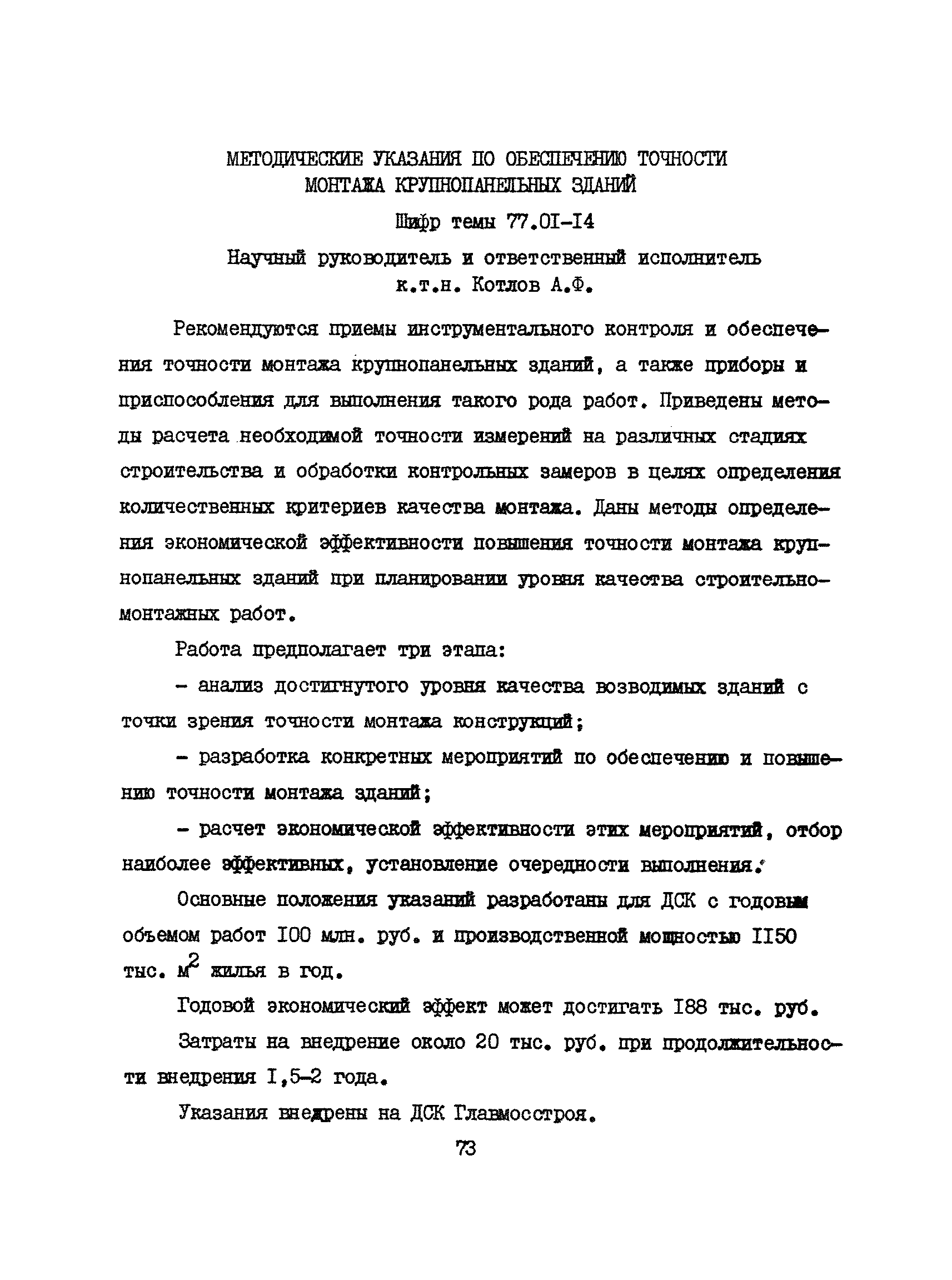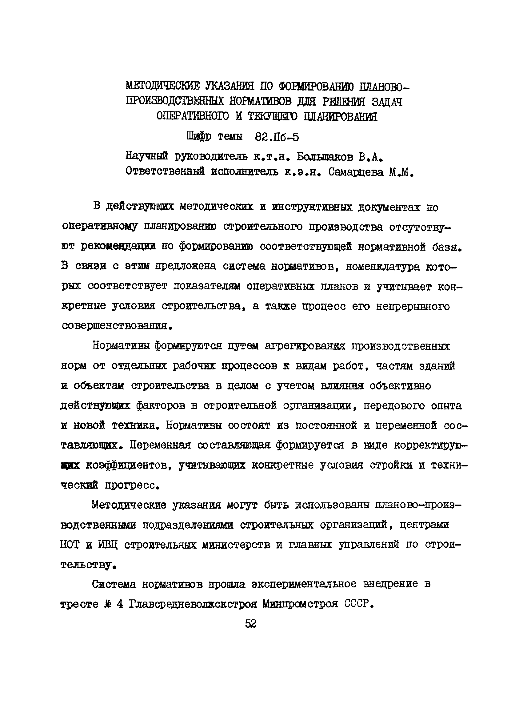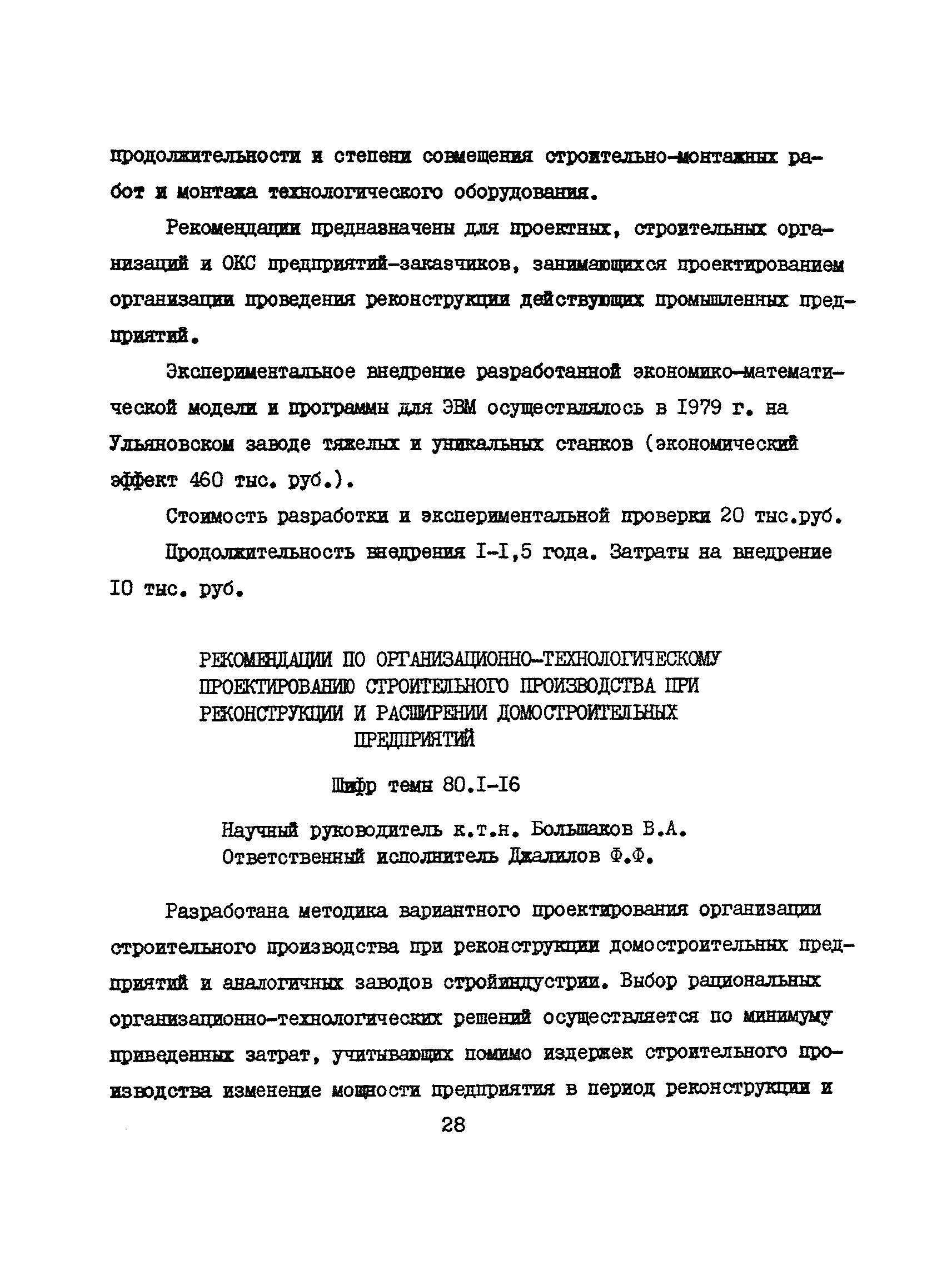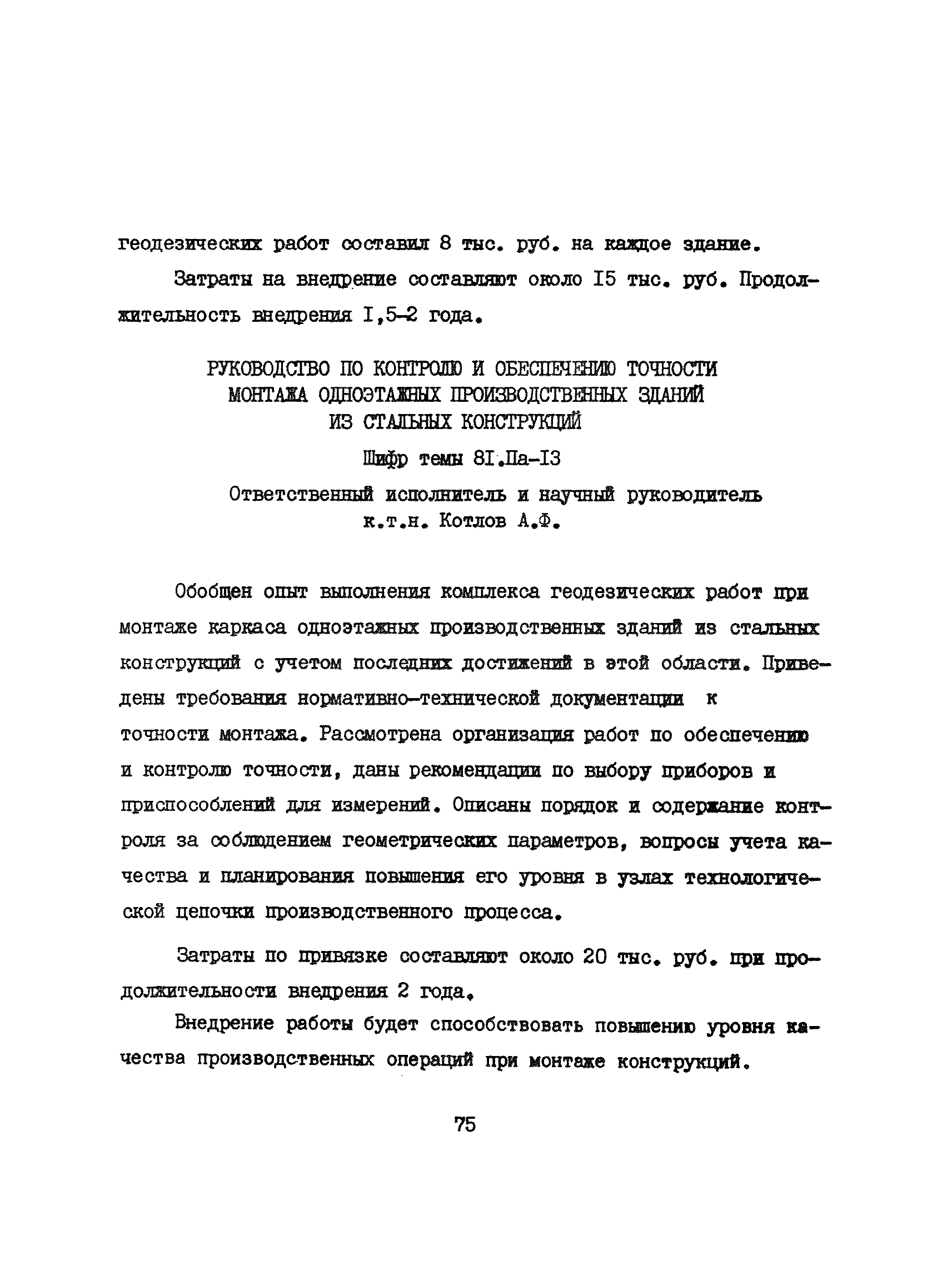 Аннотации законченных научно-исследовательских работ, рекомендуемых для широкого внедрения в строительное производство и на предприятиях строительной индустрии| Статус: | справочные материалы, мп, тпр | | Название рус.: | Аннотации законченных научно-исследовательских работ, рекомендуемых для широкого внедрения в строительное производство и на предприятиях строительной индустрии | | Дата добавления в базу: | 12.02.2016 | | Дата актуализации: | 01.01.2021 | | Область применения: | Аннотации предназначены для инженерно-технических работников строительных министерств и ведомств, строительно-монтажных организаций, оргтехстроев и предприятий строительной индустрии. | | Оглавление: | I. Управление строительными организациями и предприятиями производственной базы строительства II. Совершенствование организации строительного производства III. Планирование и анализ производственно-хозяйственной и финансовой деятельности в строительных организациях и на предприятиях производственной базы строительства IV. Совершенствование качества строительства и строительных конструкций и деталей V. определение потребности и планирование комплектных поставок строительных деталей и конструкций VI. Социальные факторы повышения эффективности деятельности строительных и обслуживающих строительство организаций и предприятий производственной базы | | Разработан: | МИСИ им. В.В. Куйбышева