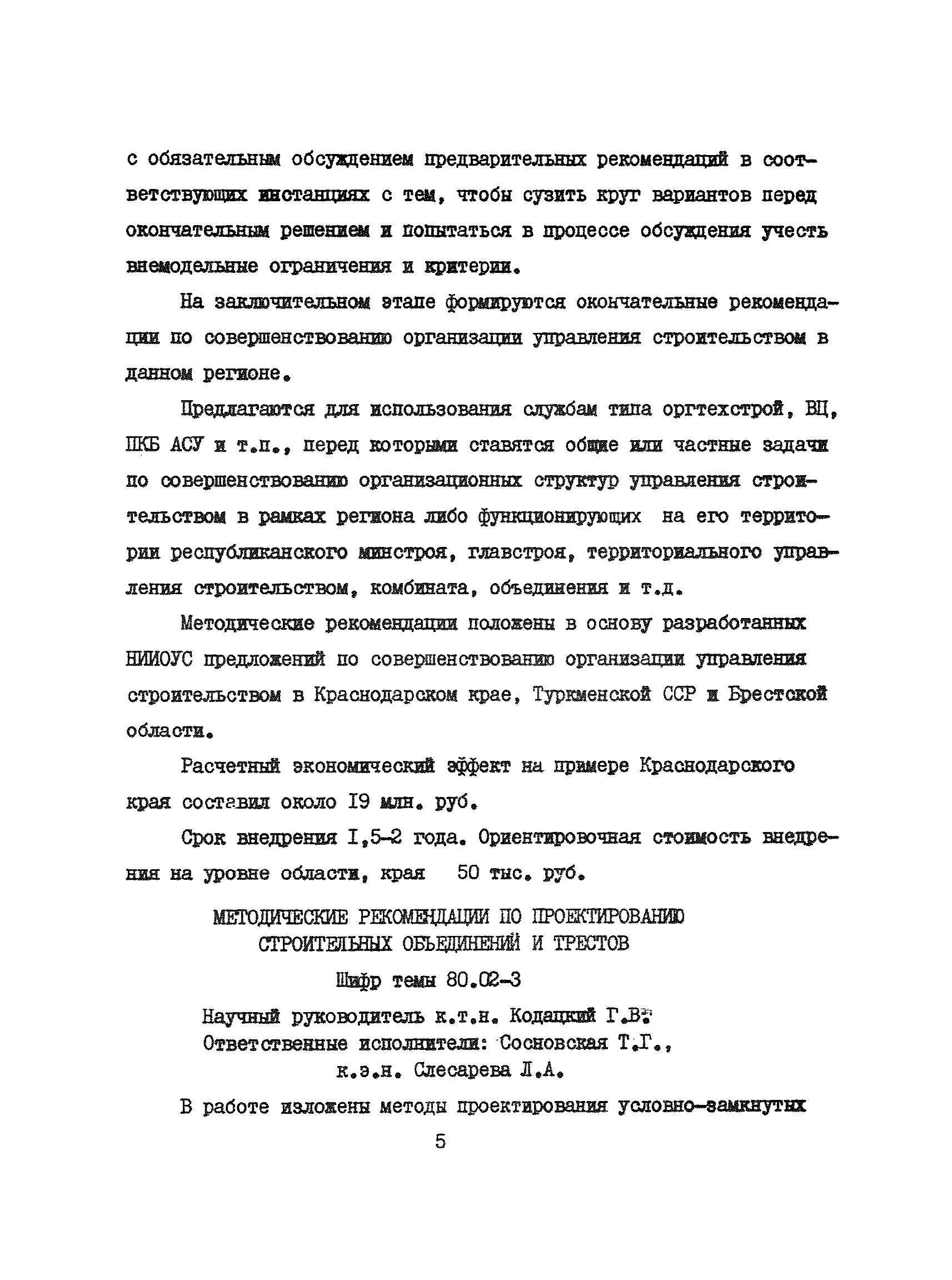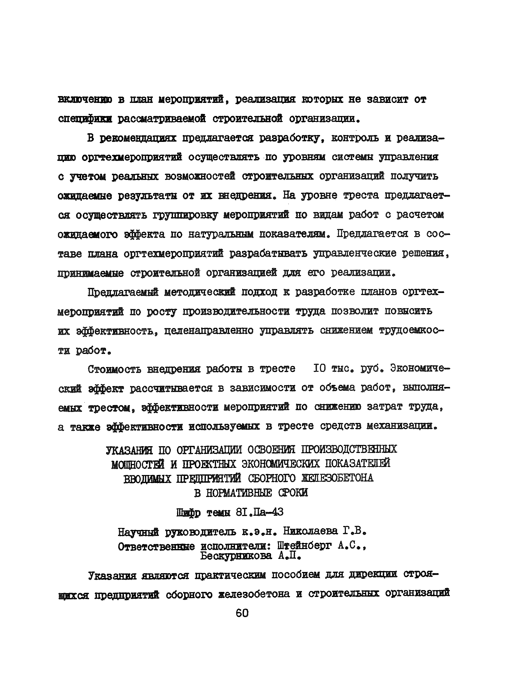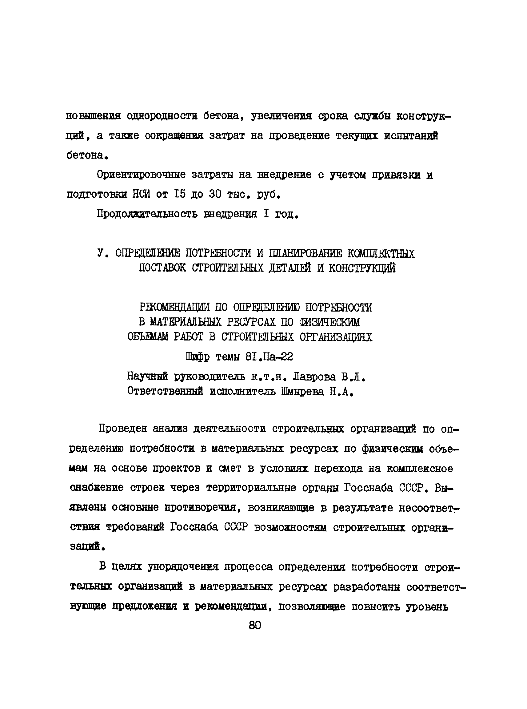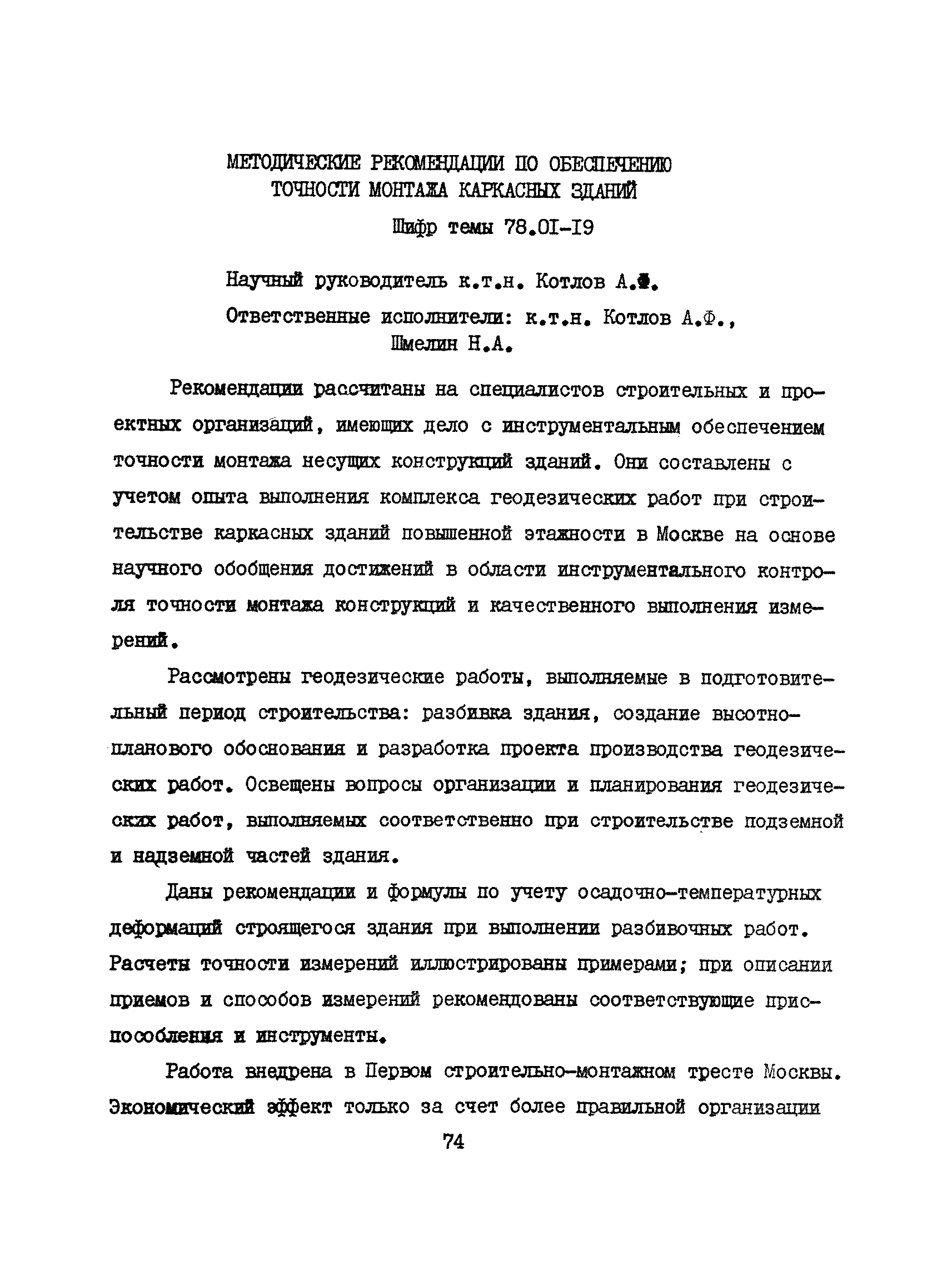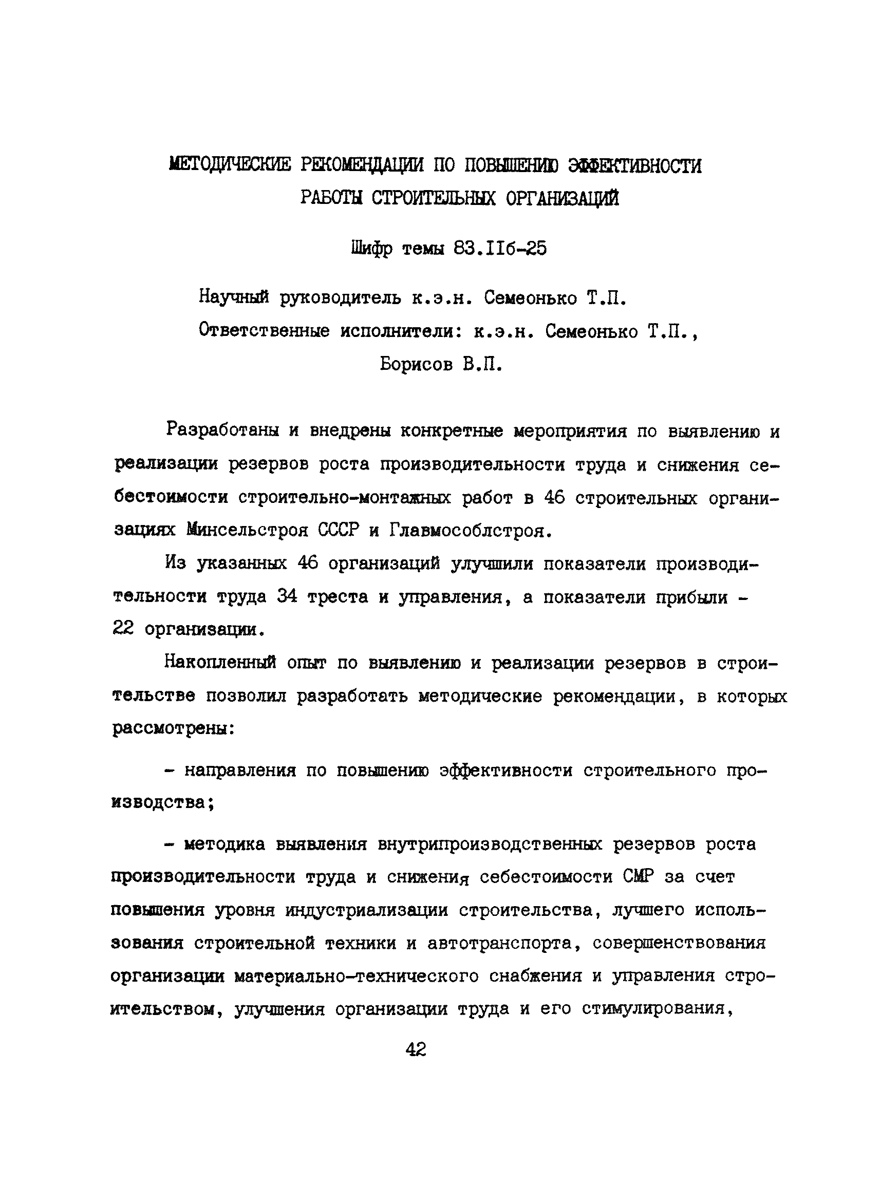 Аннотации законченных научно-исследовательских работ, рекомендуемых для широкого внедрения в строительное производство и на предприятиях строительной индустрии| Статус: | справочные материалы, мп, тпр | | Название рус.: | Аннотации законченных научно-исследовательских работ, рекомендуемых для широкого внедрения в строительное производство и на предприятиях строительной индустрии | | Дата добавления в базу: | 12.02.2016 | | Дата актуализации: | 01.01.2021 | | Область применения: | Аннотации предназначены для инженерно-технических работников строительных министерств и ведомств, строительно-монтажных организаций, оргтехстроев и предприятий строительной индустрии. | | Оглавление: | I. Управление строительными организациями и предприятиями производственной базы строительства II. Совершенствование организации строительного производства III. Планирование и анализ производственно-хозяйственной и финансовой деятельности в строительных организациях и на предприятиях производственной базы строительства IV. Совершенствование качества строительства и строительных конструкций и деталей V. определение потребности и планирование комплектных поставок строительных деталей и конструкций VI. Социальные факторы повышения эффективности деятельности строительных и обслуживающих строительство организаций и предприятий производственной базы | | Разработан: | МИСИ им. В.В. Куйбышева