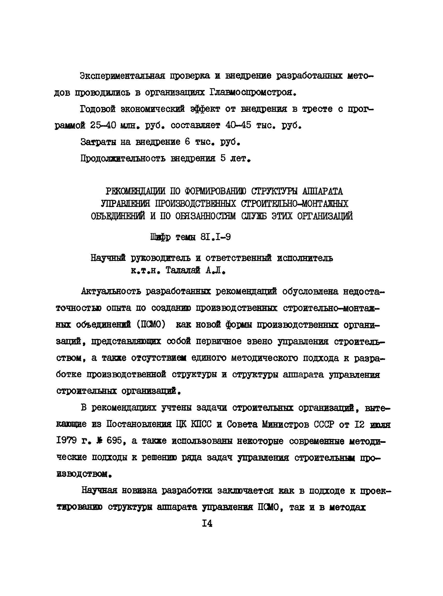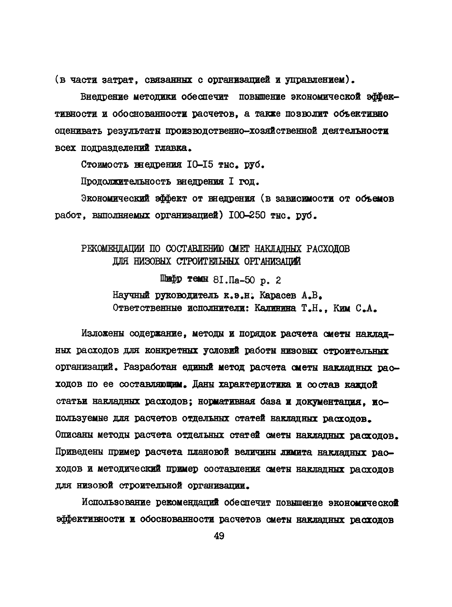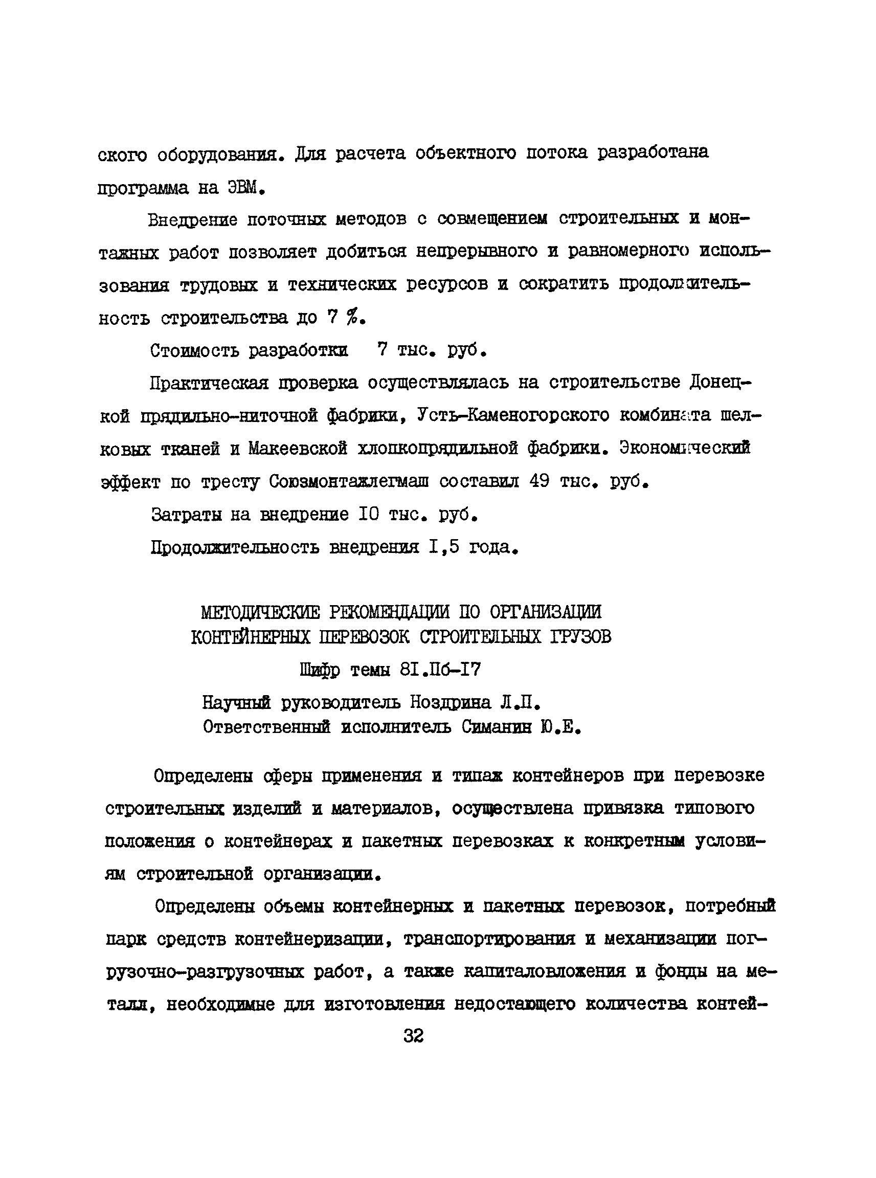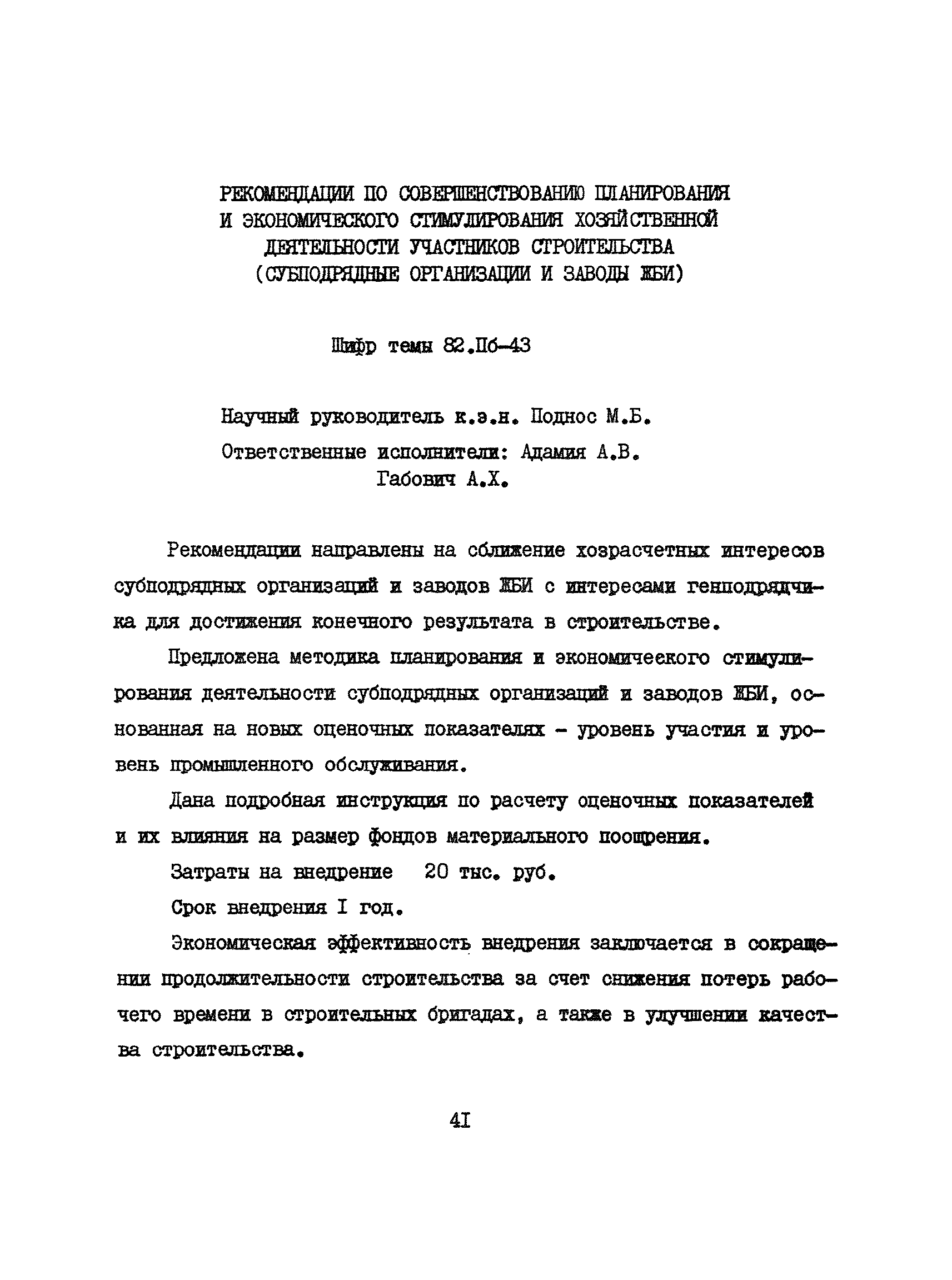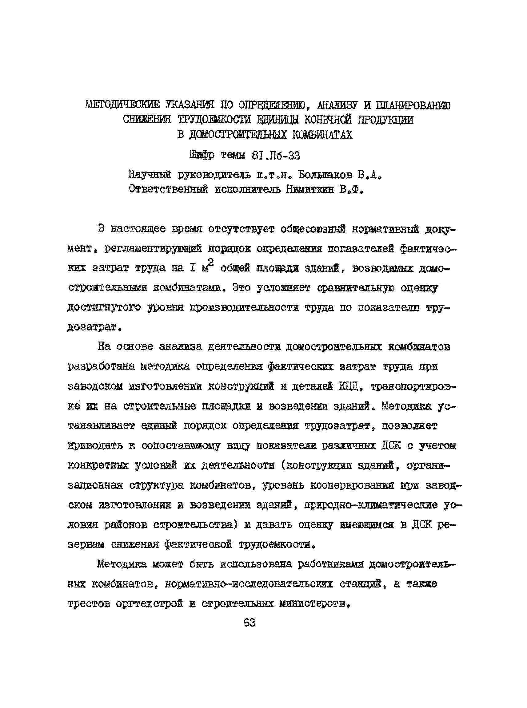 Аннотации законченных научно-исследовательских работ, рекомендуемых для широкого внедрения в строительное производство и на предприятиях строительной индустрии| Статус: | справочные материалы, мп, тпр | | Название рус.: | Аннотации законченных научно-исследовательских работ, рекомендуемых для широкого внедрения в строительное производство и на предприятиях строительной индустрии | | Дата добавления в базу: | 12.02.2016 | | Дата актуализации: | 01.01.2021 | | Область применения: | Аннотации предназначены для инженерно-технических работников строительных министерств и ведомств, строительно-монтажных организаций, оргтехстроев и предприятий строительной индустрии. | | Оглавление: | I. Управление строительными организациями и предприятиями производственной базы строительства II. Совершенствование организации строительного производства III. Планирование и анализ производственно-хозяйственной и финансовой деятельности в строительных организациях и на предприятиях производственной базы строительства IV. Совершенствование качества строительства и строительных конструкций и деталей V. определение потребности и планирование комплектных поставок строительных деталей и конструкций VI. Социальные факторы повышения эффективности деятельности строительных и обслуживающих строительство организаций и предприятий производственной базы | | Разработан: | МИСИ им. В.В. Куйбышева