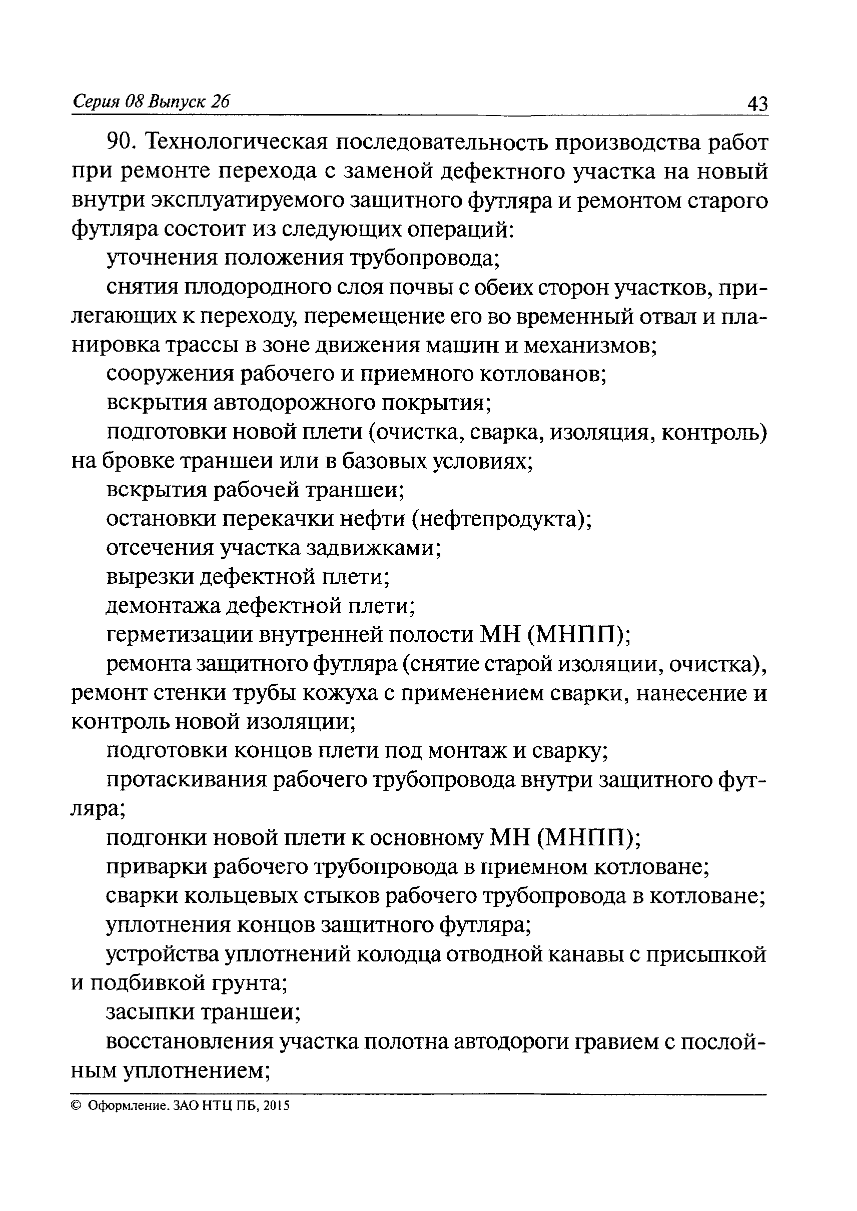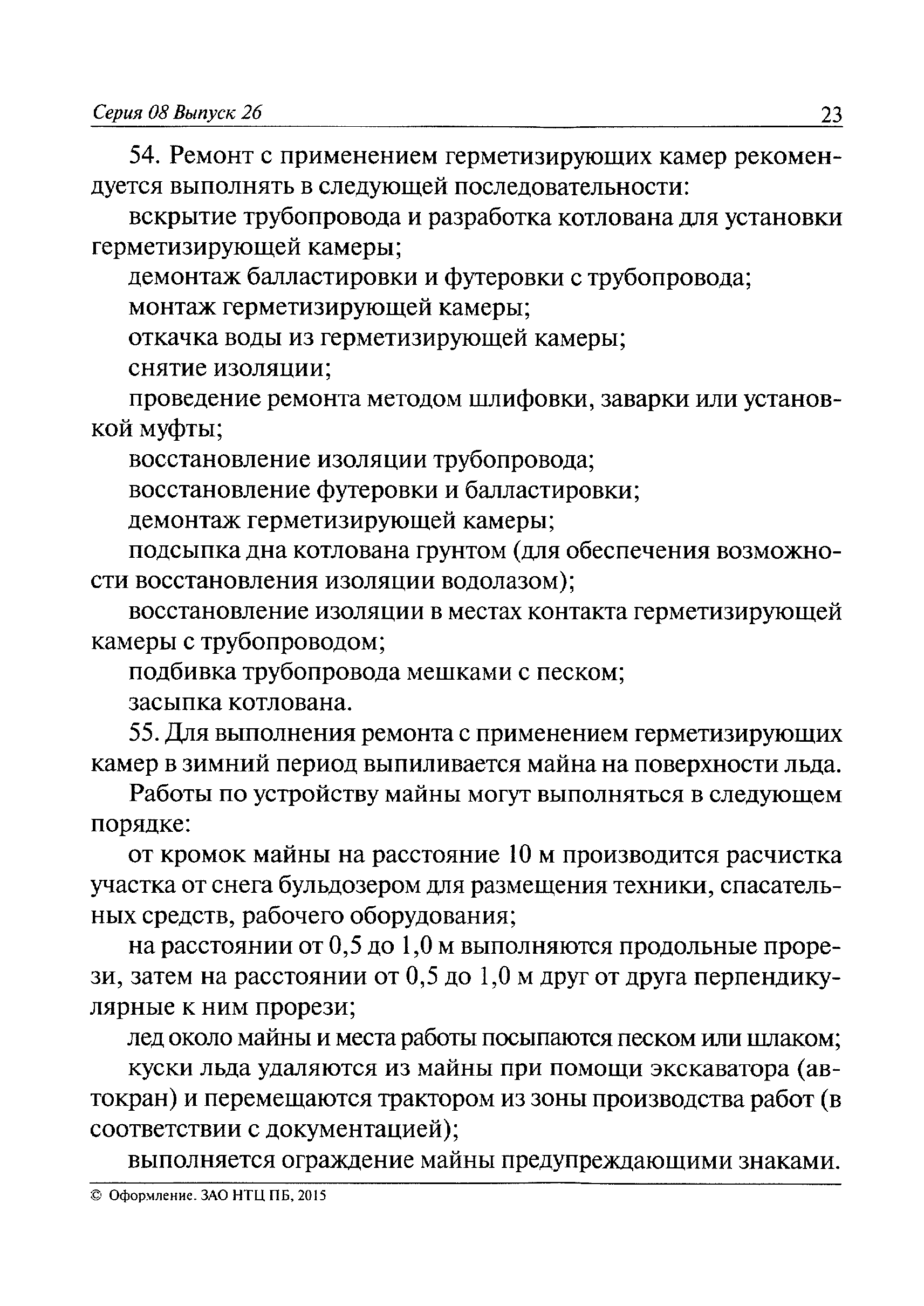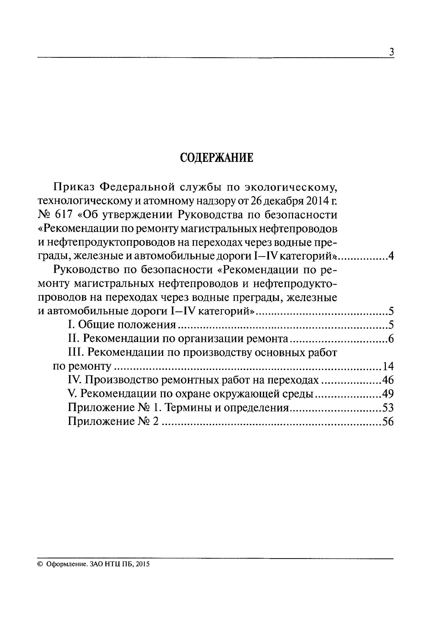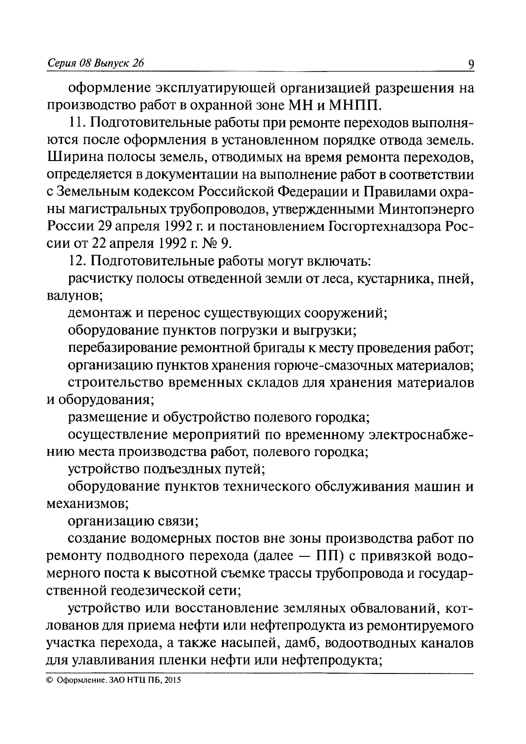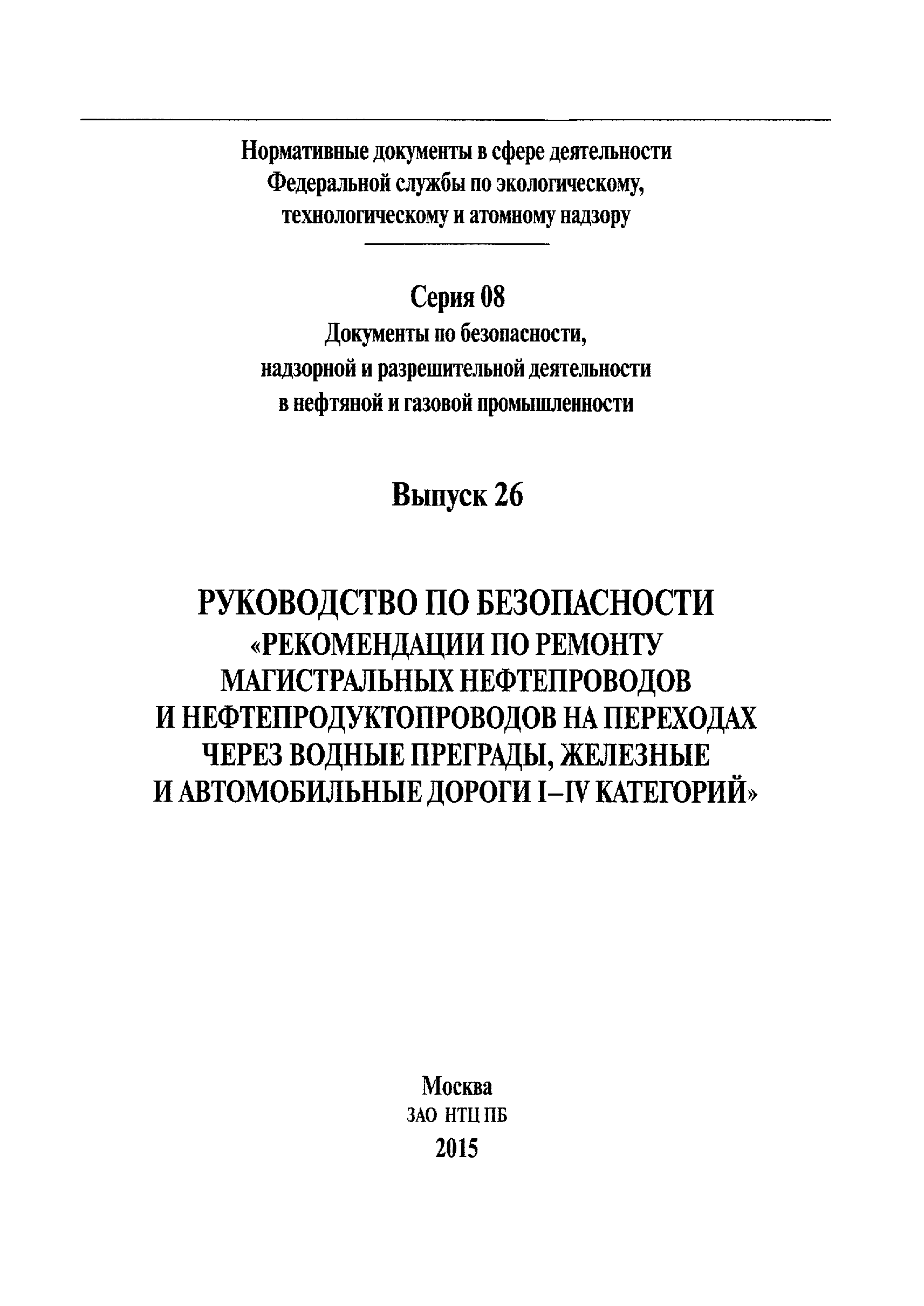Руководство по безопасности "Рекомендации по ремонту магистральных нефтепроводов и нефтепродуктопроводов на переходах через водные преграды, железные и автомобильные дороги I - IV категорий"| Статус: | действует | | Название рус.: | Руководство по безопасности "Рекомендации по ремонту магистральных нефтепроводов и нефтепродуктопроводов на переходах через водные преграды, железные и автомобильные дороги I - IV категорий" | | Дата добавления в базу: | 12.02.2016 | | Дата актуализации: | 01.01.2021 | | Область применения: | Руководство по безопасности содержит рекомендации по организации и производству магистральных нефтепроводов и нефтепродуктопроводов на указанных периодах. | | Оглавление: | I. Общие положения II. Рекомендации по организации ремонта III. Рекомендации по производству основных работ по ремонту IV. Производство ремонтных работ на переходах V. Рекомендации по охране окружающей среды Приложение № 1. Термины и определения Приложение № 2 | | Утверждён: | 26.12.2014 Федеральная служба по экологическому, технологическому и атомному надзору (617)
