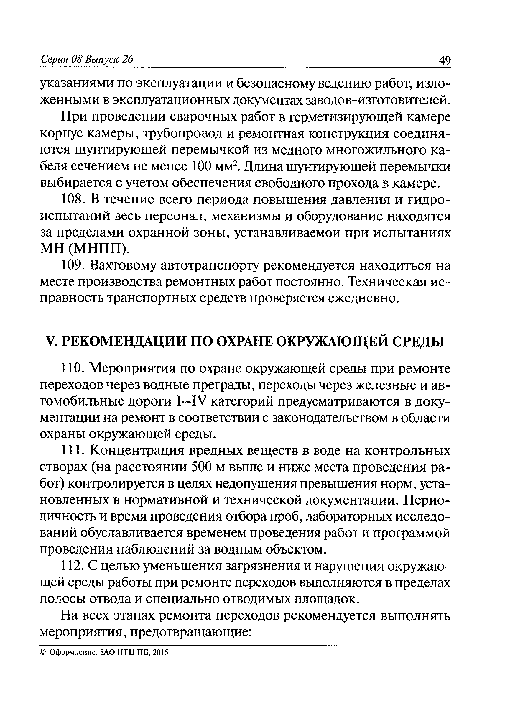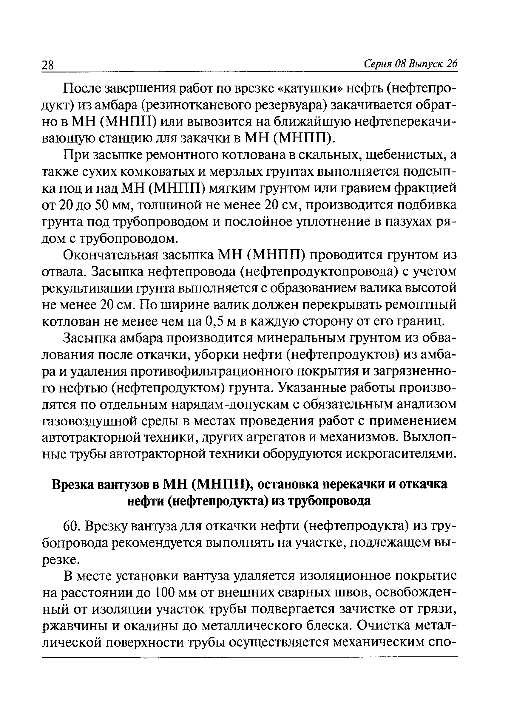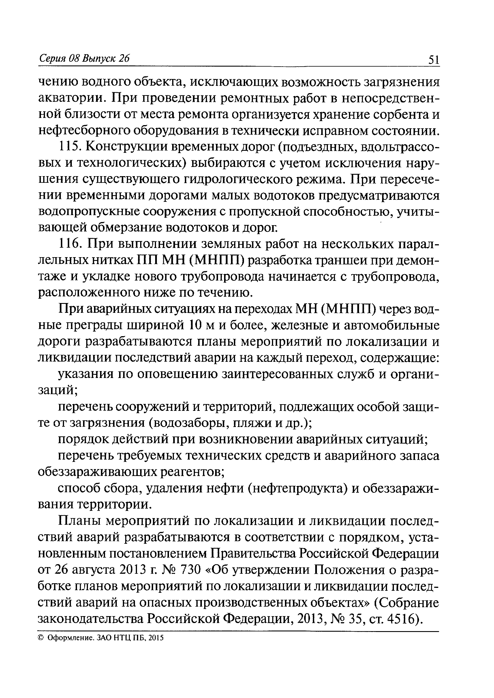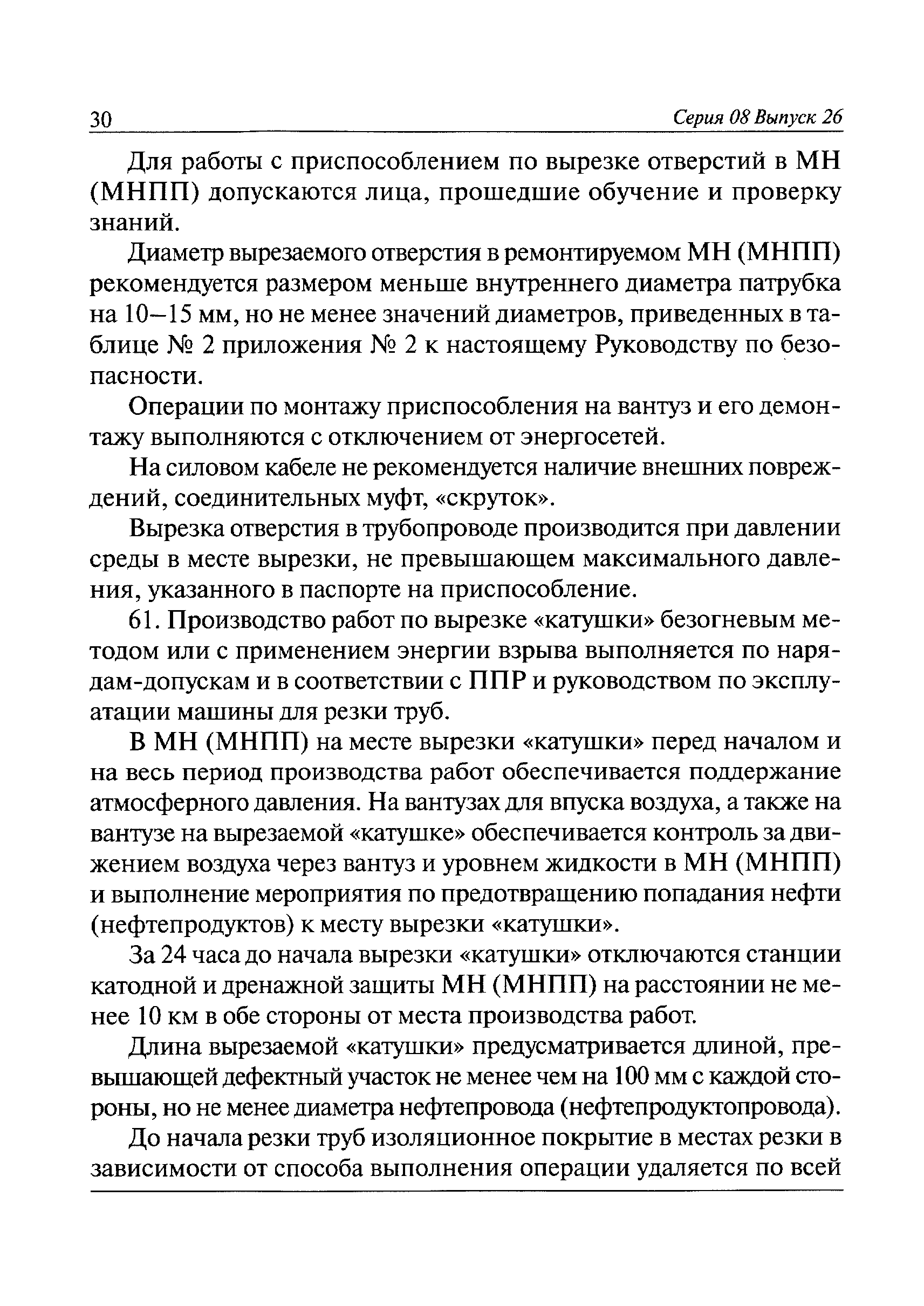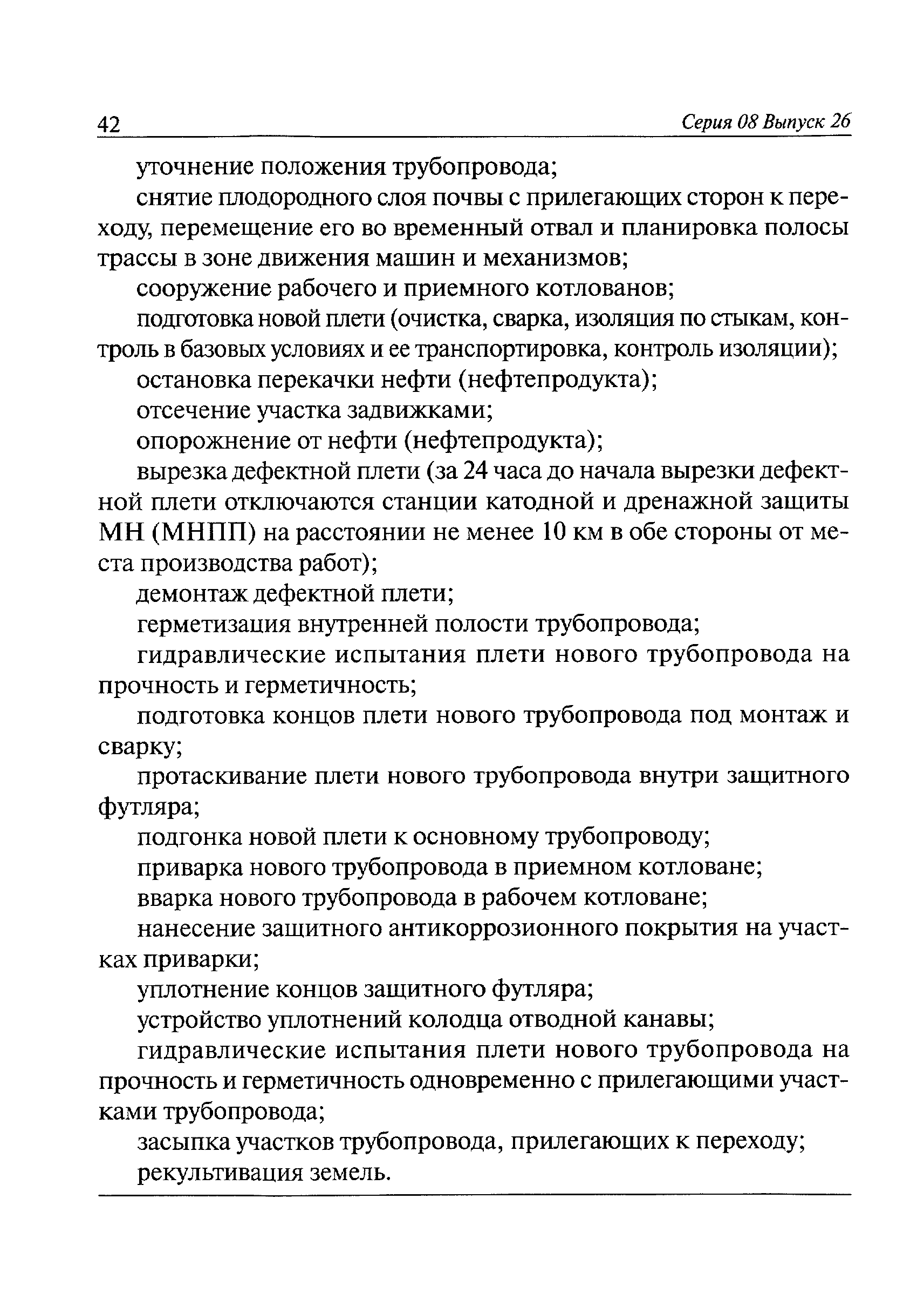 Руководство по безопасности "Рекомендации по ремонту магистральных нефтепроводов и нефтепродуктопроводов на переходах через водные преграды, железные и автомобильные дороги I - IV категорий"| Статус: | действует | | Название рус.: | Руководство по безопасности "Рекомендации по ремонту магистральных нефтепроводов и нефтепродуктопроводов на переходах через водные преграды, железные и автомобильные дороги I - IV категорий" | | Дата добавления в базу: | 12.02.2016 | | Дата актуализации: | 01.01.2021 | | Область применения: | Руководство по безопасности содержит рекомендации по организации и производству магистральных нефтепроводов и нефтепродуктопроводов на указанных периодах. | | Оглавление: | I. Общие положения II. Рекомендации по организации ремонта III. Рекомендации по производству основных работ по ремонту IV. Производство ремонтных работ на переходах V. Рекомендации по охране окружающей среды Приложение № 1. Термины и определения Приложение № 2 | | Утверждён: | 26.12.2014 Федеральная служба по экологическому, технологическому и атомному надзору (617)