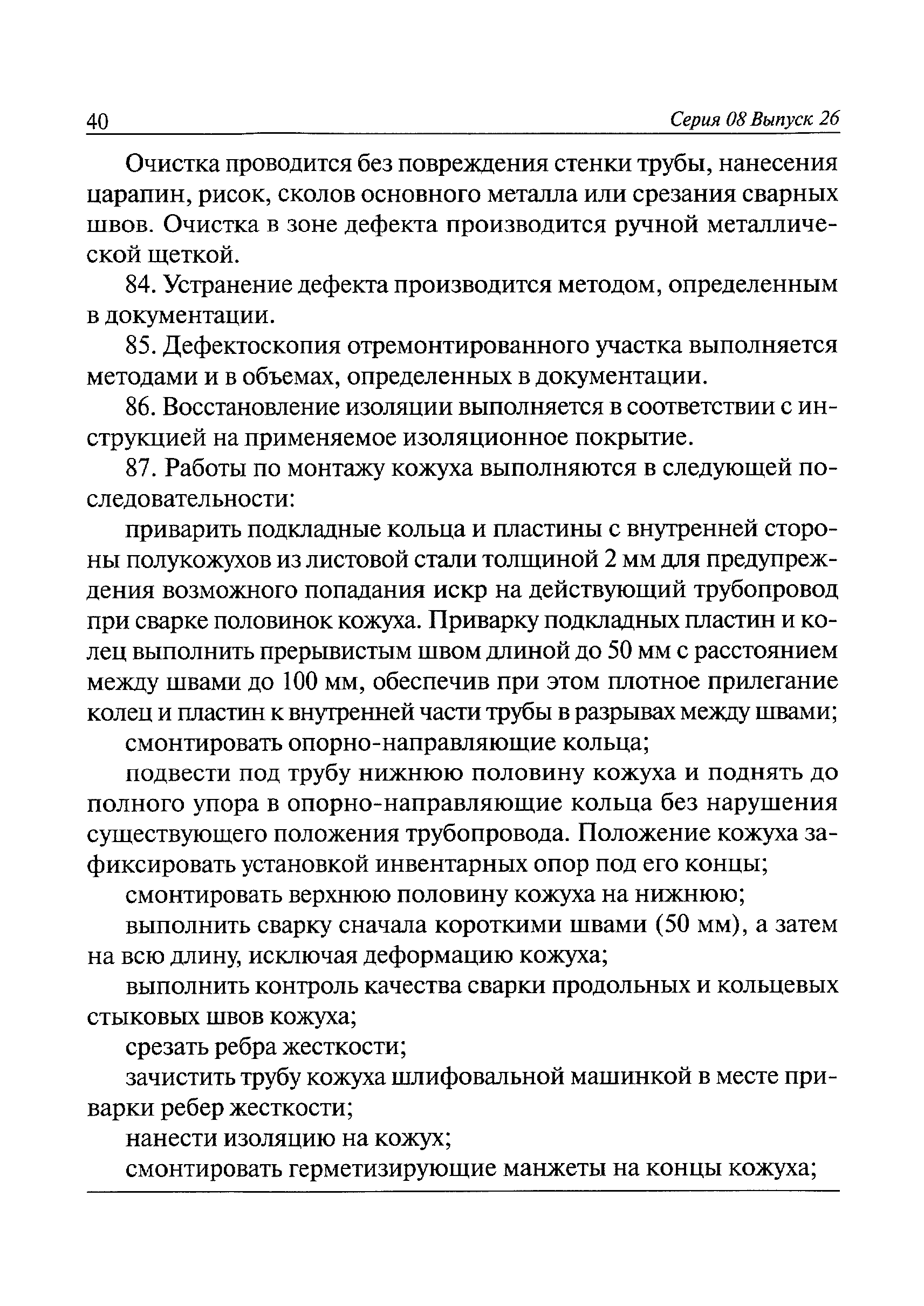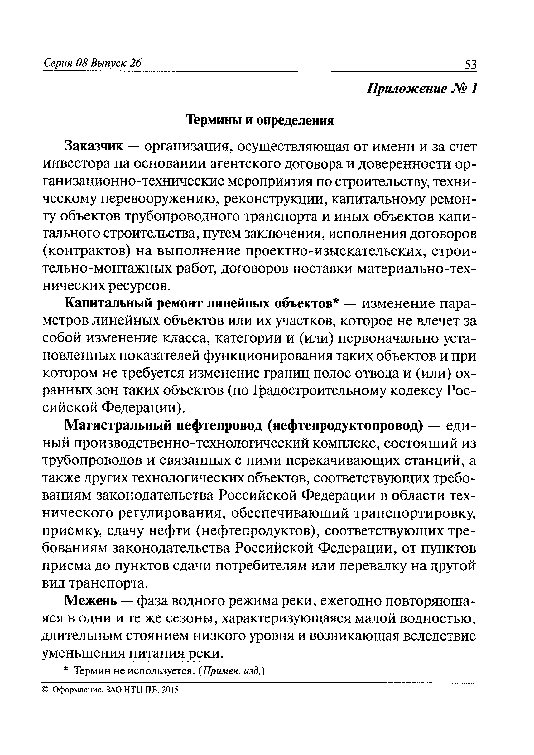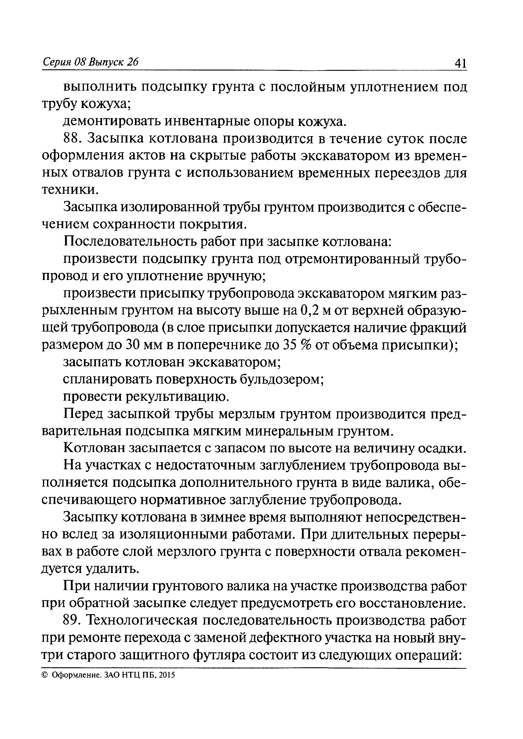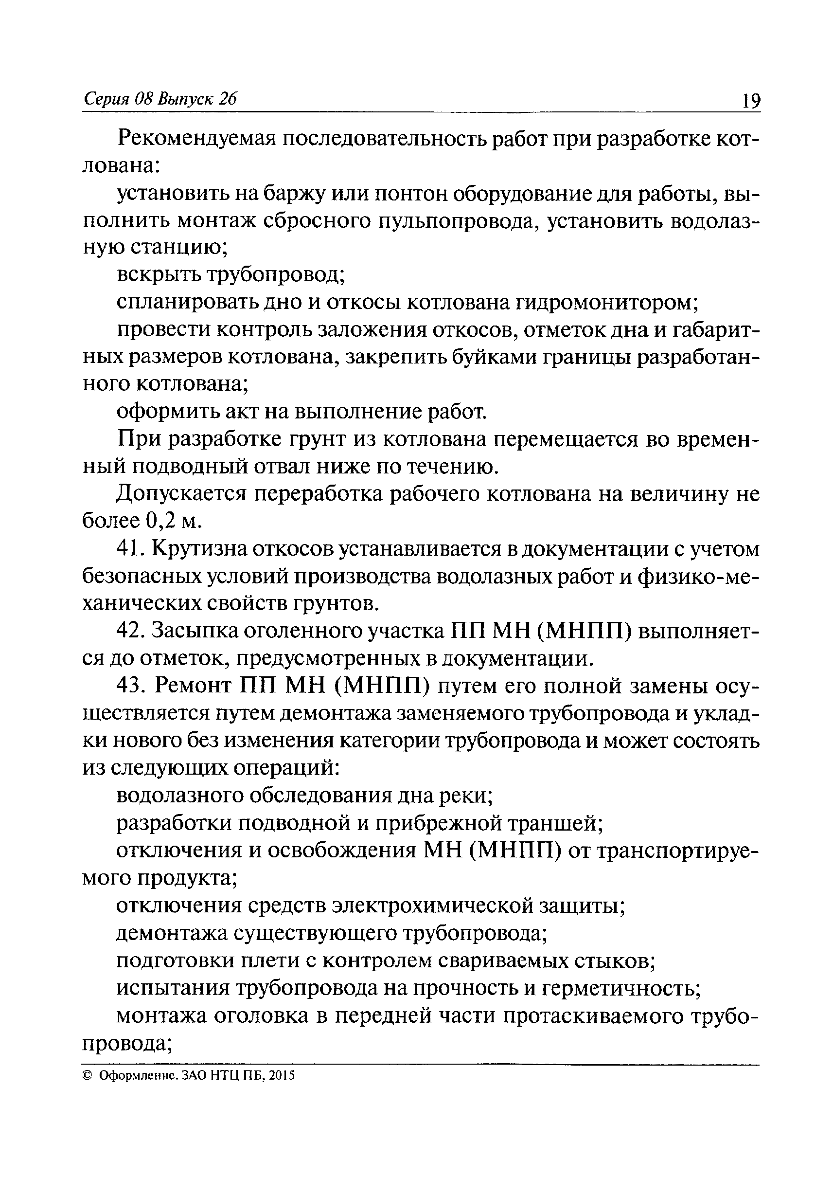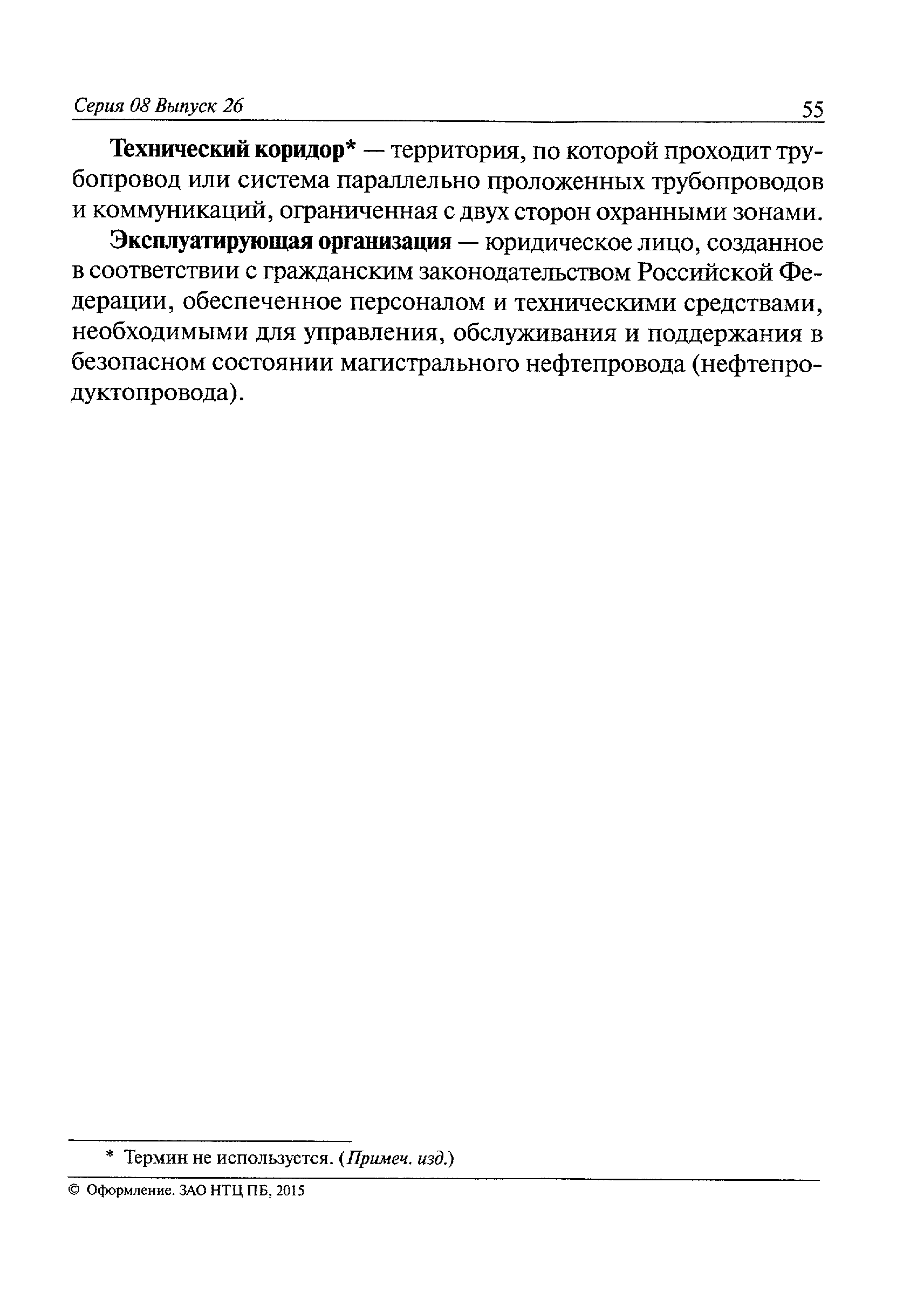 Руководство по безопасности "Рекомендации по ремонту магистральных нефтепроводов и нефтепродуктопроводов на переходах через водные преграды, железные и автомобильные дороги I - IV категорий"| Статус: | действует | | Название рус.: | Руководство по безопасности "Рекомендации по ремонту магистральных нефтепроводов и нефтепродуктопроводов на переходах через водные преграды, железные и автомобильные дороги I - IV категорий" | | Дата добавления в базу: | 12.02.2016 | | Дата актуализации: | 01.01.2021 | | Область применения: | Руководство по безопасности содержит рекомендации по организации и производству магистральных нефтепроводов и нефтепродуктопроводов на указанных периодах. | | Оглавление: | I. Общие положения II. Рекомендации по организации ремонта III. Рекомендации по производству основных работ по ремонту IV. Производство ремонтных работ на переходах V. Рекомендации по охране окружающей среды Приложение № 1. Термины и определения Приложение № 2 | | Утверждён: | 26.12.2014 Федеральная служба по экологическому, технологическому и атомному надзору (617)