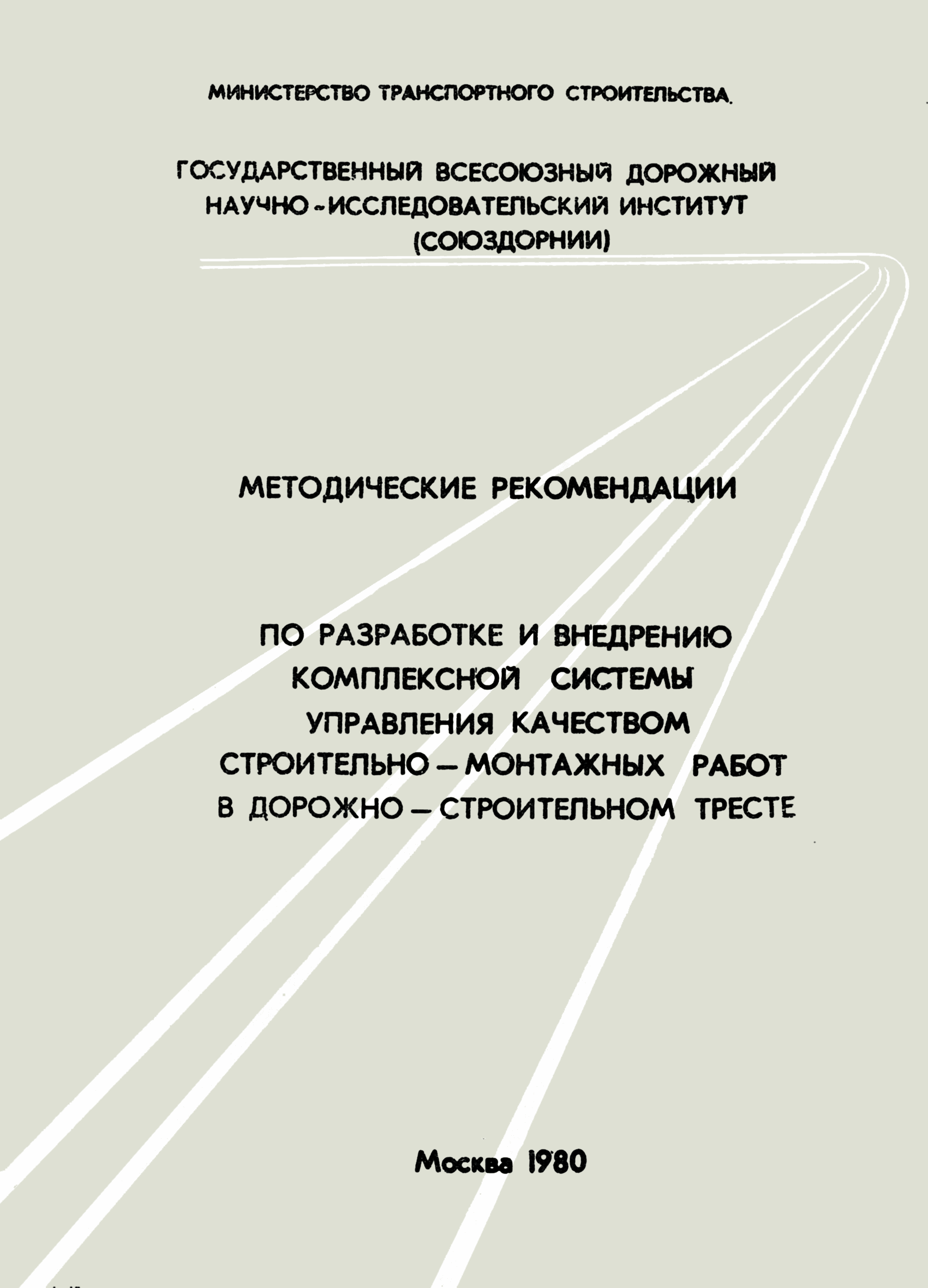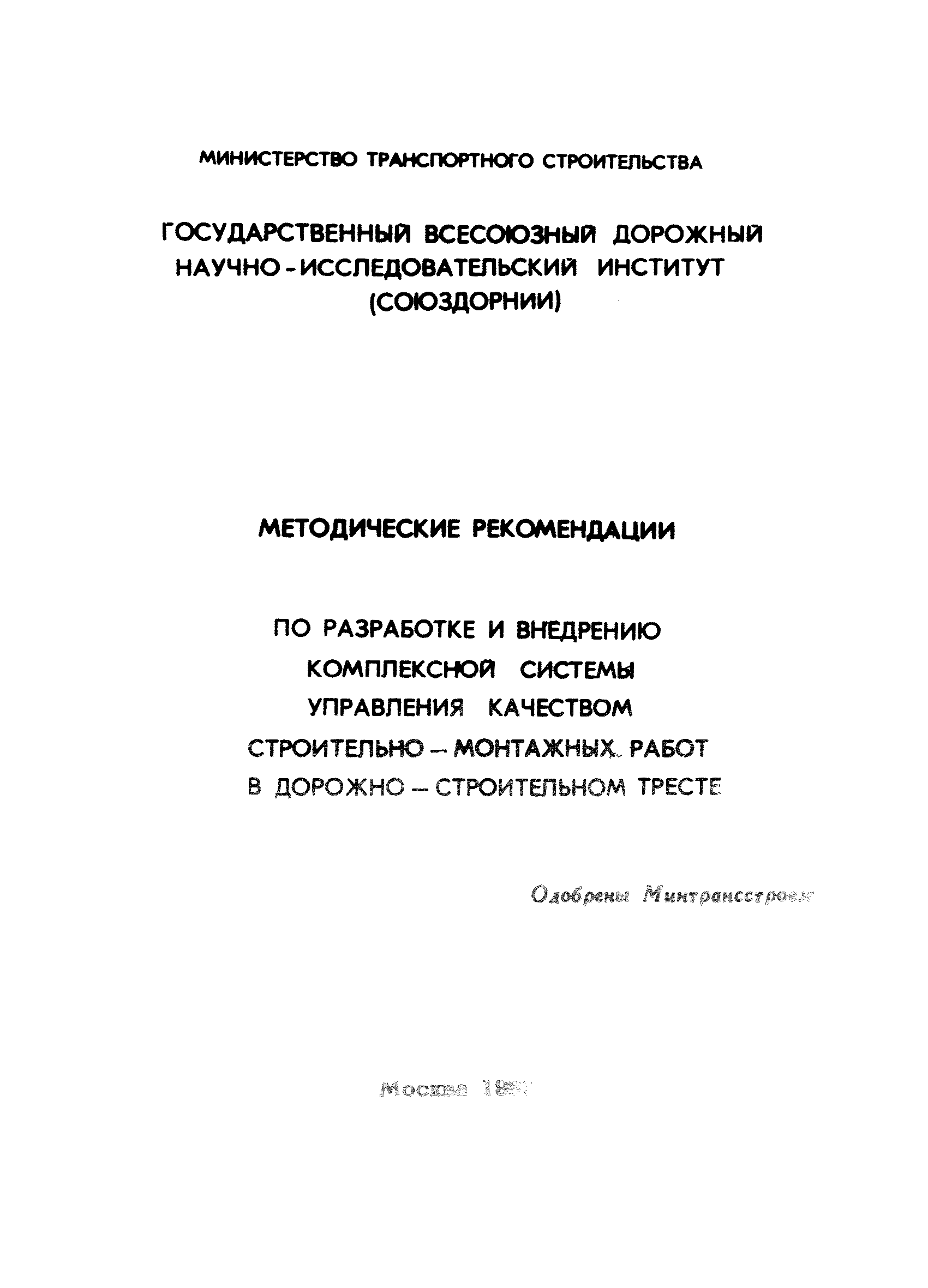 | Название рус.: | Методические рекомендации по разработке и внедрению комплексной системы управления качеством строительно-монтажных работ в дорожно-транспортном тресте |