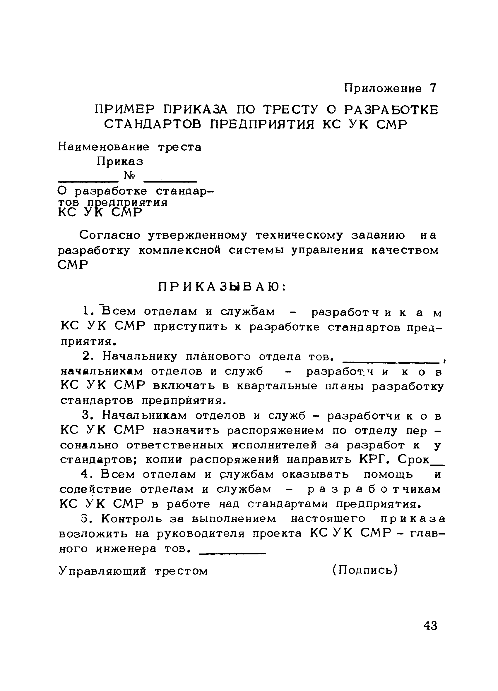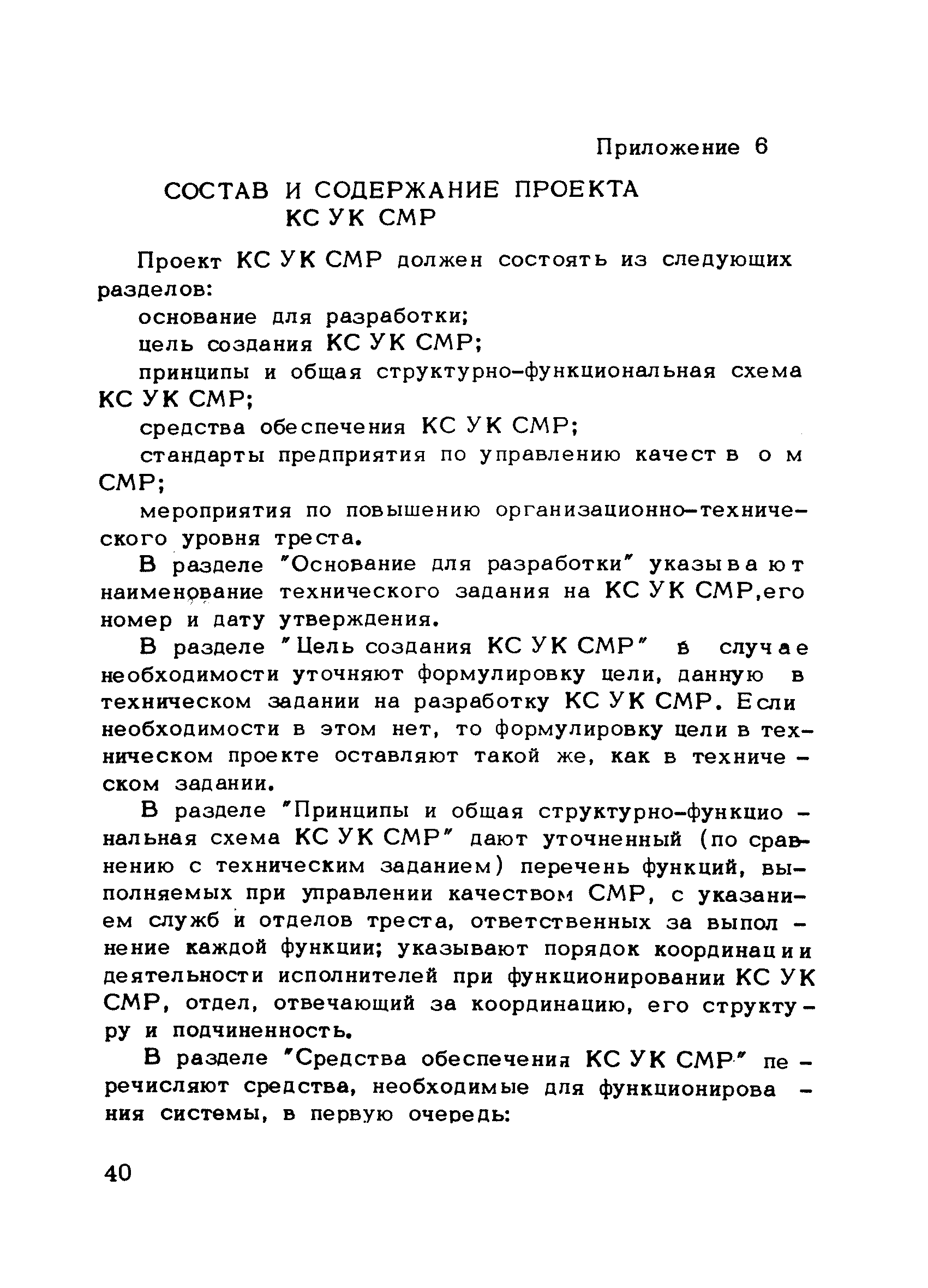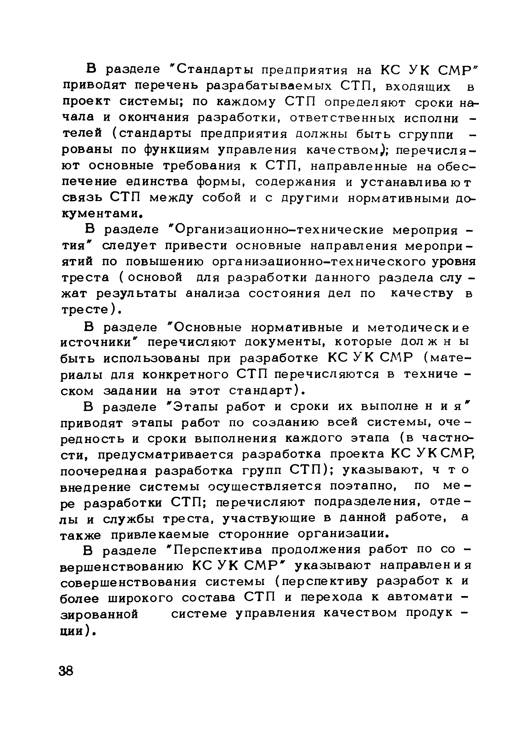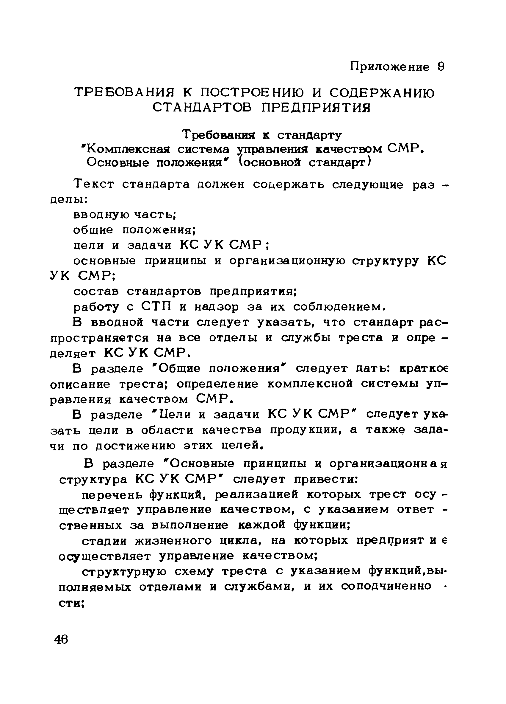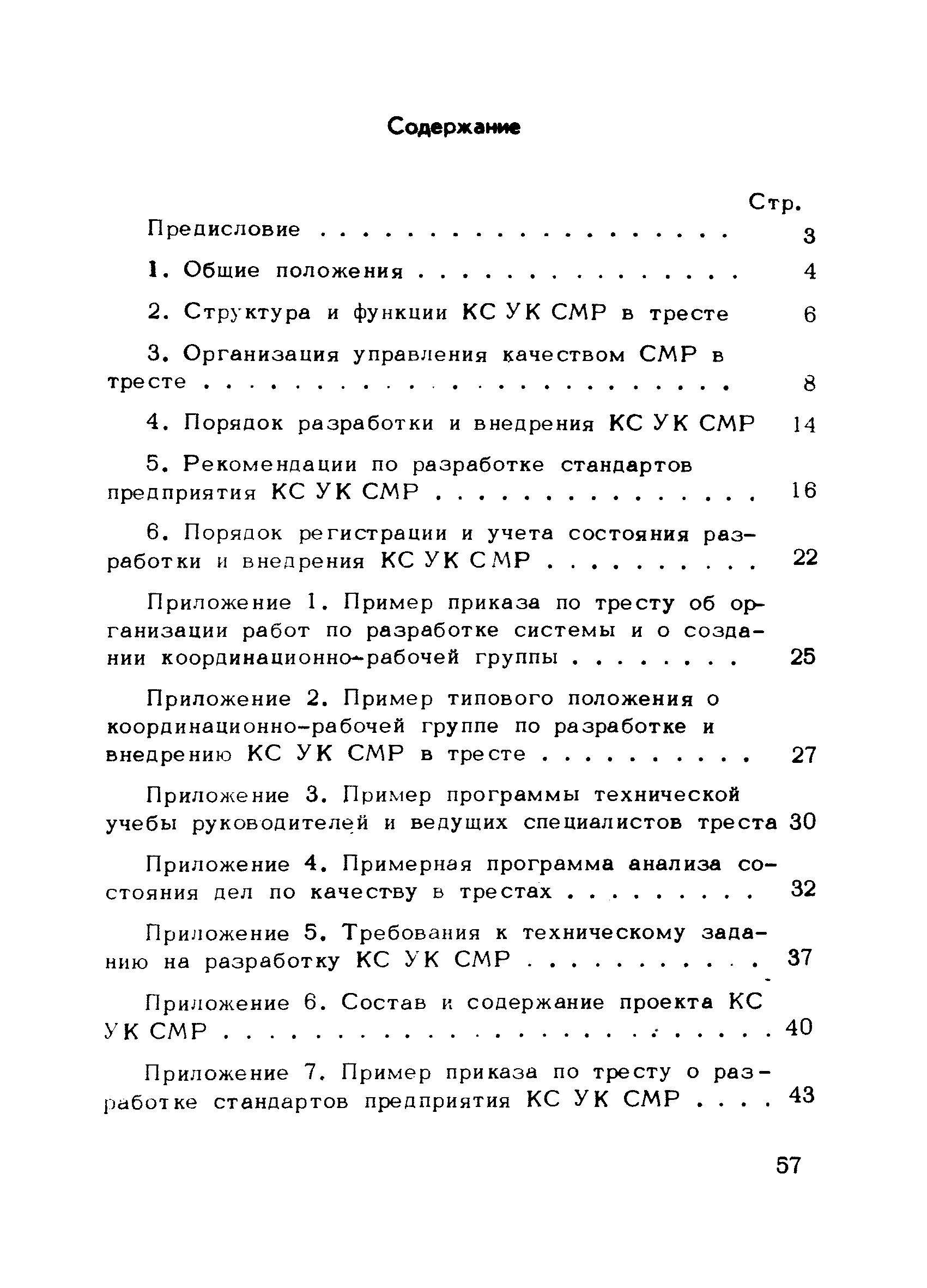 | Оглавление: | Предисловие 1. Общие положения 2. Структура и функции КС УК СМР в тресте 3. Организация управления качеством СМР в тресте 4. Порядок разработки и внедрения КС УК СМР 5. Рекомендации по разработке стандартов предприятия КС УК СМР 6. Порядок регистрации и учета состояния разработки и внедрения КС УК СМР Приложение 1. Пример приказа по тресту об организации работ по разработке системы и о создании координационно-рабочей группы Приложение 2. Пример типового положения о координационно—рабочей группе по разработке и внедрению КС УК СМР в тресте Приложение 3. Пример программы технической учебы руководителей и ведущих специалистов треста Приложение 4. Примерная программа анализа состояния дел по качеству в трестах Приложение 5. Требования к техническому заданию на разработку КС УК СМР Приложение 6. Состав и содержание проекта КС УК СМР Приложение 7. Пример приказа по тресту о разработке стандартов предприятия КС УК СМР Приложение 8. Пример приказа по тресту о внедрении стандартов предприятия Приложение 9. Требования к построению и содержанию стандартов предприятия Приложение 10. Примерный перечень стандартов предприятия КС УК СМР Приложение 11. Форма акта внедрения КС УК СМР Приложение 12. Бланк-сигнал учета КС УК СМР |