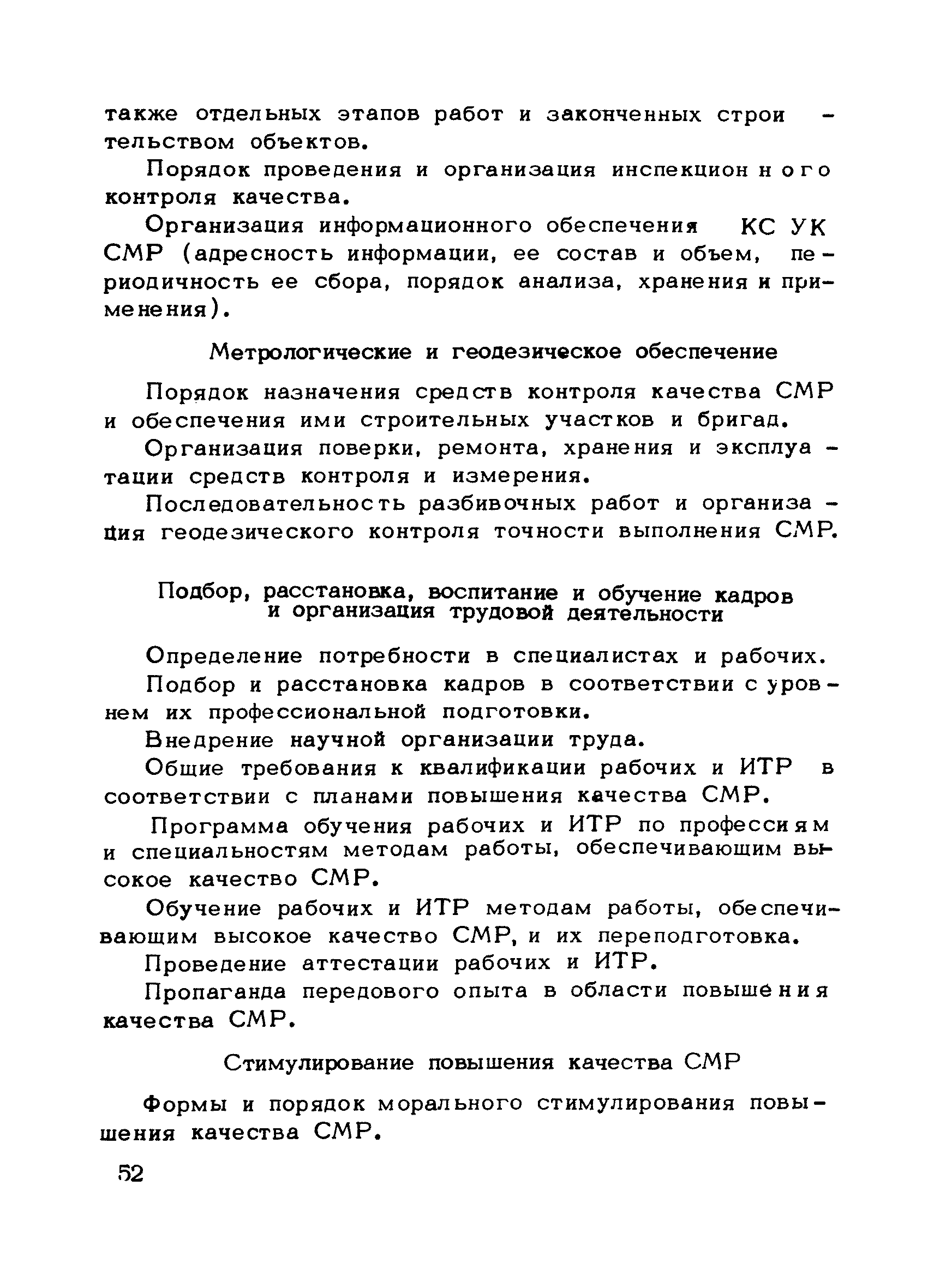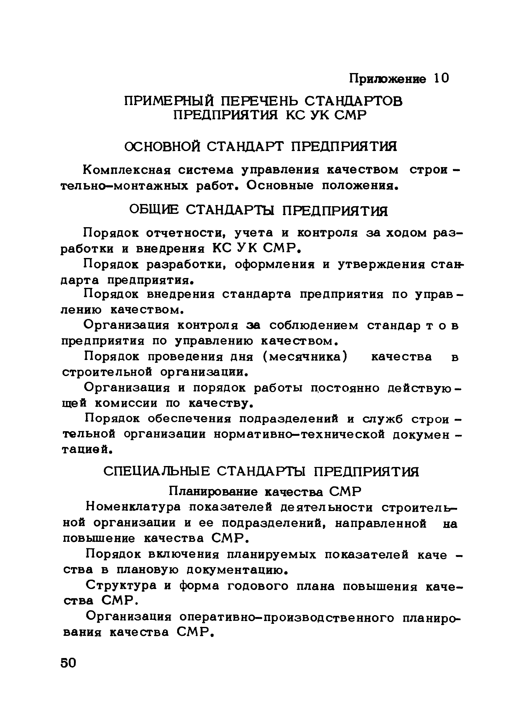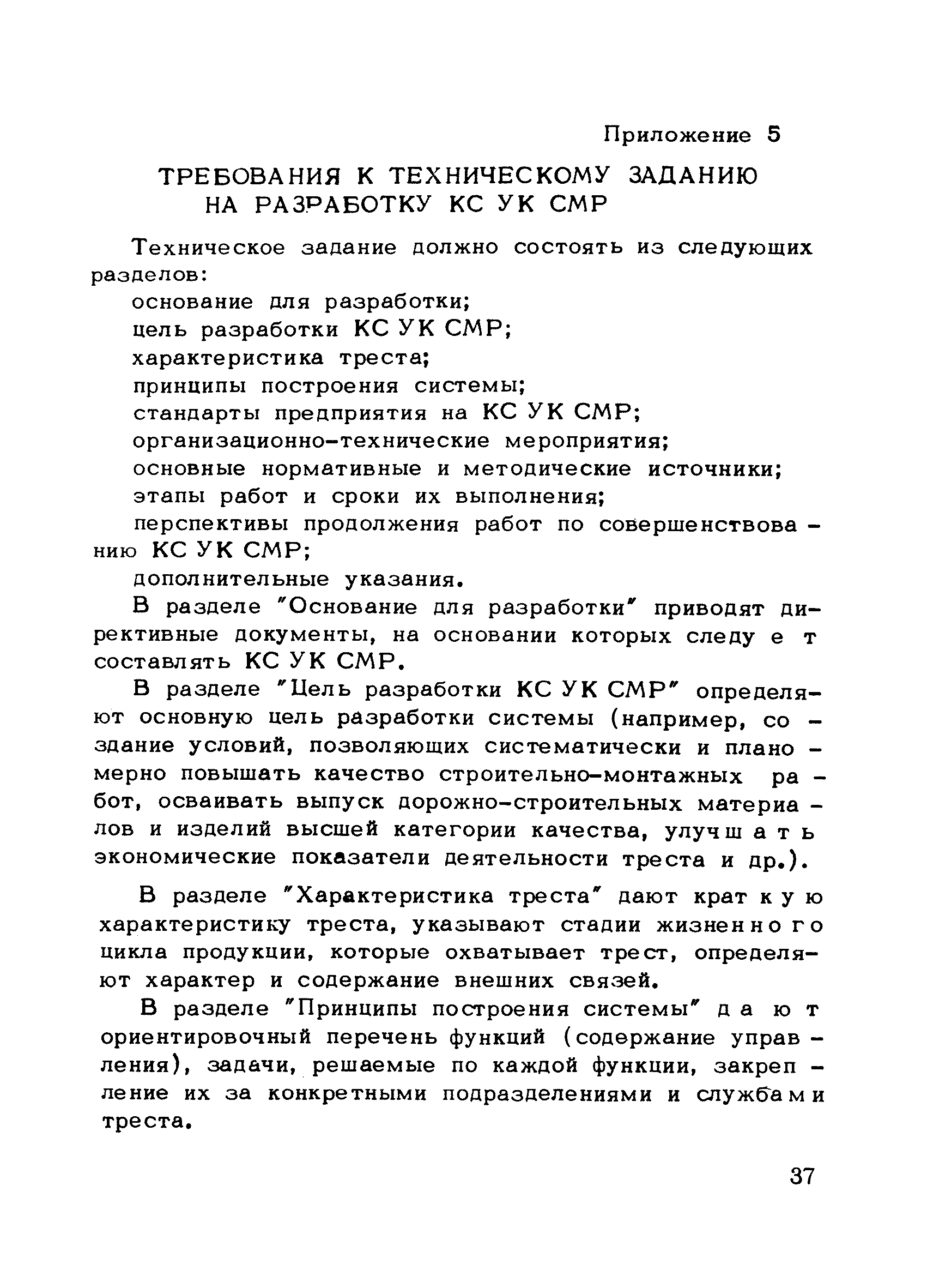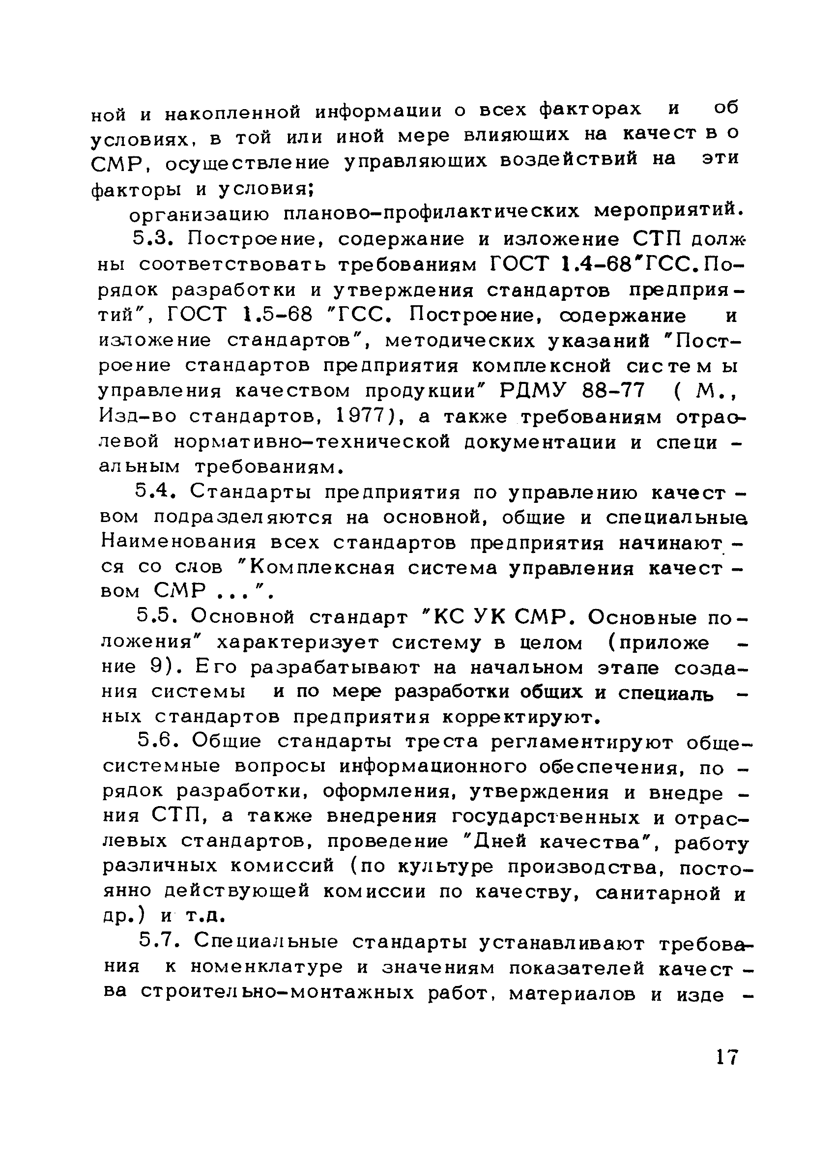 | Оглавление: | Предисловие 1. Общие положения 2. Структура и функции КС УК СМР в тресте 3. Организация управления качеством СМР в тресте 4. Порядок разработки и внедрения КС УК СМР 5. Рекомендации по разработке стандартов предприятия КС УК СМР 6. Порядок регистрации и учета состояния разработки и внедрения КС УК СМР Приложение 1. Пример приказа по тресту об организации работ по разработке системы и о создании координационно-рабочей группы Приложение 2. Пример типового положения о координационно—рабочей группе по разработке и внедрению КС УК СМР в тресте Приложение 3. Пример программы технической учебы руководителей и ведущих специалистов треста Приложение 4. Примерная программа анализа состояния дел по качеству в трестах Приложение 5. Требования к техническому заданию на разработку КС УК СМР Приложение 6. Состав и содержание проекта КС УК СМР Приложение 7. Пример приказа по тресту о разработке стандартов предприятия КС УК СМР Приложение 8. Пример приказа по тресту о внедрении стандартов предприятия Приложение 9. Требования к построению и содержанию стандартов предприятия Приложение 10. Примерный перечень стандартов предприятия КС УК СМР Приложение 11. Форма акта внедрения КС УК СМР Приложение 12. Бланк-сигнал учета КС УК СМР |