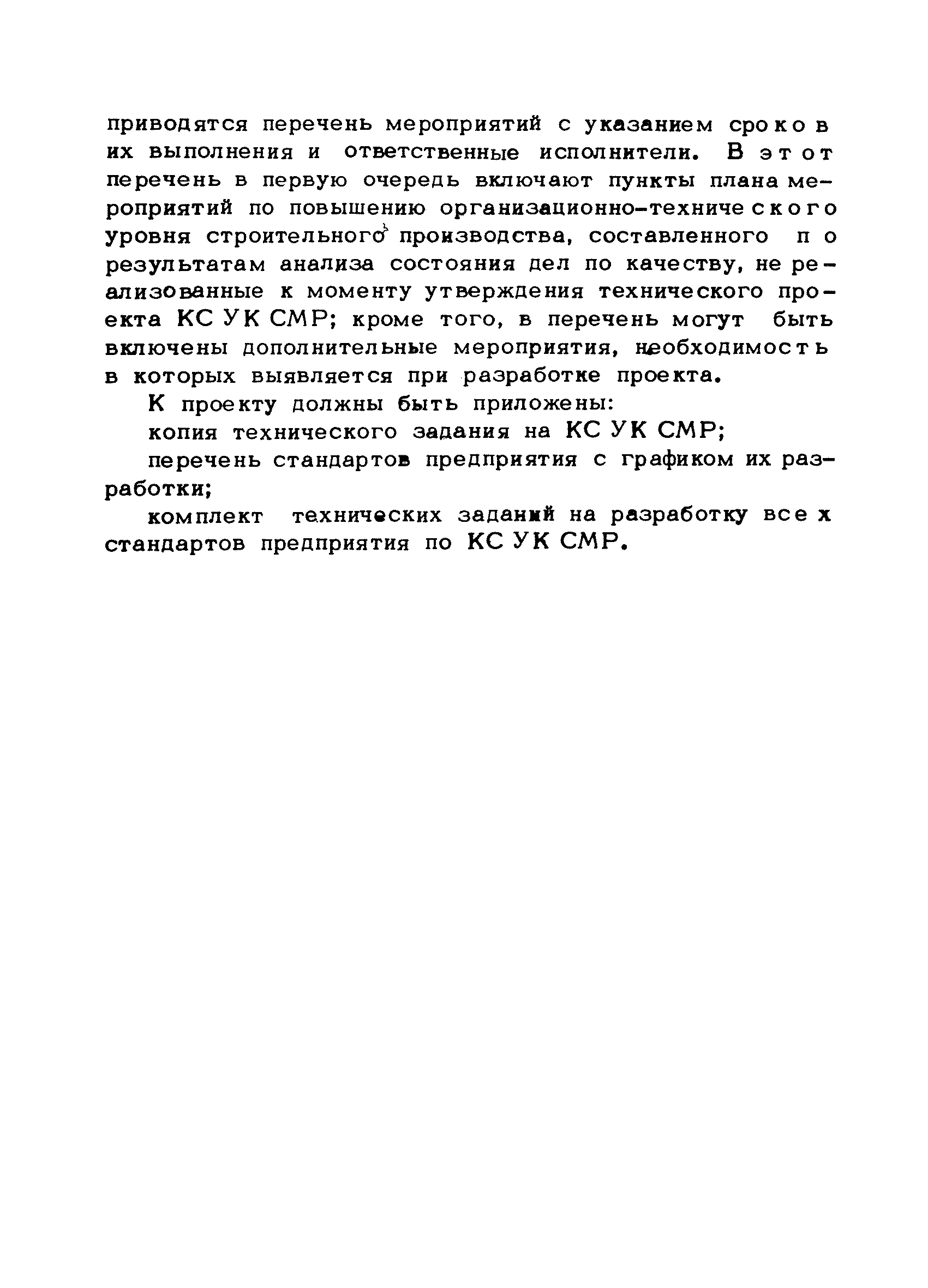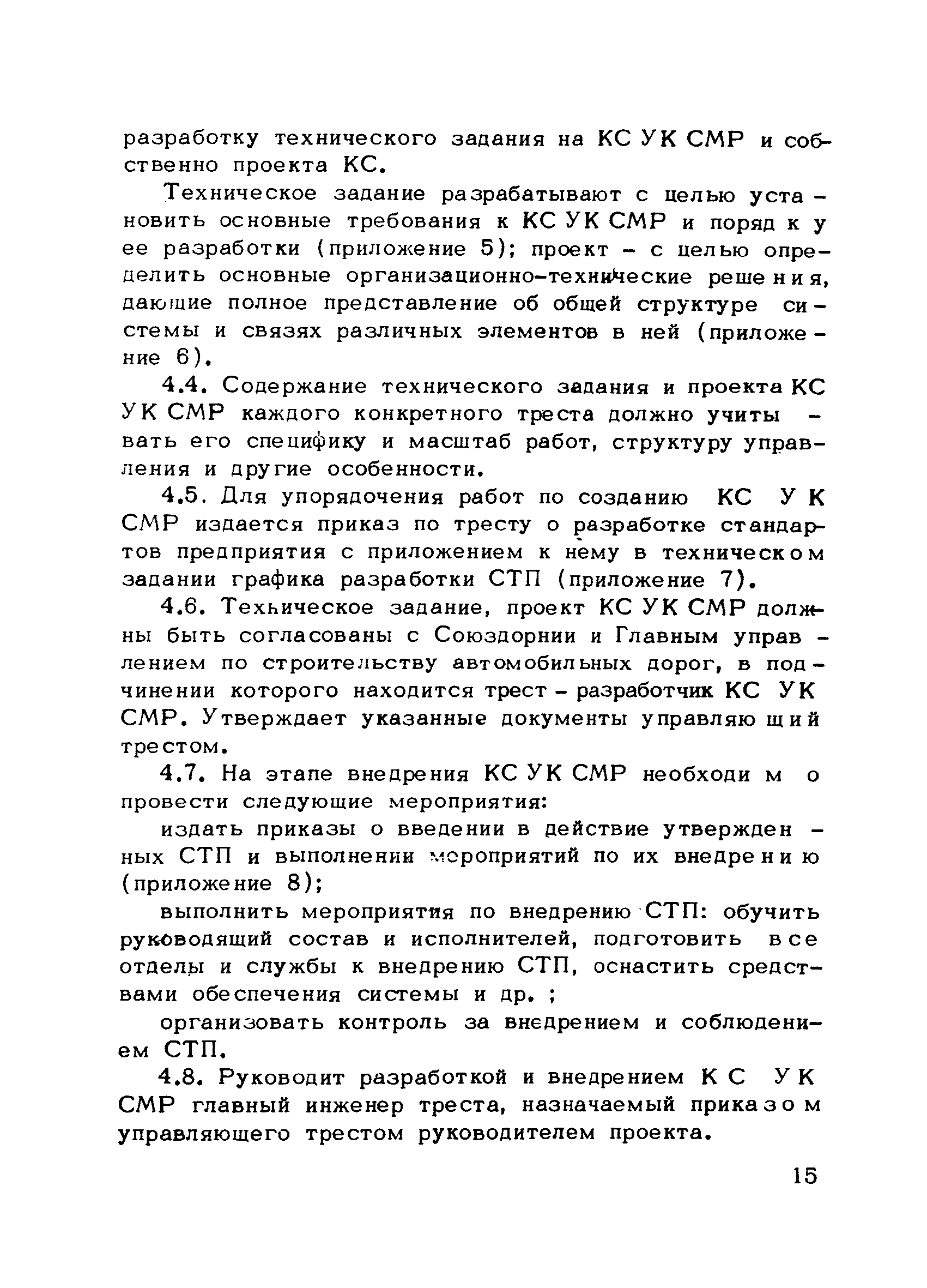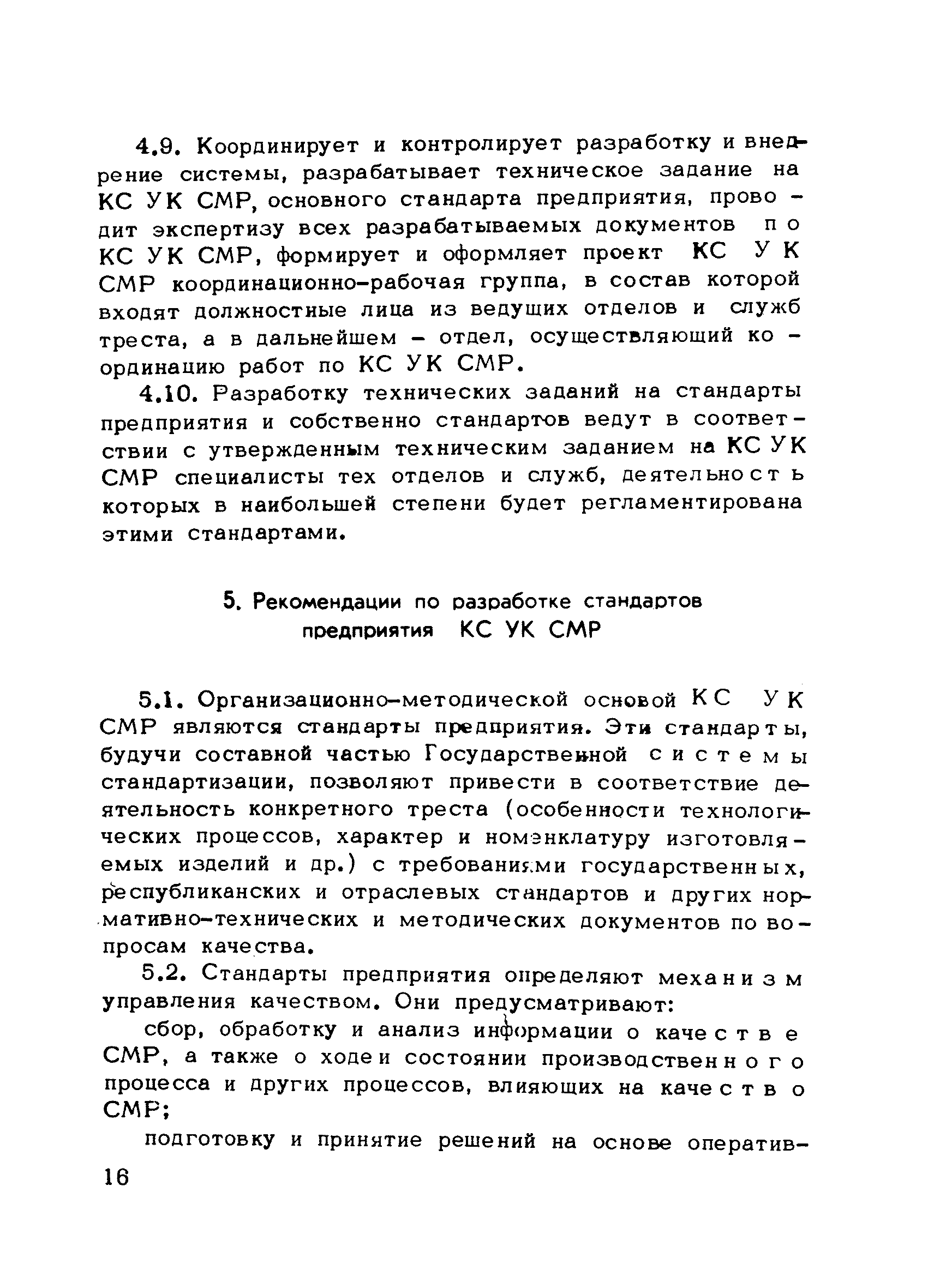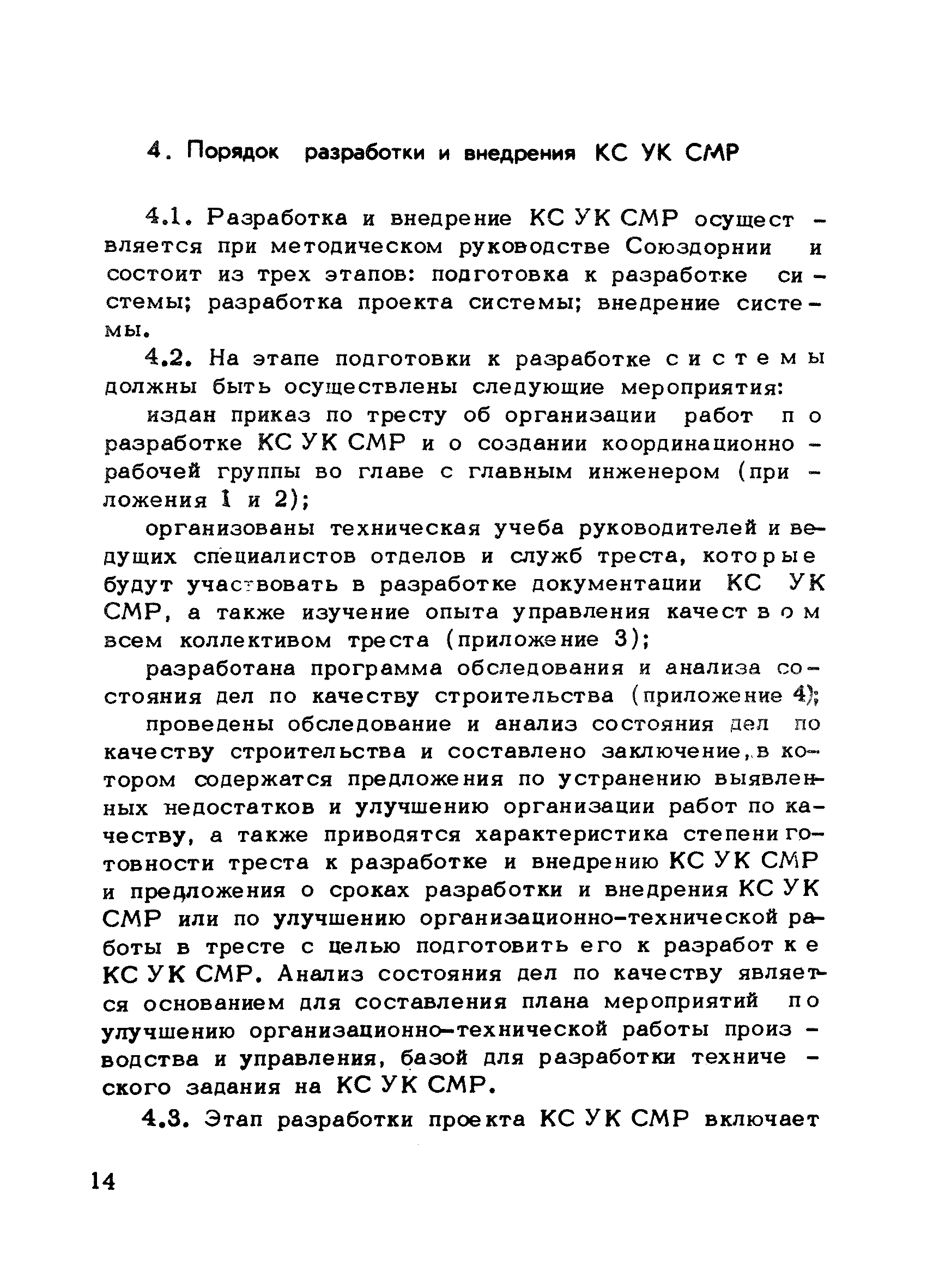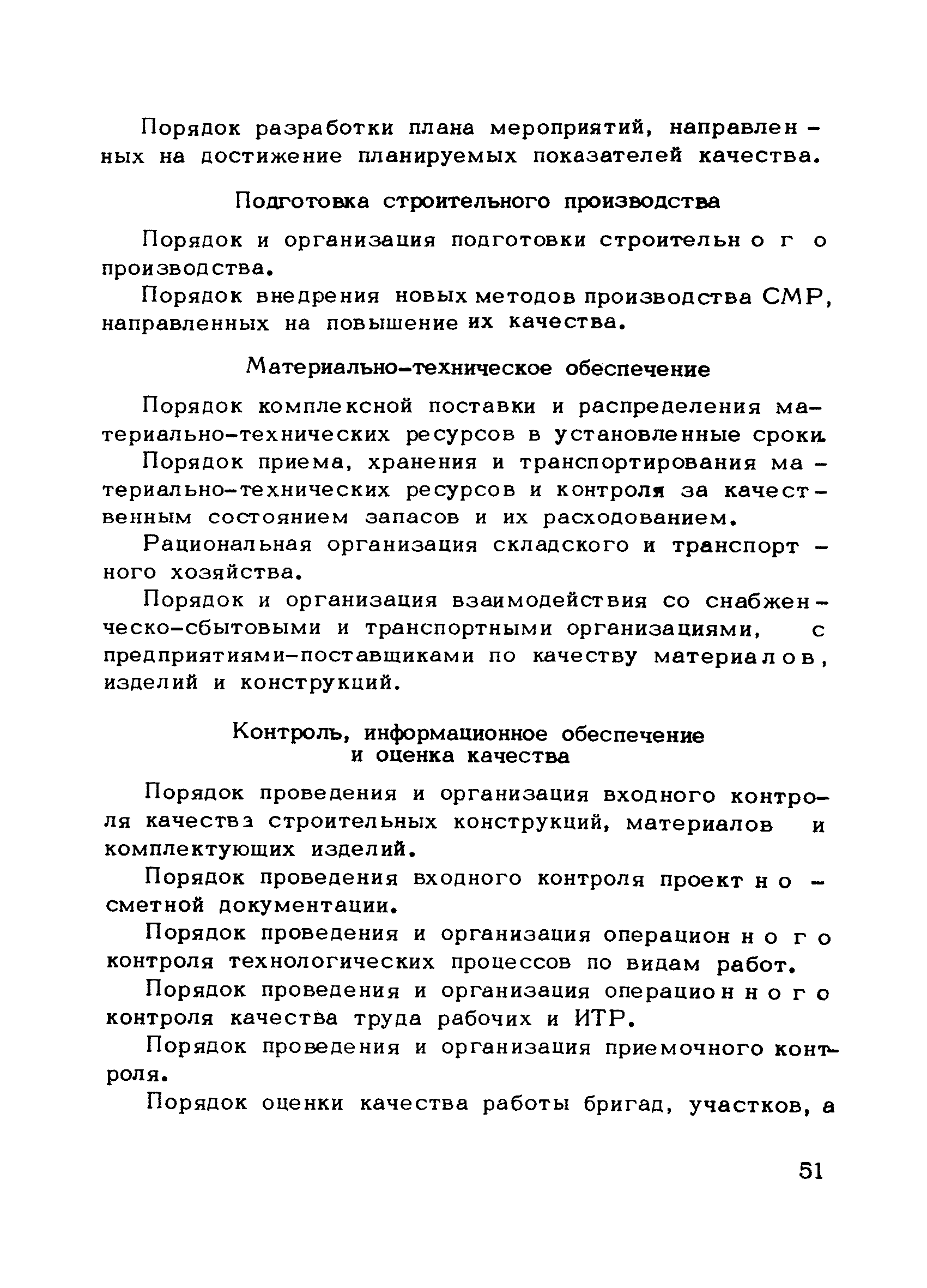 | Оглавление: | Предисловие 1. Общие положения 2. Структура и функции КС УК СМР в тресте 3. Организация управления качеством СМР в тресте 4. Порядок разработки и внедрения КС УК СМР 5. Рекомендации по разработке стандартов предприятия КС УК СМР 6. Порядок регистрации и учета состояния разработки и внедрения КС УК СМР Приложение 1. Пример приказа по тресту об организации работ по разработке системы и о создании координационно-рабочей группы Приложение 2. Пример типового положения о координационно—рабочей группе по разработке и внедрению КС УК СМР в тресте Приложение 3. Пример программы технической учебы руководителей и ведущих специалистов треста Приложение 4. Примерная программа анализа состояния дел по качеству в трестах Приложение 5. Требования к техническому заданию на разработку КС УК СМР Приложение 6. Состав и содержание проекта КС УК СМР Приложение 7. Пример приказа по тресту о разработке стандартов предприятия КС УК СМР Приложение 8. Пример приказа по тресту о внедрении стандартов предприятия Приложение 9. Требования к построению и содержанию стандартов предприятия Приложение 10. Примерный перечень стандартов предприятия КС УК СМР Приложение 11. Форма акта внедрения КС УК СМР Приложение 12. Бланк-сигнал учета КС УК СМР |