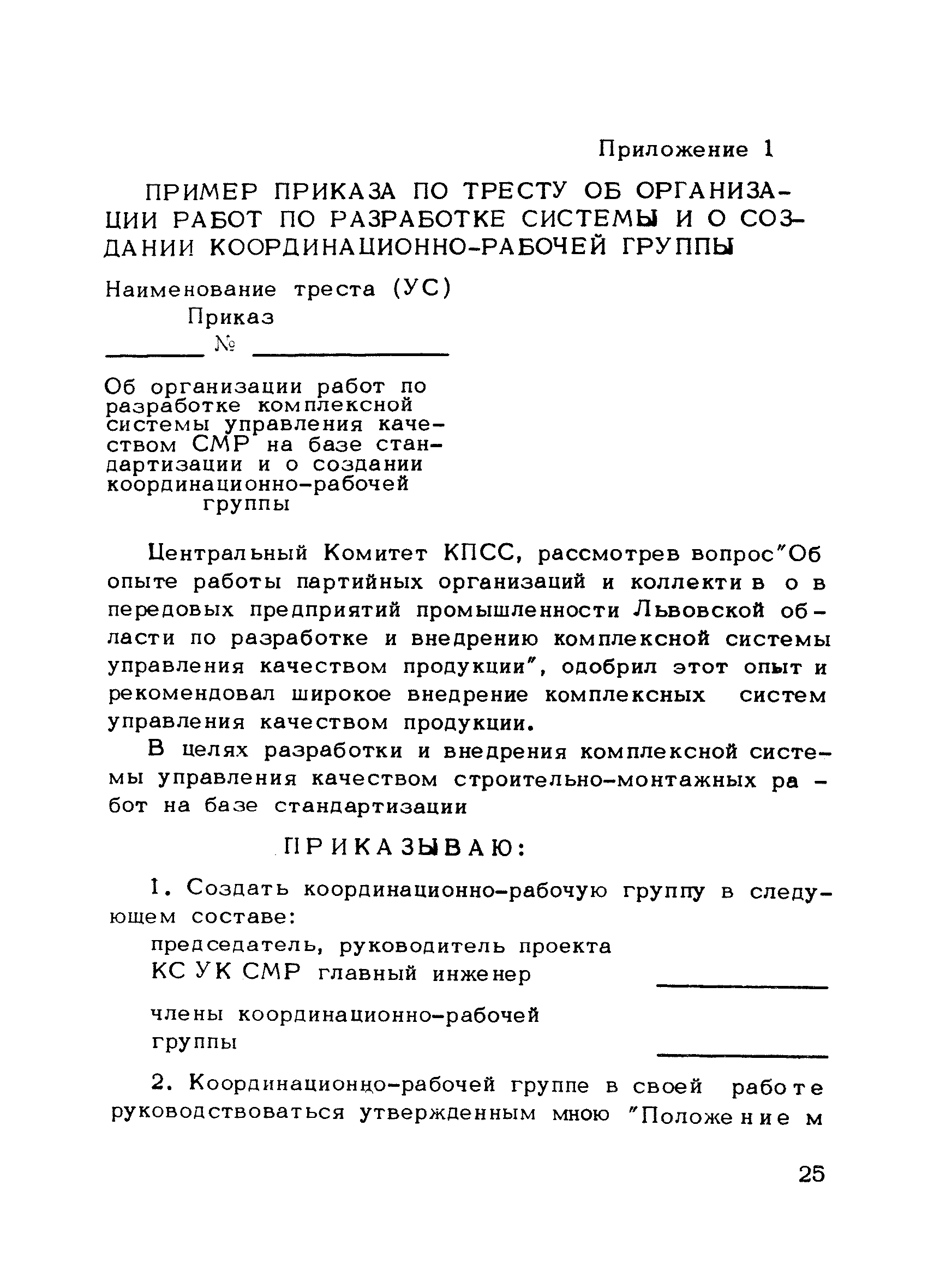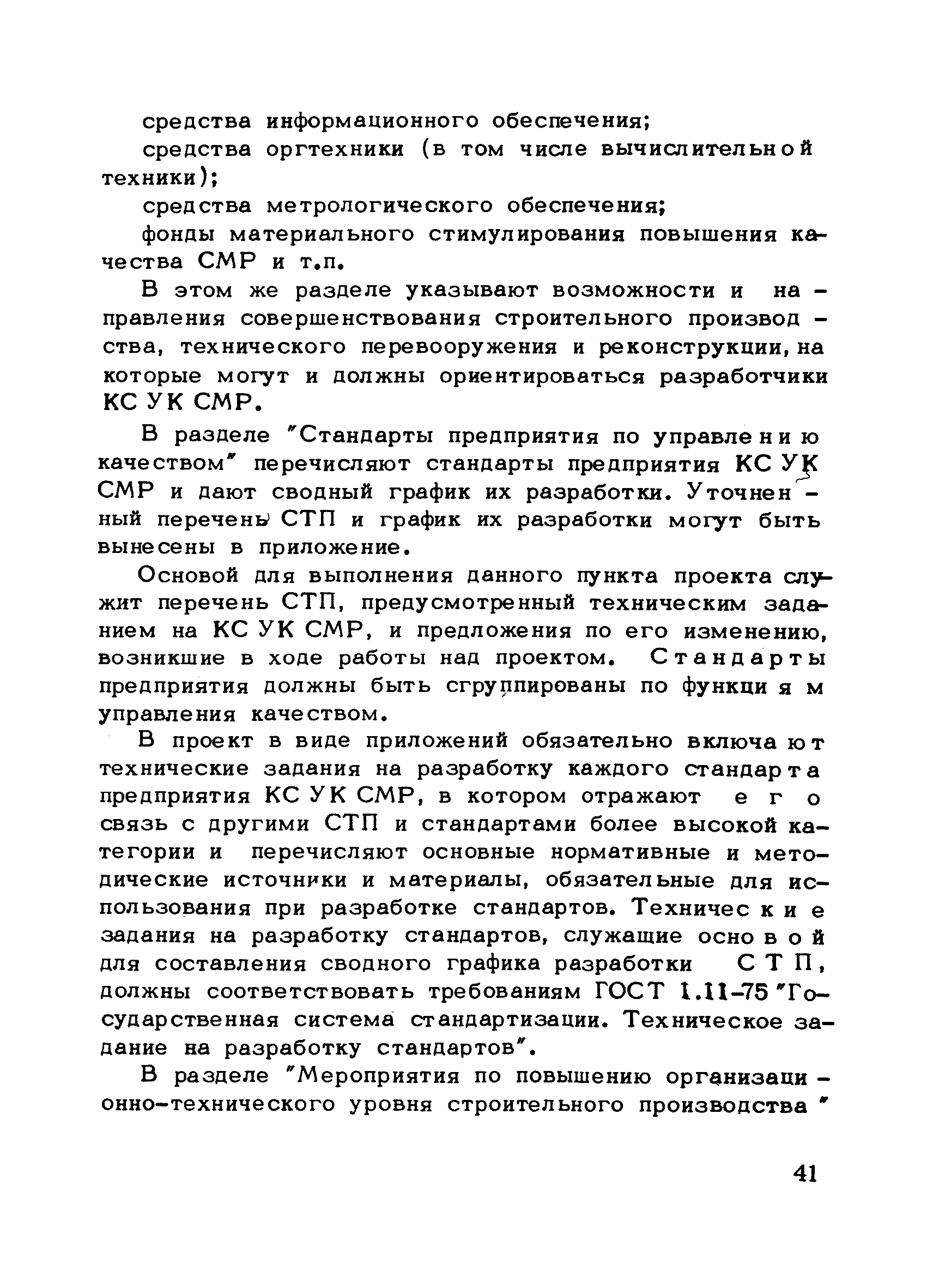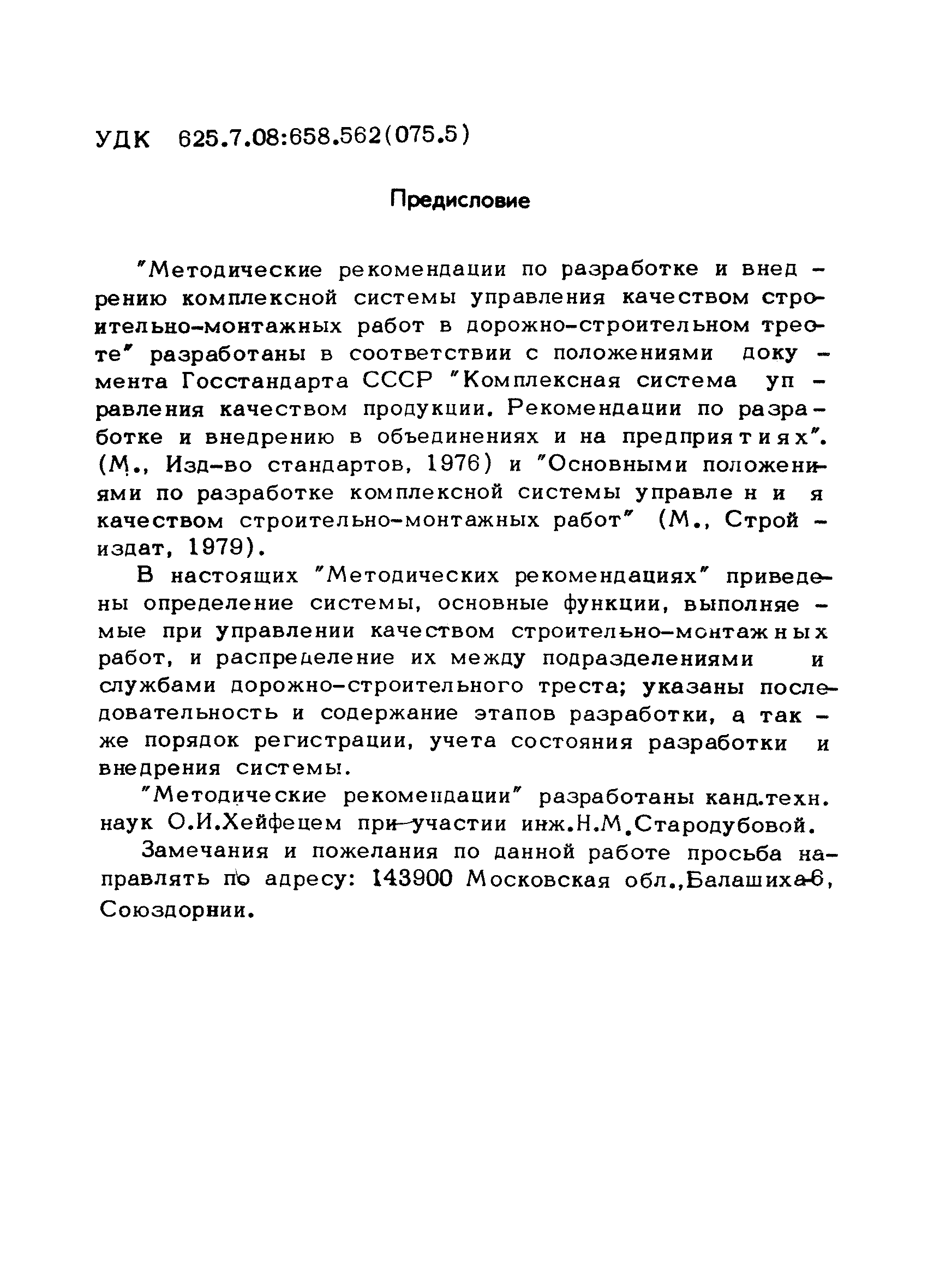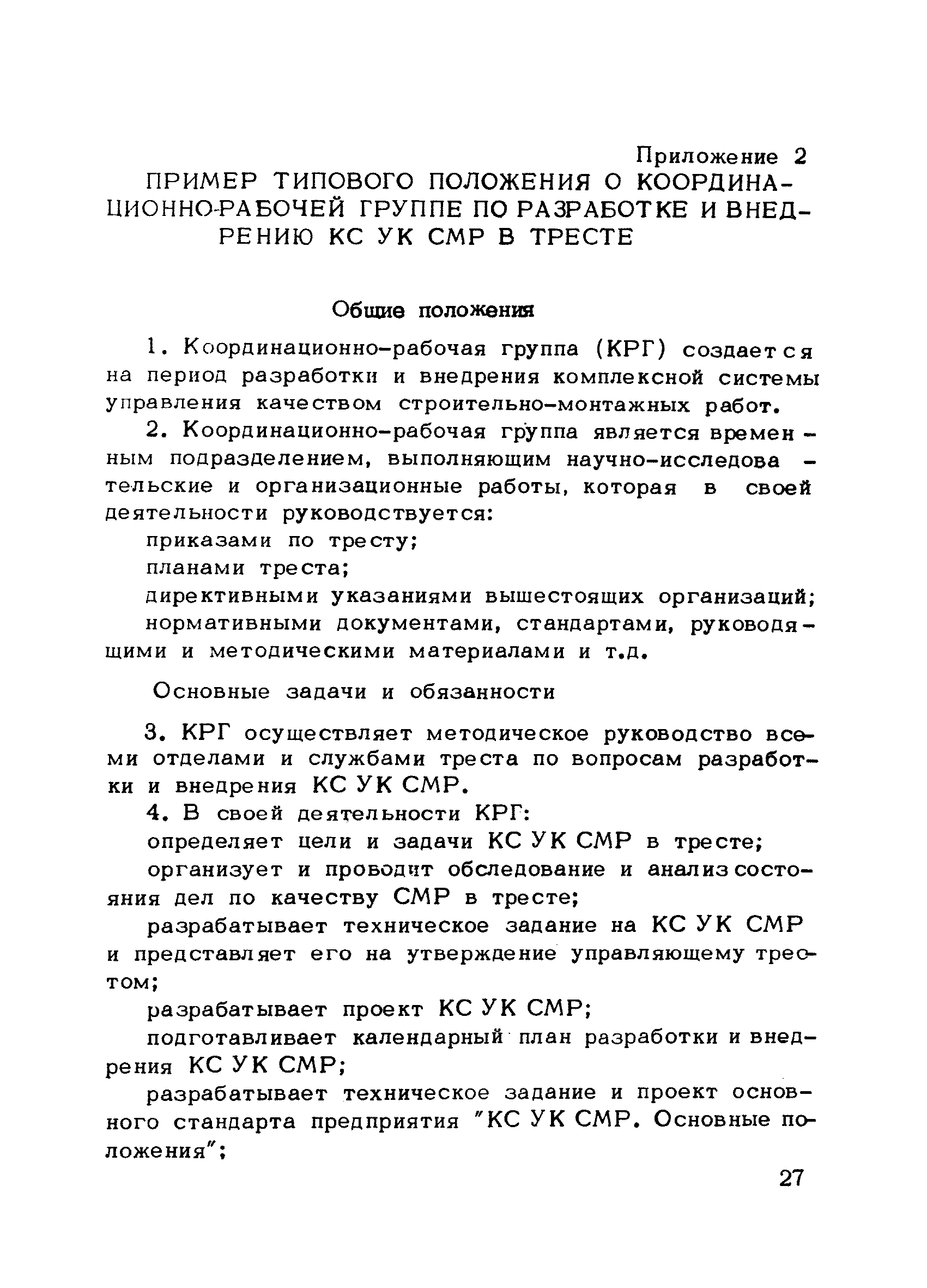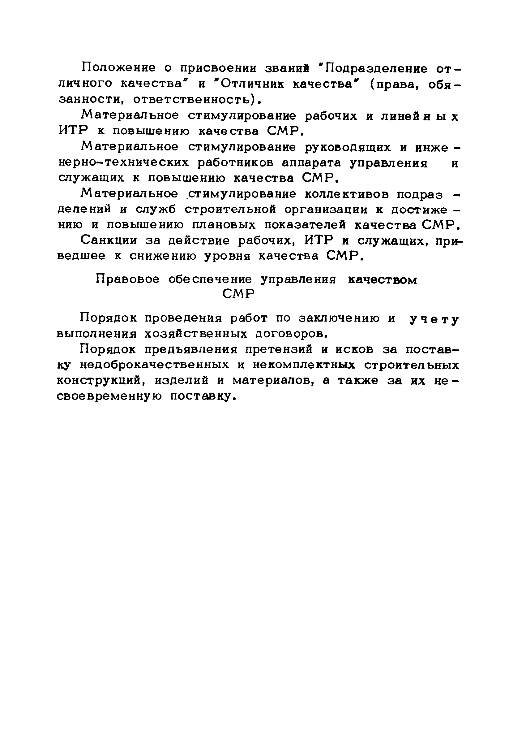 | Оглавление: | Предисловие 1. Общие положения 2. Структура и функции КС УК СМР в тресте 3. Организация управления качеством СМР в тресте 4. Порядок разработки и внедрения КС УК СМР 5. Рекомендации по разработке стандартов предприятия КС УК СМР 6. Порядок регистрации и учета состояния разработки и внедрения КС УК СМР Приложение 1. Пример приказа по тресту об организации работ по разработке системы и о создании координационно-рабочей группы Приложение 2. Пример типового положения о координационно—рабочей группе по разработке и внедрению КС УК СМР в тресте Приложение 3. Пример программы технической учебы руководителей и ведущих специалистов треста Приложение 4. Примерная программа анализа состояния дел по качеству в трестах Приложение 5. Требования к техническому заданию на разработку КС УК СМР Приложение 6. Состав и содержание проекта КС УК СМР Приложение 7. Пример приказа по тресту о разработке стандартов предприятия КС УК СМР Приложение 8. Пример приказа по тресту о внедрении стандартов предприятия Приложение 9. Требования к построению и содержанию стандартов предприятия Приложение 10. Примерный перечень стандартов предприятия КС УК СМР Приложение 11. Форма акта внедрения КС УК СМР Приложение 12. Бланк-сигнал учета КС УК СМР |