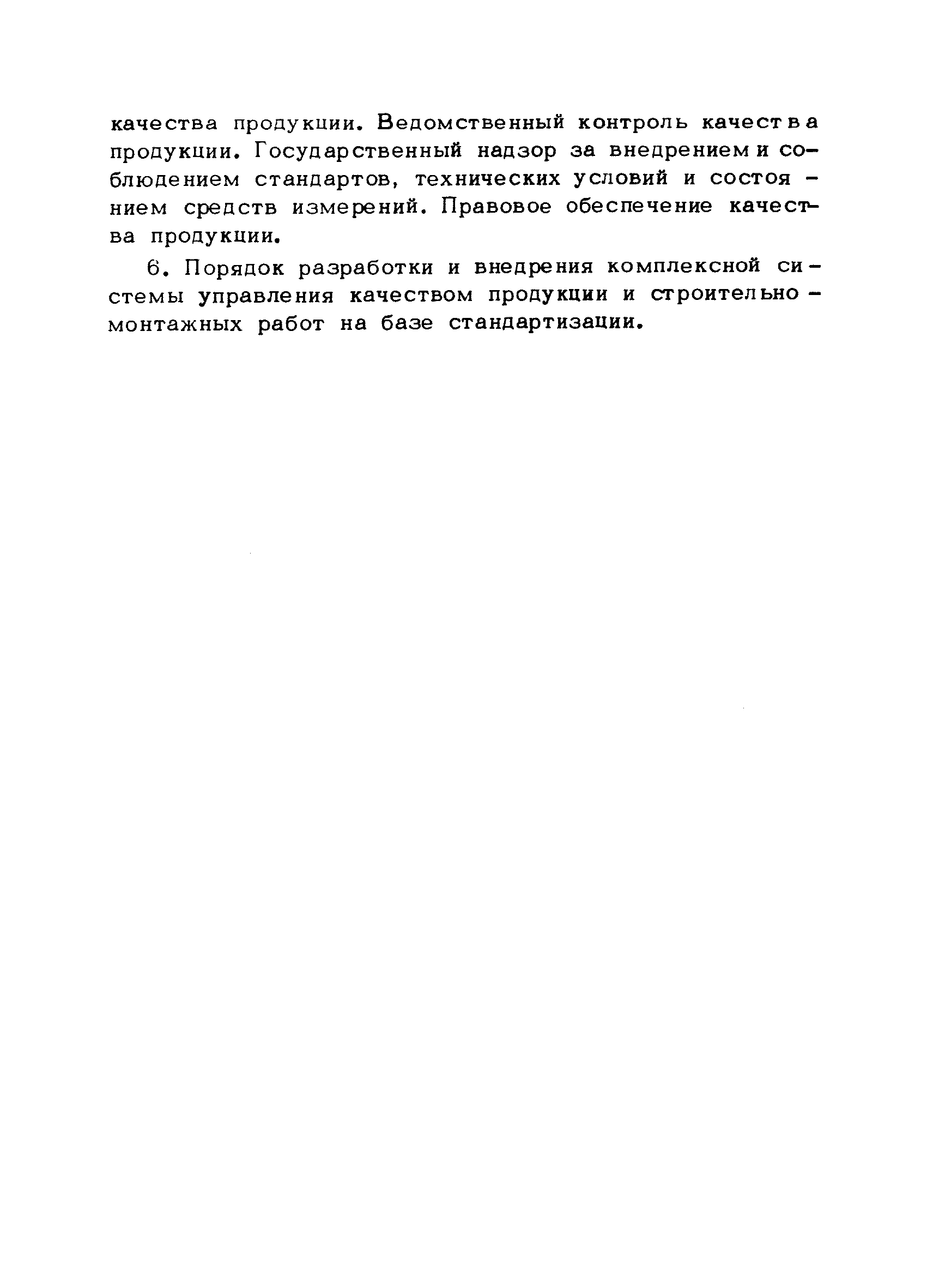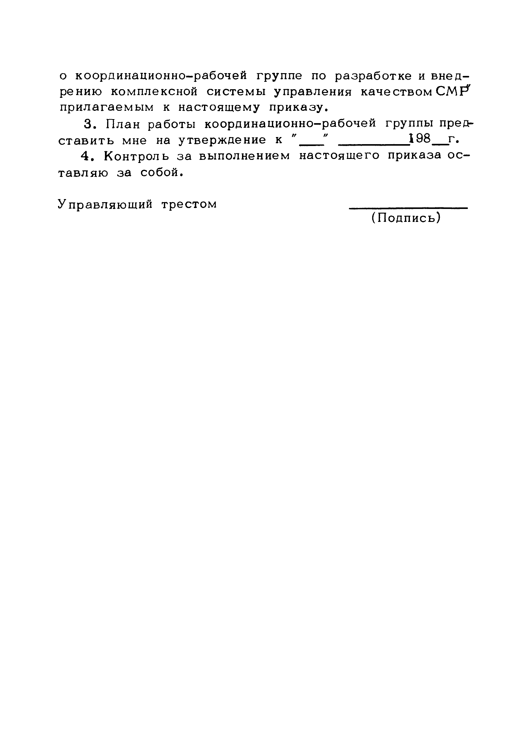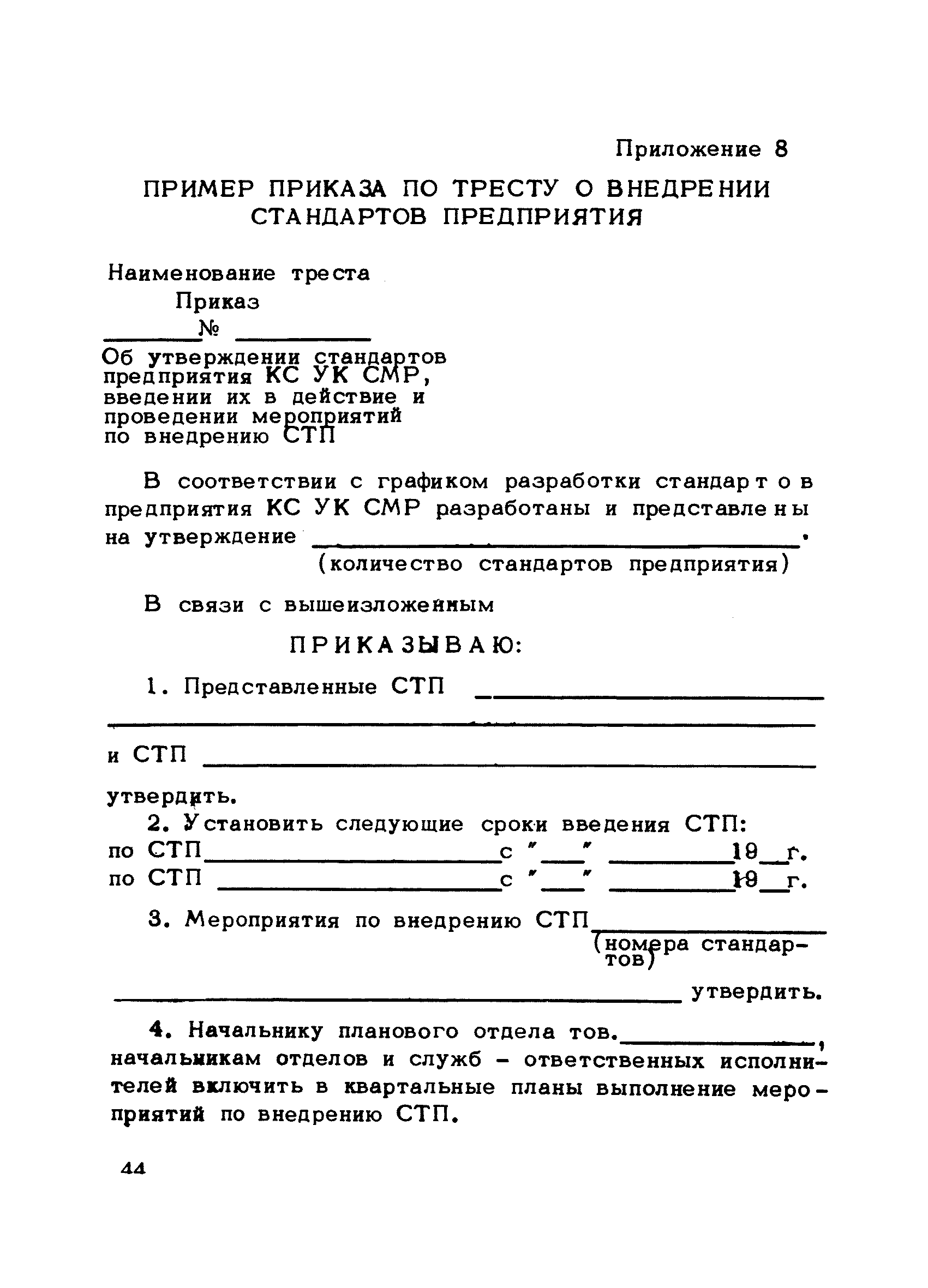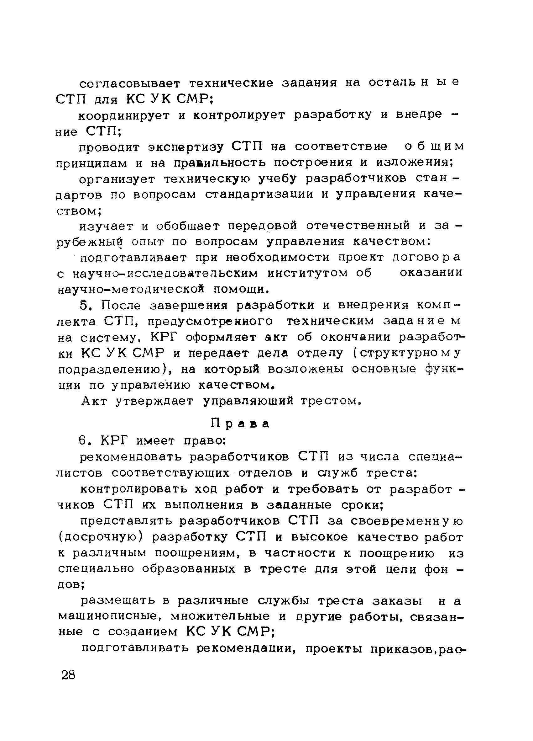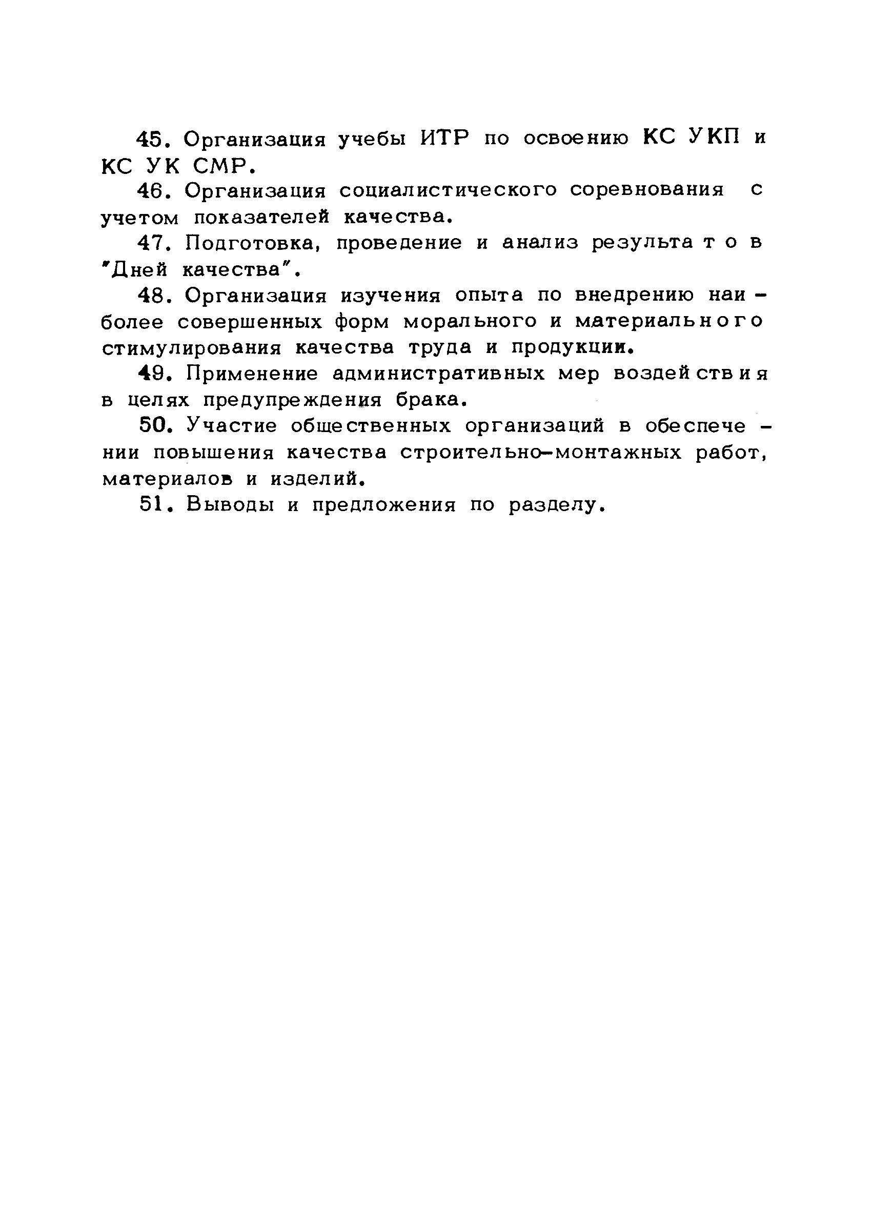 | Оглавление: | Предисловие 1. Общие положения 2. Структура и функции КС УК СМР в тресте 3. Организация управления качеством СМР в тресте 4. Порядок разработки и внедрения КС УК СМР 5. Рекомендации по разработке стандартов предприятия КС УК СМР 6. Порядок регистрации и учета состояния разработки и внедрения КС УК СМР Приложение 1. Пример приказа по тресту об организации работ по разработке системы и о создании координационно-рабочей группы Приложение 2. Пример типового положения о координационно—рабочей группе по разработке и внедрению КС УК СМР в тресте Приложение 3. Пример программы технической учебы руководителей и ведущих специалистов треста Приложение 4. Примерная программа анализа состояния дел по качеству в трестах Приложение 5. Требования к техническому заданию на разработку КС УК СМР Приложение 6. Состав и содержание проекта КС УК СМР Приложение 7. Пример приказа по тресту о разработке стандартов предприятия КС УК СМР Приложение 8. Пример приказа по тресту о внедрении стандартов предприятия Приложение 9. Требования к построению и содержанию стандартов предприятия Приложение 10. Примерный перечень стандартов предприятия КС УК СМР Приложение 11. Форма акта внедрения КС УК СМР Приложение 12. Бланк-сигнал учета КС УК СМР |
