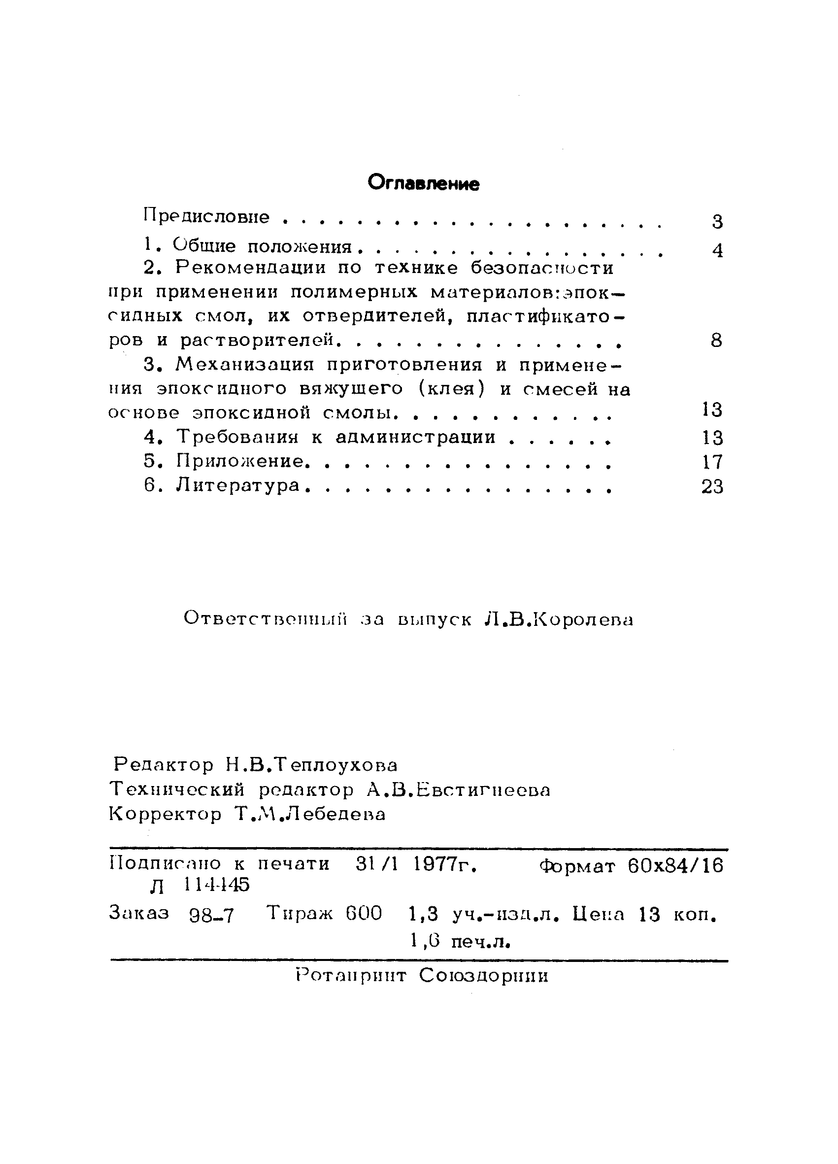 | Оглавление: | Предисловие 1. Общие положения 2. Рекомендации по технике безопасности при применении полимерных материалов: эпоксидных смол, их отвердителей, пластификаторов и растворителей 3. Механизация приготовления и применения эпоксидного вяжущего (клея) и смесей на основе эпоксидной смолы 4. Требования к администрации 5. Приложение 6. Литература |