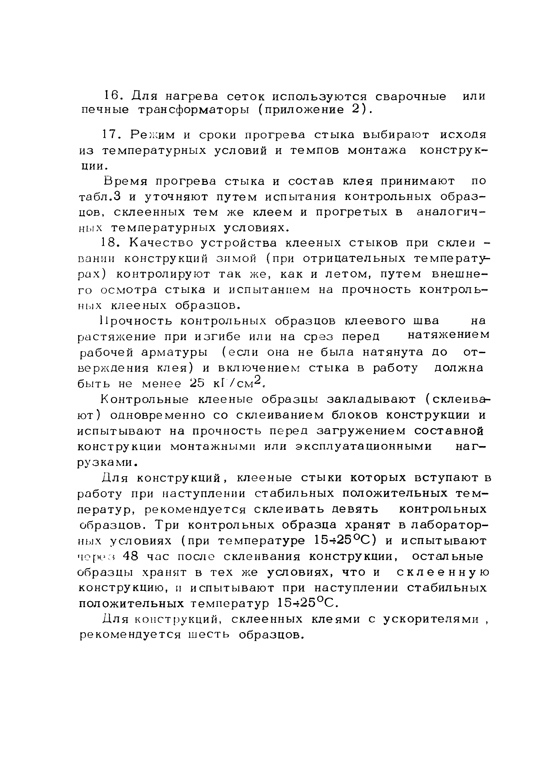 | Оглавление: | Особенности устройства клееных стыков при низких положительных и отрицательных температурах и составы эпоксидных клеев Приготовление и нанесения клея на стыкуемые поверхности блоков Устройство стыков с обогревом клея электросетками Приложение 1. Теплотехнические расчеты, связанные с обогревом клееных стыков составных конструкций Приложение 2. Оборудование для электропрогрева конструкций Приложение 3. Пример расчета количества тепла и оборудования, конструирование нагревательных элементов (сеток, спиралей) при электропрогреве клееных стыков |