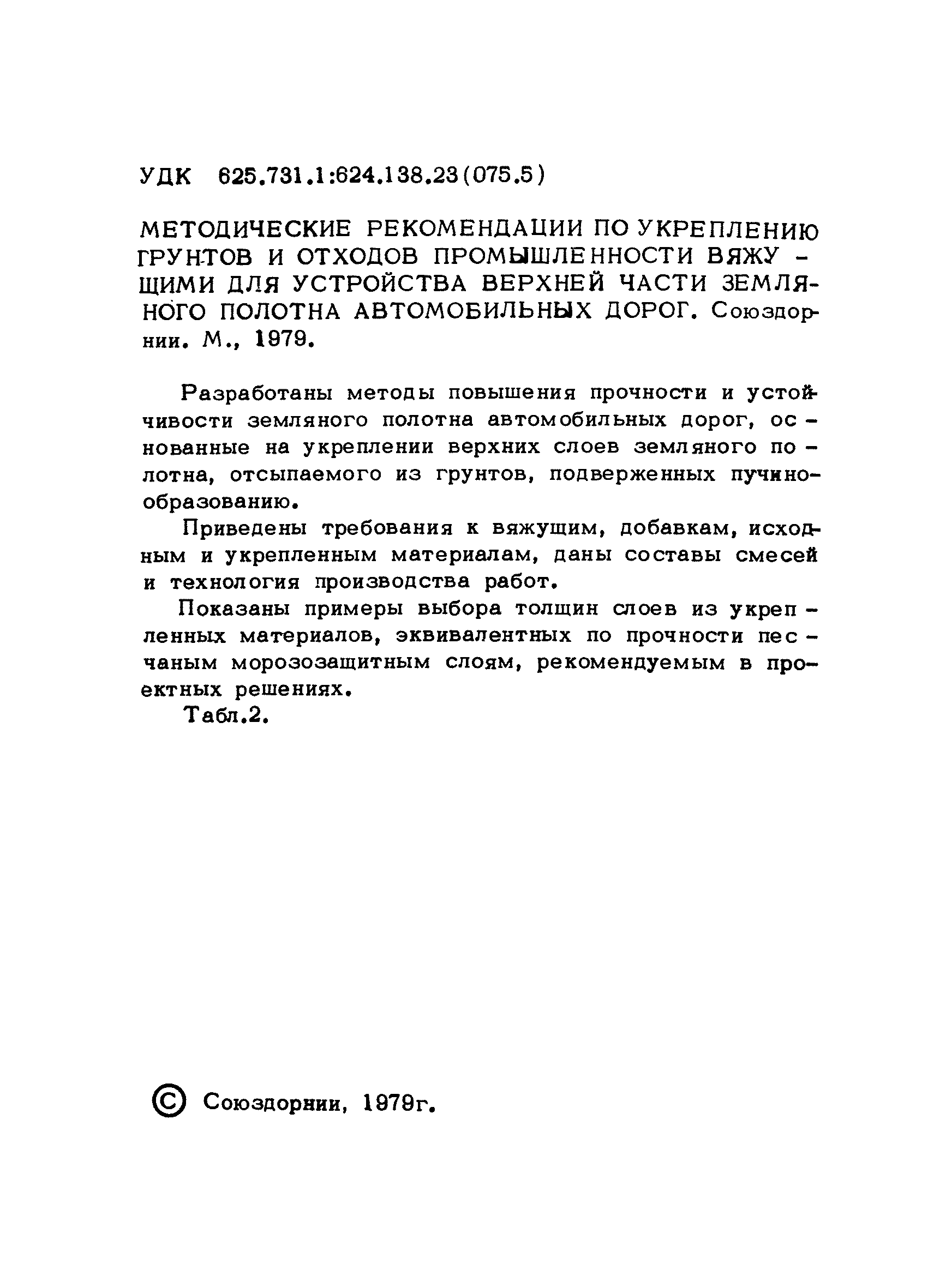 | Название рус.: | Методические рекомендации по укреплению грунтов и отходов промышленности вяжущими для устройства верхней части земляного полотна автомобильных дорог |