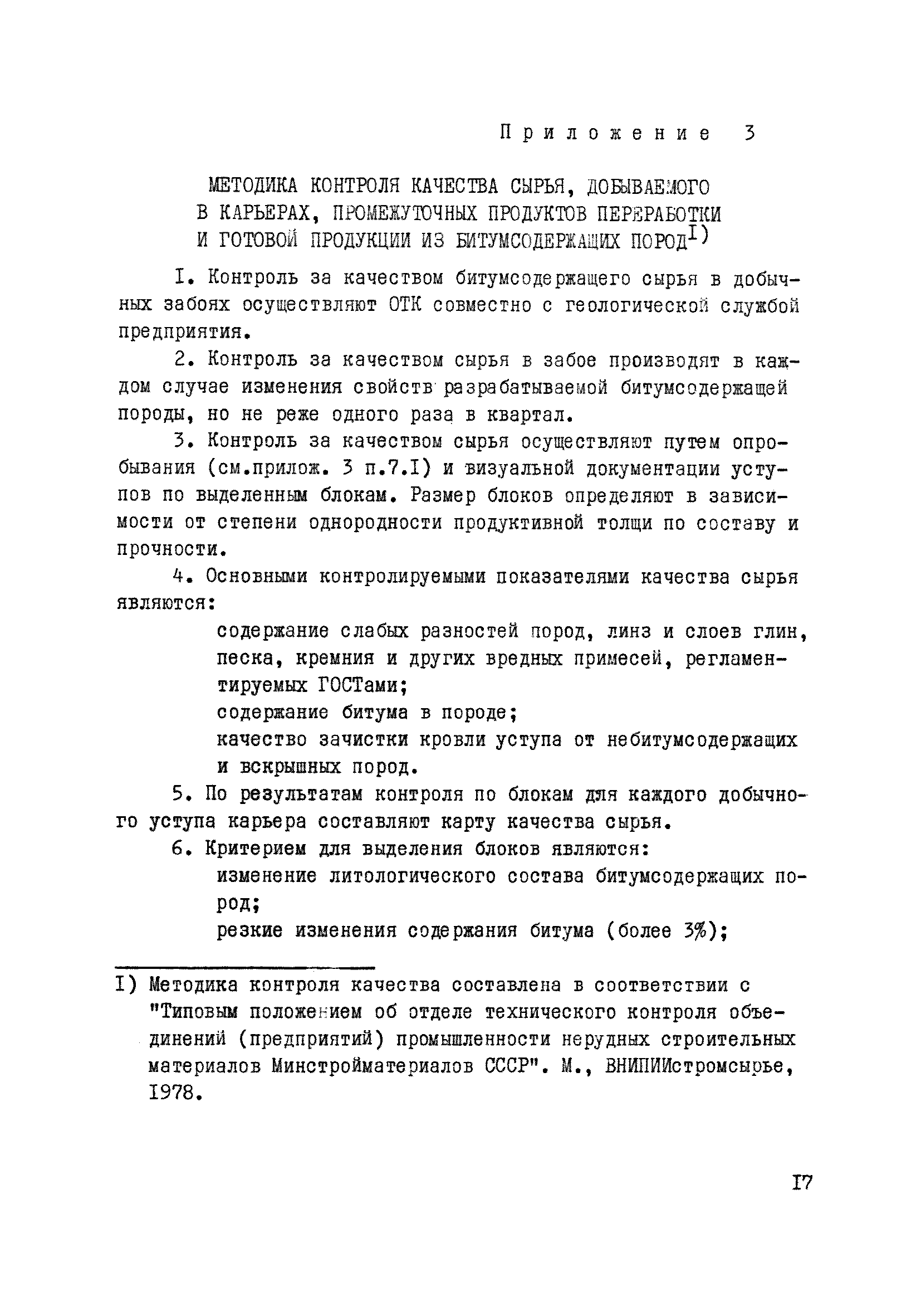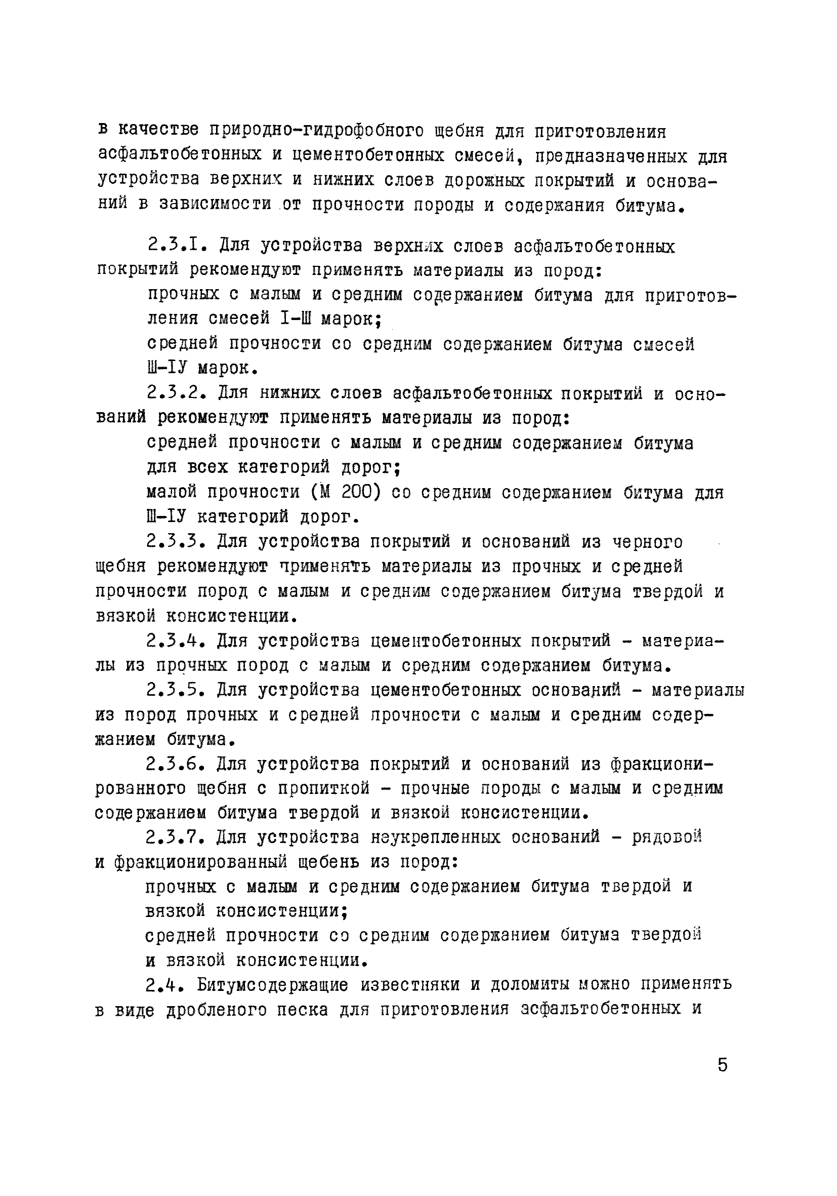 | Оглавление: | 1. Общие положения 2. Области применения битумсодержащих известняков и доломитов 3. Требования к битумсодержащим известнякам и доломитам, смесям из них для применения в дорожной одежде 4. Проектирование составов смесей с использованием битумсодержащих известняков и доломитов. Методы испытаний 5. Способы производства работ в дорожном строительстве при применении битумсодержащих известняков и доломитов 6. Контроль производства работ 7. Экономическая эффективность применения битумсодержащих известняков и доломитов Приложение 1. Рекомендуемые конструкции дорожных одежд из битумсодержащих известняков и доломитов Приложение 2. Расчетные значения модулей упругости конструктивных слоев дорожных одежд, устраиваемых с использованием битумсодержащих известняков и доломитов Приложение 3. Методика контроля качества сырья, добываемого в карьерах, промежуточных продуктов переработки и готовой продукции из битумсодержащих пород Приложение 4. Государственные стандарты и инструкции, используемые при составлении "Руководства" |