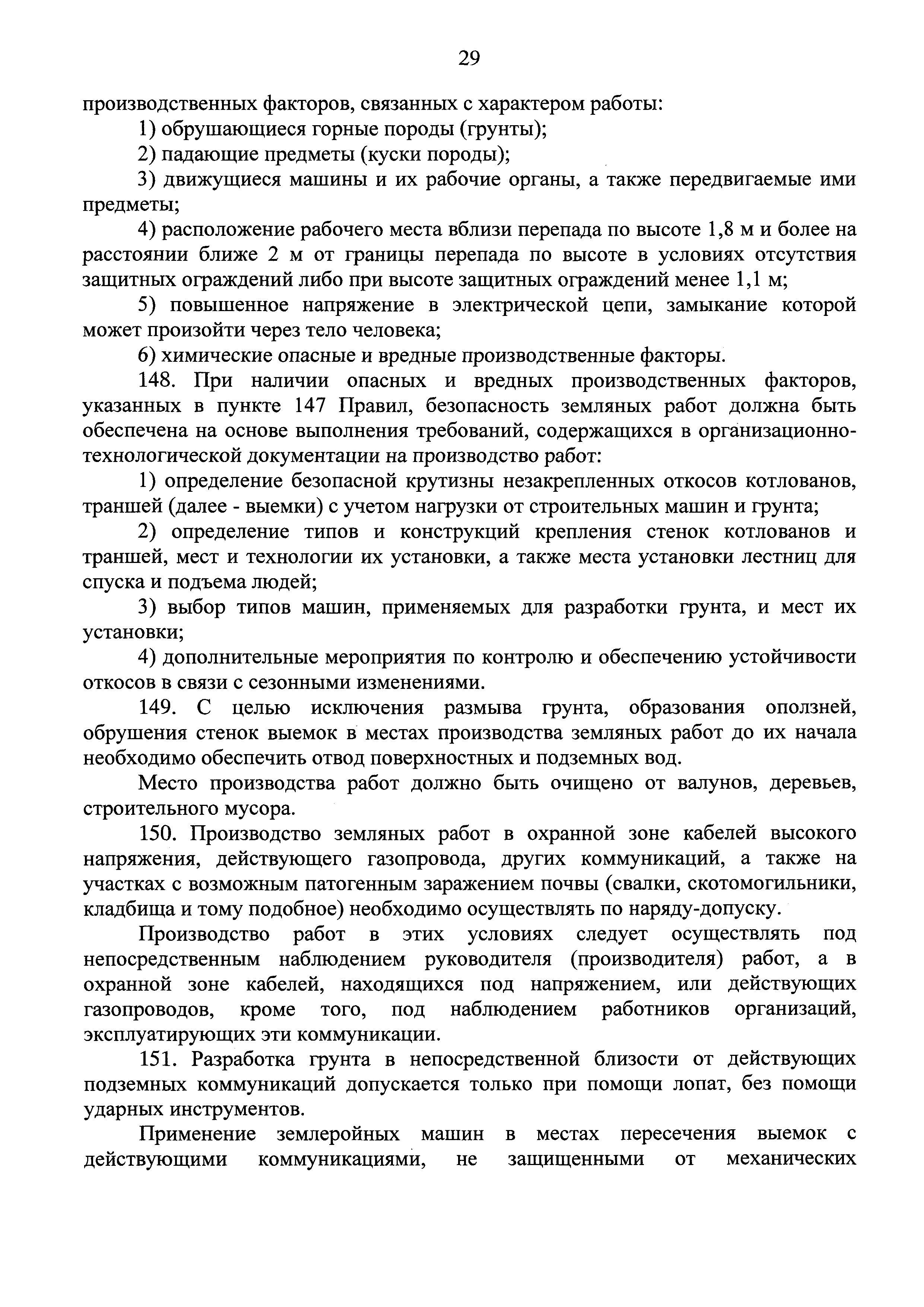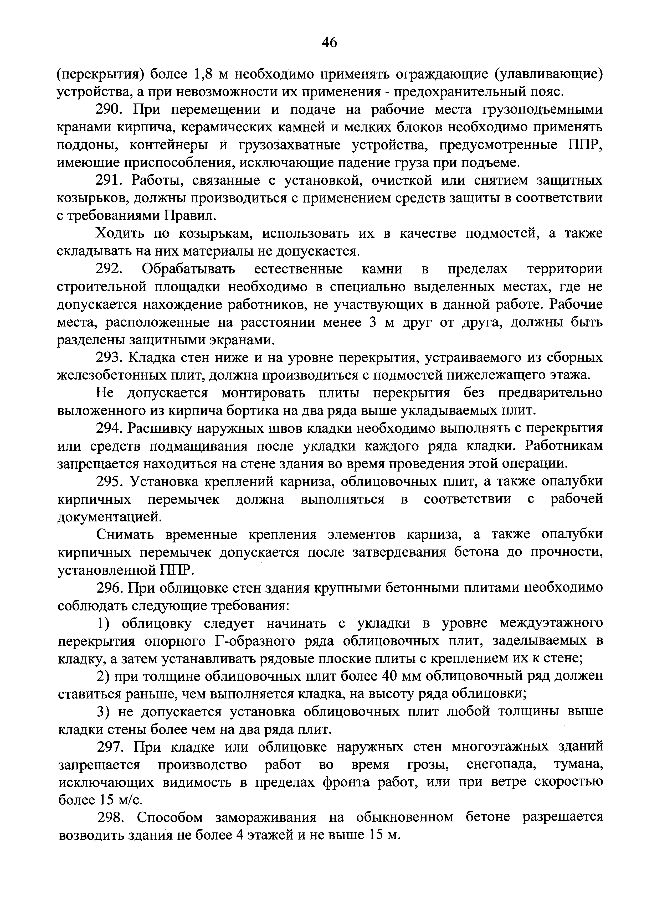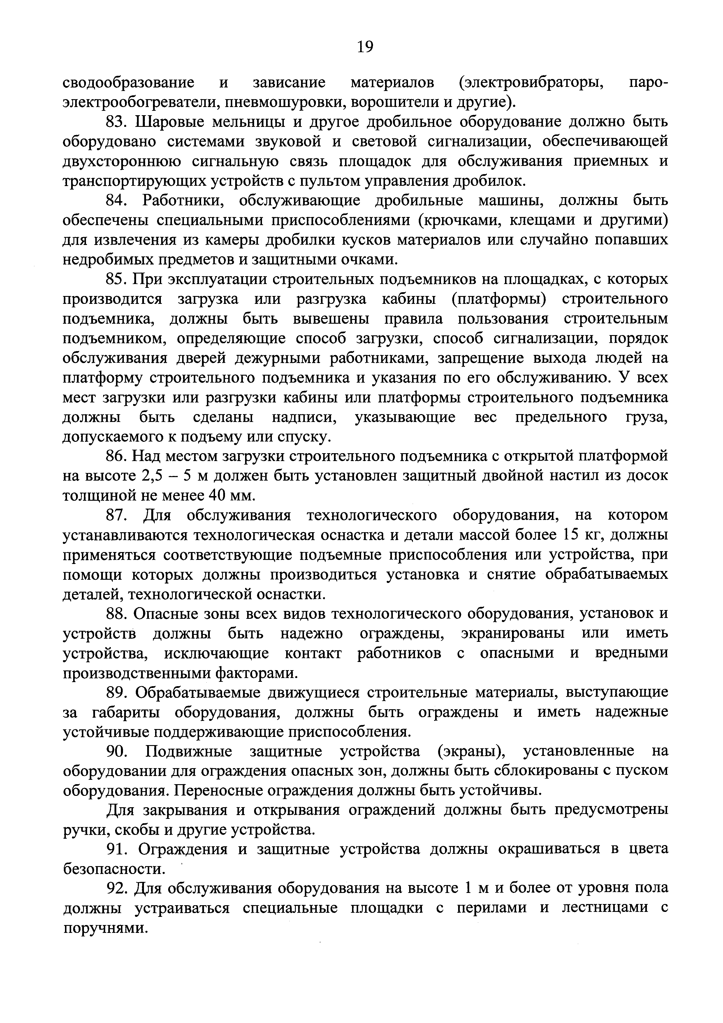 | | Нормативные ссылки: |  Постановление 105 «О новых нормах предельно допустимых нагрузок для женщин при подъеме и перемещении тяжестей вручную» Постановление 7 «Нормы предельно допустимых нагрузок для лиц, моложе 18 лет при подъеме и перемещении тяжестей вручную» Постановление 1/29 «Об утверждении Порядка обучения по охране труда и проверки знаний требований охраны труда работников организаций» Кодекс «Трудовой кодекс Российской Федерации» «Межотраслевые правила обеспечения работников специальной одеждой, специальной обувью и другими средствами индивидуальной защиты» «Перечень тяжелых работ и работ с вредными или опасными условиями труда, при выполнении которых запрещается применение труда лиц моложе восемнадцати лет»  «Перечень тяжелых работ и работ с вредными или опасными условиями труда, при выполнении которых запрещается применение труда женщин» Приказ 302н «Об утверждении перечней вредных и (или) опасных производственных факторов и работ, при выполнении которых проводятся обязательные предварительные и периодические медицинские осмотры (обследования), и Порядка проведения обязательных предварительных и периодических медицинских осмотров (обследований) работников, занятых на тяжелых работах и на работах с вредными и (или) опасными условиями труда» «Порядок выдачи специального разрешения на движение по автомобильным дорогам транспортного средства, осуществляющего перевозки тяжеловесных и (или) крупногабаритных грузов»  «Правила по охране труда при эксплуатации электроустановок»  «Федеральные нормы и правила в области промышленной безопасности "Правила безопасности при взрывных работах"»  «Правила по охране труда при работе на высоте» Приказ 224 «О санитарно-эпидемиологических экспертизах, обследованиях, исследованиях, испытаниях и токсикологических, гигиенических и иных видах оценок»  Решение 823 «О принятии технического регламента Таможенного союза "О безопасности машин и оборудования"»  ПТЭ «Правила технической эксплуатации электроустановок потребителей»  Технический регламент Таможенного союза 032/2013 «О безопасности оборудования, работающего под избыточным давлением» Приказ 7 «Об утверждении Правил обеспечения безопасности перевозок пассажиров и грузов автомобильным транспортом и городским наземным электрическим транспортом и Перечня мероприятий по подготовке работников юридических лиц и индивидуальных предпринимателей, осуществляющих перевозки автомобильным транспортом и городским наземным электрическим транспортом, к безопасной работе и транспортных средств к безопасной эксплуатации» «Правила по охране труда при погрузочно-разгрузочных работах и размещении грузов» «Требования к комплектации изделиями медицинского назначения аптечек для оказания первой помощи работникам» «Положение о Министерстве труда и социальной защиты Российской Федерации»  СанПиН 2.1.4.1074-01 «Питьевая вода. Гигиенические требования к качеству воды централизованных систем питьевого водоснабжения. Контроль качества. Гигиенические требования к обеспечению безопасности систем горячего водоснабжения»