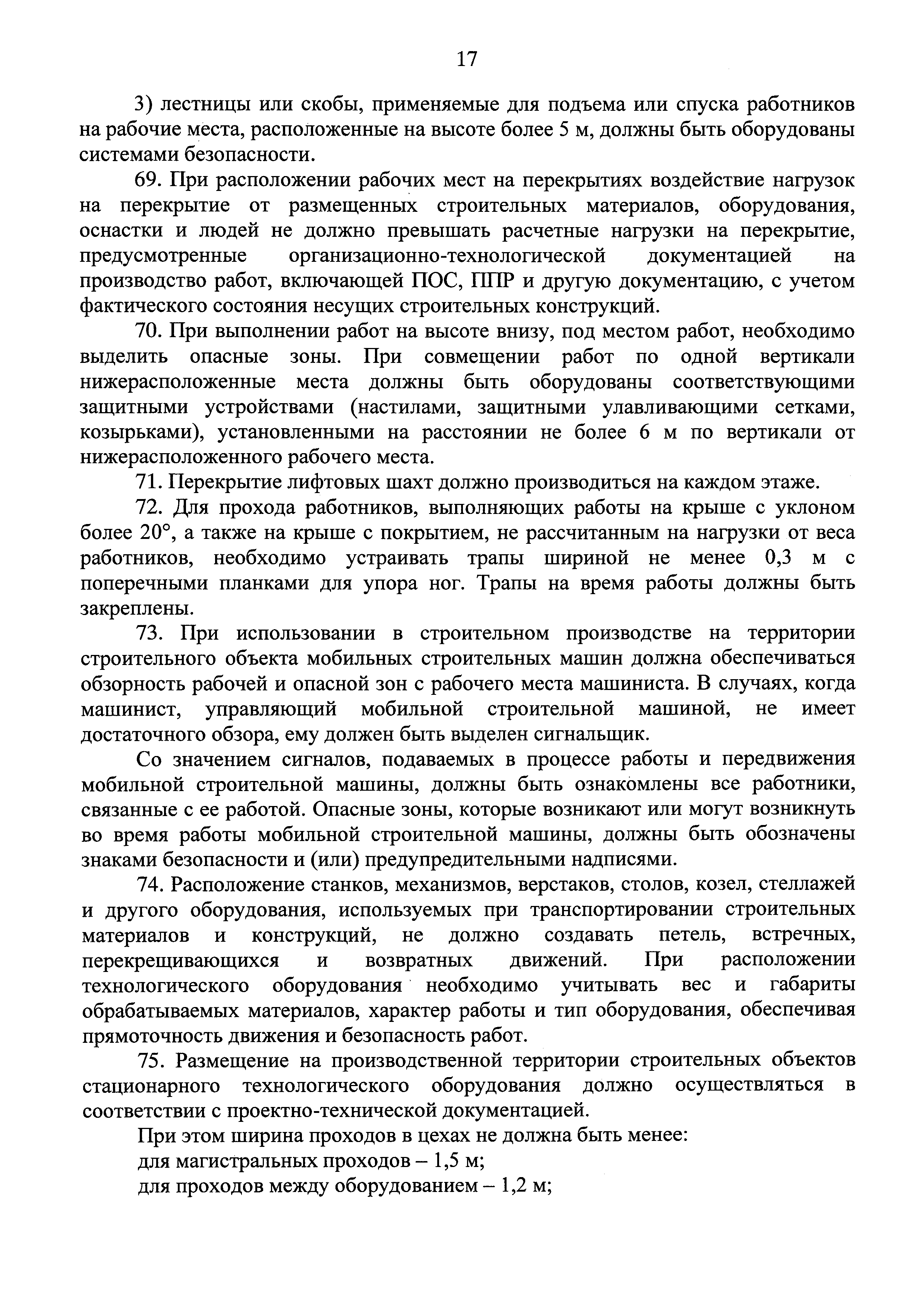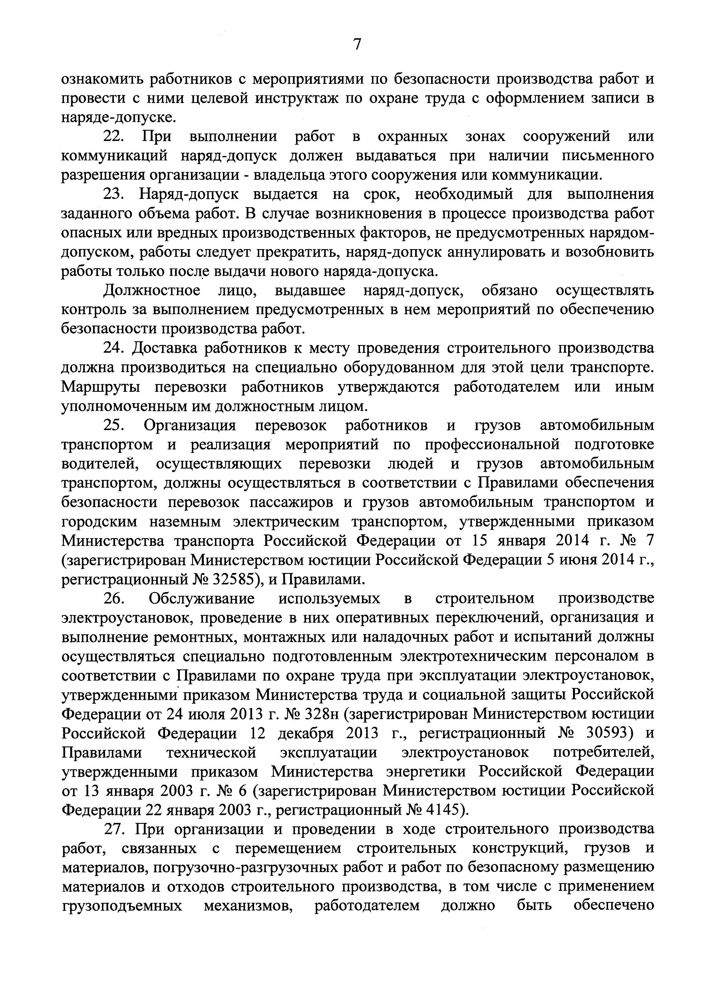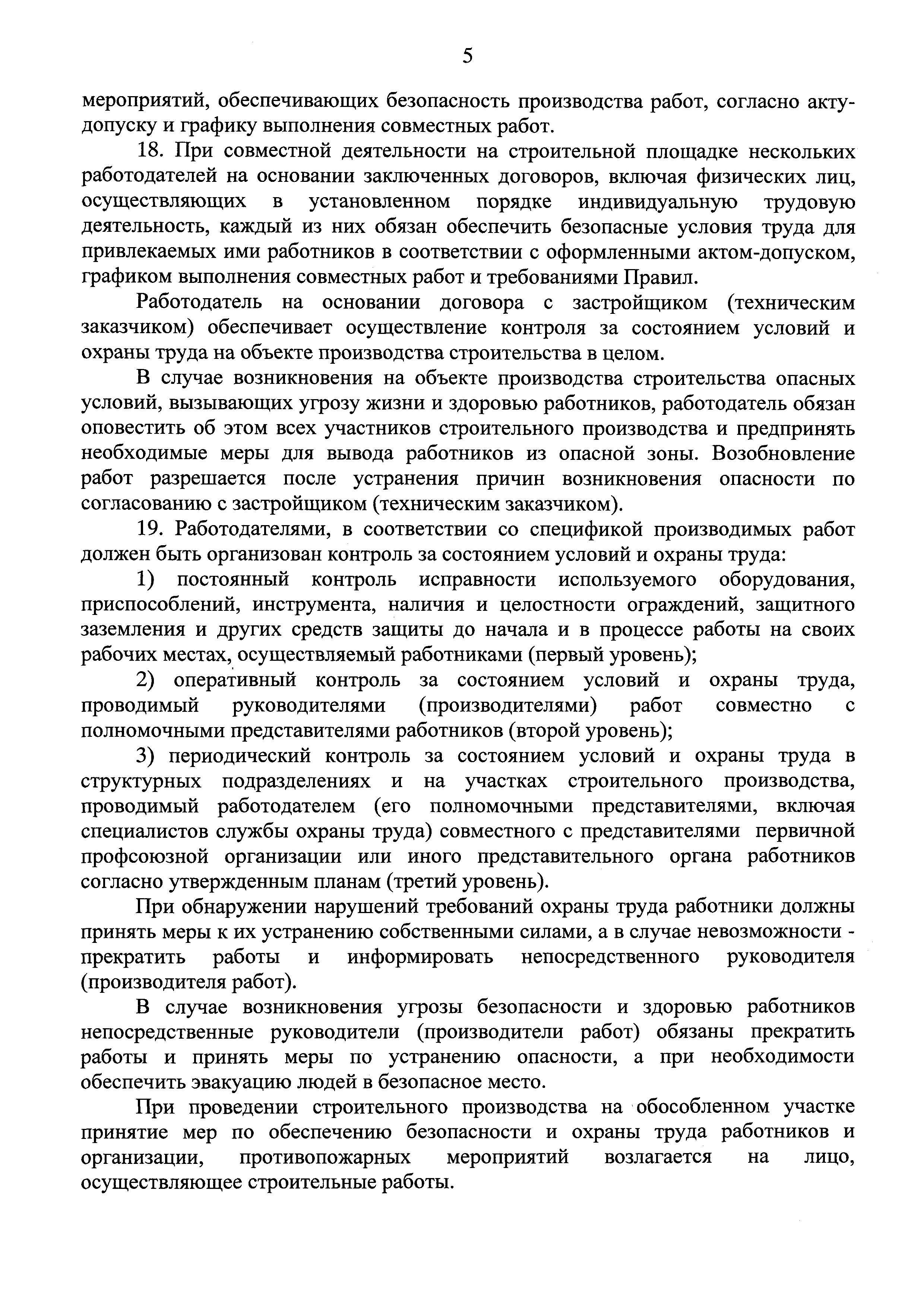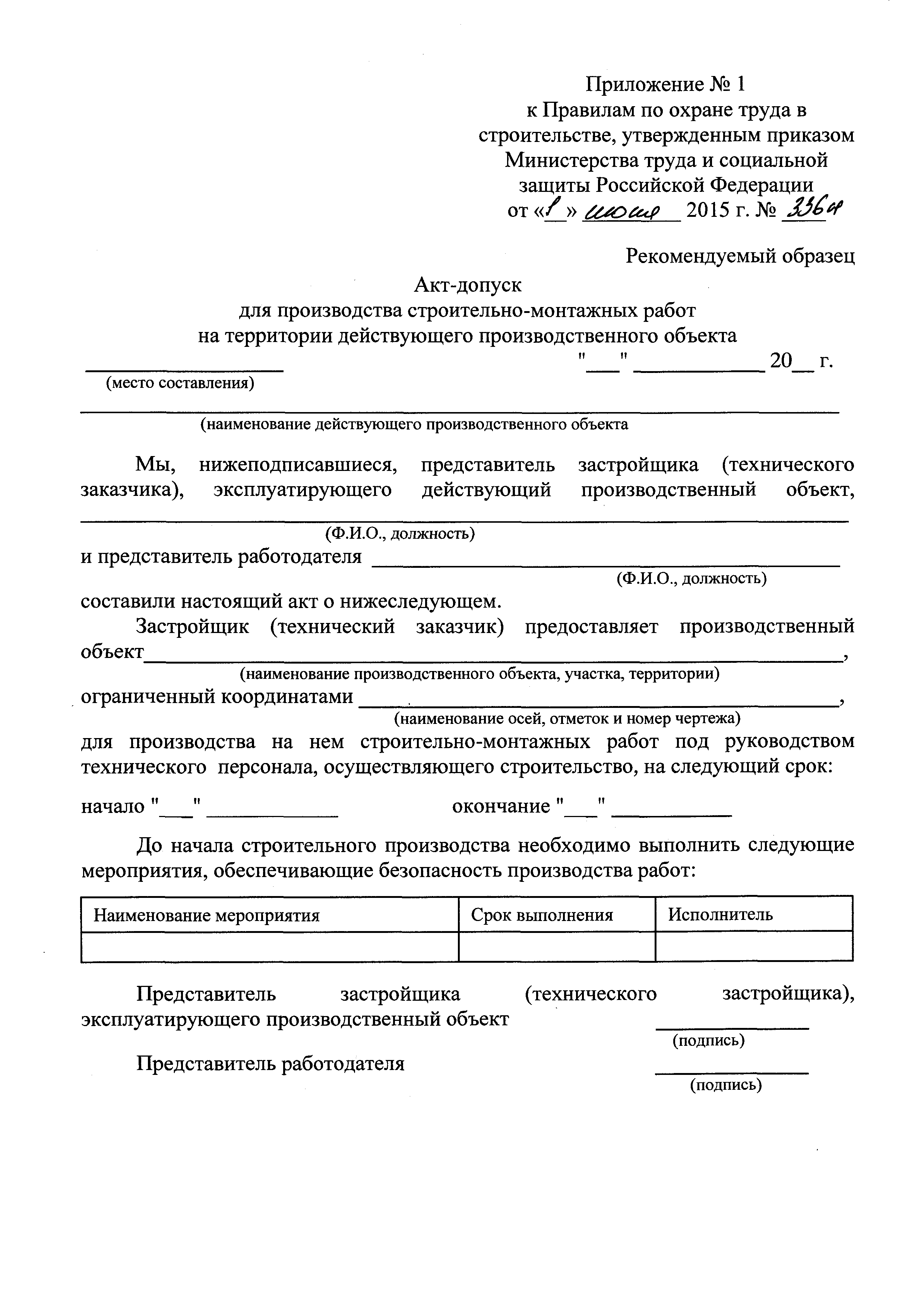 Правила по охране труда в строительстве| Статус: | действует | | Название рус.: | Правила по охране труда в строительстве | | Дата добавления в базу: | 12.02.2016 | | Дата актуализации: | 01.01.2021 | | Дата введения: | 28.08.2015 | | Область применения: | Правила по охране труда в строительстве устанавливают государственные нормативные требования охраны труда при проведении общестроительных и специальных строительных работ, выполняемых при новом строительстве, расширении, реконструкции, техническом перевооружении, текущем и капитальном ремонте зданий и сооружений | | Оглавление: | I. Общие положения II. Требования охраны труда при организации проведения работ (производственных процессов) в строительном производстве III. Требования охраны труда, предъявляемые к производственным территориям (помещениям, площадкам и участкам работ) и организации рабочих мест IV. Требования охраны труда при проведении производственных процессов и эксплуатации технологического оборудования в строительном производстве V. Требования охраны труда, предъявляемые к транспортированию (перемещению) и хранению строительных конструкций, материалов, заготовок и отходов строительного производства Приложение № 1. Акт-допуск для производства строительно-монтажных работ на территории действующего производственного объекта Приложение № 2. Наряд-допуск на производство работ в местах действия вредных и опасных производственных факторов Приложение № 3. Акт о соответствии выполненных внеплощадочных и внутриплощадочных подготовительных работ требованиям безопасности труда и готовности объекта к началу строительства Приложение № 4. Крутизна откосов в зависимости от вида грунта | | Утверждён: | 01.06.2015 Министерство труда и социальной защиты РФ (336н)
