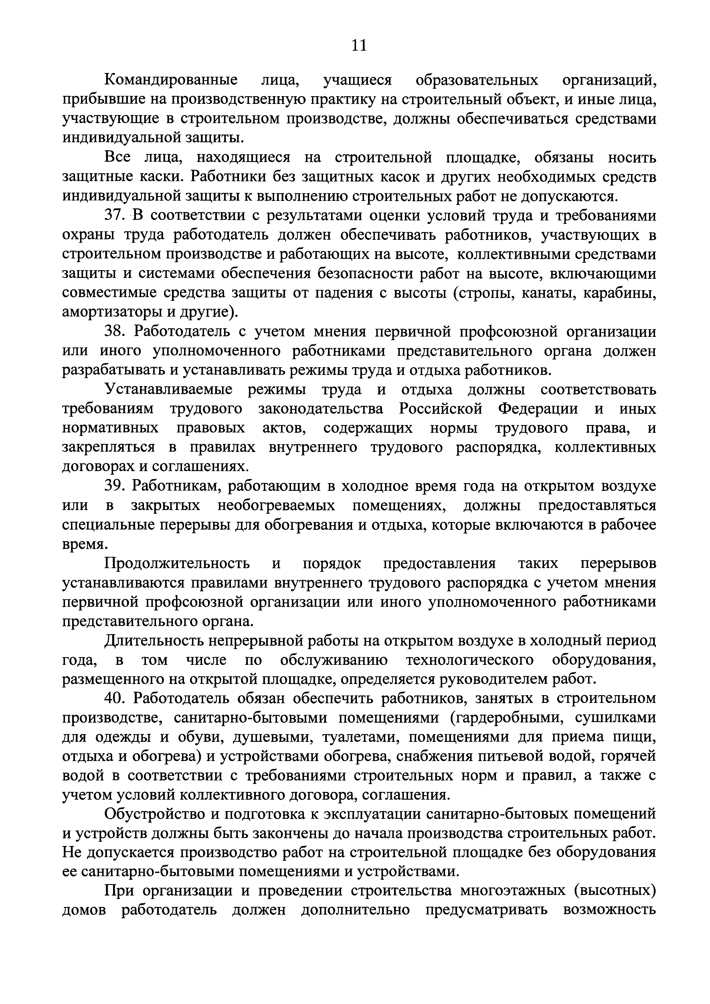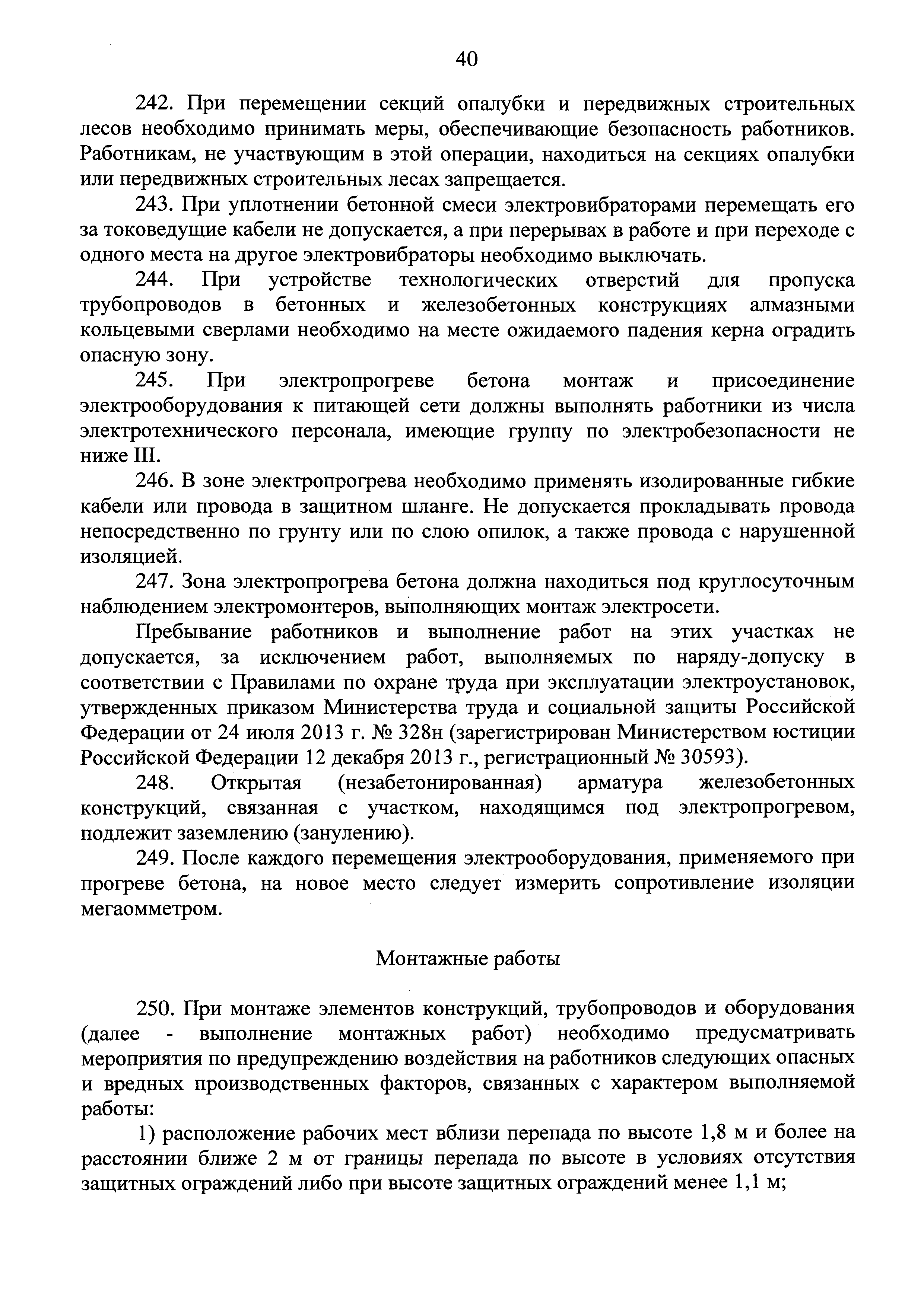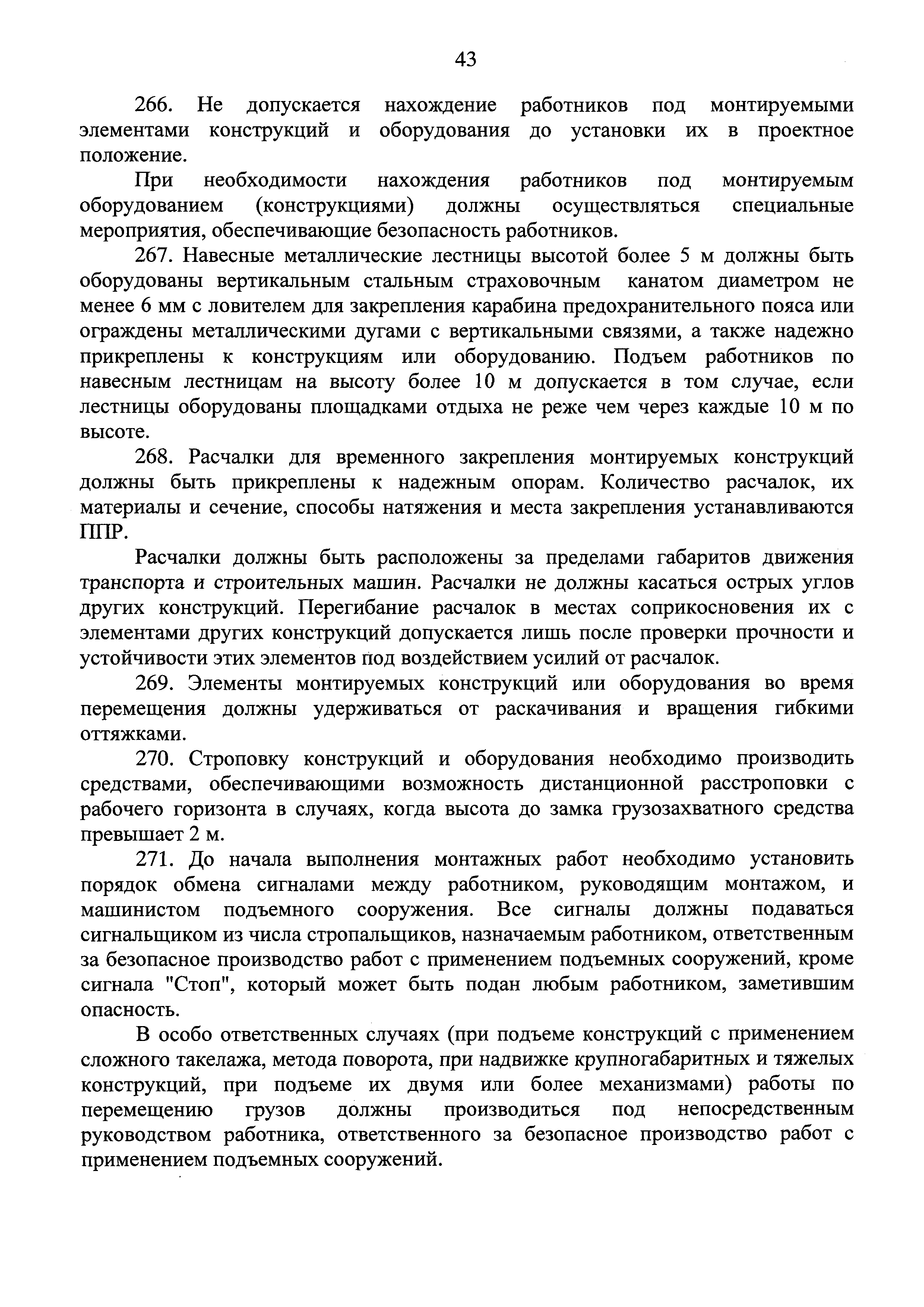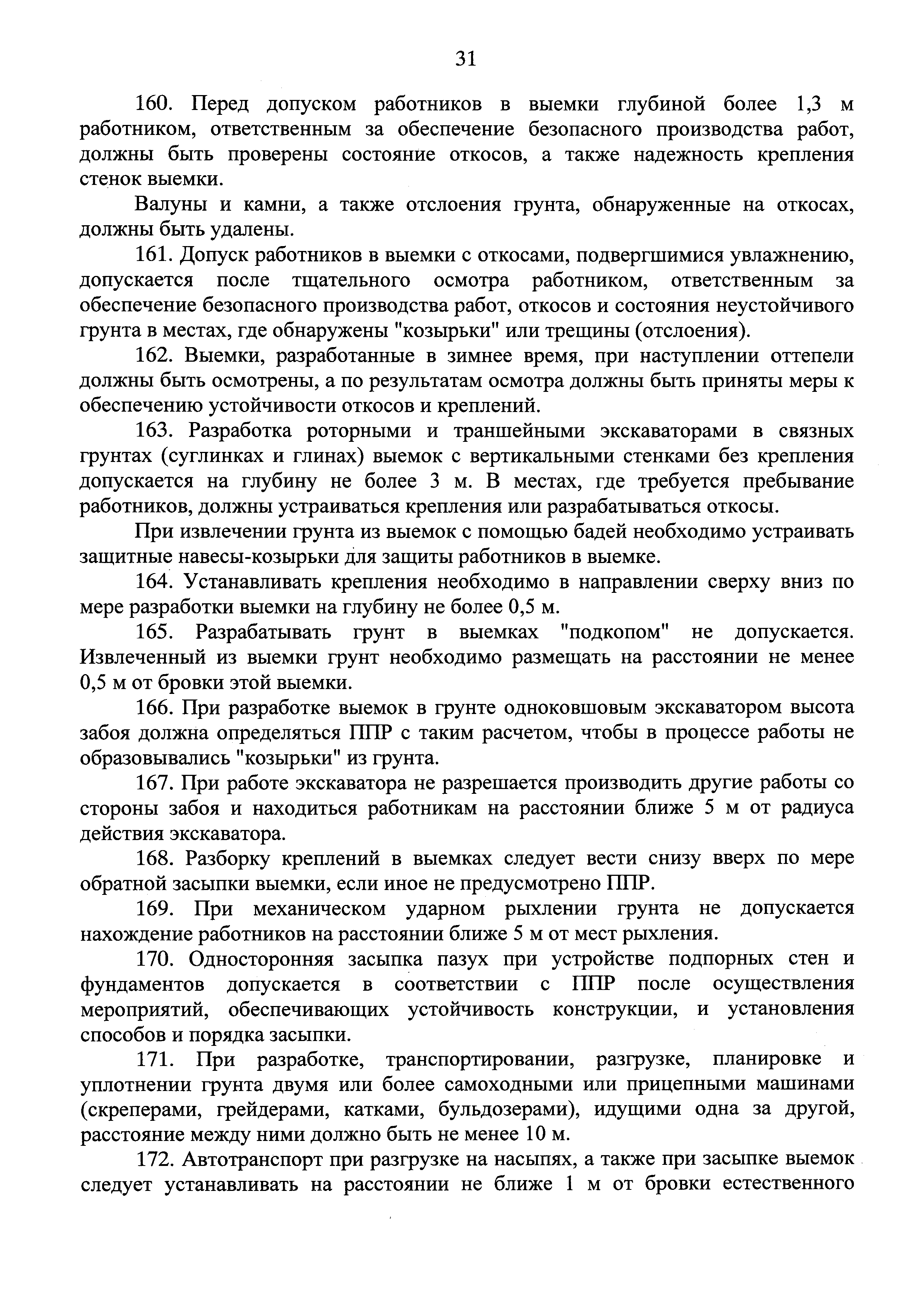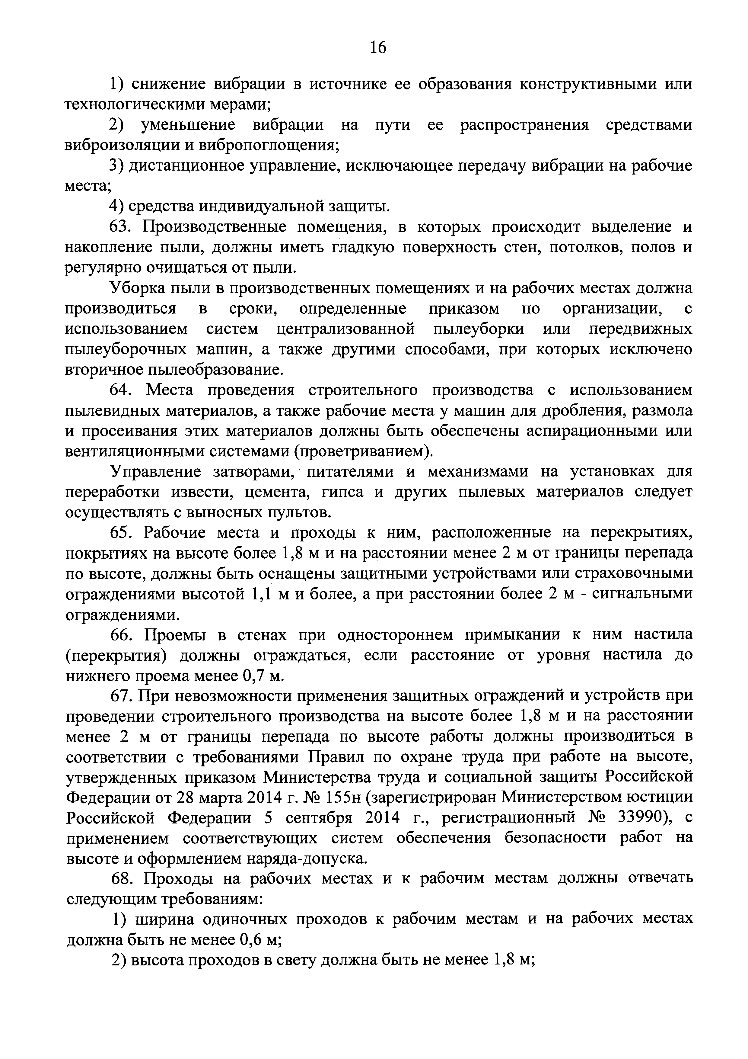 Правила по охране труда в строительстве| Статус: | действует | | Название рус.: | Правила по охране труда в строительстве | | Дата добавления в базу: | 12.02.2016 | | Дата актуализации: | 01.01.2021 | | Дата введения: | 28.08.2015 | | Область применения: | Правила по охране труда в строительстве устанавливают государственные нормативные требования охраны труда при проведении общестроительных и специальных строительных работ, выполняемых при новом строительстве, расширении, реконструкции, техническом перевооружении, текущем и капитальном ремонте зданий и сооружений | | Оглавление: | I. Общие положения II. Требования охраны труда при организации проведения работ (производственных процессов) в строительном производстве III. Требования охраны труда, предъявляемые к производственным территориям (помещениям, площадкам и участкам работ) и организации рабочих мест IV. Требования охраны труда при проведении производственных процессов и эксплуатации технологического оборудования в строительном производстве V. Требования охраны труда, предъявляемые к транспортированию (перемещению) и хранению строительных конструкций, материалов, заготовок и отходов строительного производства Приложение № 1. Акт-допуск для производства строительно-монтажных работ на территории действующего производственного объекта Приложение № 2. Наряд-допуск на производство работ в местах действия вредных и опасных производственных факторов Приложение № 3. Акт о соответствии выполненных внеплощадочных и внутриплощадочных подготовительных работ требованиям безопасности труда и готовности объекта к началу строительства Приложение № 4. Крутизна откосов в зависимости от вида грунта | | Утверждён: | 01.06.2015 Министерство труда и социальной защиты РФ (336н)