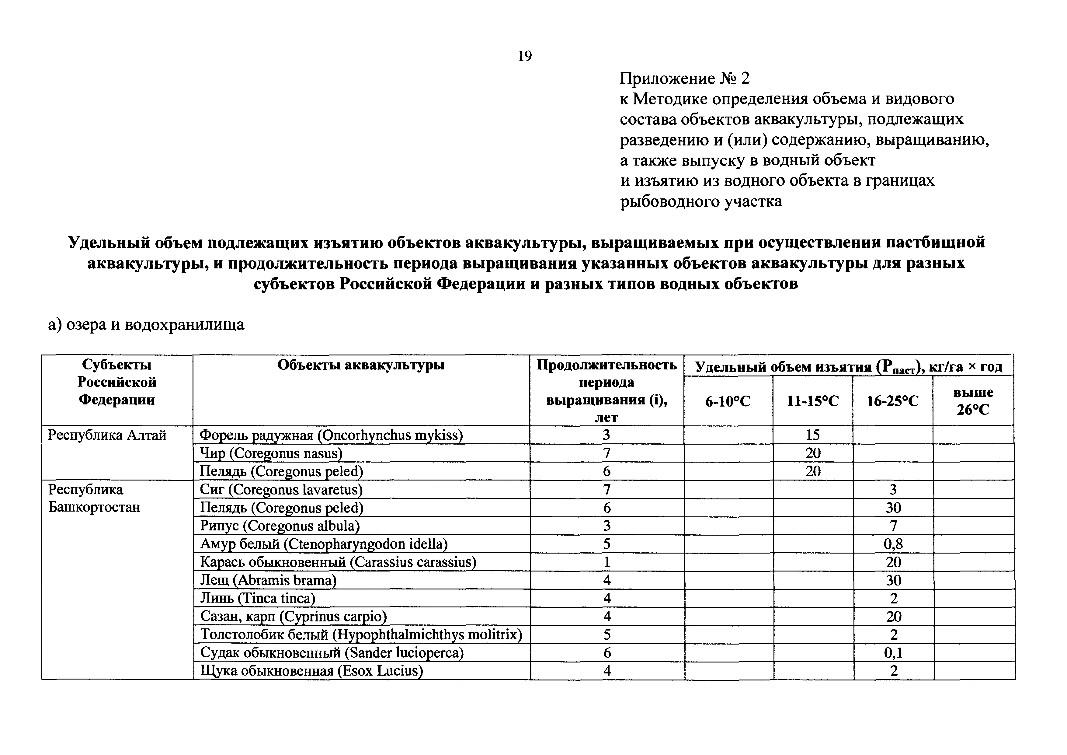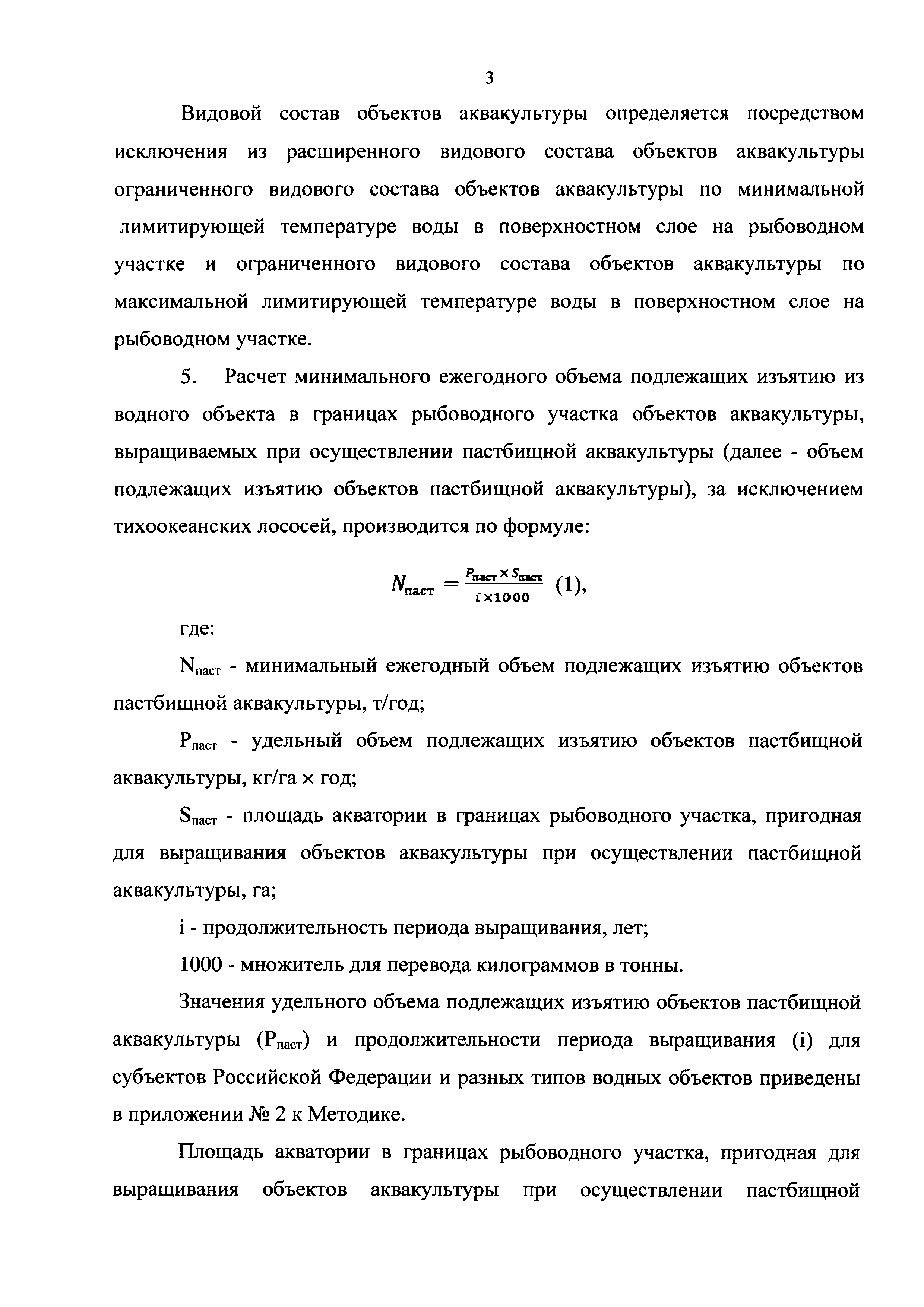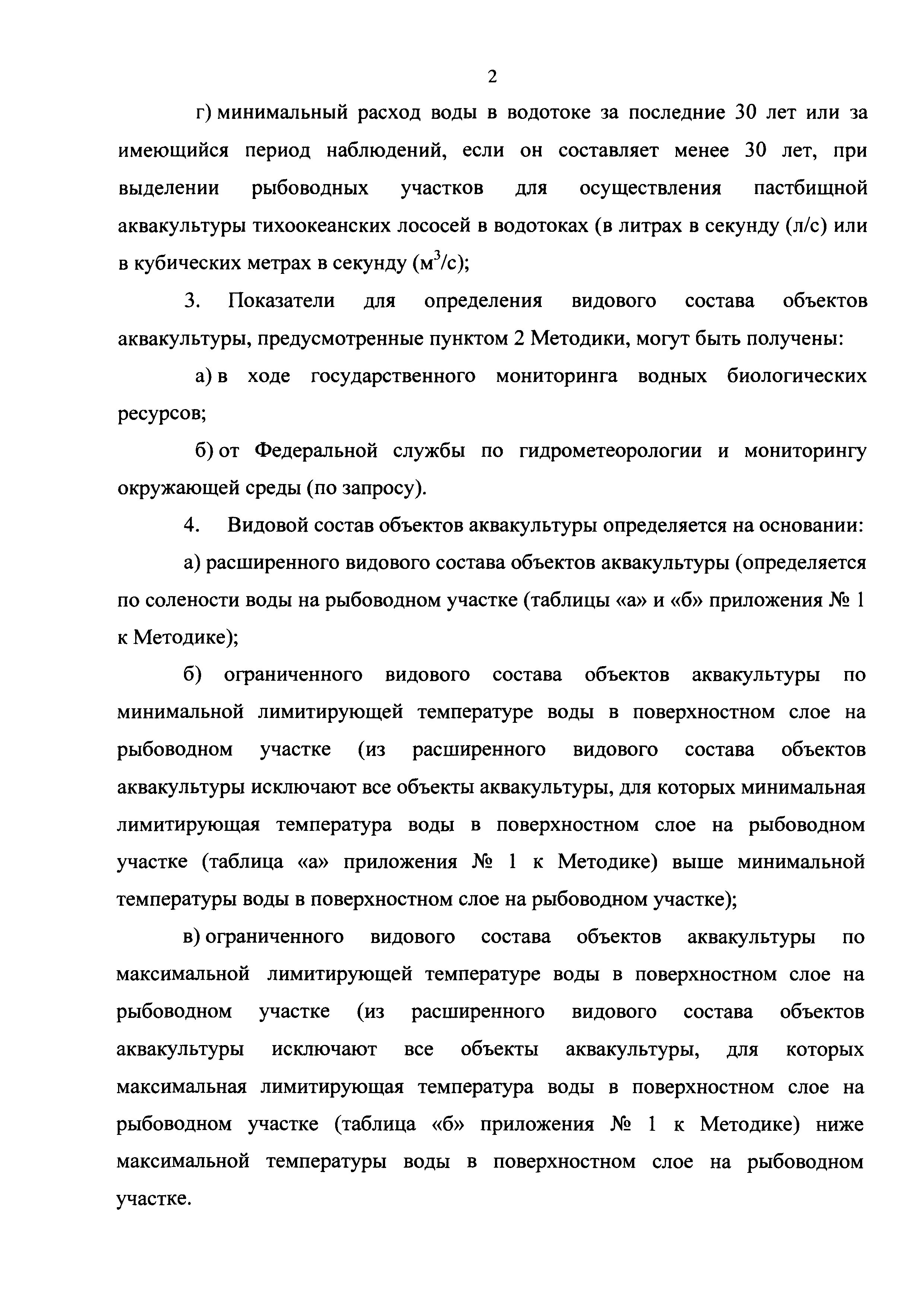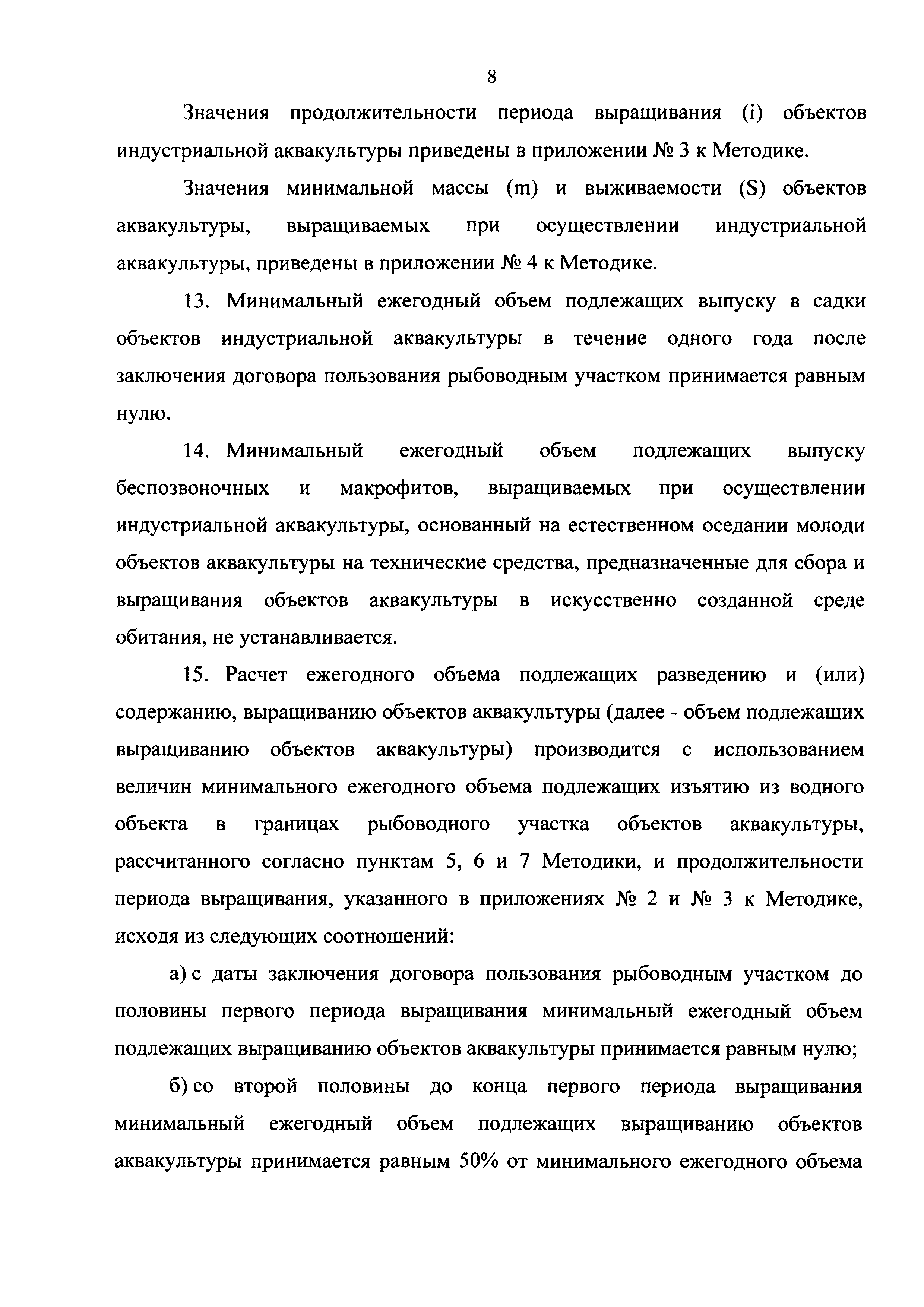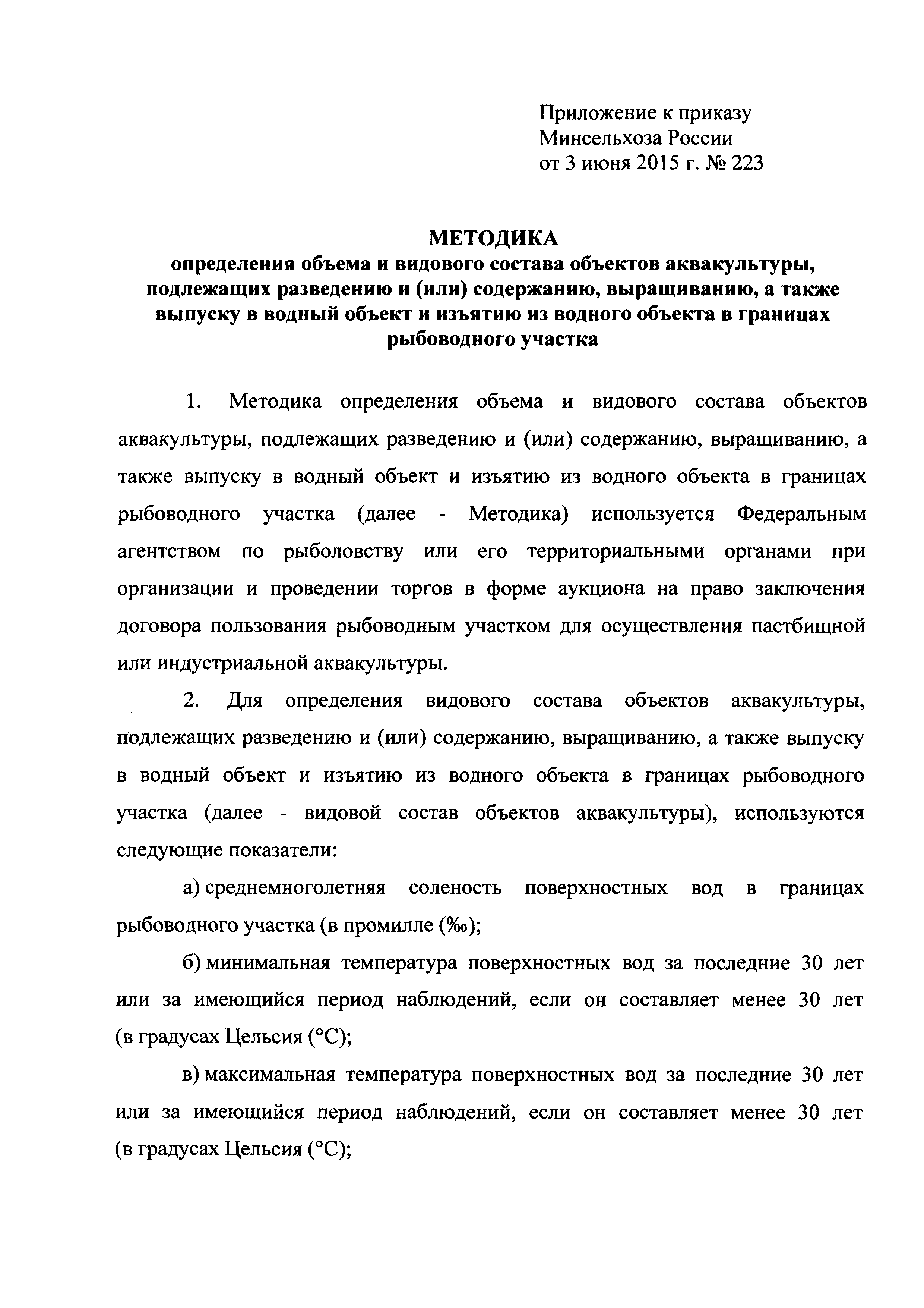 Методика определения объема и видового состава объектов аквакультуры, подлежащих разведению и (или) содержанию, выращиванию, а также выпуску в водный объект и изъятию из водного объекта в границах рыбоводного участка| Статус: | утратил силу | | Название рус.: | Методика определения объема и видового состава объектов аквакультуры, подлежащих разведению и (или) содержанию, выращиванию, а также выпуску в водный объект и изъятию из водного объекта в границах рыбоводного участка | | Дата добавления в базу: | 12.02.2016 | | Дата актуализации: | 01.01.2021 | | Дата введения: | 14.08.2015 | | Дата окончания срока действия: | 13.08.2016 | | Область применения: | Методика используется Федеральным агентством по рыболовству или его территориальными органами при организации и проведении торгов в форме аукциона на право заключения договора пользования рыбоводным участком для осуществления пастбищной или индустриальной аквакультуры. | | Оглавление: | Приложение 1. Видовой состав объектов аквакультуры, подлежащих разведению и (или) содержанию, выращиванию, а также выпуску в водный объект и изъятию из водного объекта в границах рыбоводного участка в зависимости от солености воды и температуры воды в поверхностном слое на рыбоводном участке Приложение 2. Удельный объем подлежащих изъятию объектов аквакультуры, выращиваемых при осуществлении пастбищной аквакультуры, и продолжительность периода выращивания указанных объектов аквакультуры для разных субъектов Российской Федерации и разных типов водных объектов Приложение 3. Удельный объем подлежащих изъятию объектов аквакультуры, выращиваемых при осуществлении индустриальной аквакультуры, и продолжительность периода выращивания указанных объектов аквакультуры для разных субъектов Российской Федерации Приложение 4. Значения минимальной массы и выживаемости объектов аквакультуры, выращиваемых при осуществлении индустриальной аквакультуры | | Утверждён: | 03.06.2015 Министерство сельского хозяйства РФ (Russian Federation Ministry of Agriculture 223)