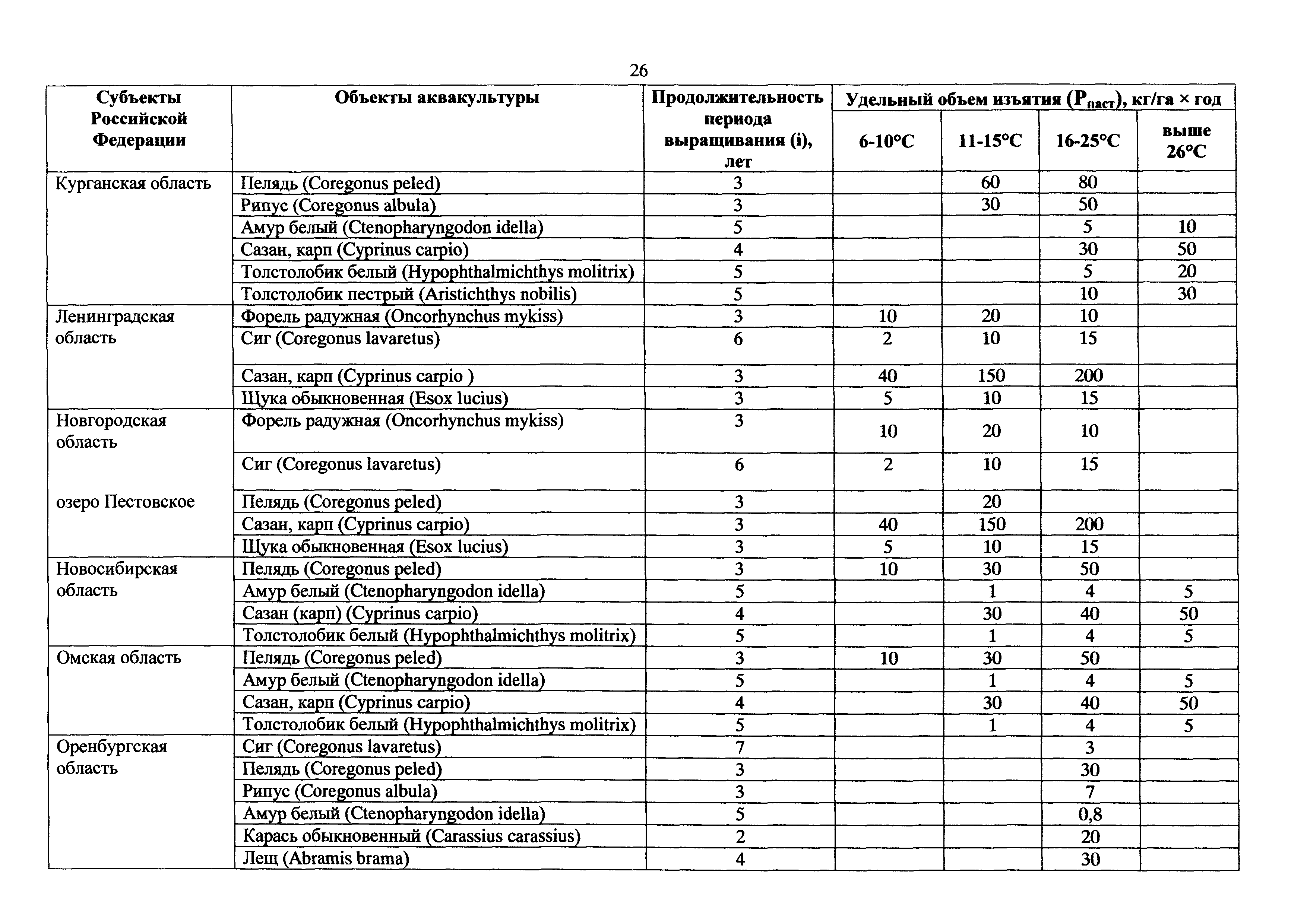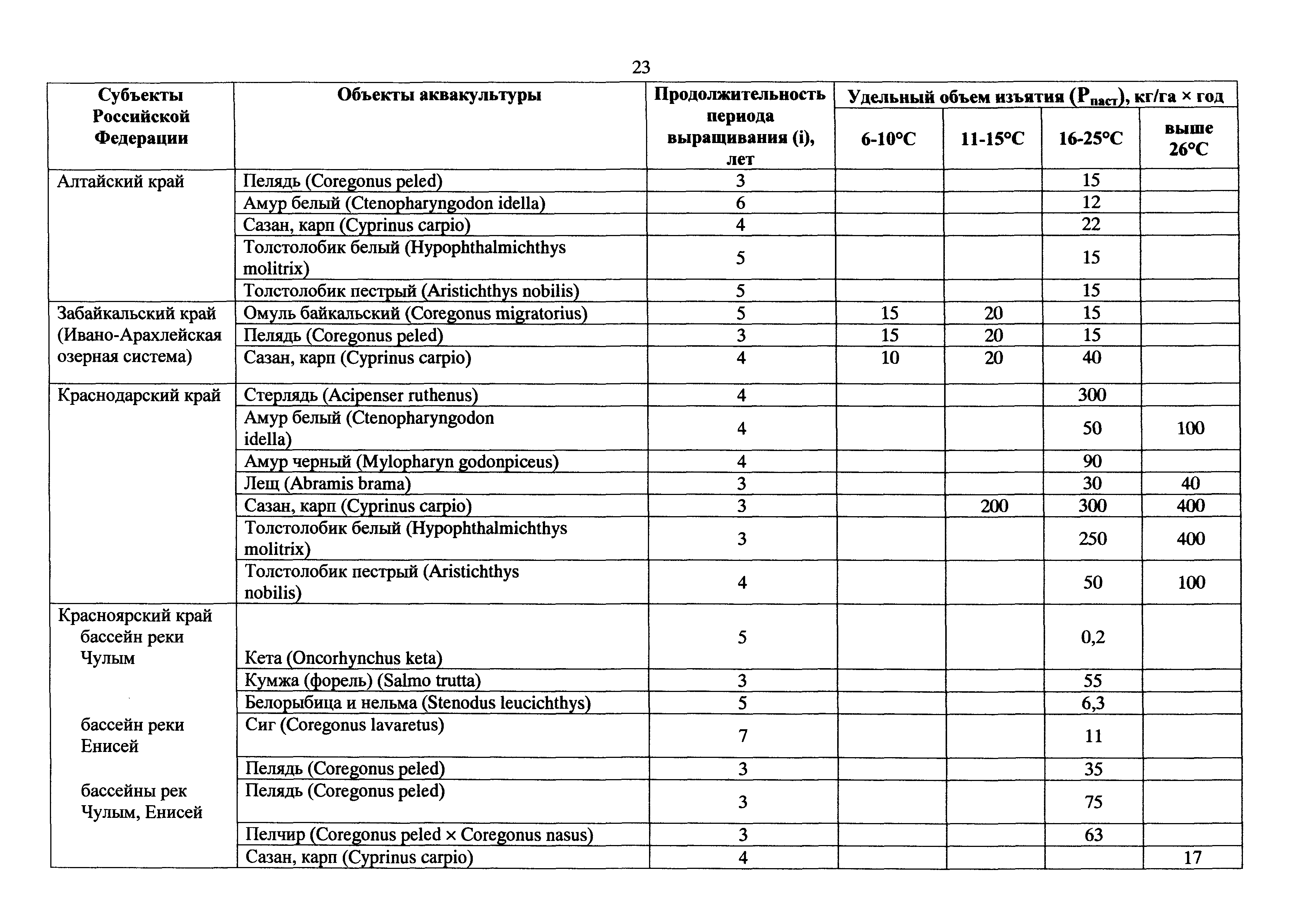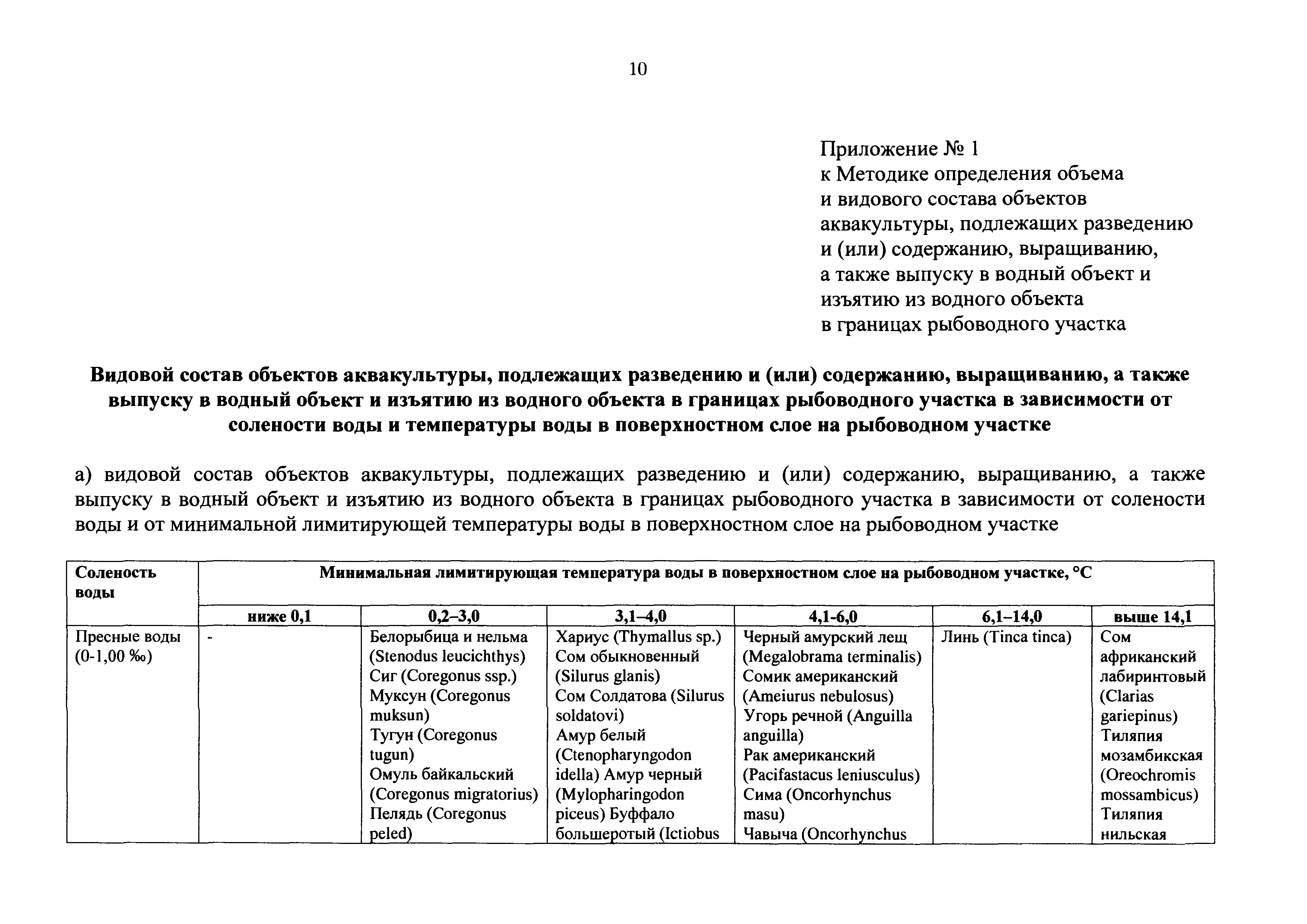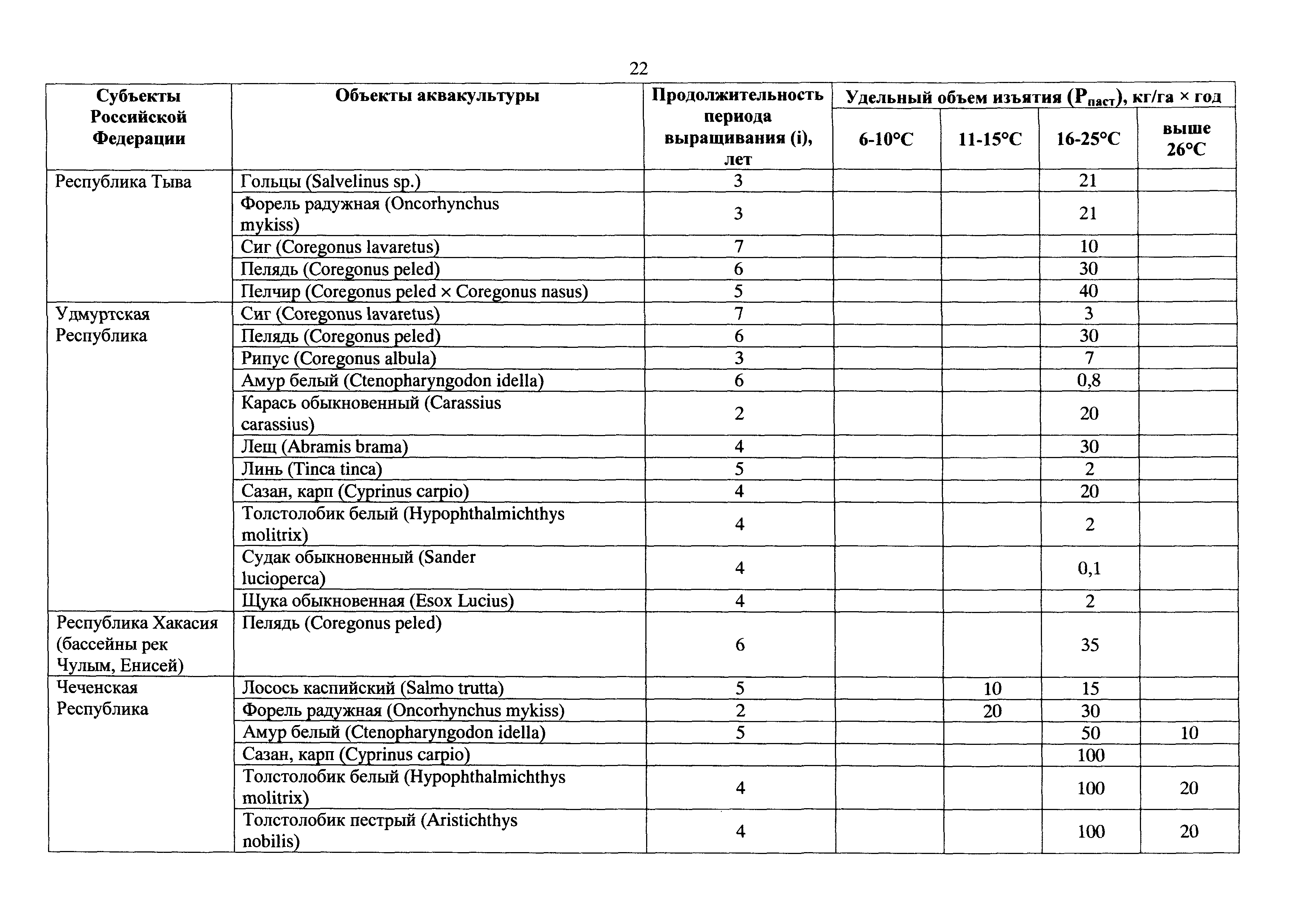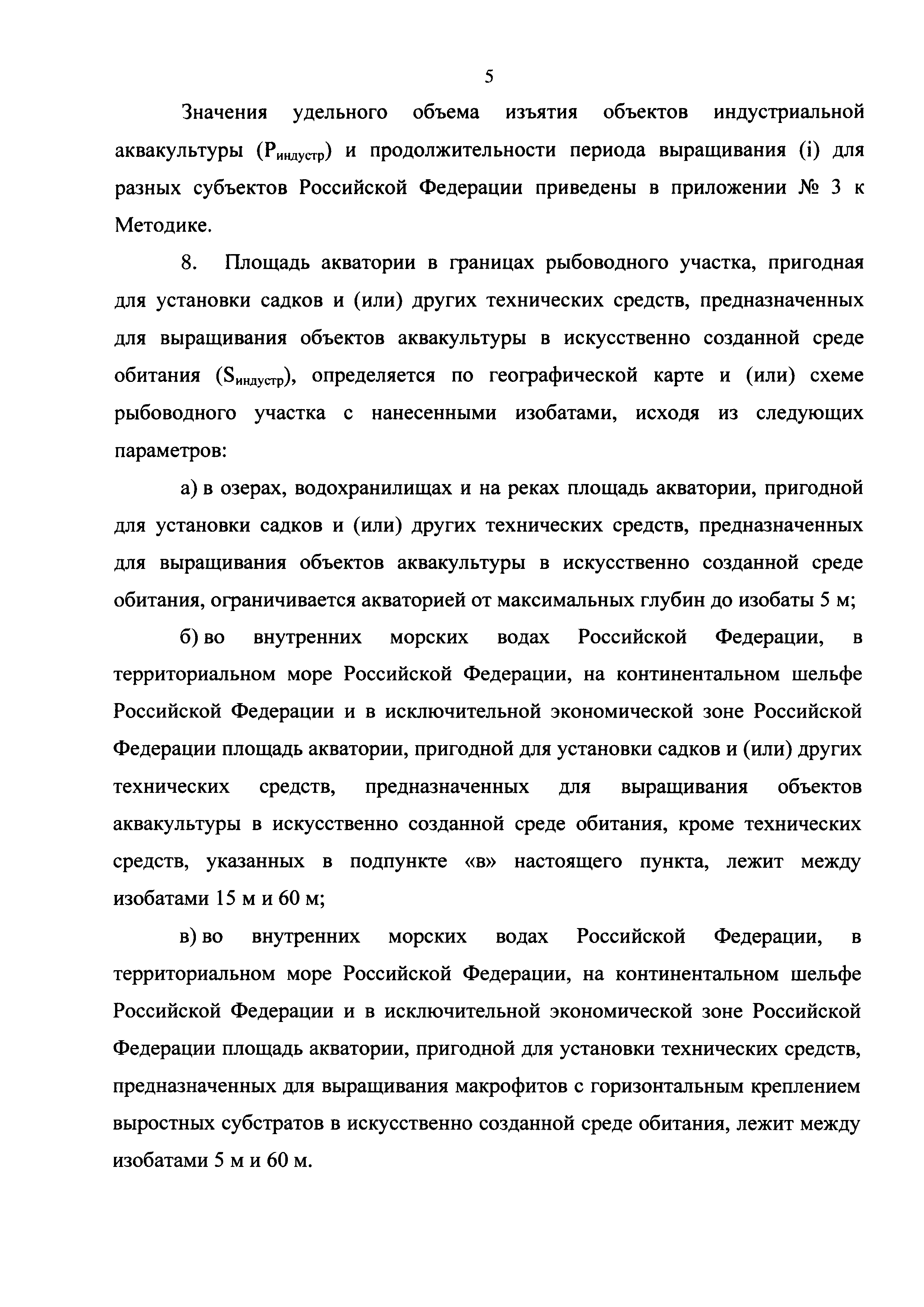 Методика определения объема и видового состава объектов аквакультуры, подлежащих разведению и (или) содержанию, выращиванию, а также выпуску в водный объект и изъятию из водного объекта в границах рыбоводного участка| Статус: | утратил силу | | Название рус.: | Методика определения объема и видового состава объектов аквакультуры, подлежащих разведению и (или) содержанию, выращиванию, а также выпуску в водный объект и изъятию из водного объекта в границах рыбоводного участка | | Дата добавления в базу: | 12.02.2016 | | Дата актуализации: | 01.01.2021 | | Дата введения: | 14.08.2015 | | Дата окончания срока действия: | 13.08.2016 | | Область применения: | Методика используется Федеральным агентством по рыболовству или его территориальными органами при организации и проведении торгов в форме аукциона на право заключения договора пользования рыбоводным участком для осуществления пастбищной или индустриальной аквакультуры. | | Оглавление: | Приложение 1. Видовой состав объектов аквакультуры, подлежащих разведению и (или) содержанию, выращиванию, а также выпуску в водный объект и изъятию из водного объекта в границах рыбоводного участка в зависимости от солености воды и температуры воды в поверхностном слое на рыбоводном участке Приложение 2. Удельный объем подлежащих изъятию объектов аквакультуры, выращиваемых при осуществлении пастбищной аквакультуры, и продолжительность периода выращивания указанных объектов аквакультуры для разных субъектов Российской Федерации и разных типов водных объектов Приложение 3. Удельный объем подлежащих изъятию объектов аквакультуры, выращиваемых при осуществлении индустриальной аквакультуры, и продолжительность периода выращивания указанных объектов аквакультуры для разных субъектов Российской Федерации Приложение 4. Значения минимальной массы и выживаемости объектов аквакультуры, выращиваемых при осуществлении индустриальной аквакультуры | | Утверждён: | 03.06.2015 Министерство сельского хозяйства РФ (Russian Federation Ministry of Agriculture 223)