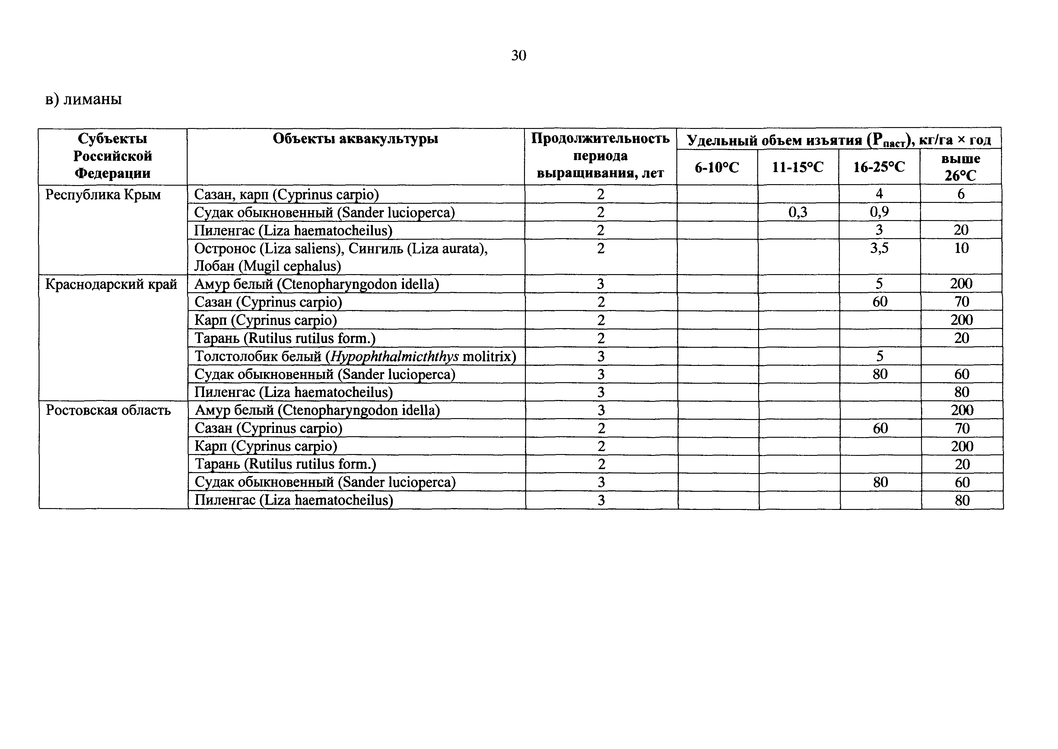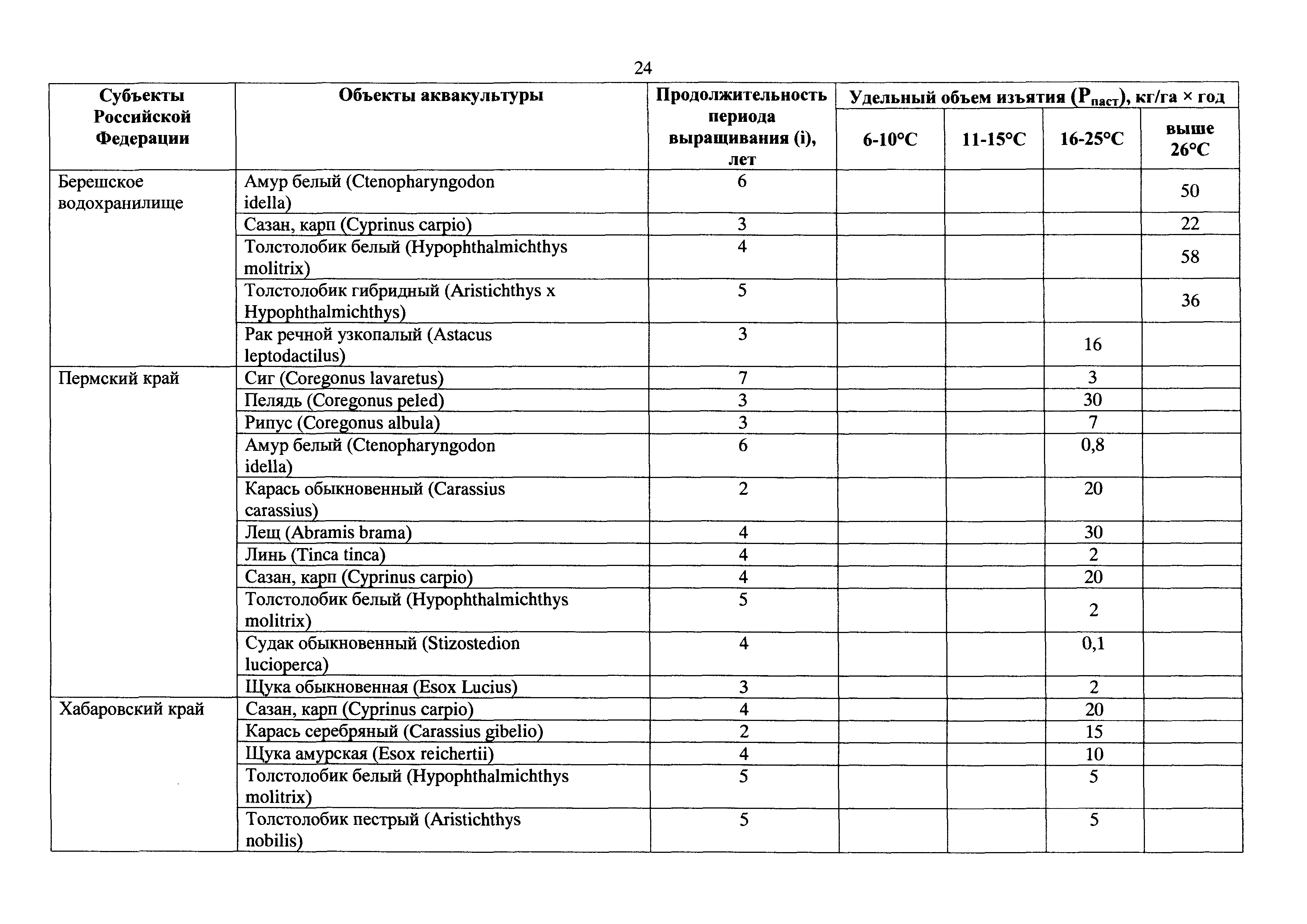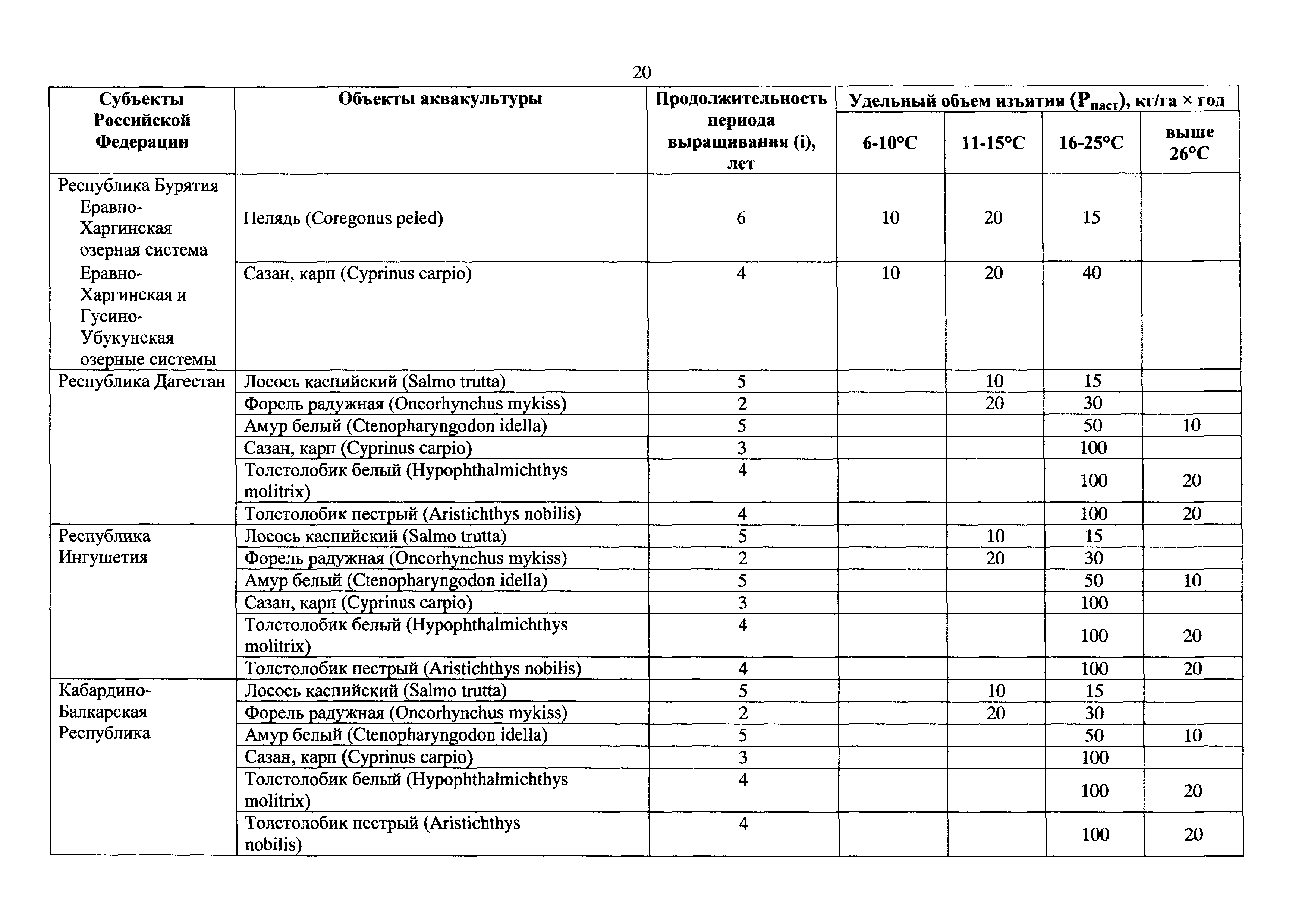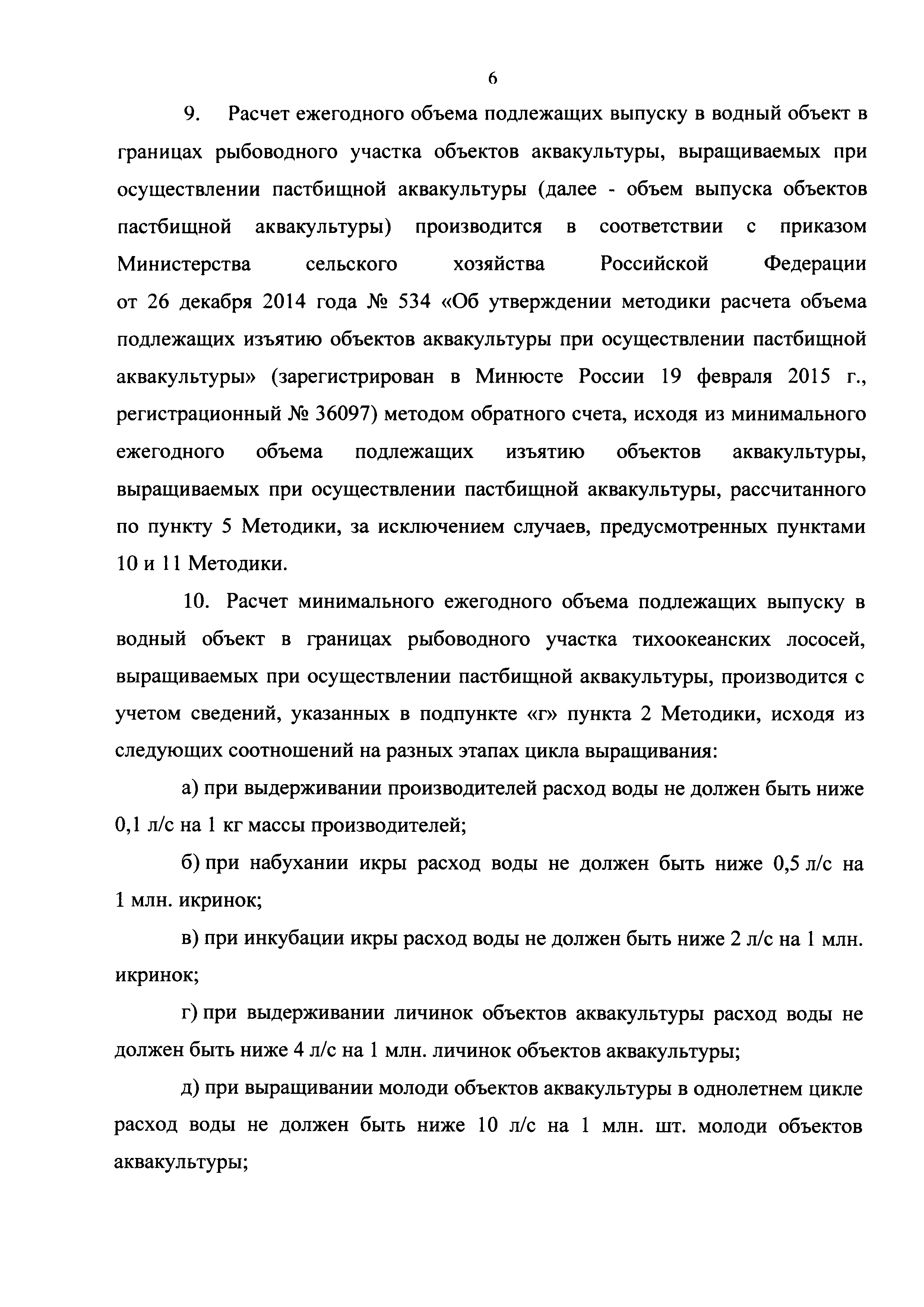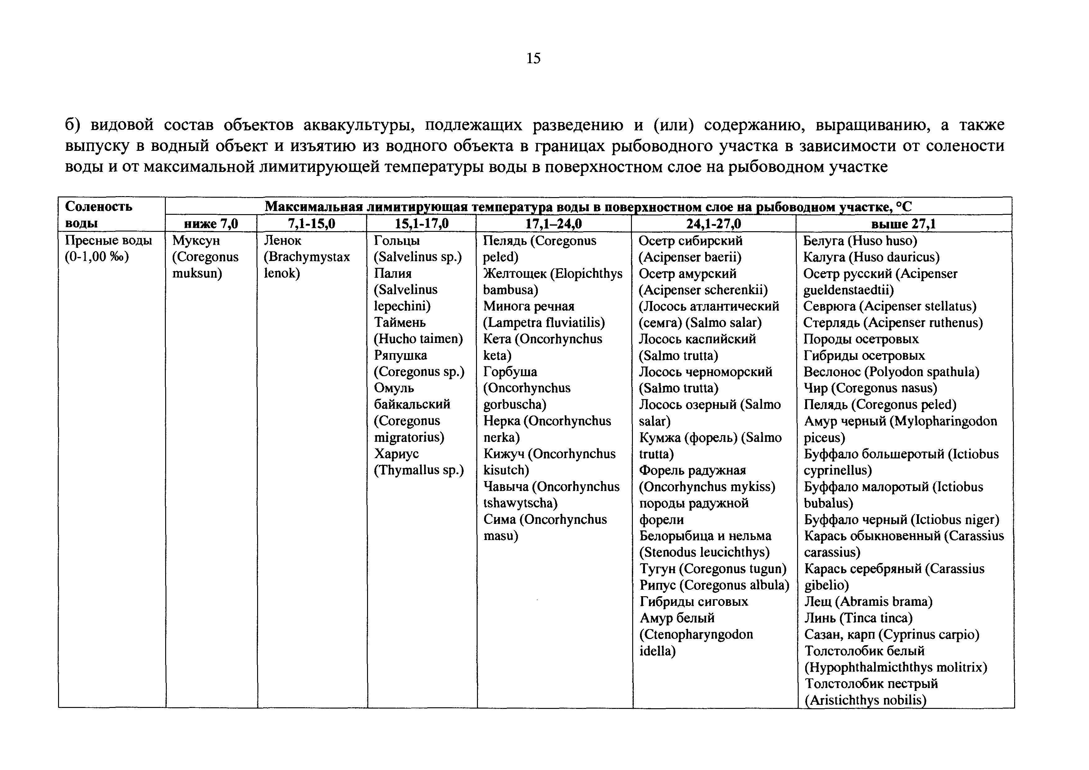 Методика определения объема и видового состава объектов аквакультуры, подлежащих разведению и (или) содержанию, выращиванию, а также выпуску в водный объект и изъятию из водного объекта в границах рыбоводного участка| Статус: | утратил силу | | Название рус.: | Методика определения объема и видового состава объектов аквакультуры, подлежащих разведению и (или) содержанию, выращиванию, а также выпуску в водный объект и изъятию из водного объекта в границах рыбоводного участка | | Дата добавления в базу: | 12.02.2016 | | Дата актуализации: | 01.01.2021 | | Дата введения: | 14.08.2015 | | Дата окончания срока действия: | 13.08.2016 | | Область применения: | Методика используется Федеральным агентством по рыболовству или его территориальными органами при организации и проведении торгов в форме аукциона на право заключения договора пользования рыбоводным участком для осуществления пастбищной или индустриальной аквакультуры. | | Оглавление: | Приложение 1. Видовой состав объектов аквакультуры, подлежащих разведению и (или) содержанию, выращиванию, а также выпуску в водный объект и изъятию из водного объекта в границах рыбоводного участка в зависимости от солености воды и температуры воды в поверхностном слое на рыбоводном участке Приложение 2. Удельный объем подлежащих изъятию объектов аквакультуры, выращиваемых при осуществлении пастбищной аквакультуры, и продолжительность периода выращивания указанных объектов аквакультуры для разных субъектов Российской Федерации и разных типов водных объектов Приложение 3. Удельный объем подлежащих изъятию объектов аквакультуры, выращиваемых при осуществлении индустриальной аквакультуры, и продолжительность периода выращивания указанных объектов аквакультуры для разных субъектов Российской Федерации Приложение 4. Значения минимальной массы и выживаемости объектов аквакультуры, выращиваемых при осуществлении индустриальной аквакультуры | | Утверждён: | 03.06.2015 Министерство сельского хозяйства РФ (Russian Federation Ministry of Agriculture 223)