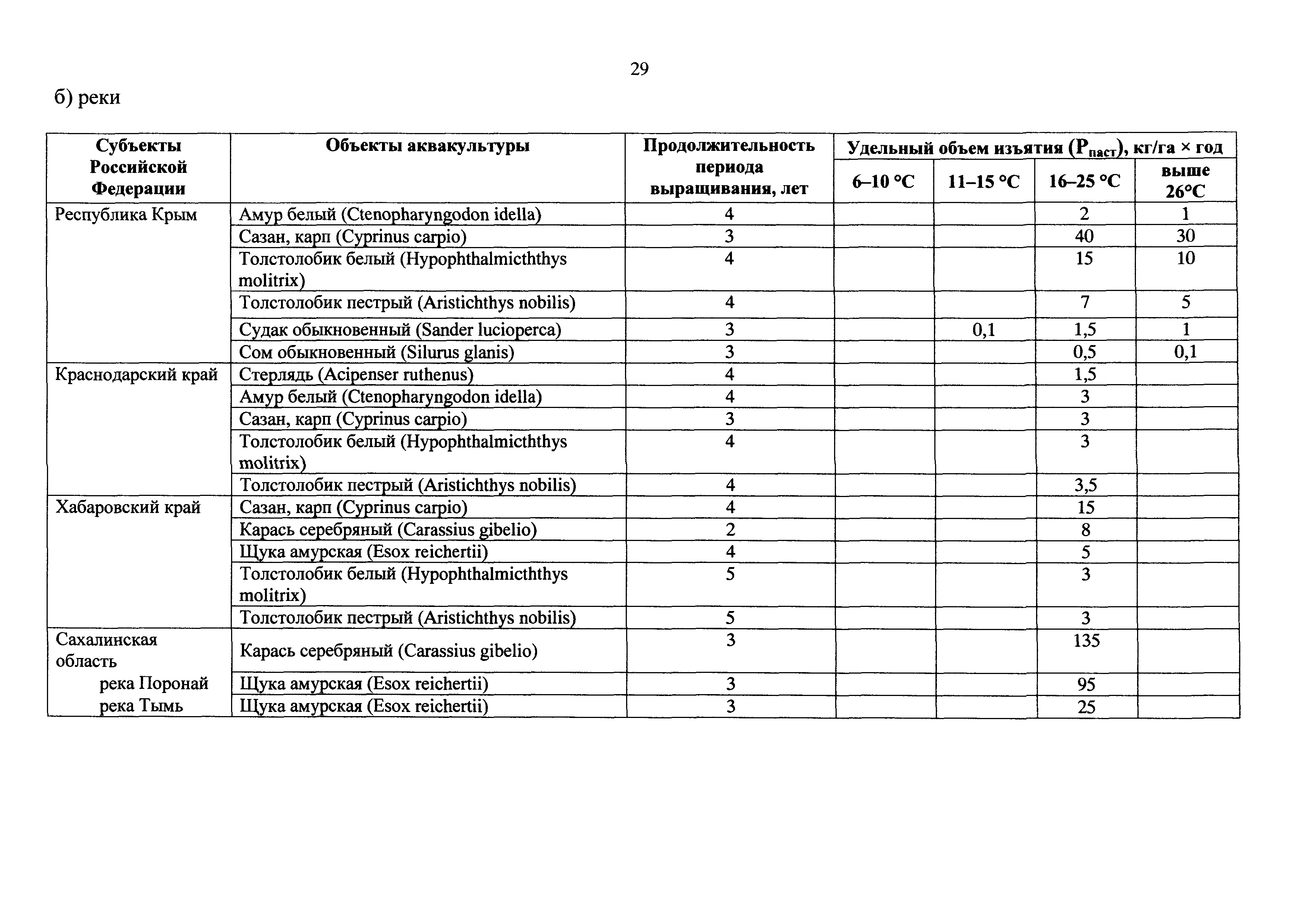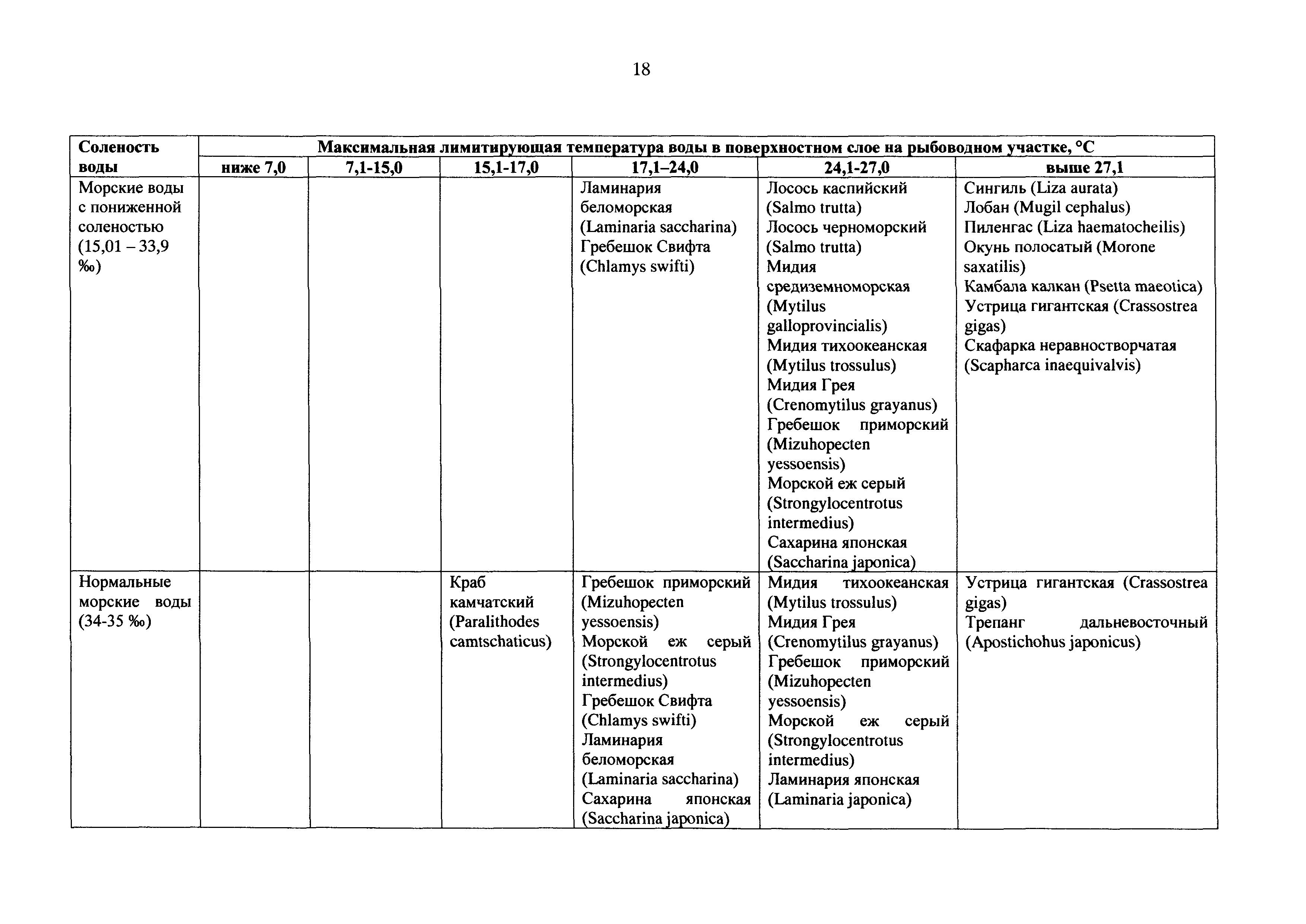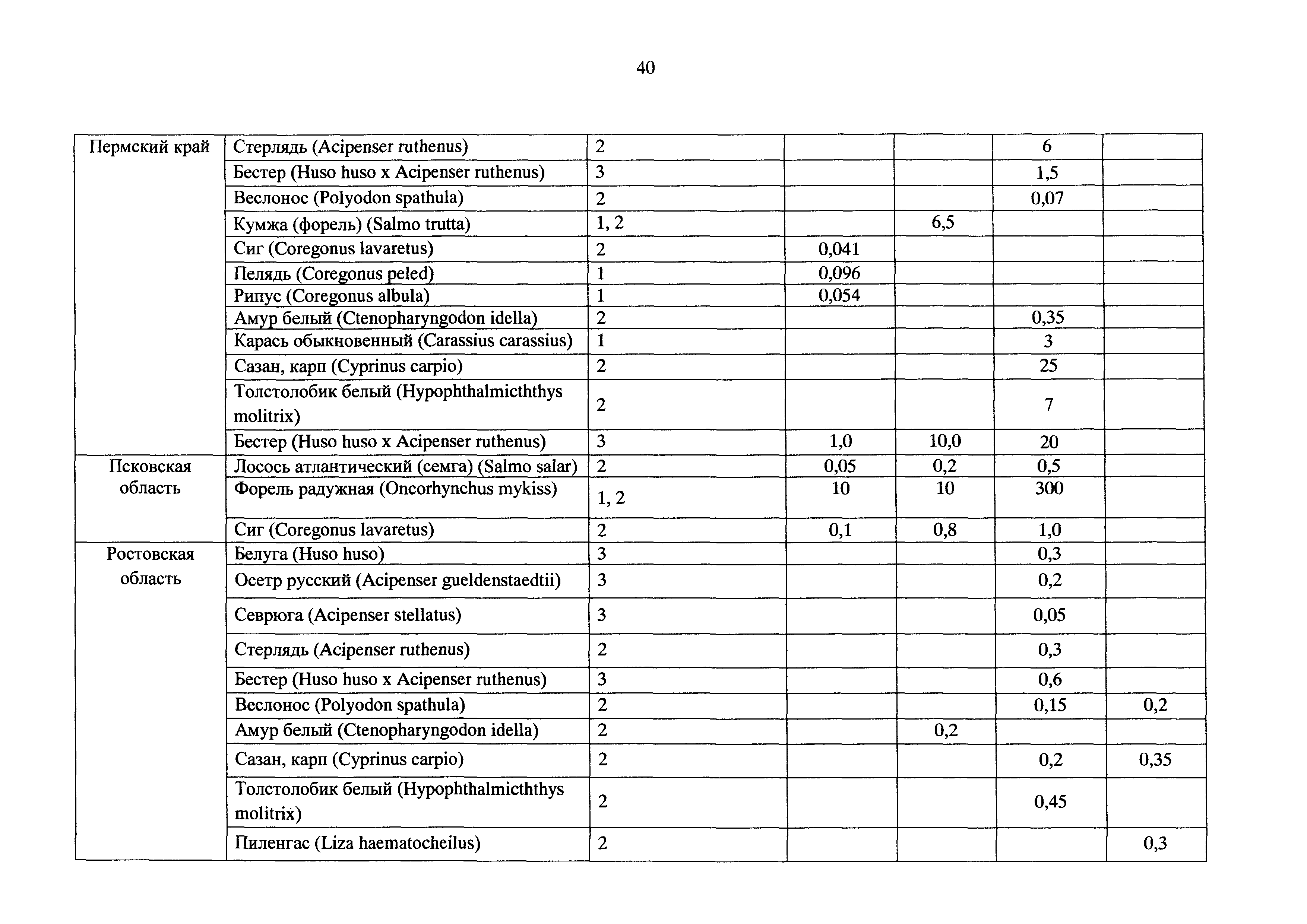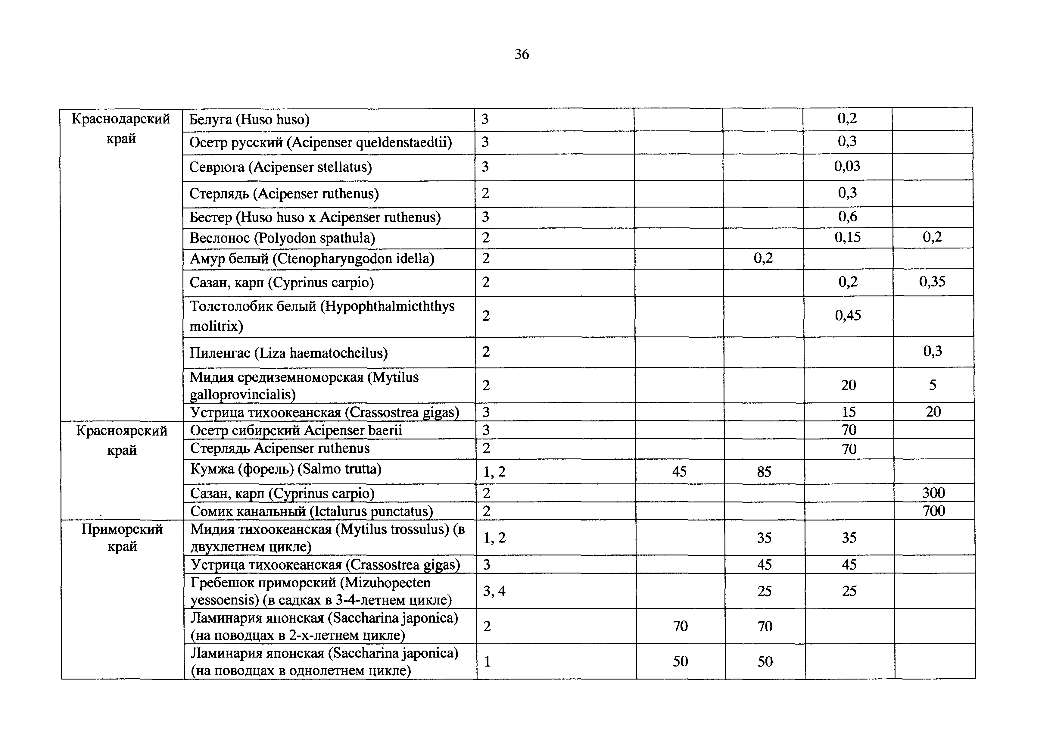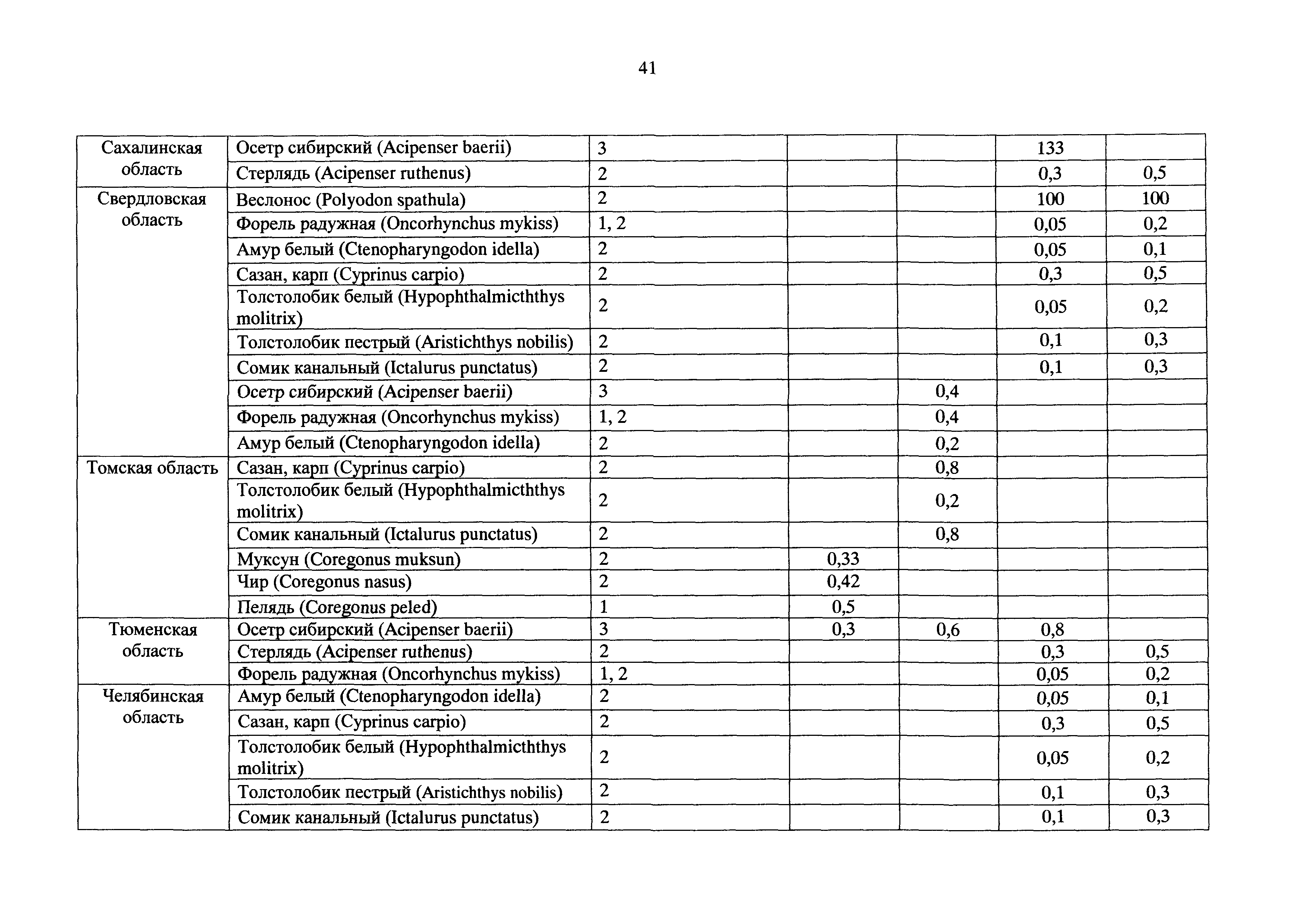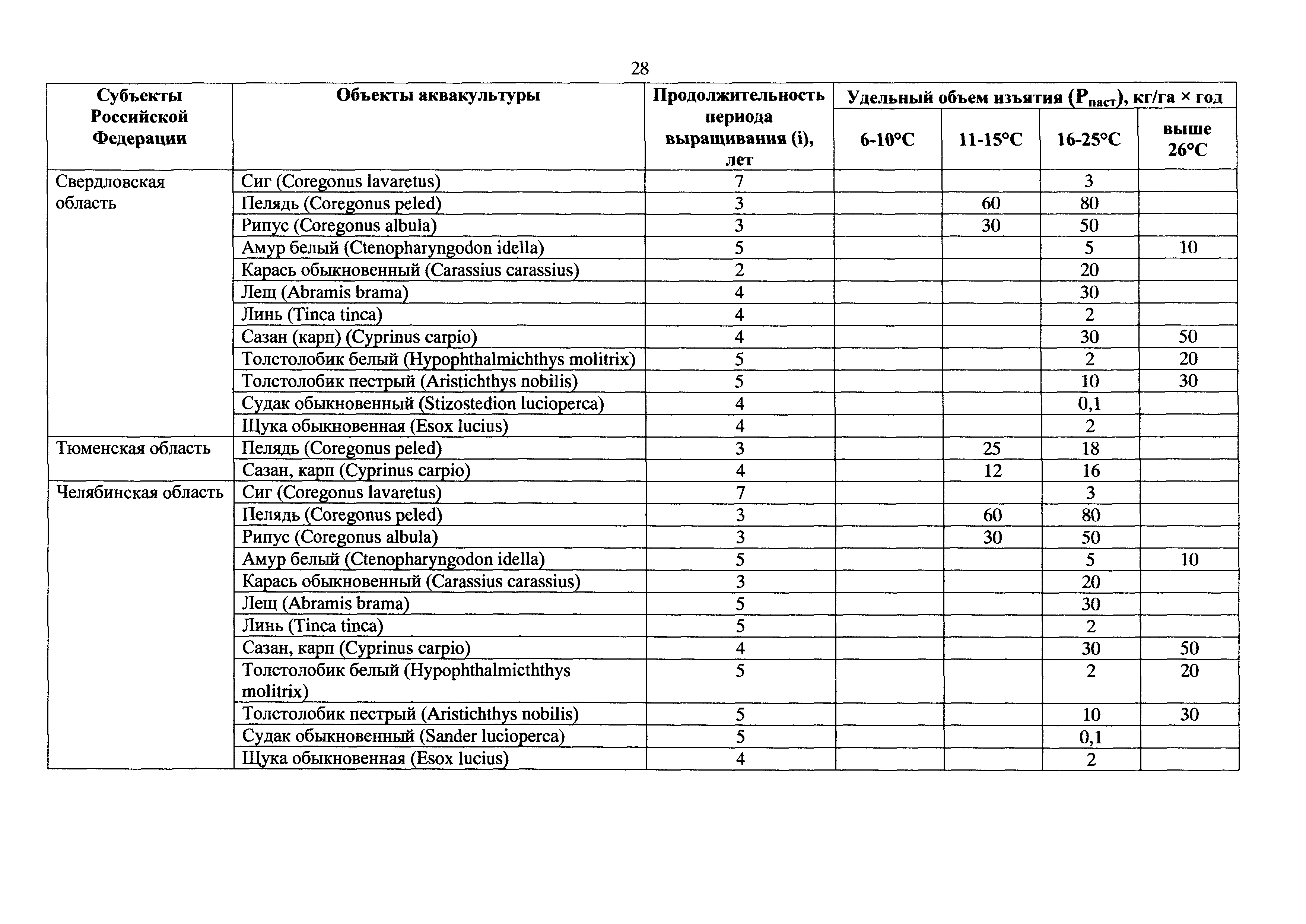 Методика определения объема и видового состава объектов аквакультуры, подлежащих разведению и (или) содержанию, выращиванию, а также выпуску в водный объект и изъятию из водного объекта в границах рыбоводного участка| Статус: | утратил силу | | Название рус.: | Методика определения объема и видового состава объектов аквакультуры, подлежащих разведению и (или) содержанию, выращиванию, а также выпуску в водный объект и изъятию из водного объекта в границах рыбоводного участка | | Дата добавления в базу: | 12.02.2016 | | Дата актуализации: | 01.01.2021 | | Дата введения: | 14.08.2015 | | Дата окончания срока действия: | 13.08.2016 | | Область применения: | Методика используется Федеральным агентством по рыболовству или его территориальными органами при организации и проведении торгов в форме аукциона на право заключения договора пользования рыбоводным участком для осуществления пастбищной или индустриальной аквакультуры. | | Оглавление: | Приложение 1. Видовой состав объектов аквакультуры, подлежащих разведению и (или) содержанию, выращиванию, а также выпуску в водный объект и изъятию из водного объекта в границах рыбоводного участка в зависимости от солености воды и температуры воды в поверхностном слое на рыбоводном участке Приложение 2. Удельный объем подлежащих изъятию объектов аквакультуры, выращиваемых при осуществлении пастбищной аквакультуры, и продолжительность периода выращивания указанных объектов аквакультуры для разных субъектов Российской Федерации и разных типов водных объектов Приложение 3. Удельный объем подлежащих изъятию объектов аквакультуры, выращиваемых при осуществлении индустриальной аквакультуры, и продолжительность периода выращивания указанных объектов аквакультуры для разных субъектов Российской Федерации Приложение 4. Значения минимальной массы и выживаемости объектов аквакультуры, выращиваемых при осуществлении индустриальной аквакультуры | | Утверждён: | 03.06.2015 Министерство сельского хозяйства РФ (Russian Federation Ministry of Agriculture 223)