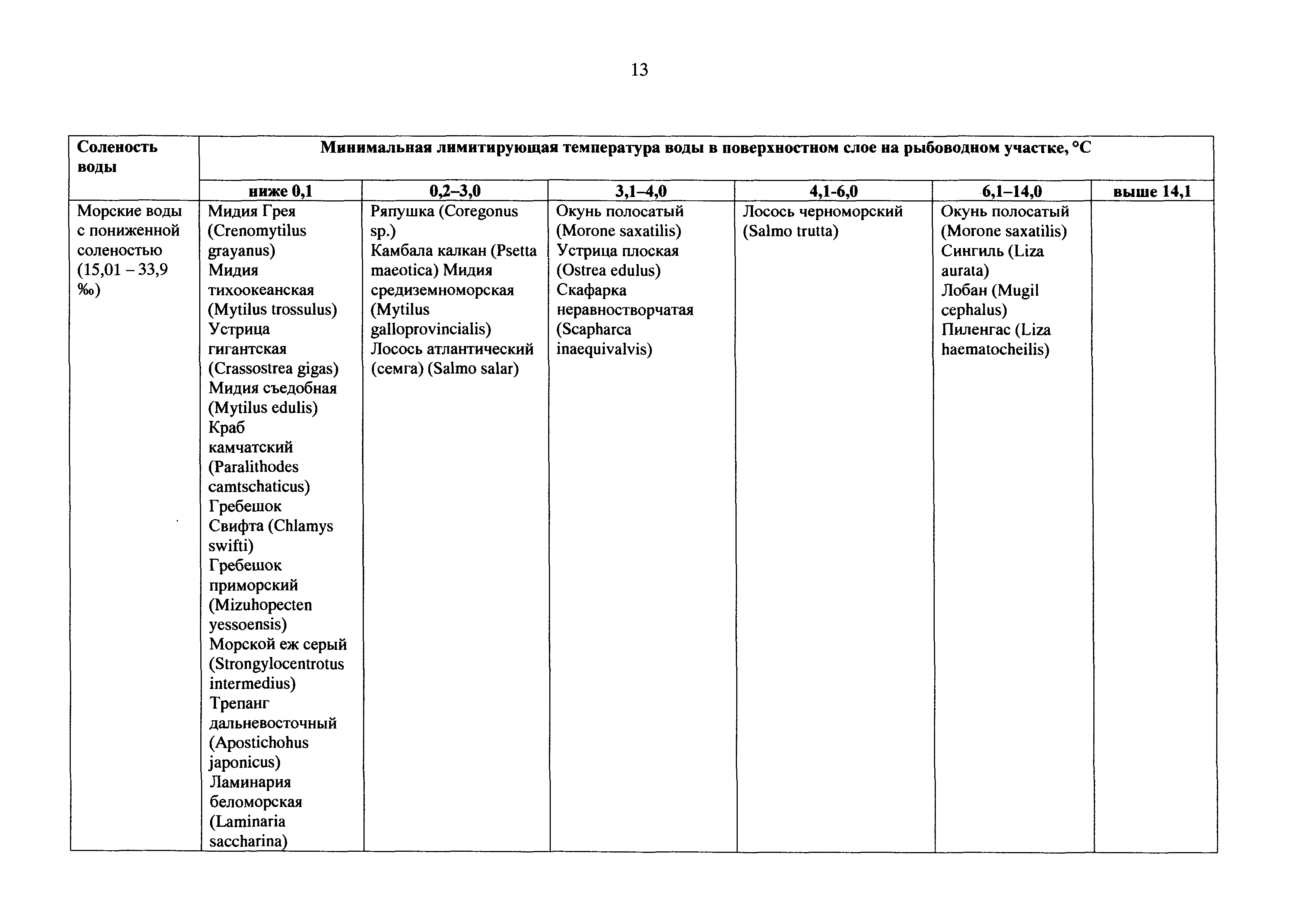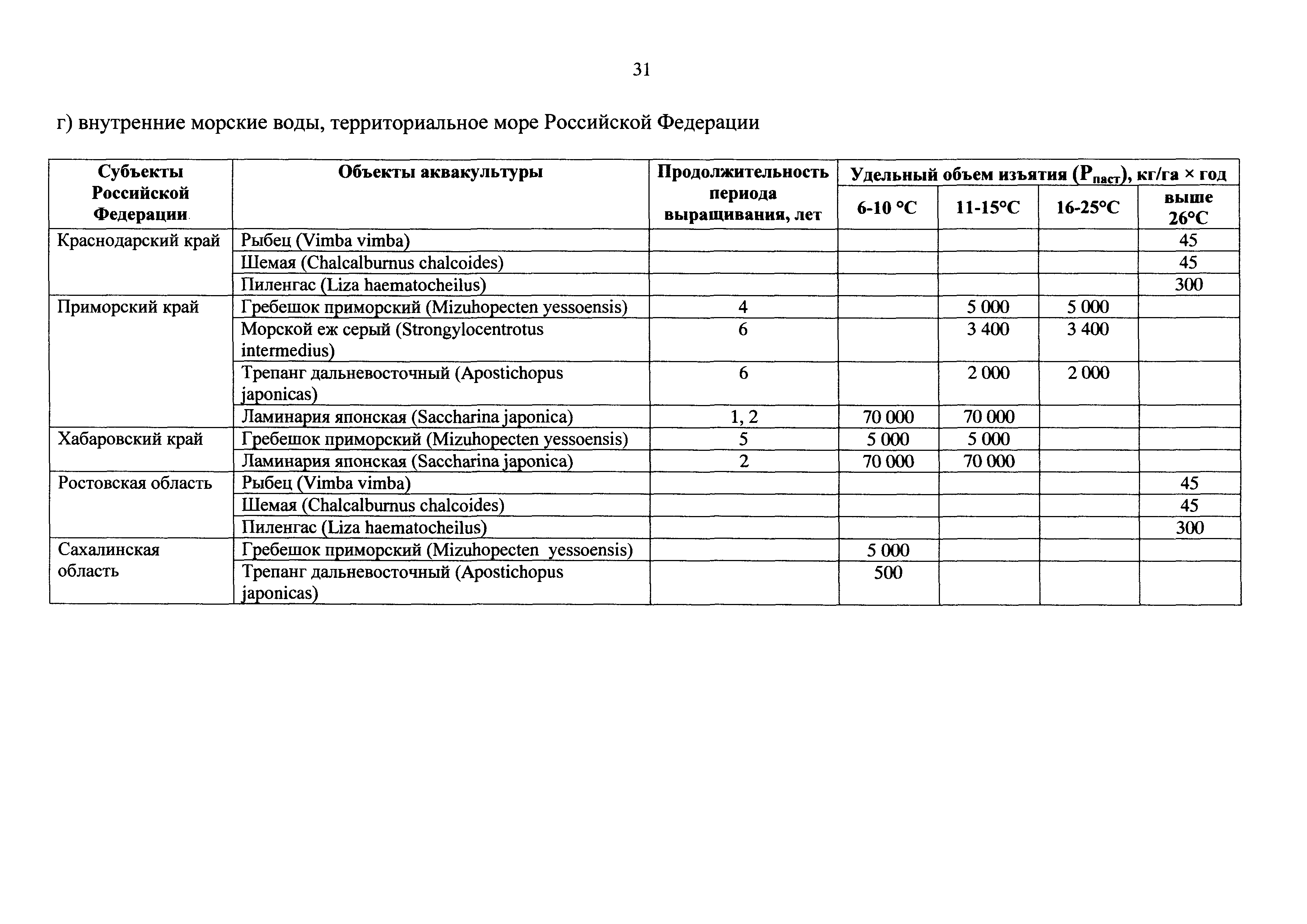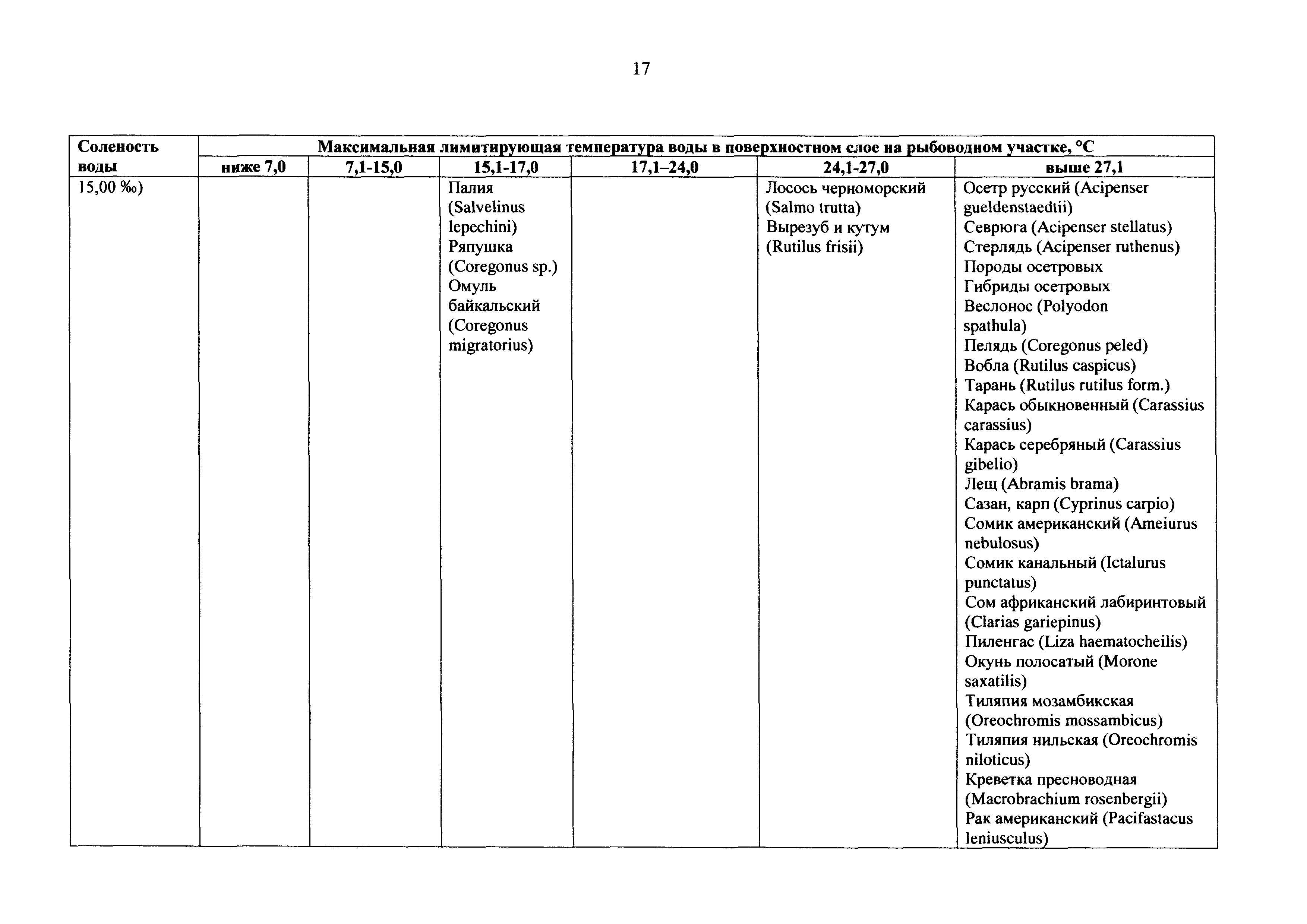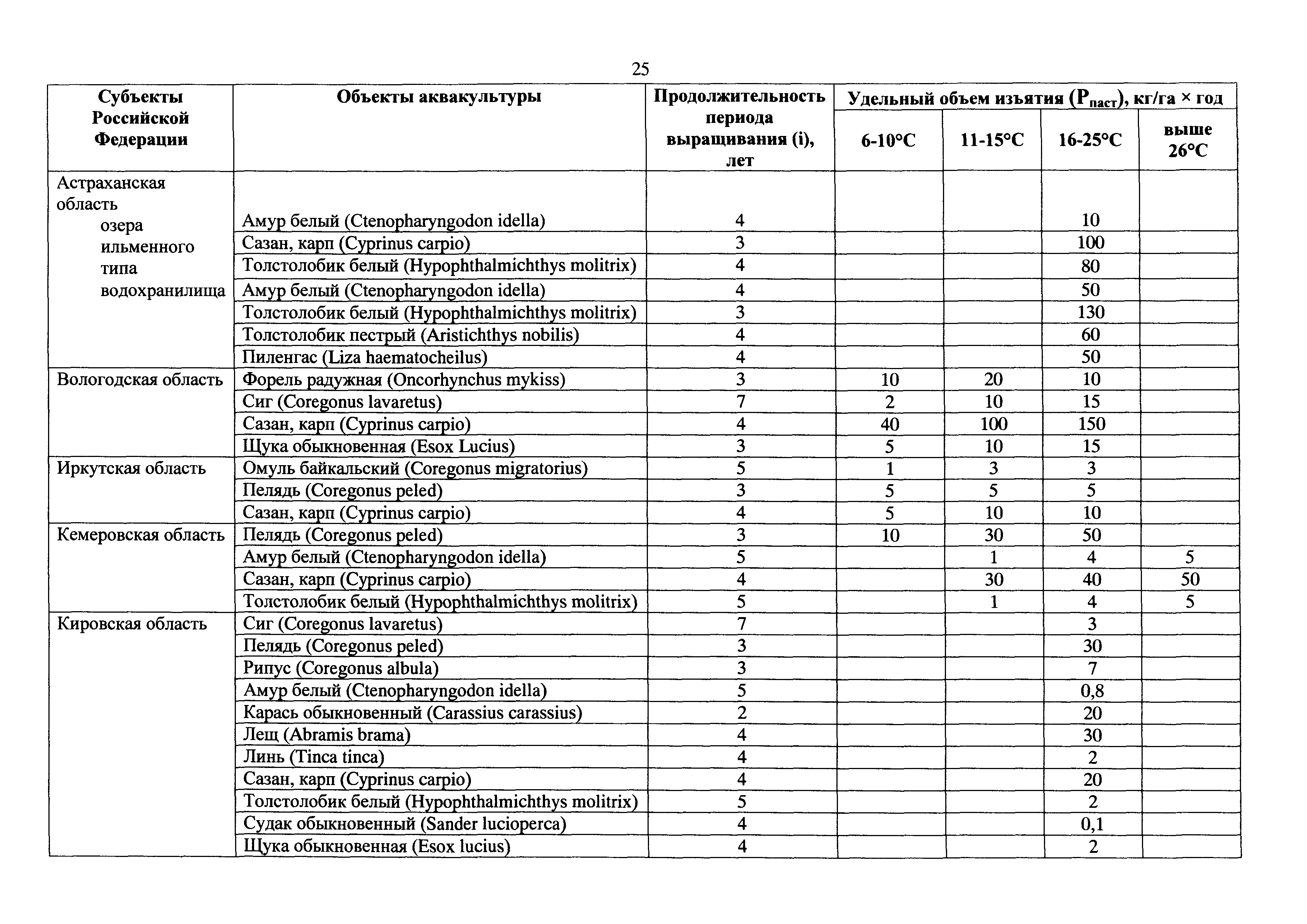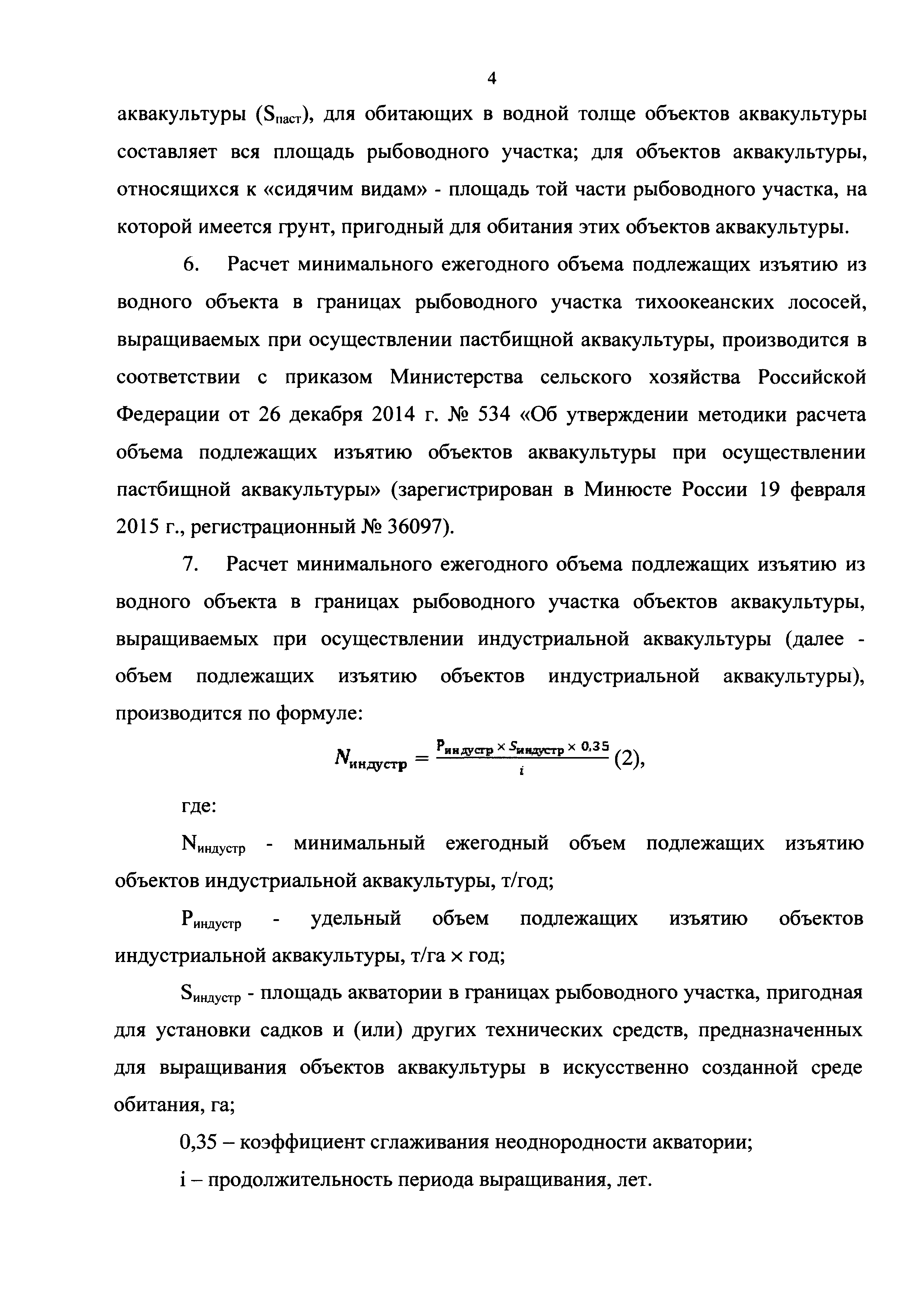 Методика определения объема и видового состава объектов аквакультуры, подлежащих разведению и (или) содержанию, выращиванию, а также выпуску в водный объект и изъятию из водного объекта в границах рыбоводного участка| Статус: | утратил силу | | Название рус.: | Методика определения объема и видового состава объектов аквакультуры, подлежащих разведению и (или) содержанию, выращиванию, а также выпуску в водный объект и изъятию из водного объекта в границах рыбоводного участка | | Дата добавления в базу: | 12.02.2016 | | Дата актуализации: | 01.01.2021 | | Дата введения: | 14.08.2015 | | Дата окончания срока действия: | 13.08.2016 | | Область применения: | Методика используется Федеральным агентством по рыболовству или его территориальными органами при организации и проведении торгов в форме аукциона на право заключения договора пользования рыбоводным участком для осуществления пастбищной или индустриальной аквакультуры. | | Оглавление: | Приложение 1. Видовой состав объектов аквакультуры, подлежащих разведению и (или) содержанию, выращиванию, а также выпуску в водный объект и изъятию из водного объекта в границах рыбоводного участка в зависимости от солености воды и температуры воды в поверхностном слое на рыбоводном участке Приложение 2. Удельный объем подлежащих изъятию объектов аквакультуры, выращиваемых при осуществлении пастбищной аквакультуры, и продолжительность периода выращивания указанных объектов аквакультуры для разных субъектов Российской Федерации и разных типов водных объектов Приложение 3. Удельный объем подлежащих изъятию объектов аквакультуры, выращиваемых при осуществлении индустриальной аквакультуры, и продолжительность периода выращивания указанных объектов аквакультуры для разных субъектов Российской Федерации Приложение 4. Значения минимальной массы и выживаемости объектов аквакультуры, выращиваемых при осуществлении индустриальной аквакультуры | | Утверждён: | 03.06.2015 Министерство сельского хозяйства РФ (Russian Federation Ministry of Agriculture 223)