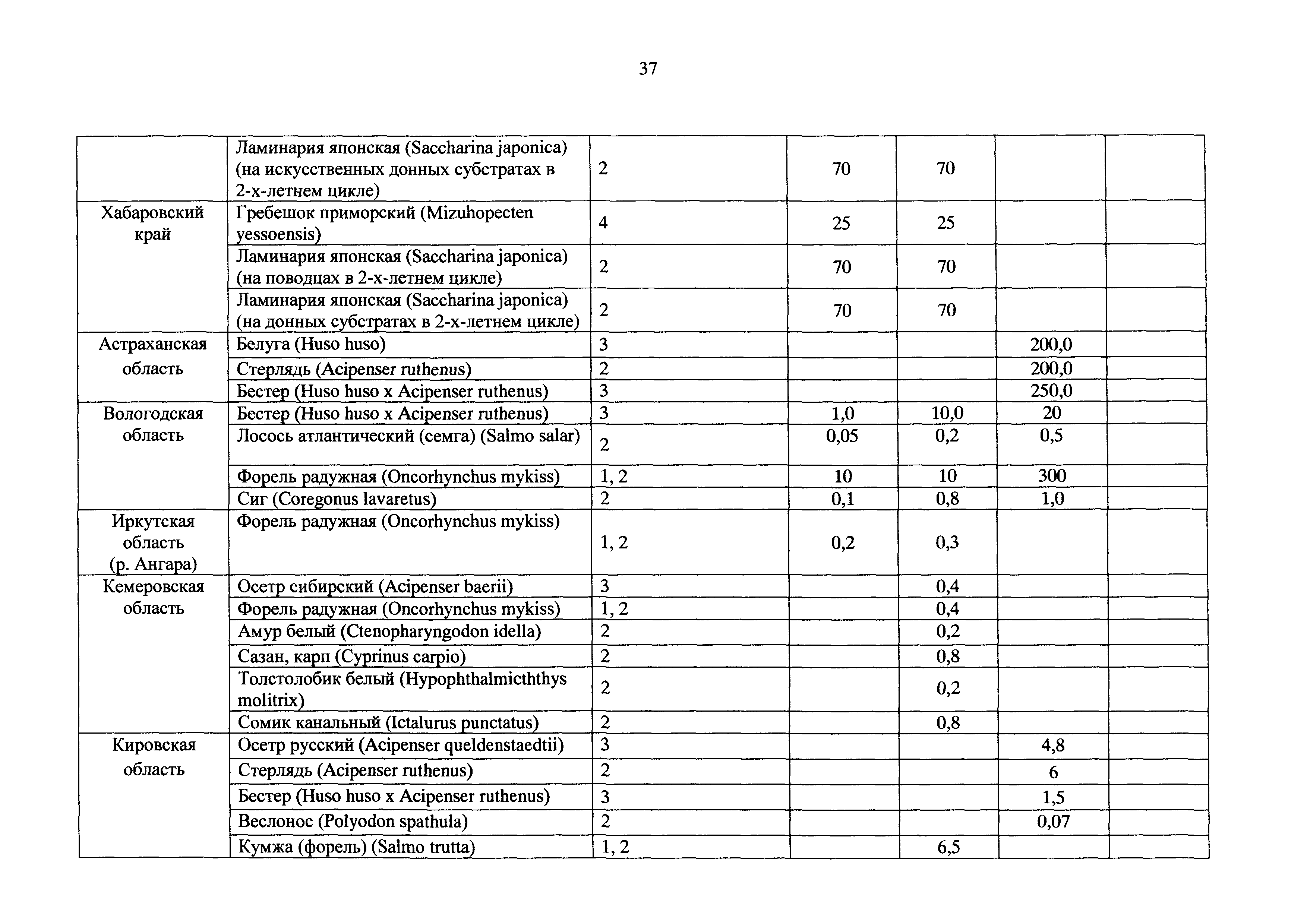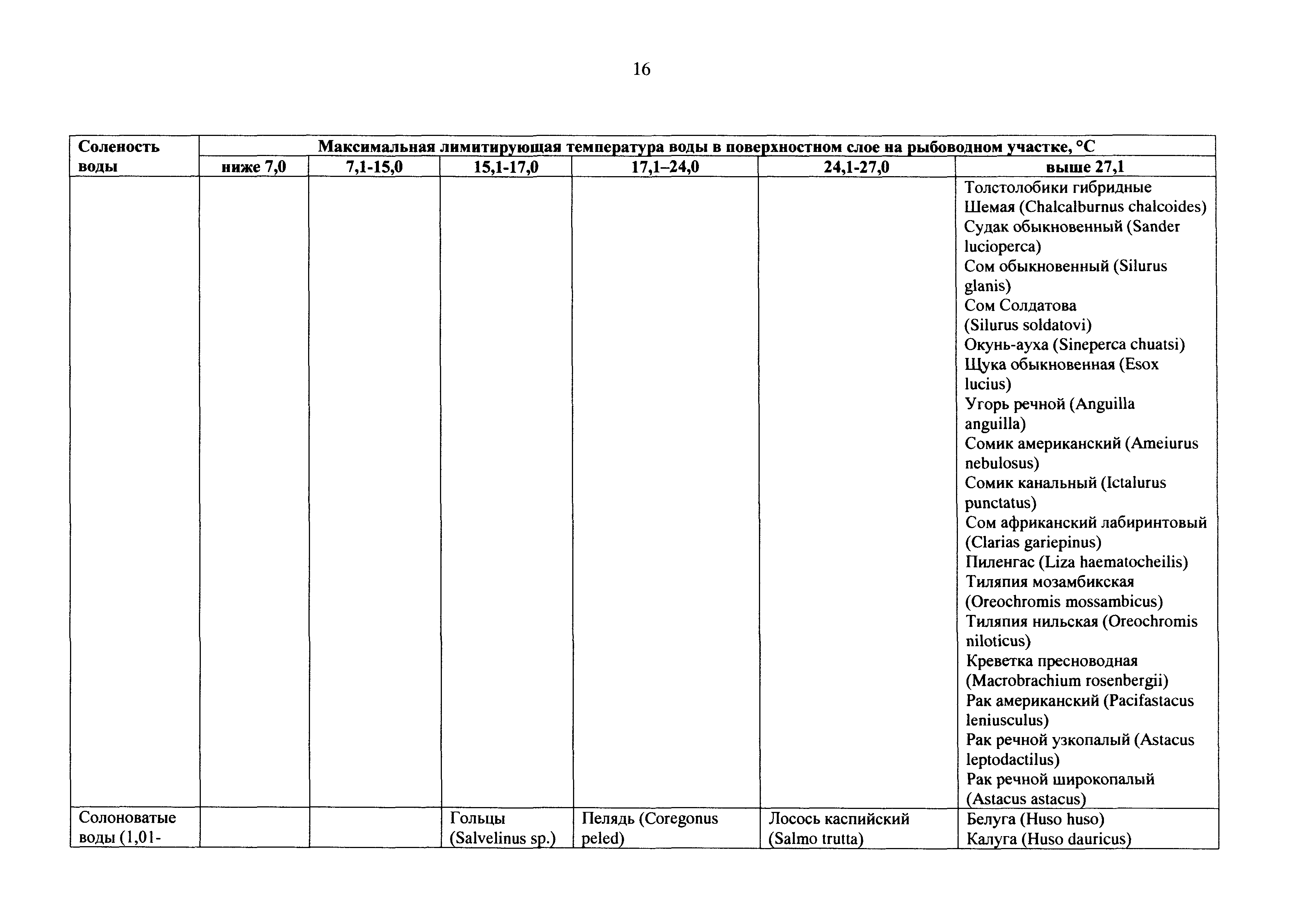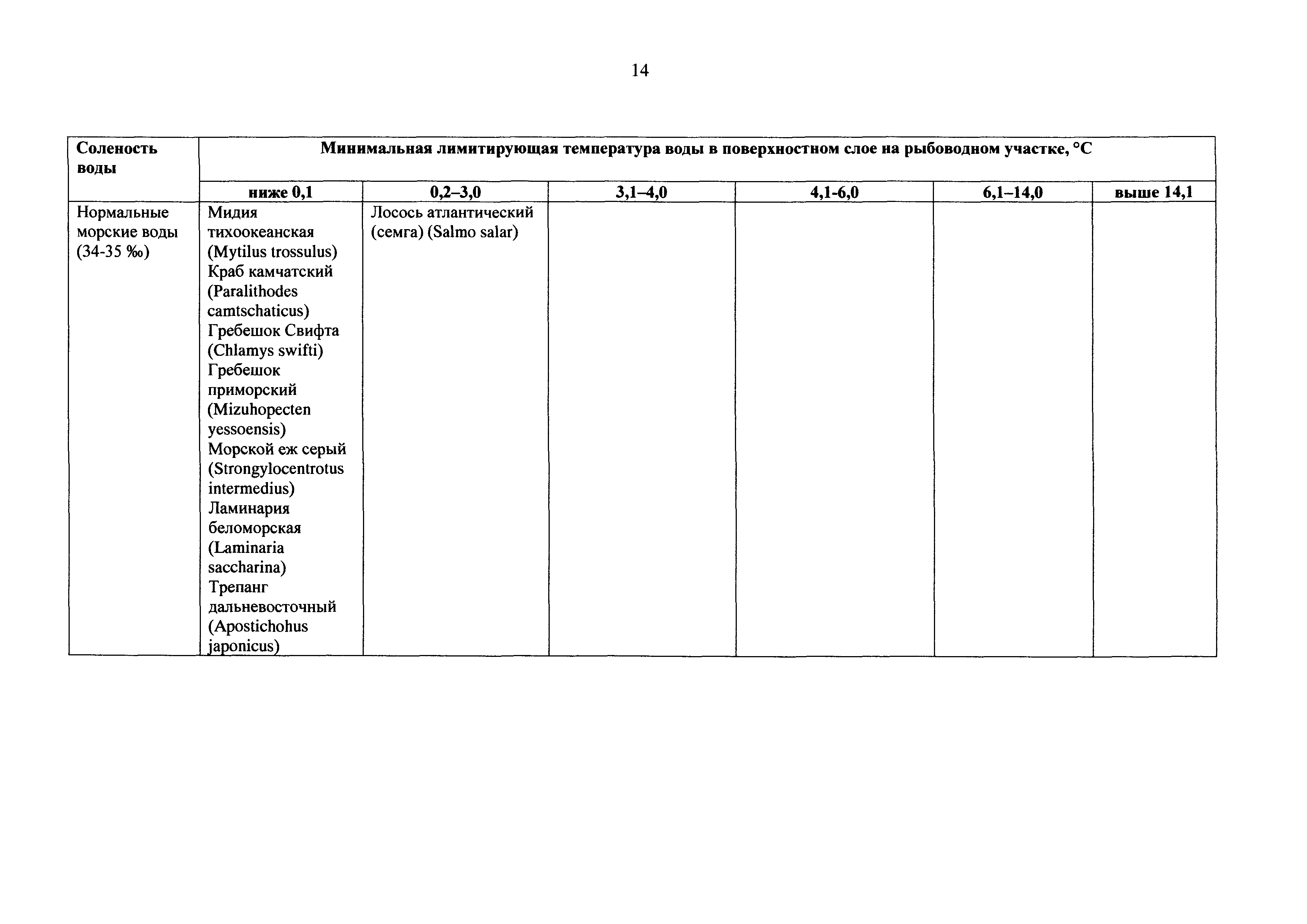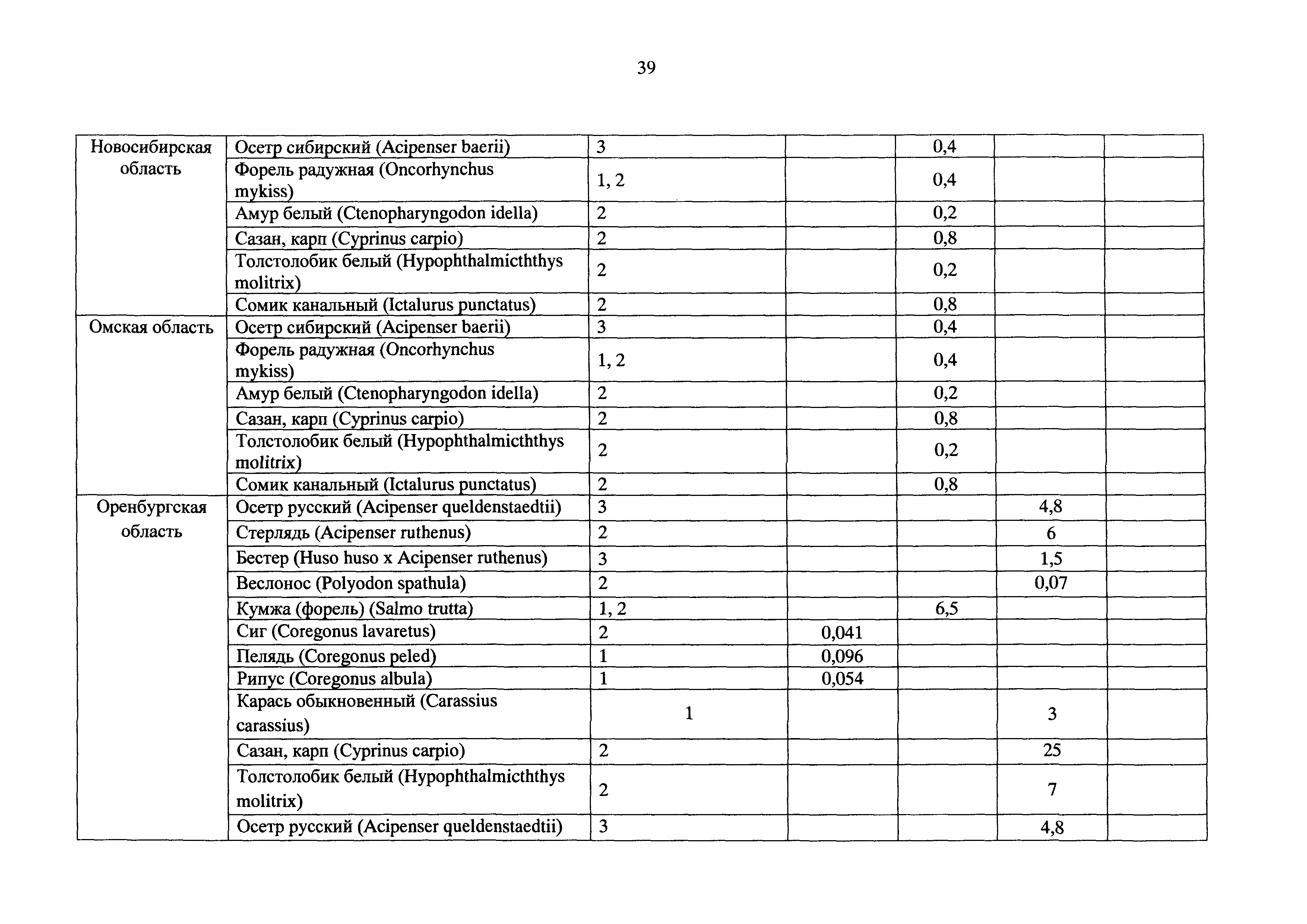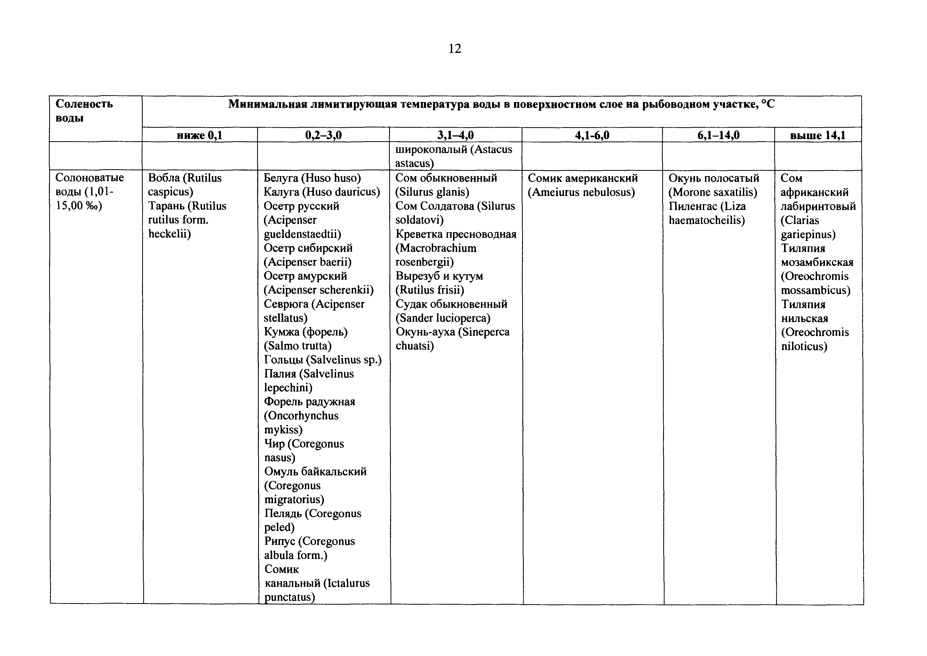Методика определения объема и видового состава объектов аквакультуры, подлежащих разведению и (или) содержанию, выращиванию, а также выпуску в водный объект и изъятию из водного объекта в границах рыбоводного участка| Статус: | утратил силу | | Название рус.: | Методика определения объема и видового состава объектов аквакультуры, подлежащих разведению и (или) содержанию, выращиванию, а также выпуску в водный объект и изъятию из водного объекта в границах рыбоводного участка | | Дата добавления в базу: | 12.02.2016 | | Дата актуализации: | 01.01.2021 | | Дата введения: | 14.08.2015 | | Дата окончания срока действия: | 13.08.2016 | | Область применения: | Методика используется Федеральным агентством по рыболовству или его территориальными органами при организации и проведении торгов в форме аукциона на право заключения договора пользования рыбоводным участком для осуществления пастбищной или индустриальной аквакультуры. | | Оглавление: | Приложение 1. Видовой состав объектов аквакультуры, подлежащих разведению и (или) содержанию, выращиванию, а также выпуску в водный объект и изъятию из водного объекта в границах рыбоводного участка в зависимости от солености воды и температуры воды в поверхностном слое на рыбоводном участке Приложение 2. Удельный объем подлежащих изъятию объектов аквакультуры, выращиваемых при осуществлении пастбищной аквакультуры, и продолжительность периода выращивания указанных объектов аквакультуры для разных субъектов Российской Федерации и разных типов водных объектов Приложение 3. Удельный объем подлежащих изъятию объектов аквакультуры, выращиваемых при осуществлении индустриальной аквакультуры, и продолжительность периода выращивания указанных объектов аквакультуры для разных субъектов Российской Федерации Приложение 4. Значения минимальной массы и выживаемости объектов аквакультуры, выращиваемых при осуществлении индустриальной аквакультуры | | Утверждён: | 03.06.2015 Министерство сельского хозяйства РФ (Russian Federation Ministry of Agriculture 223)