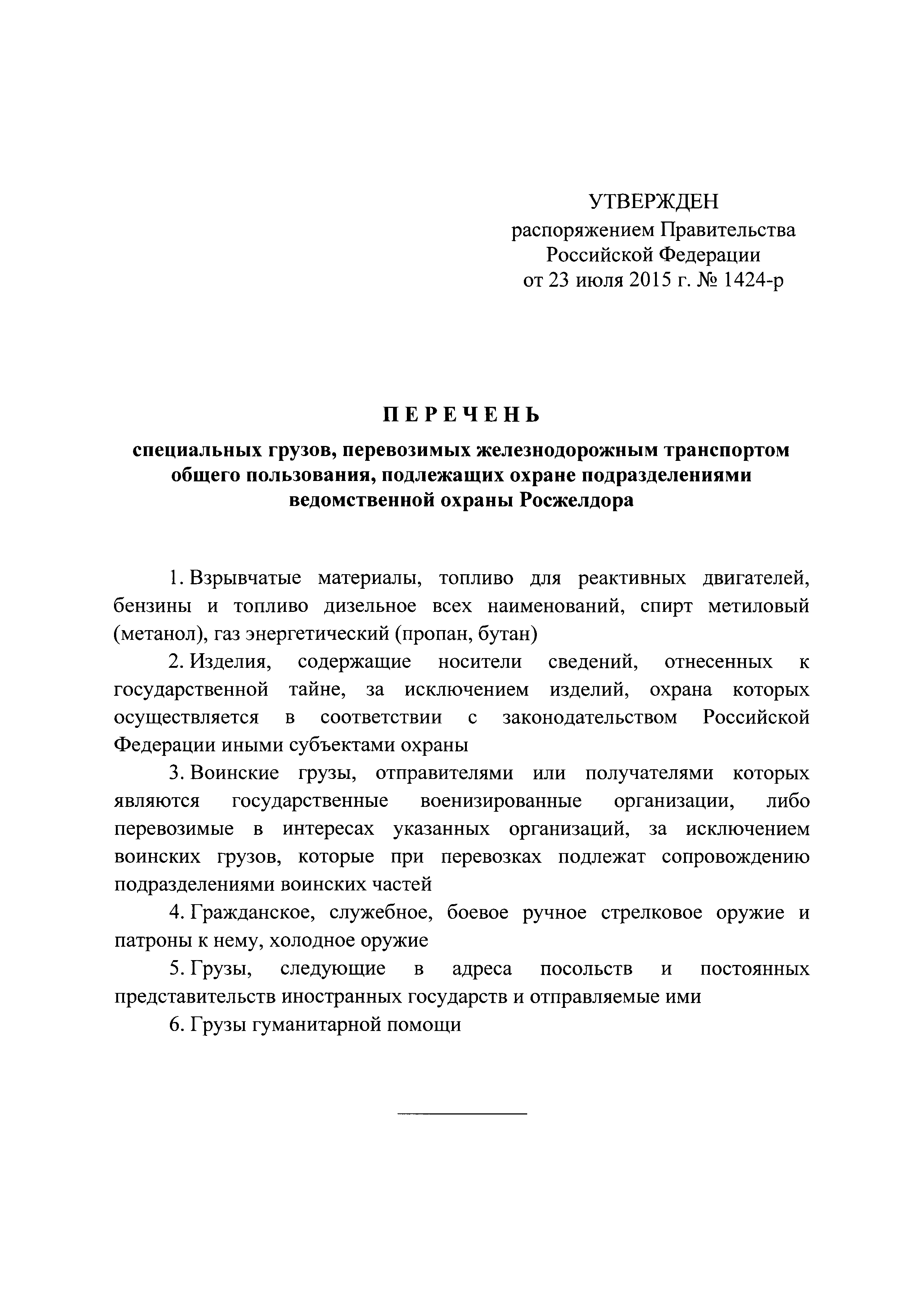 Перечень специальных грузов, перевозимых железнодорожным транспортом общего пользования, подлежащих охране подразделениями ведомственной охраны Росжелдора| Статус: | действует | | Название рус.: | Перечень специальных грузов, перевозимых железнодорожным транспортом общего пользования, подлежащих охране подразделениями ведомственной охраны Росжелдора | | Дата добавления в базу: | 12.02.2016 | | Дата актуализации: | 01.01.2021 | | Дата введения: | 23.07.2015 | | Утверждён: | 23.07.2015 Правительство Российской Федерации (1424-р)
