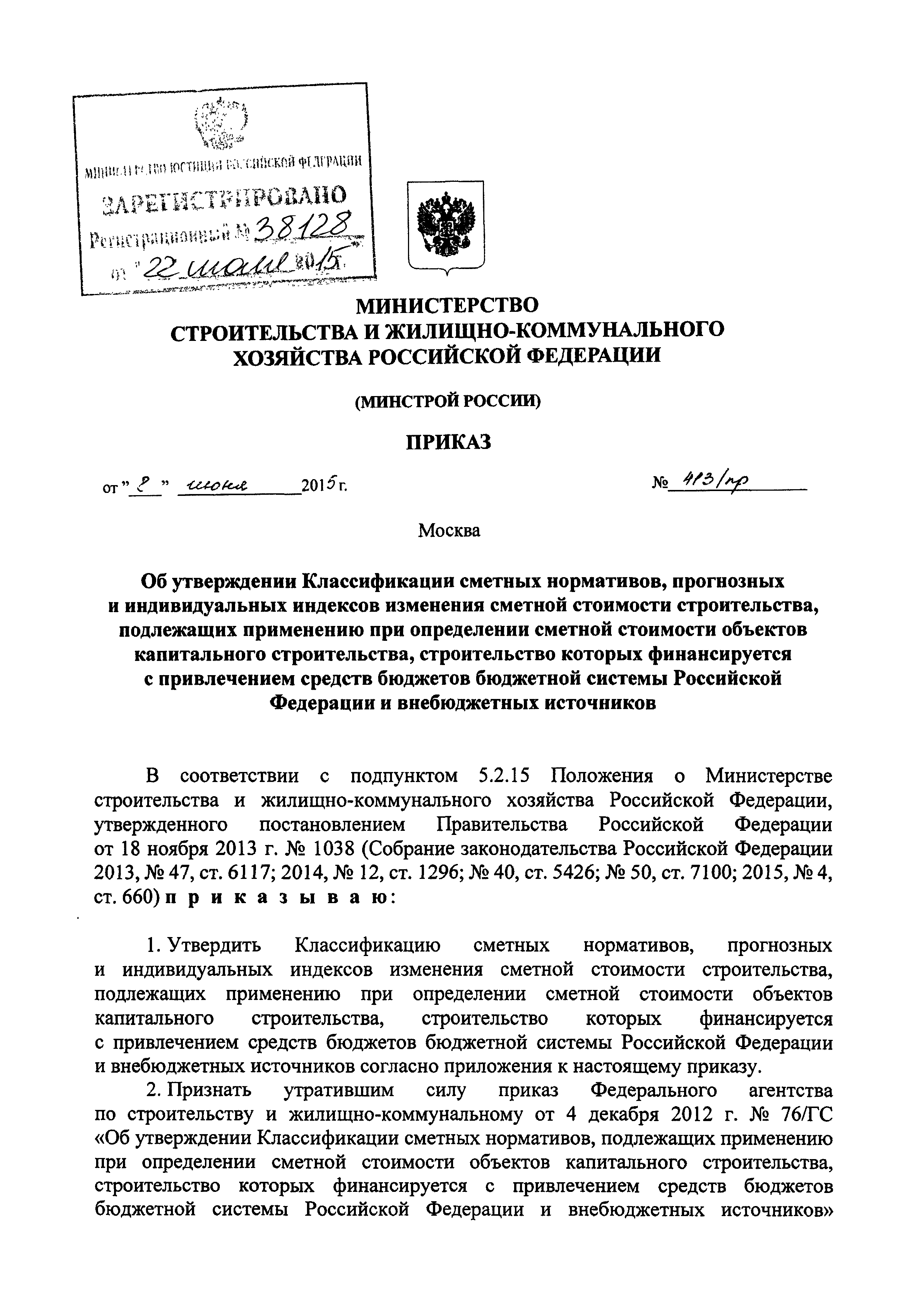 | Утверждён: | 08.06.2015 Министерство строительства и жилищно-коммунального хозяйства Российской Федерации (413/пр) |