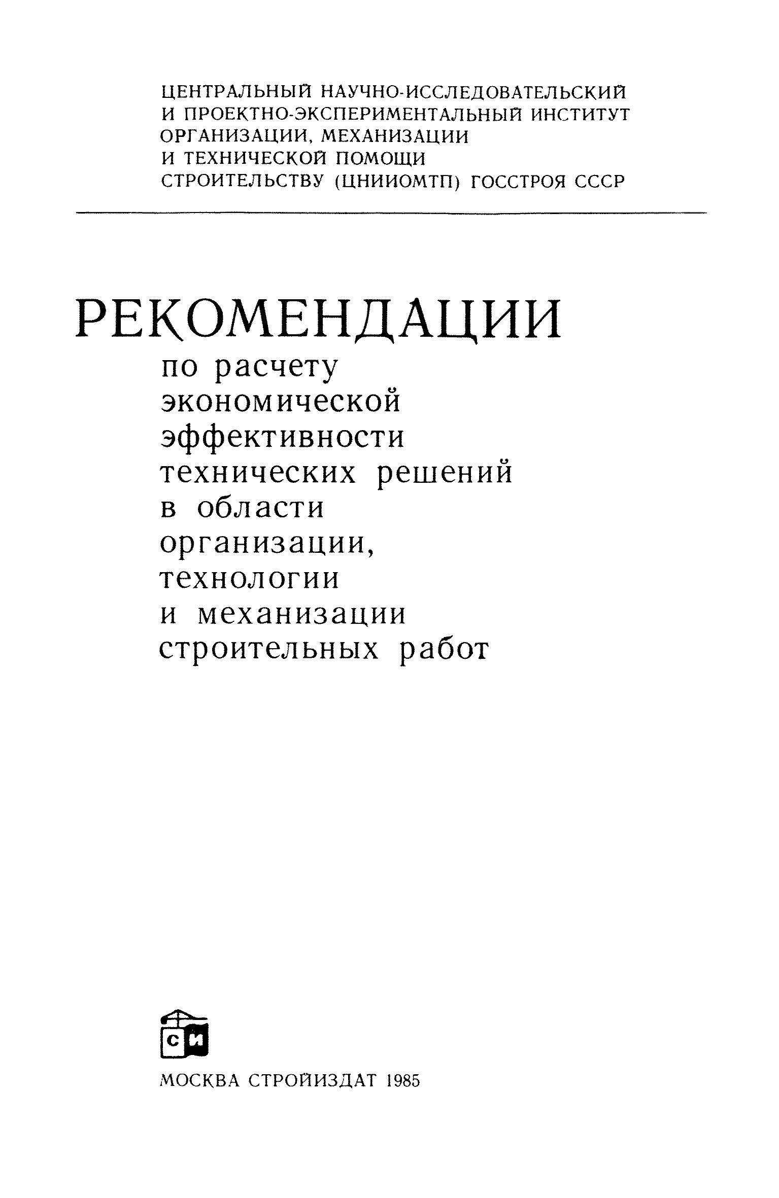 Рекомендации по расчету экономической эффективности технических решений в области организации, технологии и механизации строительных работ| Статус: | справочные материалы, мп, тпр | | Название рус.: | Рекомендации по расчету экономической эффективности технических решений в области организации, технологии и механизации строительных работ | | Дата добавления в базу: | 12.02.2016 | | Дата актуализации: | 01.01.2021 | | Область применения: | В документе изложены способы расчета экономической эффективности по пяти группам наиболее часто встречающихся видов задач. Приведены формулы для определения основных показателей экономической эффективности, исходные данные для расчетов. Для инженерно-технических работников научно-исследовательских организаций. | | Оглавление: | 1. Общие положения 2. Порядок выполнения расчета годового экономического эффекта 3. Определение годового объема работ 4. Расчет капитальных затрат 5. Расчет текущих затрат Примеры расчетов Исходные данные для выполнения расчетов | | Разработан: | ЦНИИОМТП Госстроя СССР