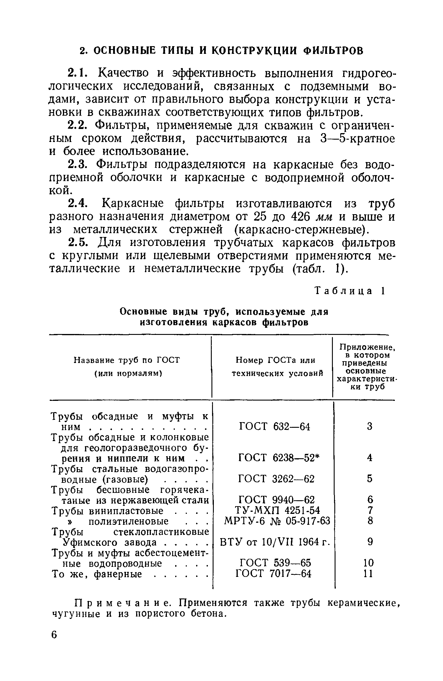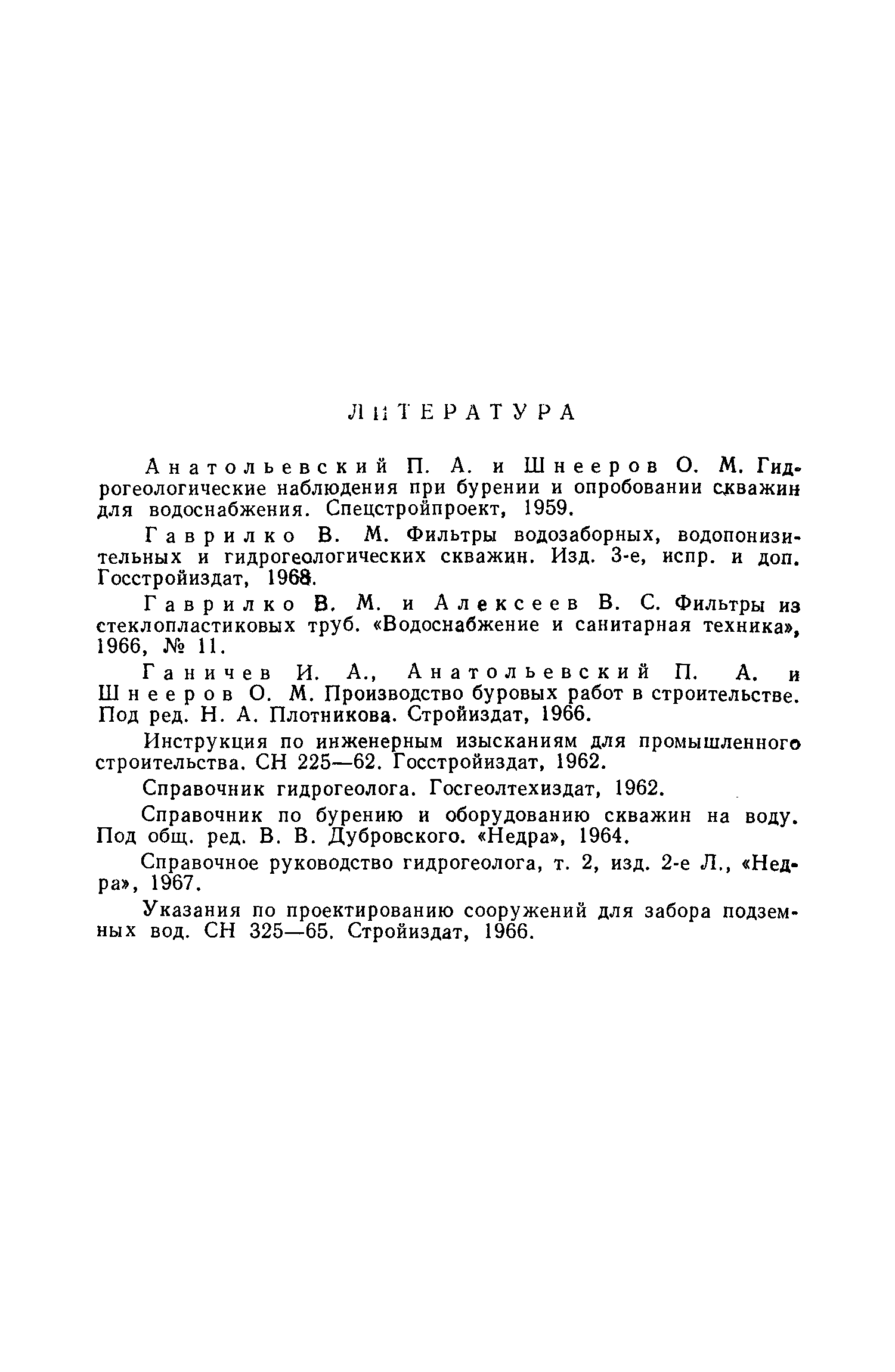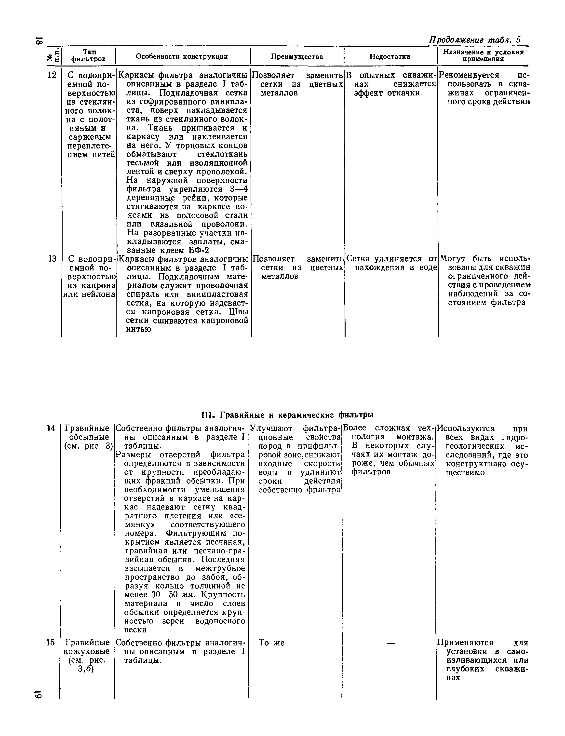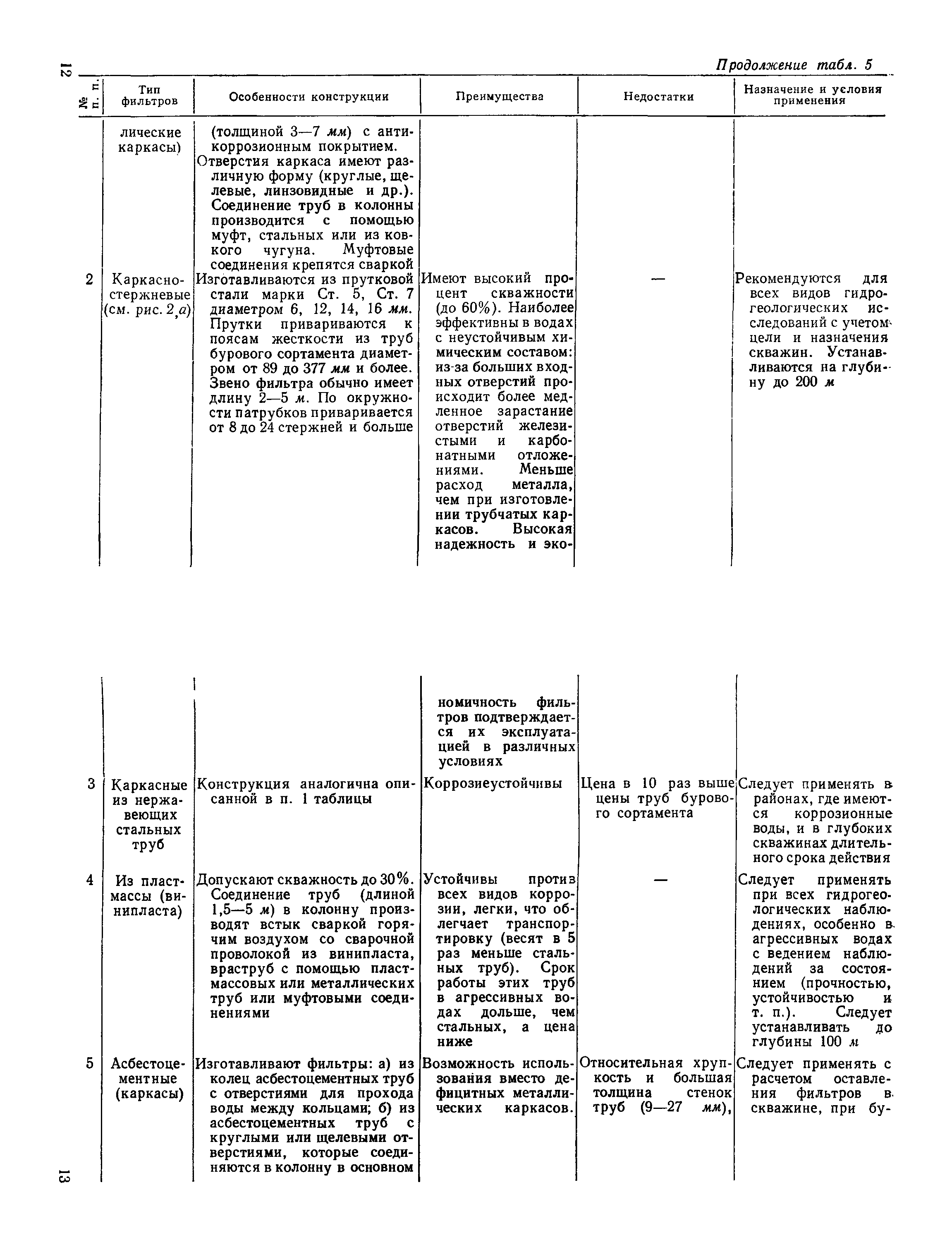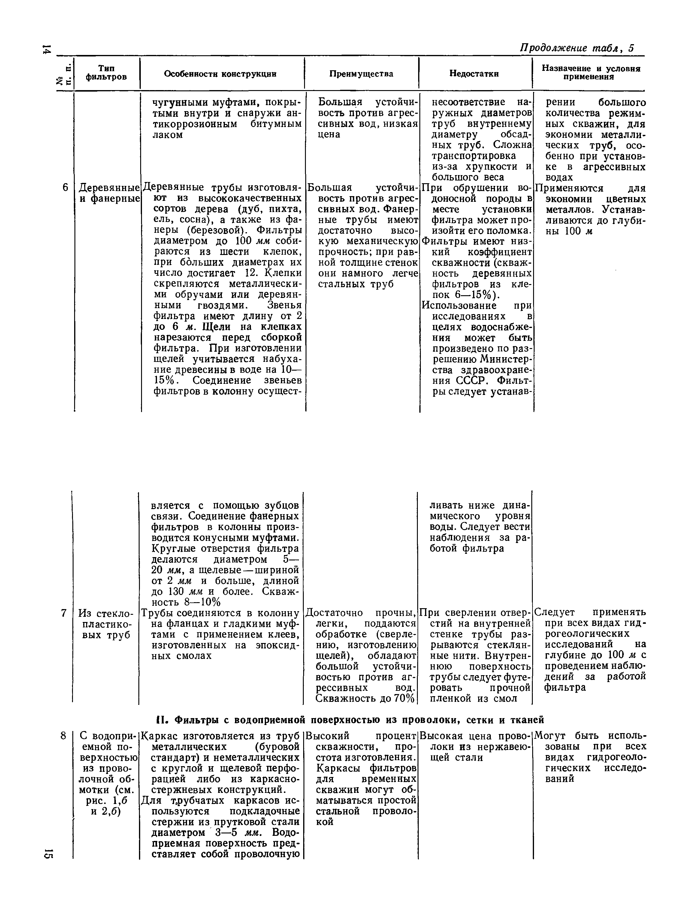 | Оглавление: | Предисловие 1. Целевое назначение фильтров 2. Основные типы и конструкции фильтров 3. Технология установки фильтров Приложение 1. Документация в процессе монтажа фильтров Приложение 2. Фильтры (каркасы), изготовленные из стальных труб Приложение 3. Трубы обсадные с короткой и нормальной резьбой (по ГОСТ 632—64) Приложение 4. Трубы обсадные и колонковые для геологоразведочного бурения (по ГОСТ 6238—52) Приложение 5. Трубы стальные водогазопроводные усиленные (по ГОСТ 3262—62) Приложение 6. Трубы горячекатаные из нержавеющей стали марки X18Н10T (1X18Н9Т, по ГОСТ 9940—62) Приложение 7. Трубы из винипласта (по ТУ-МХП 4251-54) Приложение 8. Трубы напорные из полиэтилена (по МРТУ-6 № 05-917-63) Приложение 9. Трубы из стеклопластика на полимерной смоле ПН-1 Уфимского завода (по ВТУ от 10/VII — 1964 г.) Приложение 10. Трубы асбестоцементные по ГОСТ 539—65 Приложение 11. Трубы фанерные (по ГОСТ 7017—64) Приложение 12. Основные технические данные каркасно-стержневых фильтров Приложение 13. Основные технические данные фильтров с проволочной обмоткой Приложение 14. Сетки проволочные фильтровые (по ГОСТ 3187—65) Приложение 15. Сетка проволочная тканая "семянка" (по ГОСТ 3339—46) Приложение 16. Сетка проволочная латунная тканая с квадратными ячейками нормальной точности (по ГОСТ 6613—53) Приложение 17. Сетка проволочная стальная тканая саржевая (киперная) с квадратными ячейками (по ГОСТ 4601—49) Приложение 18. Размеры гравийно-кожуховых фильтров Приложение 19. Рекомендации по ориентировочному расчету фильтров Литература |