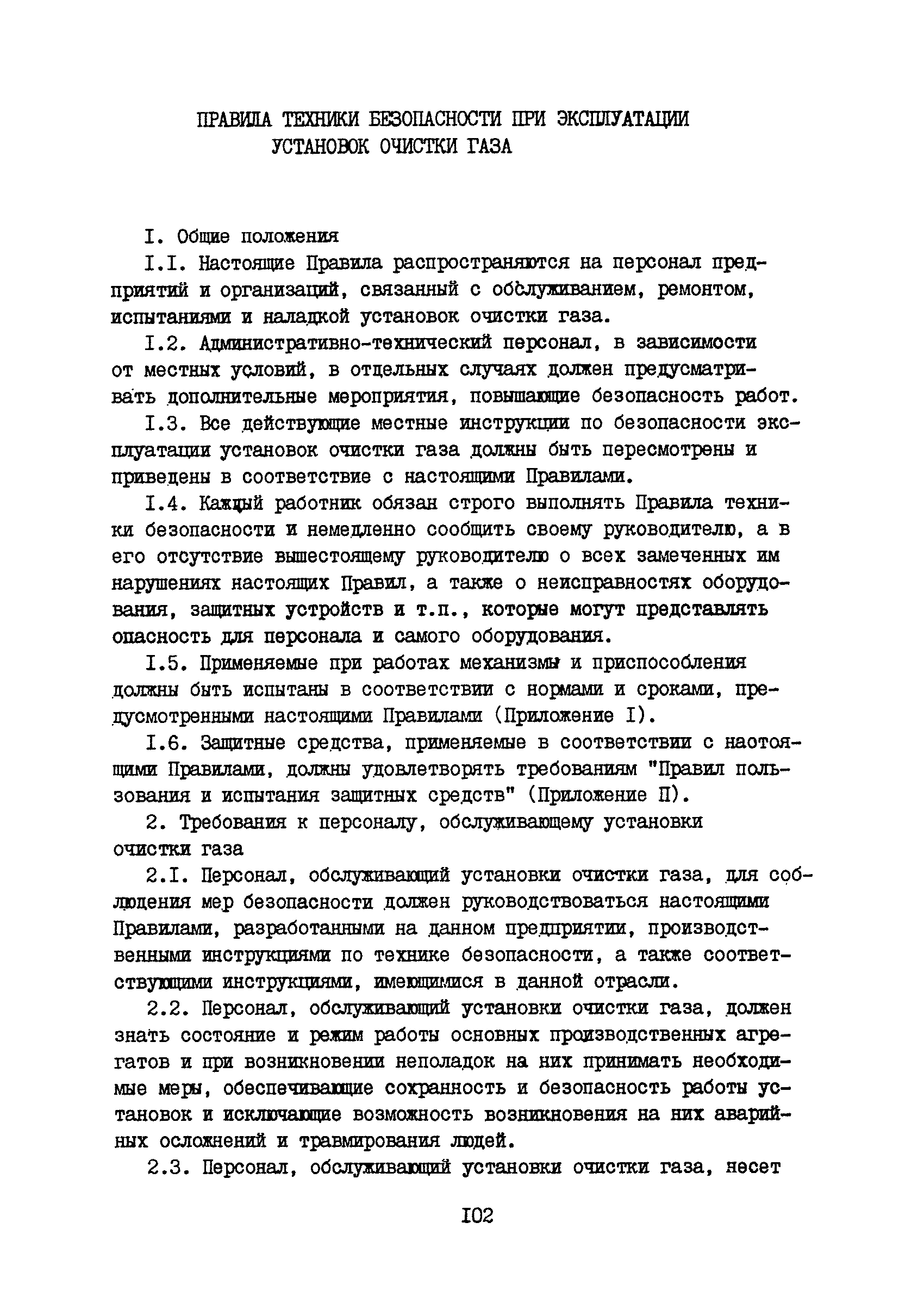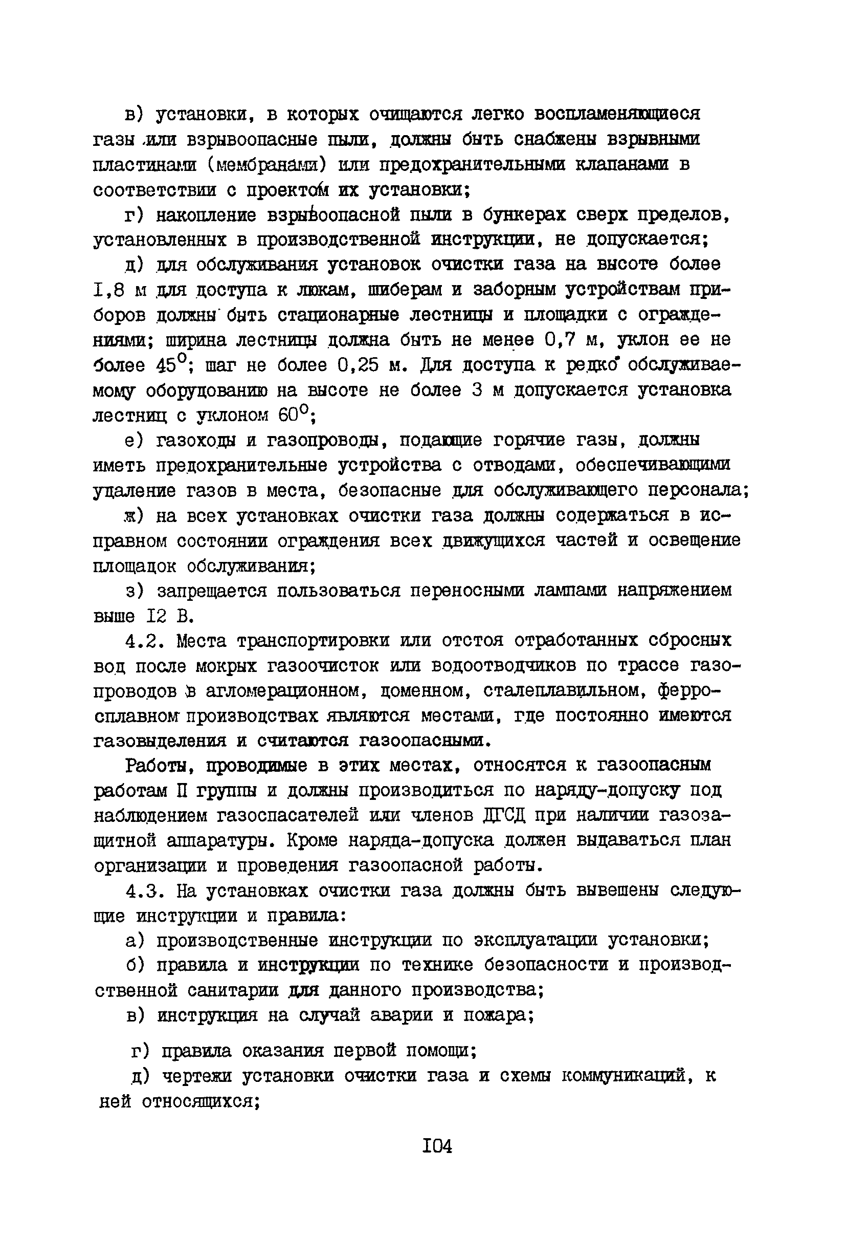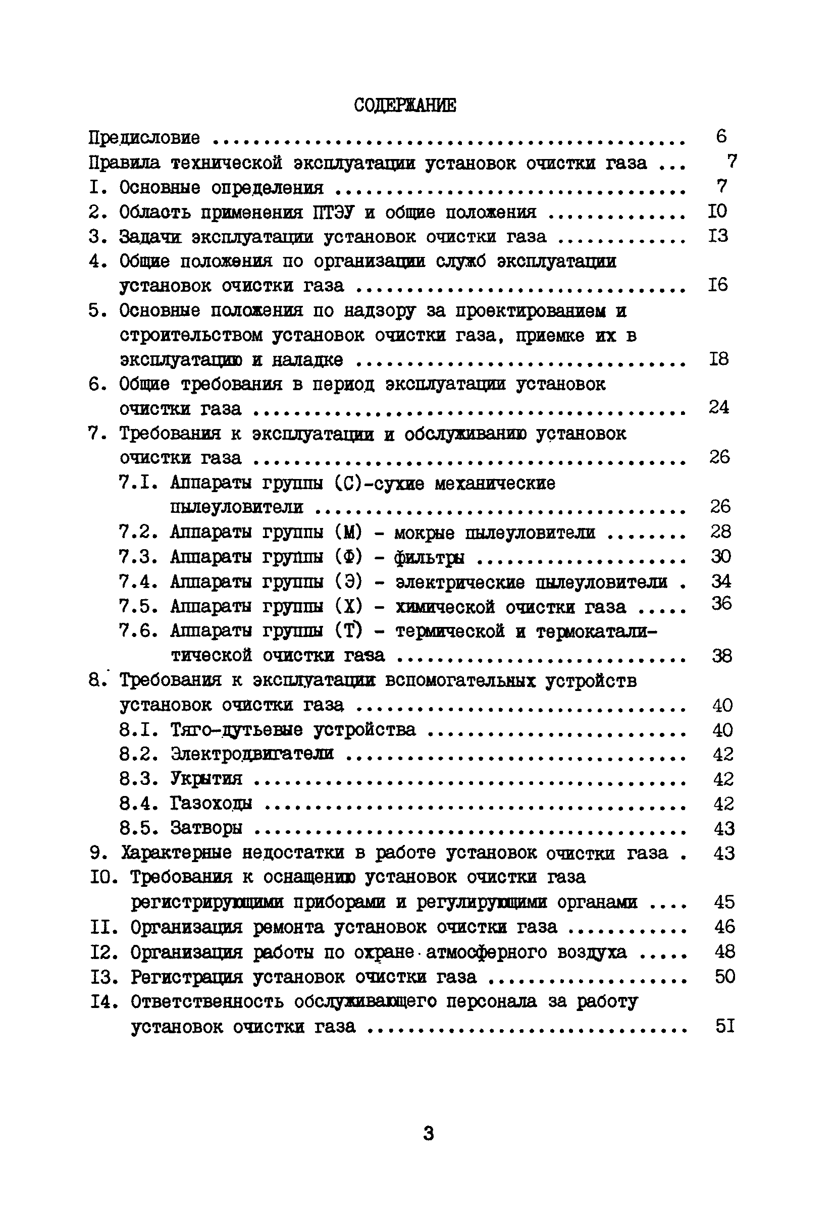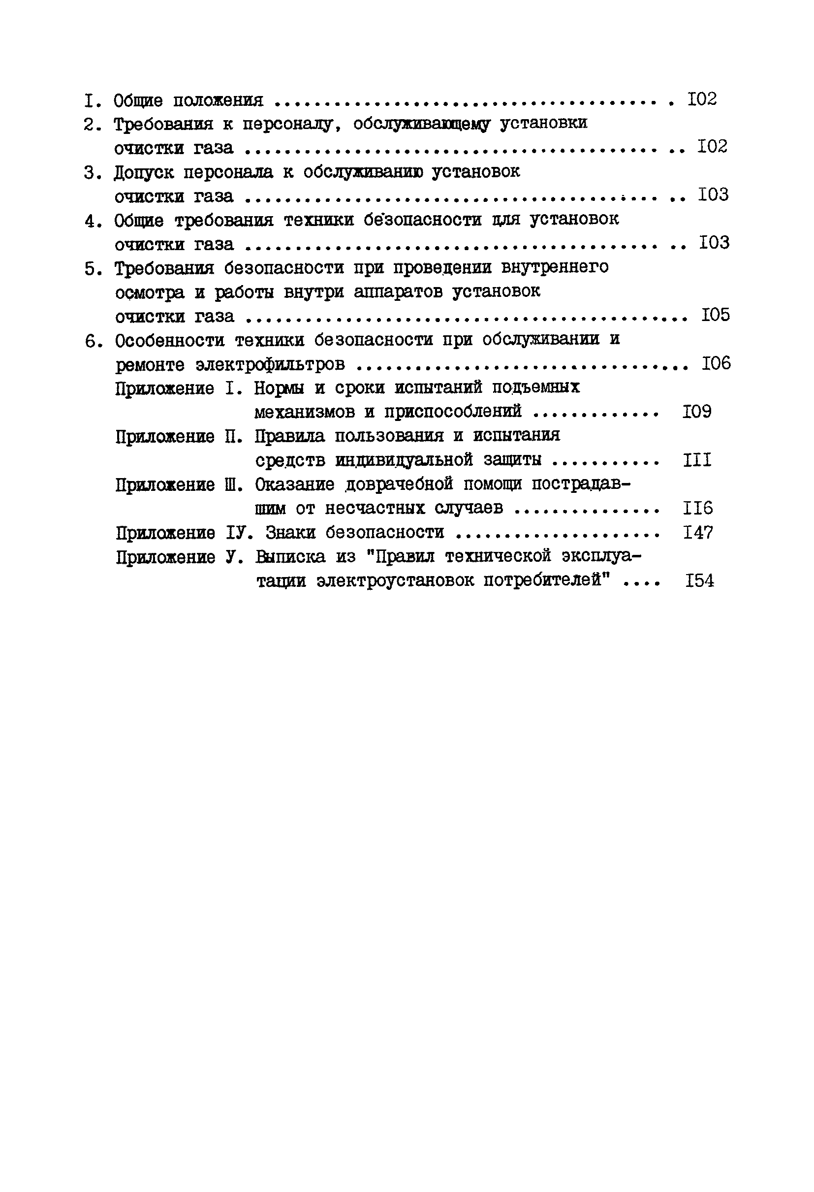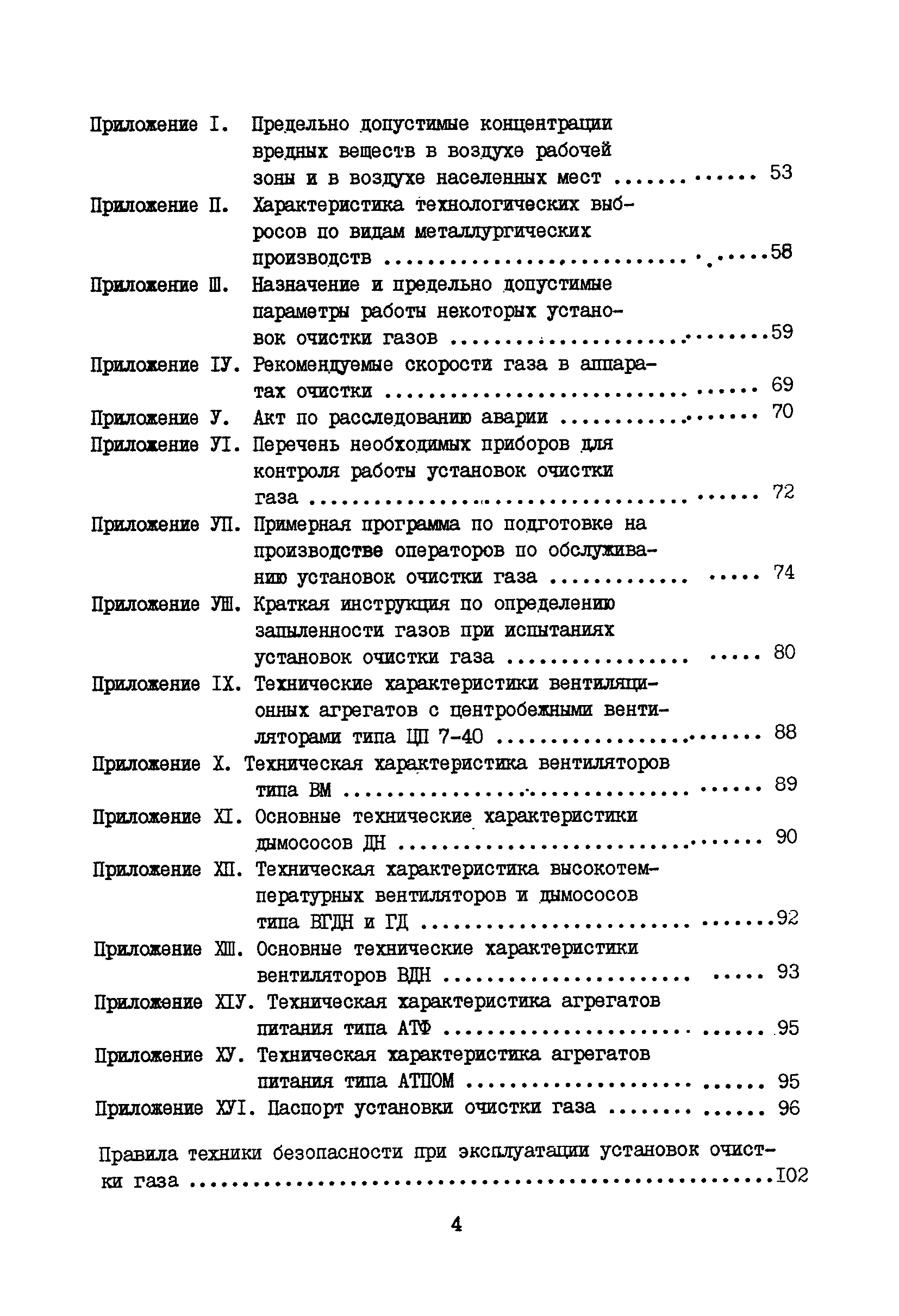 | Оглавление: | Предисловие Правила технической эксплуатации установок очистки газа 1. Основные определения 2. Область применения ПТЭУ и общие положения 3. Задачи эксплуатации установок очистки газа 4. Общие положения по организации служб эксплуатации установок очистки газа 5. Основные положения по надзору за проектированием и строительством установок очистки газа, приемке их в эксплуатацию и наладке 6. Общие требования в период эксплуатации установок очистки газа 7. Требования к эксплуатации и обслуживанию установок очистки газа 7.1. Аппараты группы (С) -сухие механические очистки газа 7.2. Аппараты группы (М) — мокрые пылеуловители 7.3. Аппараты группы (Ф) - фильтры 7.4. Аппараты группы (Э) - электрические пылеуловители 7.5. Аппараты группы (Х) - химической очистки газа 7.6. Аппараты группы (Т) — термической и термокаталитической очистки газа 8. Требования к эксплуатации вспомогательных устройств установок очистки газа 8.1. Тяго-дутьевые устройства 8.2. Электродвигатели 8.3. Укрытия 8.4. Газоходы 8.5. Затворы 9. Характерные недостатки в работе установок очистки газа 10. Требования к оснащению установок очистки газа регистрирующими приборами и регулирующими органами 11. Организация ремонта установок очистки газа 12. Организация работы по охране. атмосферного воздуха 13. Регистрация установок очистки газа 14. Ответственность обслуживающего персонала за работу установок очистки газа Приложение I. Предельно допустимые концентрации вредных веществ в воздухе рабочей зоны и в воздухе населенных мест Приложение II. Характеристика технологических выбросов по видам металлургических производств Приложение III. Назначение и предельно допустимые параметры работы некоторых установок очистки газов Приложение IV. Рекомендуемые скорости газа в аппаратах очистки Приложение V. Акт по расследованию аварии Приложение VI. Перечень необходимых приборов для контроля работы установок очистки газа Приложение VII. Примерная программа по подготовке на производстве операторов по обслуживанию установок очистки газа Приложение VIII. Краткая инструкция по определению запыленности газов при испытаниях установок очистки газа Приложение IХ. Технические характеристики вентиляционных агрегатов с центробежными вентиляторами типа ЦП 7-40 Приложение Х. Техническая характеристика вентиляторов типа ВМ Приложение ХI. Основные технические характеристики дымососов ДН Приложение ХII. Техническая характеристика высокотемпературных вентиляторов и дымососов типа ВГДН и ГД Приложение ХIII. Основные технические характеристики вентиляторов ВДН Приложение ХIV. Техническая характеристика агрегатов питания типа АТФ Приложение ХV. Техническая характеристика агрегатов питания типа АТПОМ Приложение ХVI. Паспорт установки очистки газа Правила техники безопасности при эксплуатации установок очистки газа 1. Общие положения 2. Требования к персоналу, обслуживающему установки очистки газа 3. Допуск персонала к обслуживанию установок очистки газа 4. Общие требования техники безопасности для установок очистки газа 5. Требования безопасности при проведении внутреннего осмотра и работы внутри аппаратов установок очистки газа 6. Особенности техники безопасности при обслуживании и ремонте электрофильтров Приложение I. Нормы и сроки испытаний подъемных механизмов и приспособлений Приложение II. 