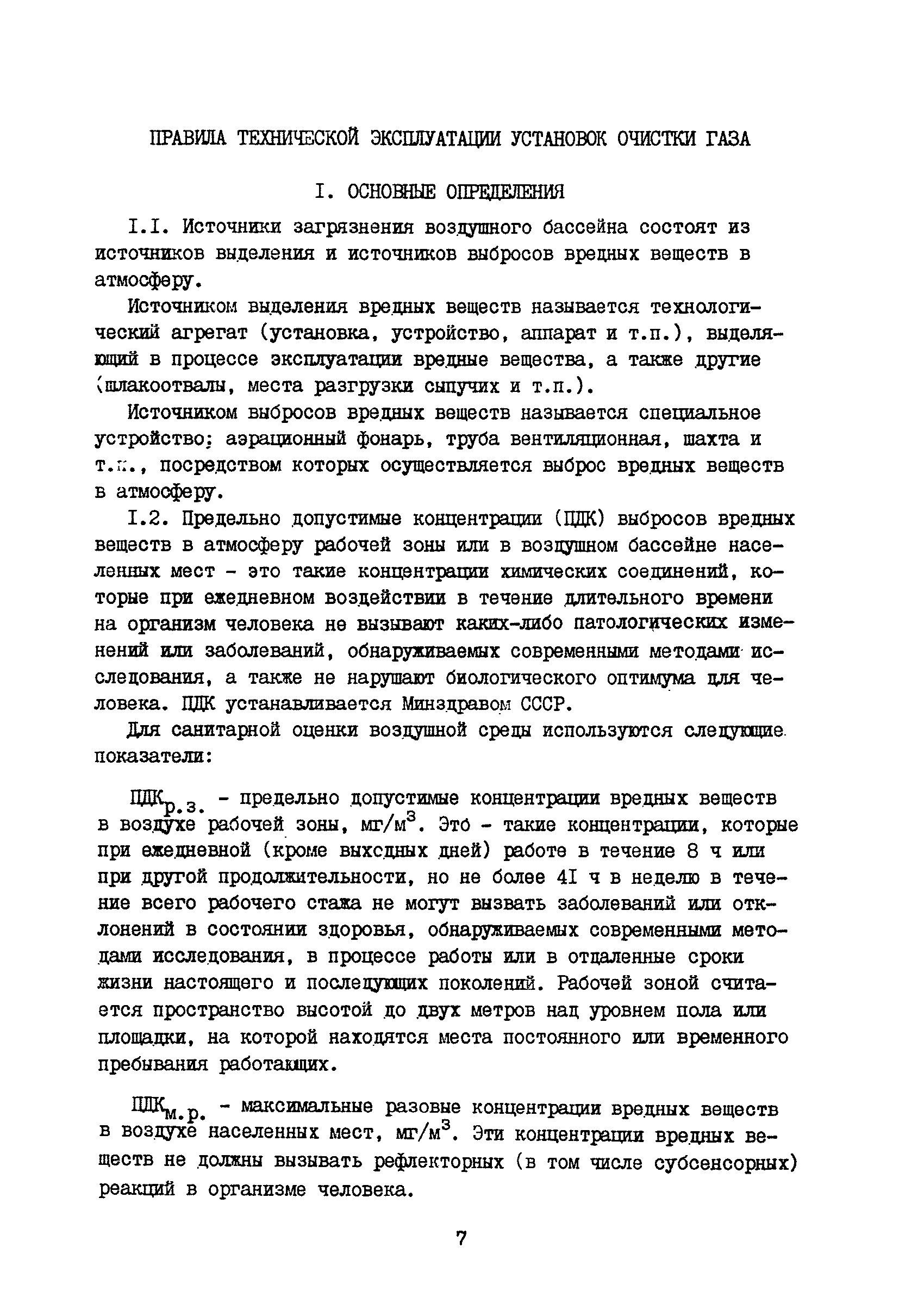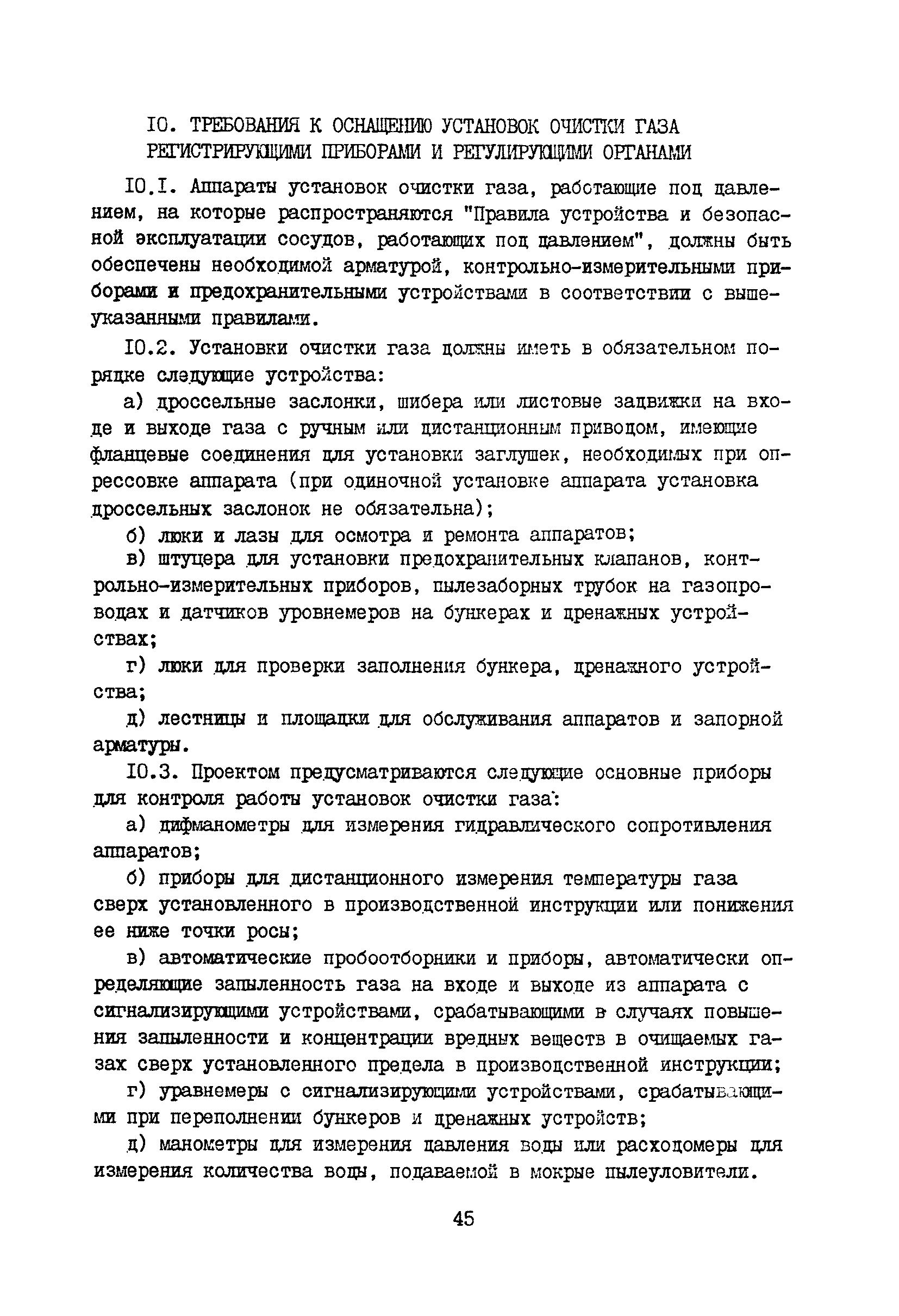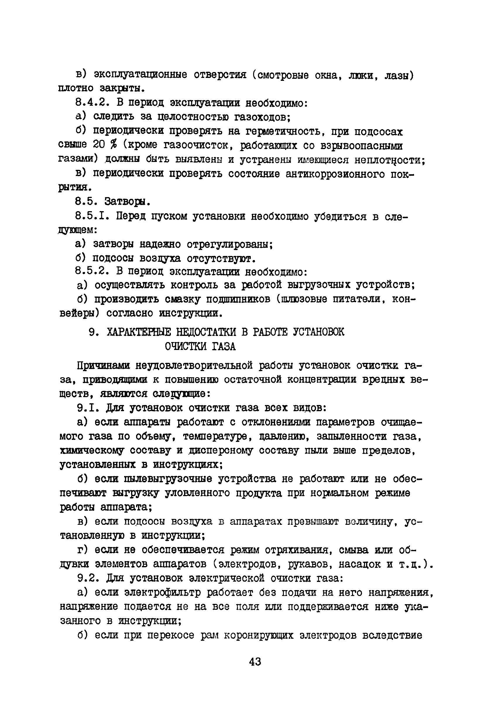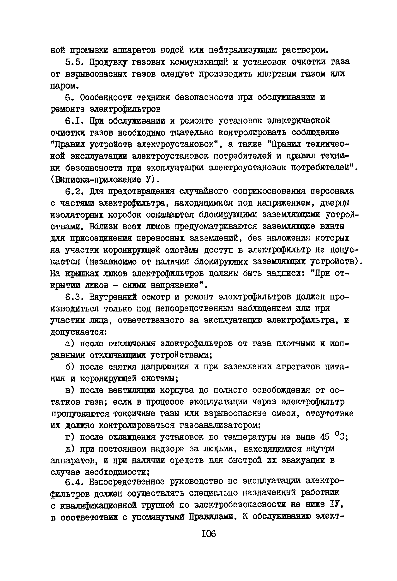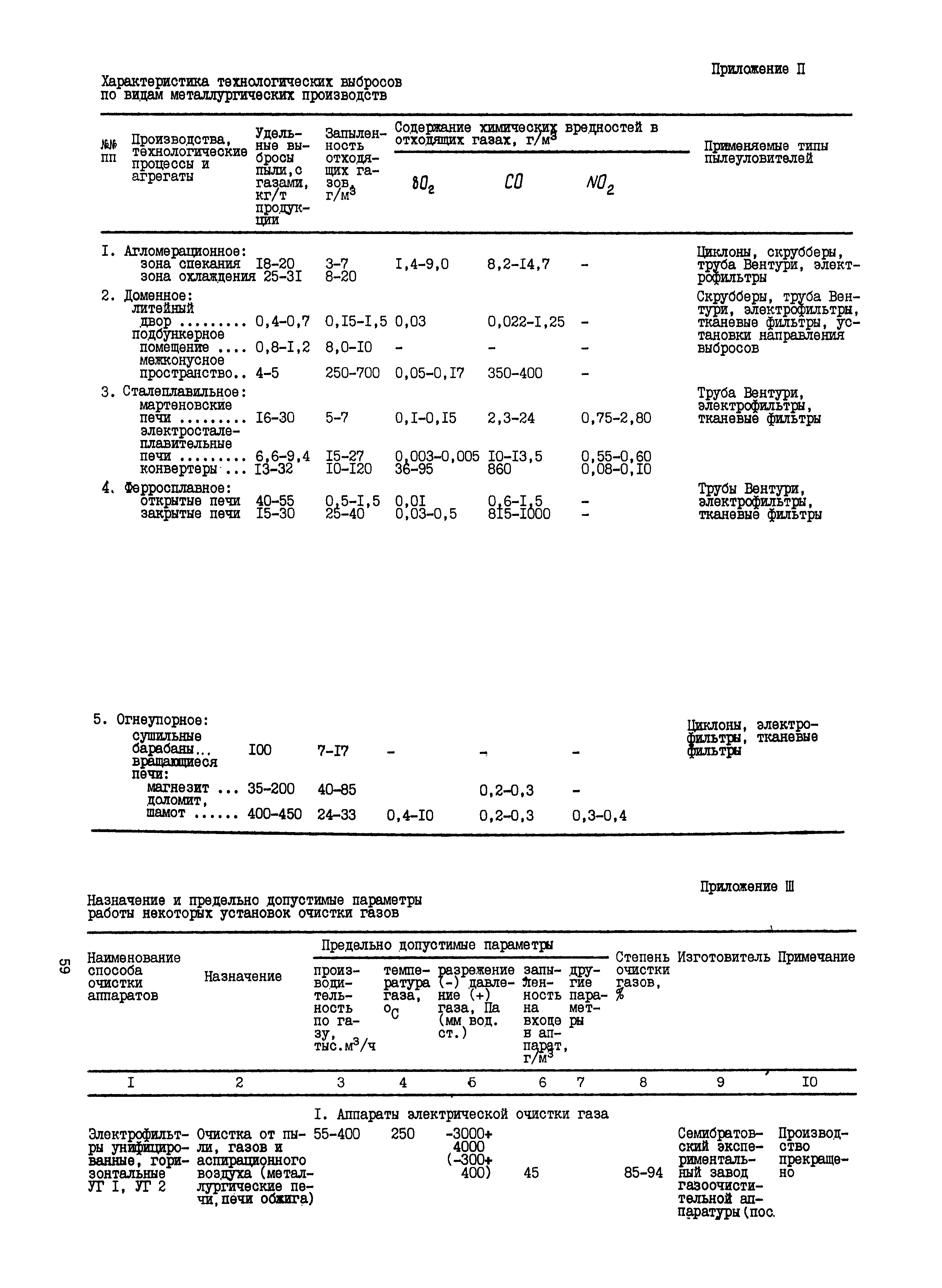 | Оглавление: | Предисловие Правила технической эксплуатации установок очистки газа 1. Основные определения 2. Область применения ПТЭУ и общие положения 3. Задачи эксплуатации установок очистки газа 4. Общие положения по организации служб эксплуатации установок очистки газа 5. Основные положения по надзору за проектированием и строительством установок очистки газа, приемке их в эксплуатацию и наладке 6. Общие требования в период эксплуатации установок очистки газа 7. Требования к эксплуатации и обслуживанию установок очистки газа 7.1. Аппараты группы (С) -сухие механические очистки газа 7.2. Аппараты группы (М) — мокрые пылеуловители 7.3. Аппараты группы (Ф) - фильтры 7.4. Аппараты группы (Э) - электрические пылеуловители 7.5. Аппараты группы (Х) - химической очистки газа 7.6. Аппараты группы (Т) — термической и термокаталитической очистки газа 8. Требования к эксплуатации вспомогательных устройств установок очистки газа 8.1. Тяго-дутьевые устройства 8.2. Электродвигатели 8.3. Укрытия 8.4. Газоходы 8.5. Затворы 9. Характерные недостатки в работе установок очистки газа 10. Требования к оснащению установок очистки газа регистрирующими приборами и регулирующими органами 11. Организация ремонта установок очистки газа 12. Организация работы по охране. атмосферного воздуха 13. Регистрация установок очистки газа 14. Ответственность обслуживающего персонала за работу установок очистки газа Приложение I. Предельно допустимые концентрации вредных веществ в воздухе рабочей зоны и в воздухе населенных мест Приложение II. Характеристика технологических выбросов по видам металлургических производств Приложение III. Назначение и предельно допустимые параметры работы некоторых установок очистки газов Приложение IV. Рекомендуемые скорости газа в аппаратах очистки Приложение V. Акт по расследованию аварии Приложение VI. Перечень необходимых приборов для контроля работы установок очистки газа Приложение VII. Примерная программа по подготовке на производстве операторов по обслуживанию установок очистки газа Приложение VIII. Краткая инструкция по определению запыленности газов при испытаниях установок очистки газа Приложение IХ. Технические характеристики вентиляционных агрегатов с центробежными вентиляторами типа ЦП 7-40 Приложение Х. Техническая характеристика вентиляторов типа ВМ Приложение ХI. Основные технические характеристики дымососов ДН Приложение ХII. Техническая характеристика высокотемпературных вентиляторов и дымососов типа ВГДН и ГД Приложение ХIII. Основные технические характеристики вентиляторов ВДН Приложение ХIV. Техническая характеристика агрегатов питания типа АТФ Приложение ХV. Техническая характеристика агрегатов питания типа АТПОМ Приложение ХVI. Паспорт установки очистки газа Правила техники безопасности при эксплуатации установок очистки газа 1. Общие положения 2. Требования к персоналу, обслуживающему установки очистки газа 3. Допуск персонала к обслуживанию установок очистки газа 4. Общие требования техники безопасности для установок очистки газа 5. Требования безопасности при проведении внутреннего осмотра и работы внутри аппаратов установок очистки газа 6. Особенности техники безопасности при обслуживании и ремонте электрофильтров Приложение I. Нормы и сроки испытаний подъемных механизмов и приспособлений Приложение II. 